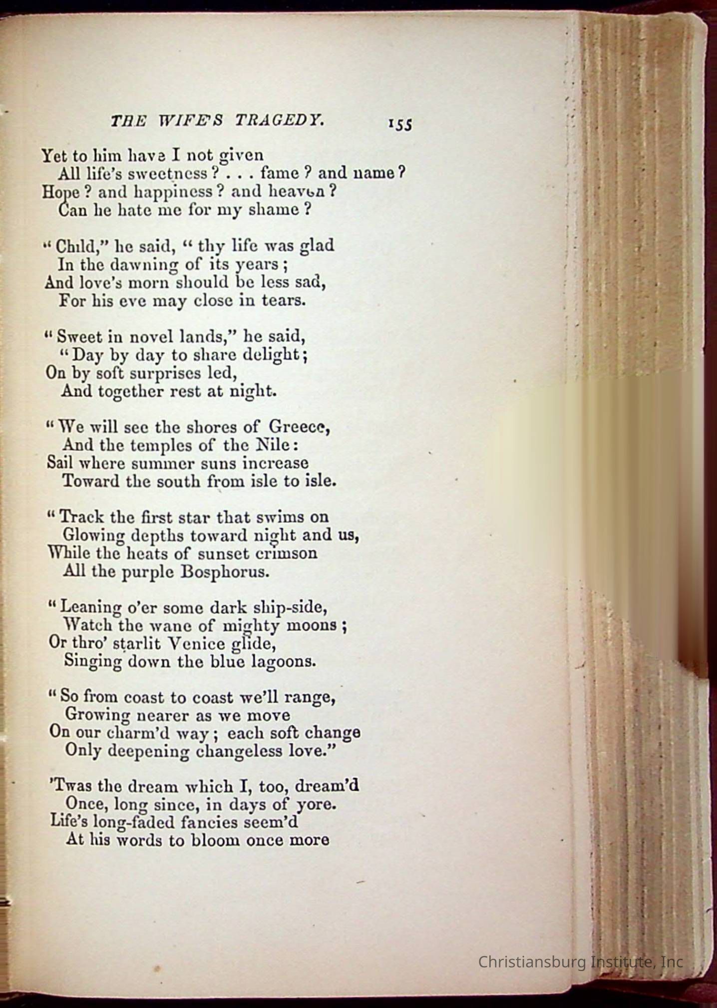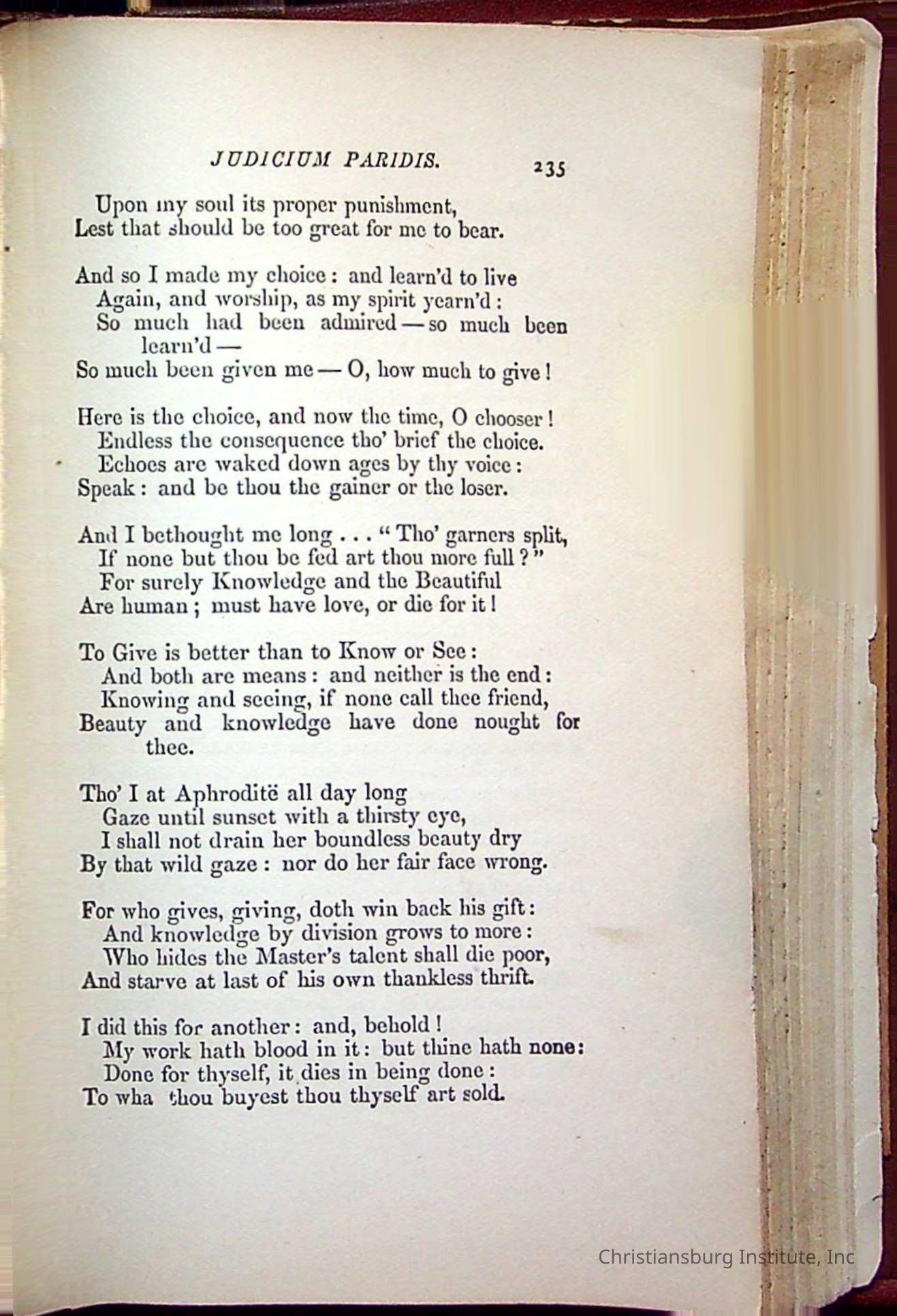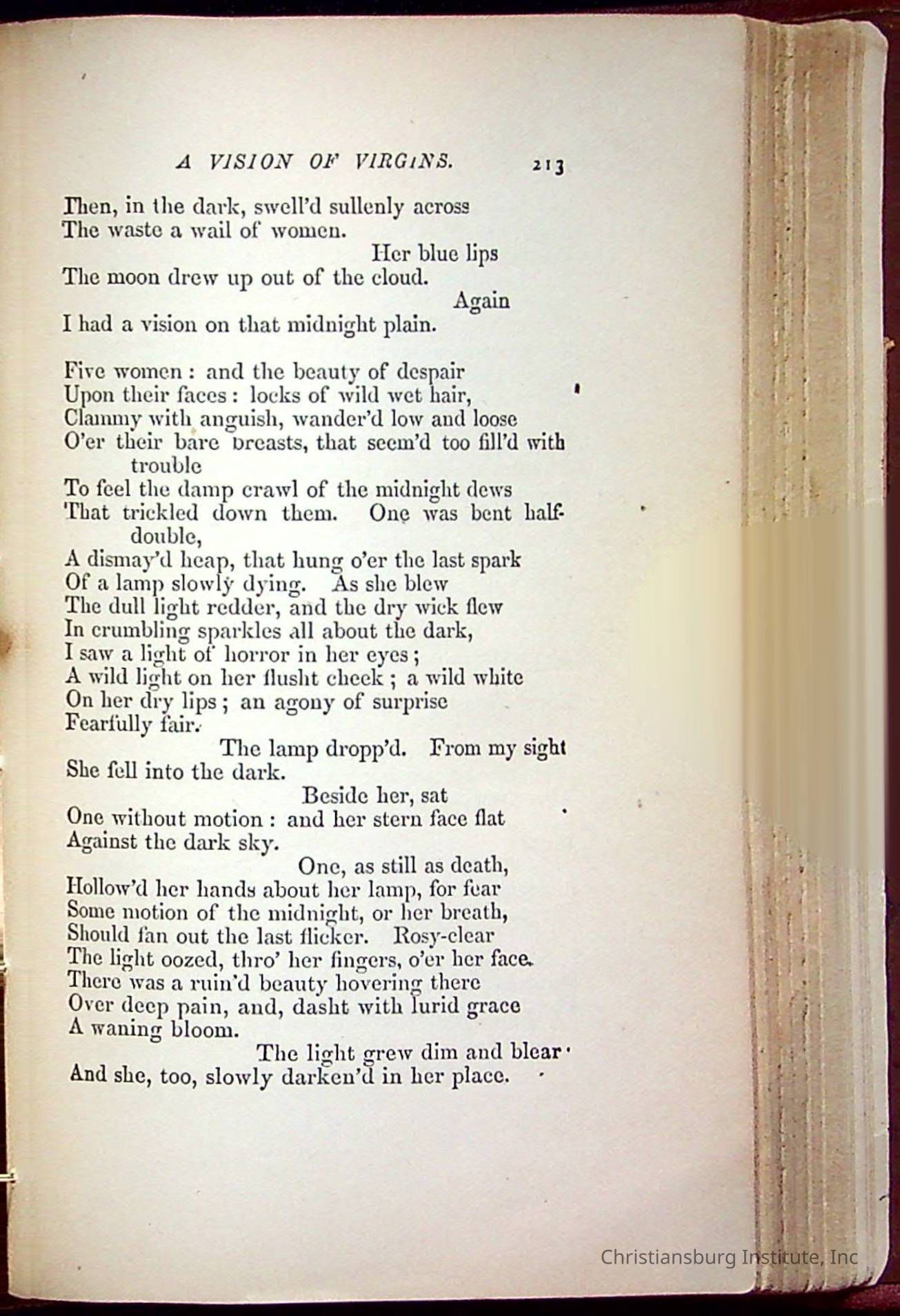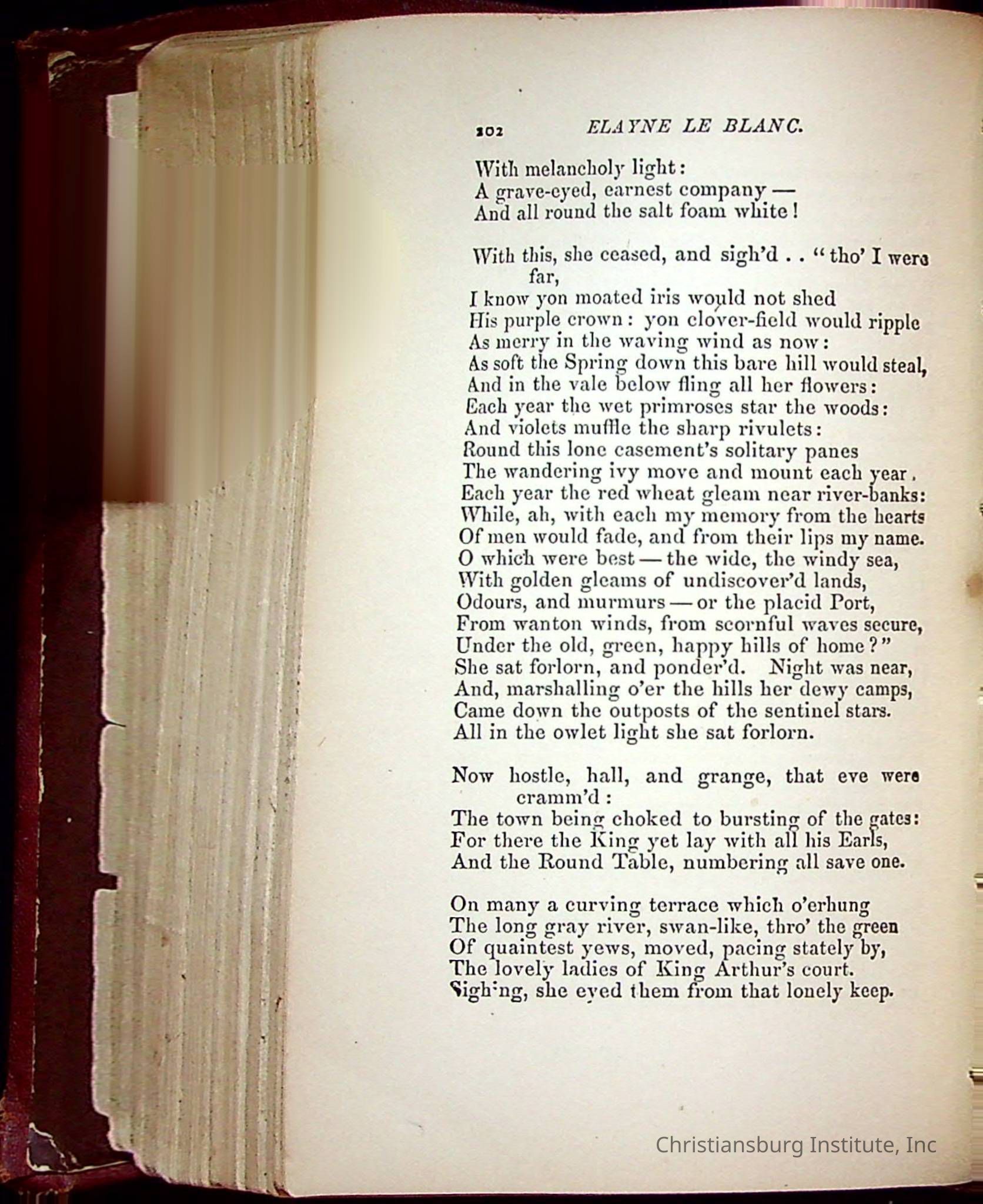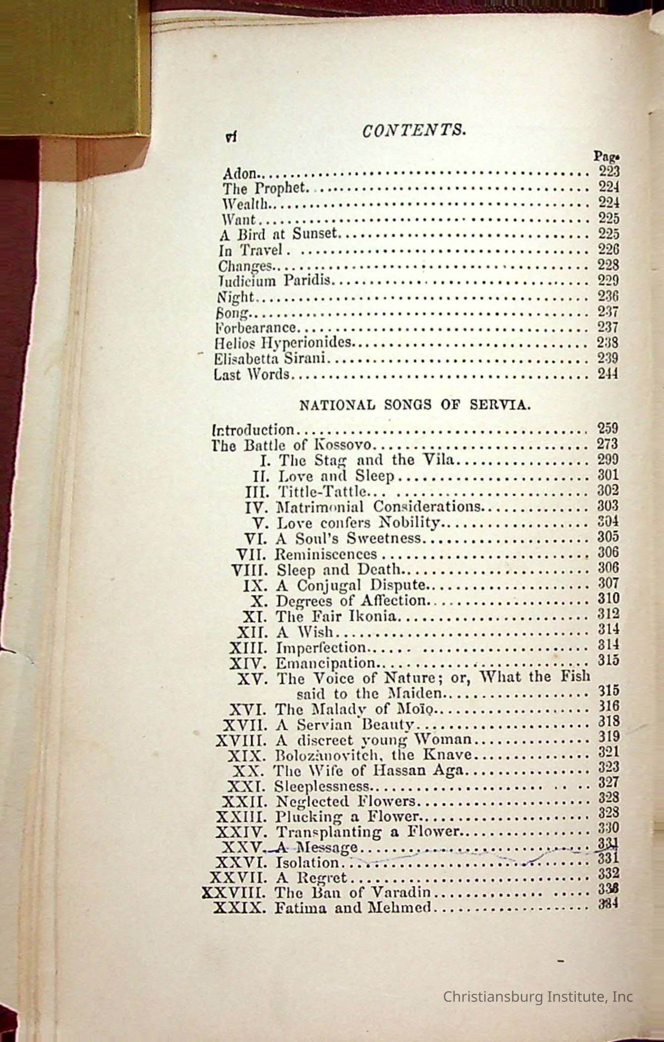 "Poems" written by Owen Meredith and published by James R. Osgood and Company in the year 1875. This book was in the Christiansburg Institute library.