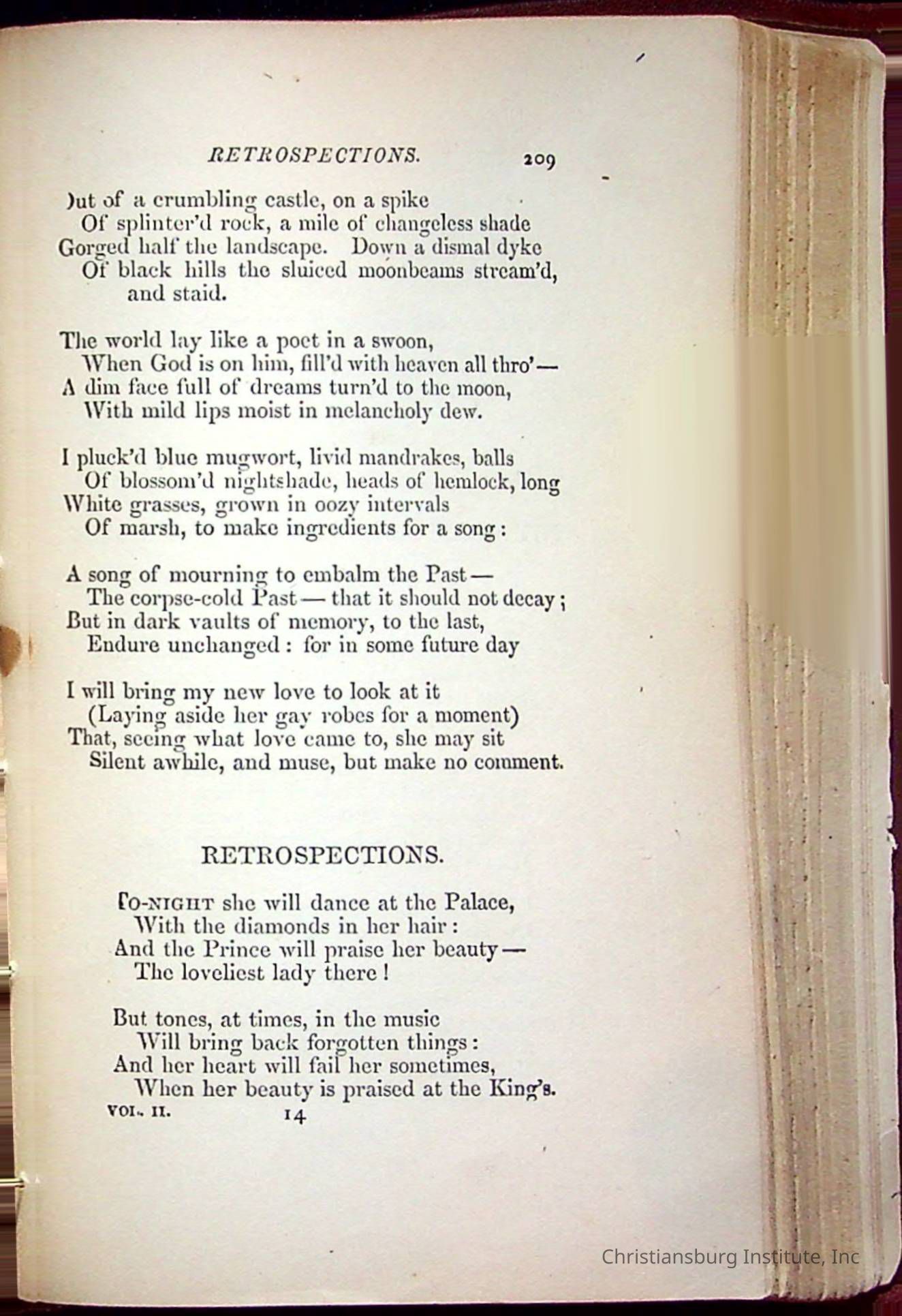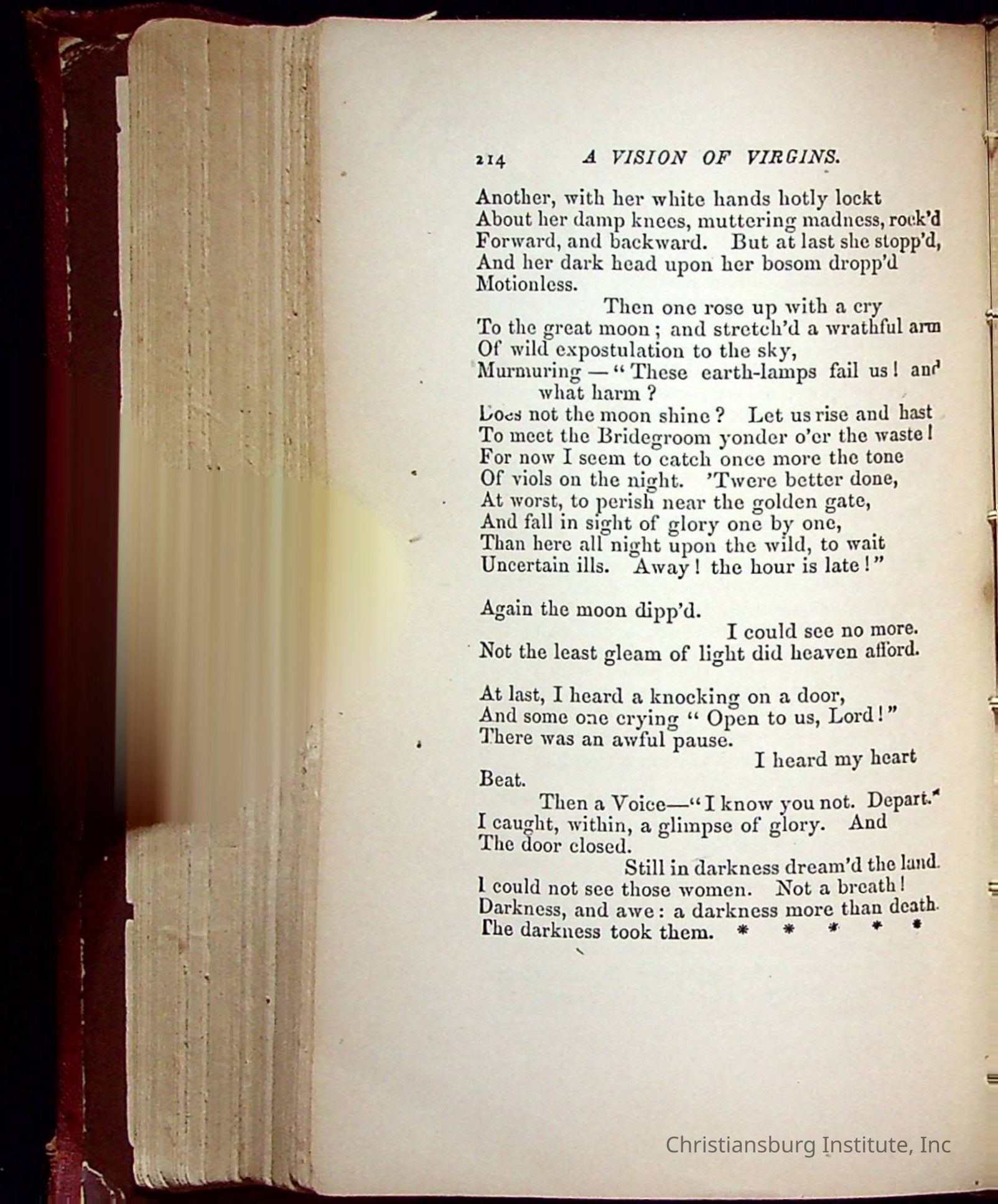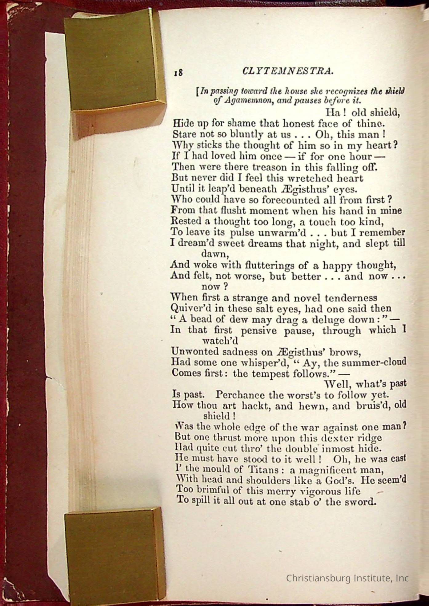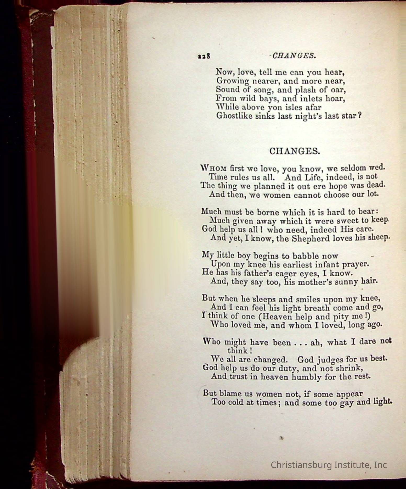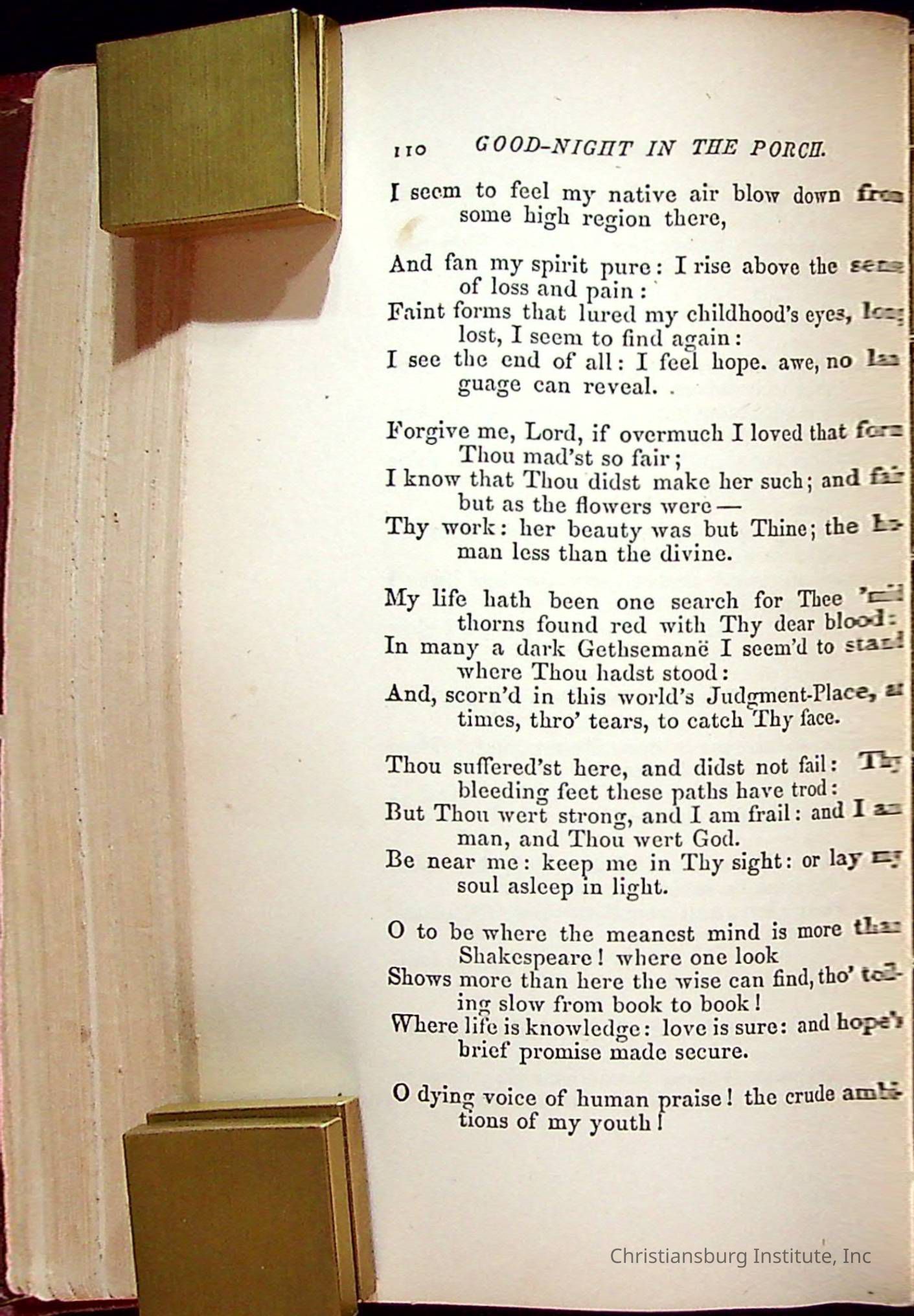 "Poems" written by Owen Meredith and published by James R. Osgood and Company in the year 1875. This book was in the Christiansburg Institute library.