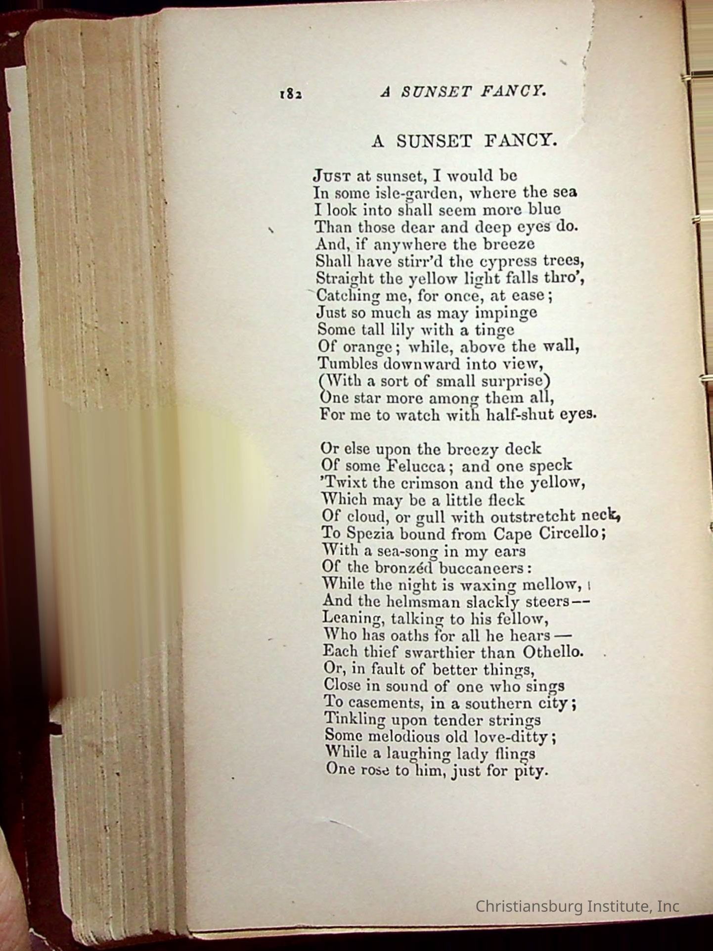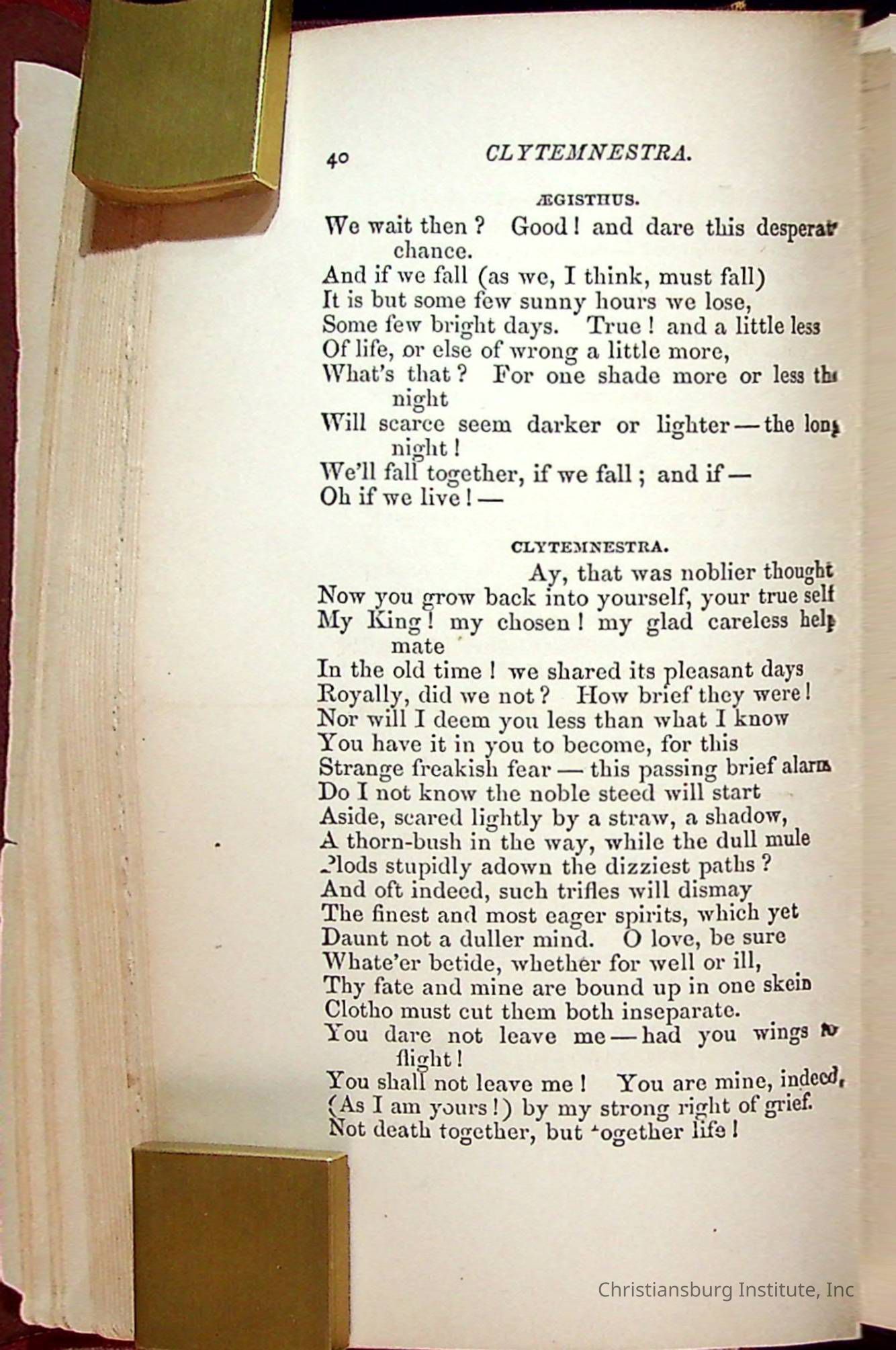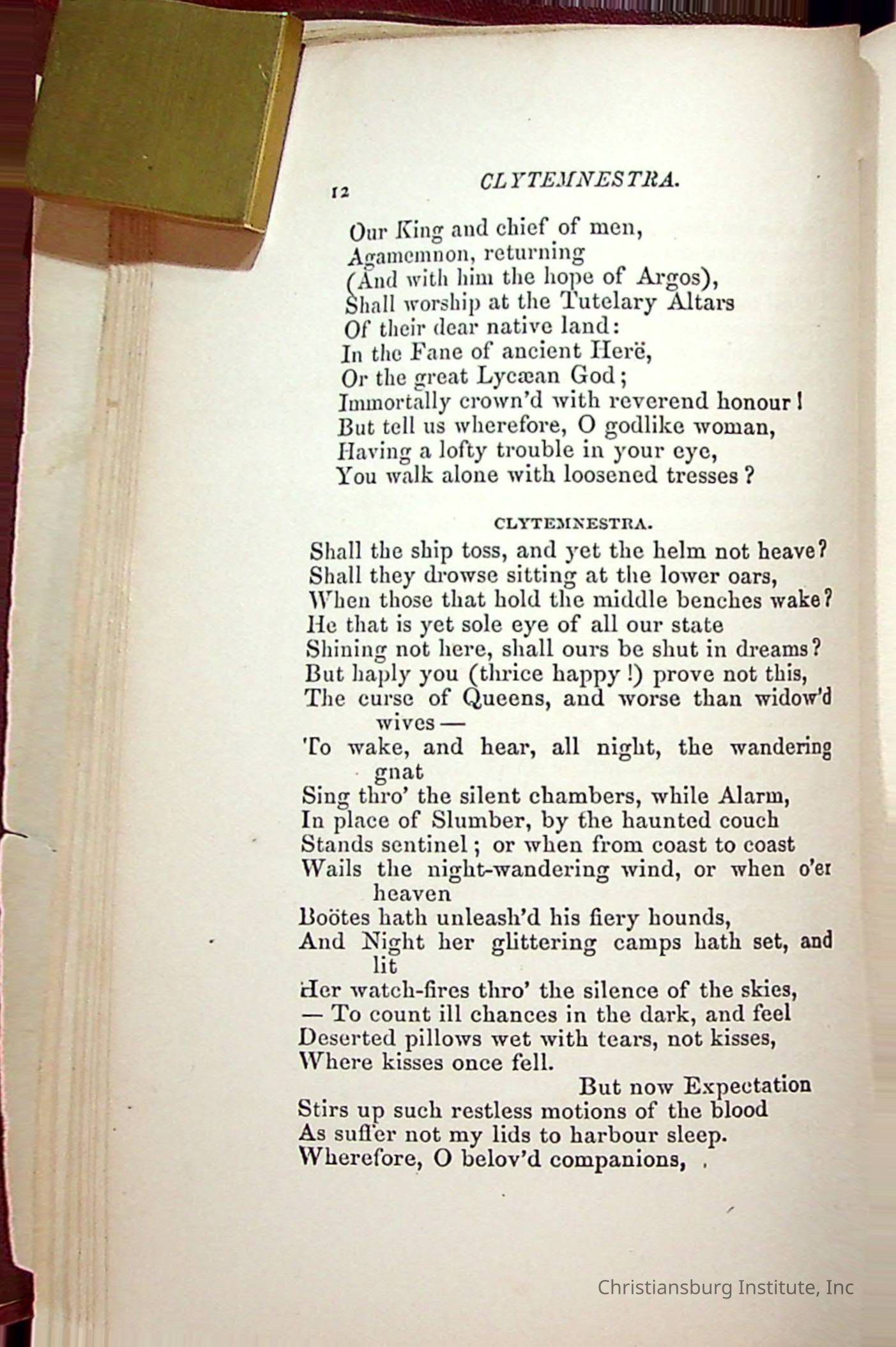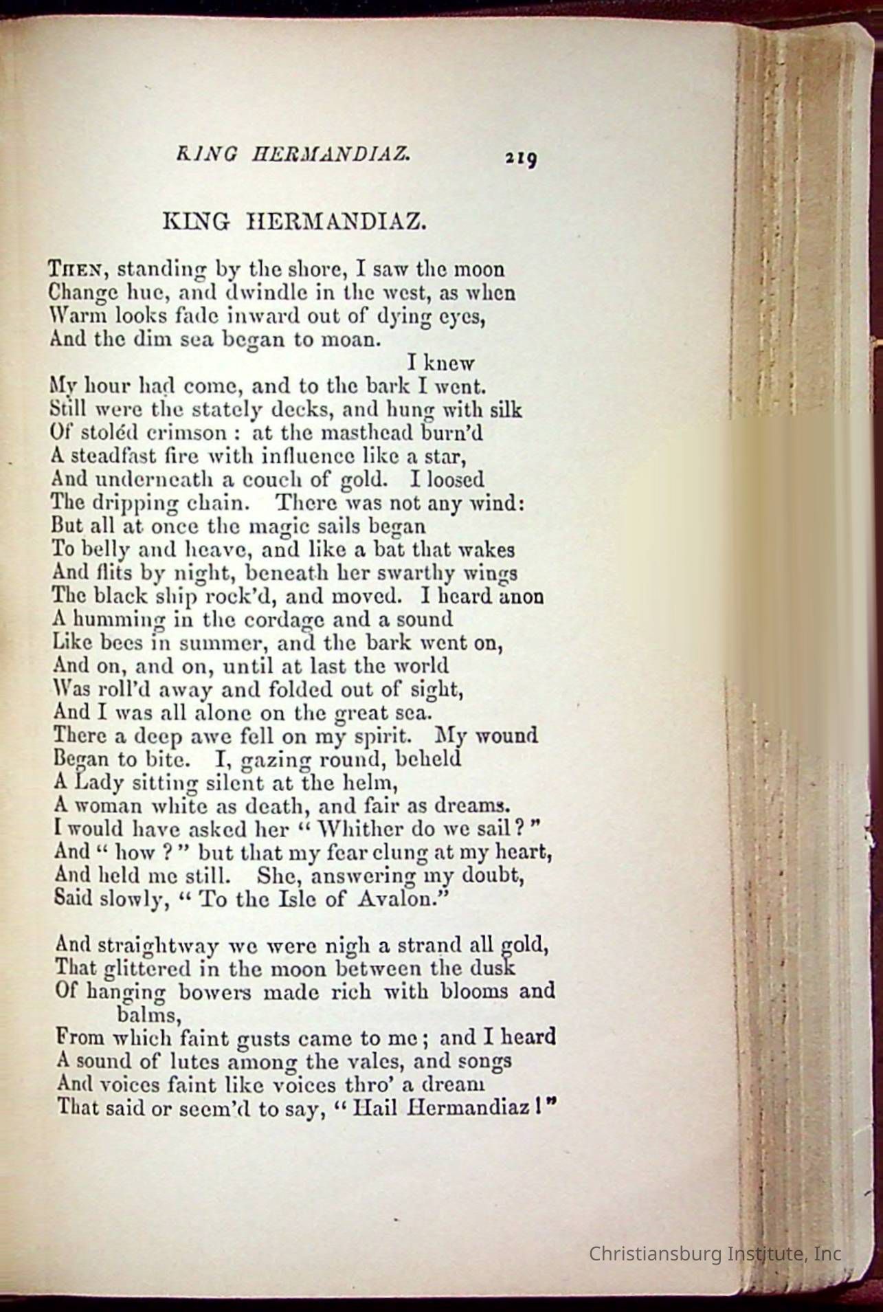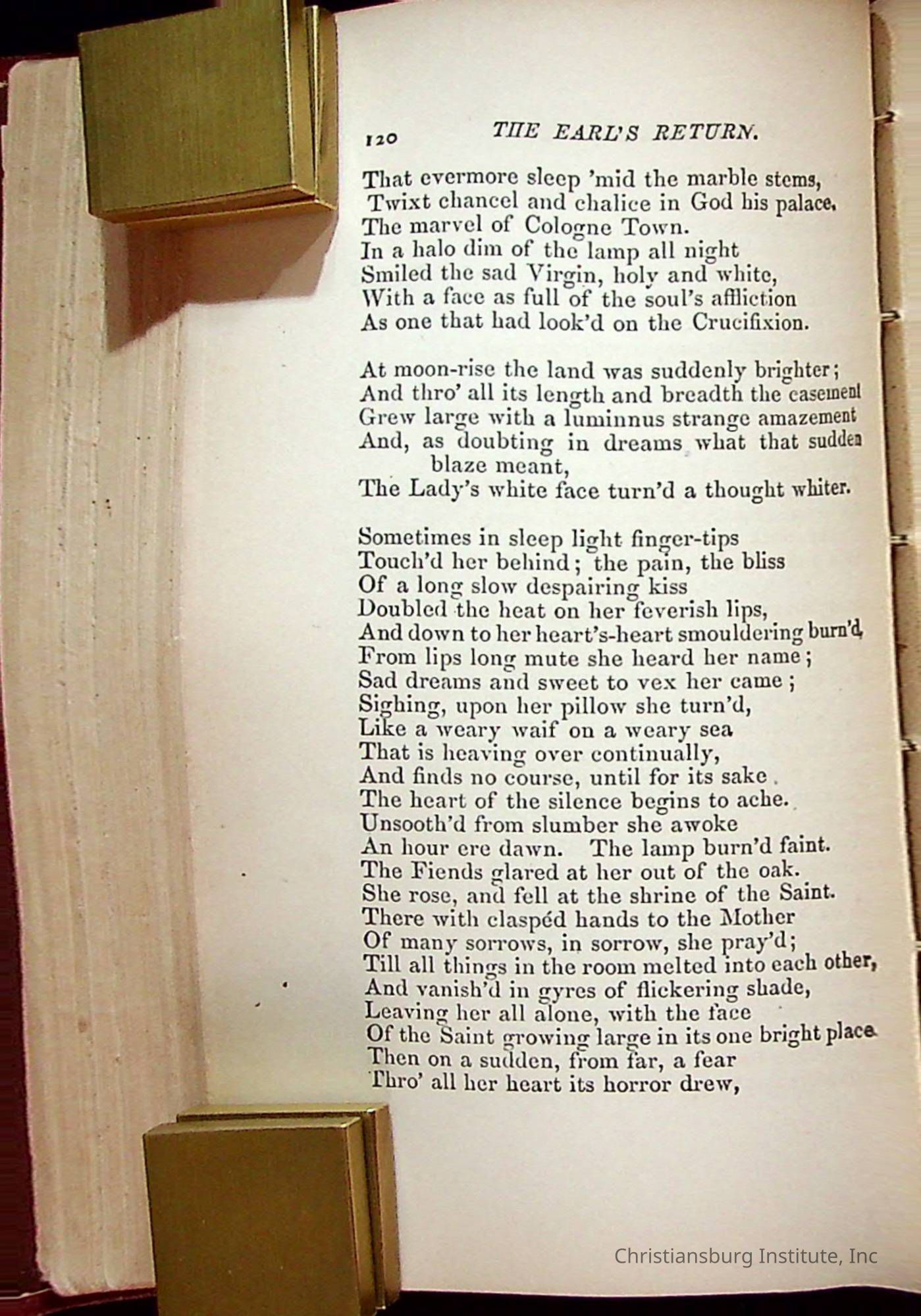 "Poems" written by Owen Meredith and published by James R. Osgood and Company in the year 1875. This book was in the Christiansburg Institute library.