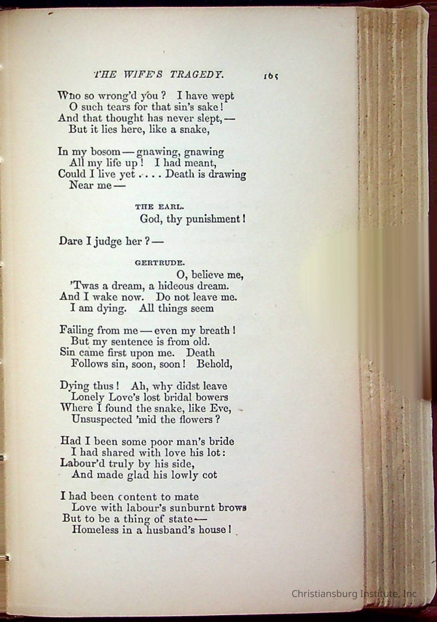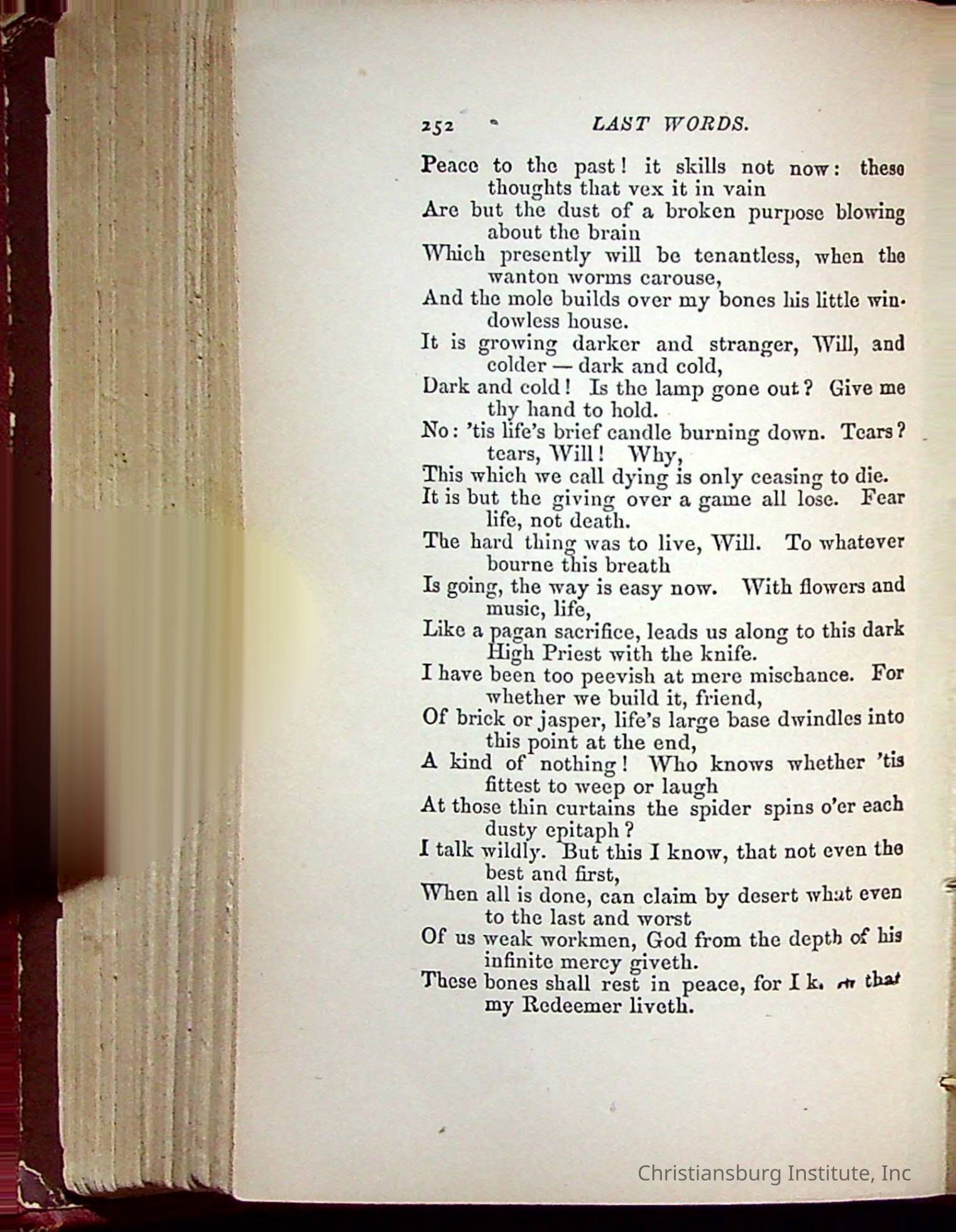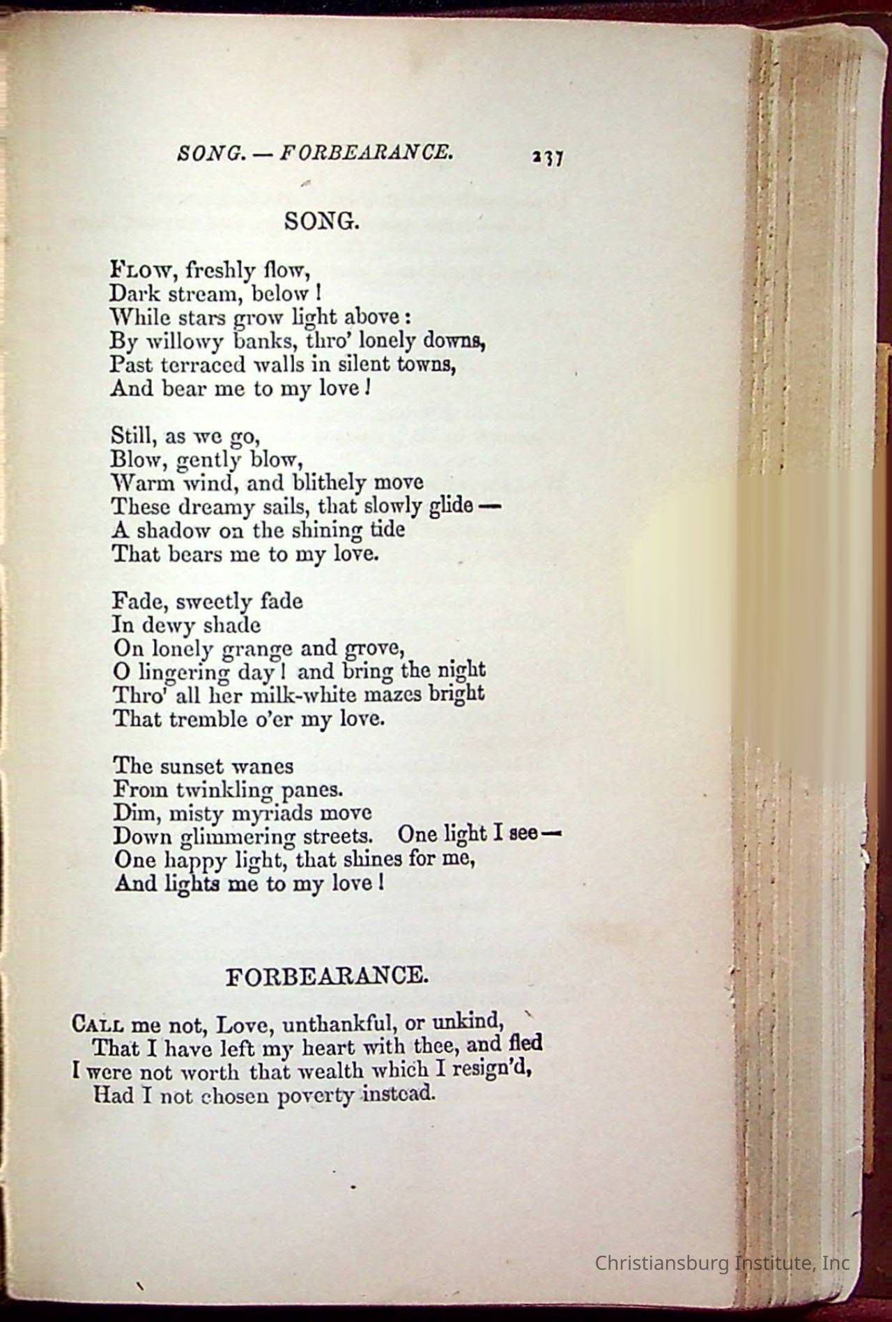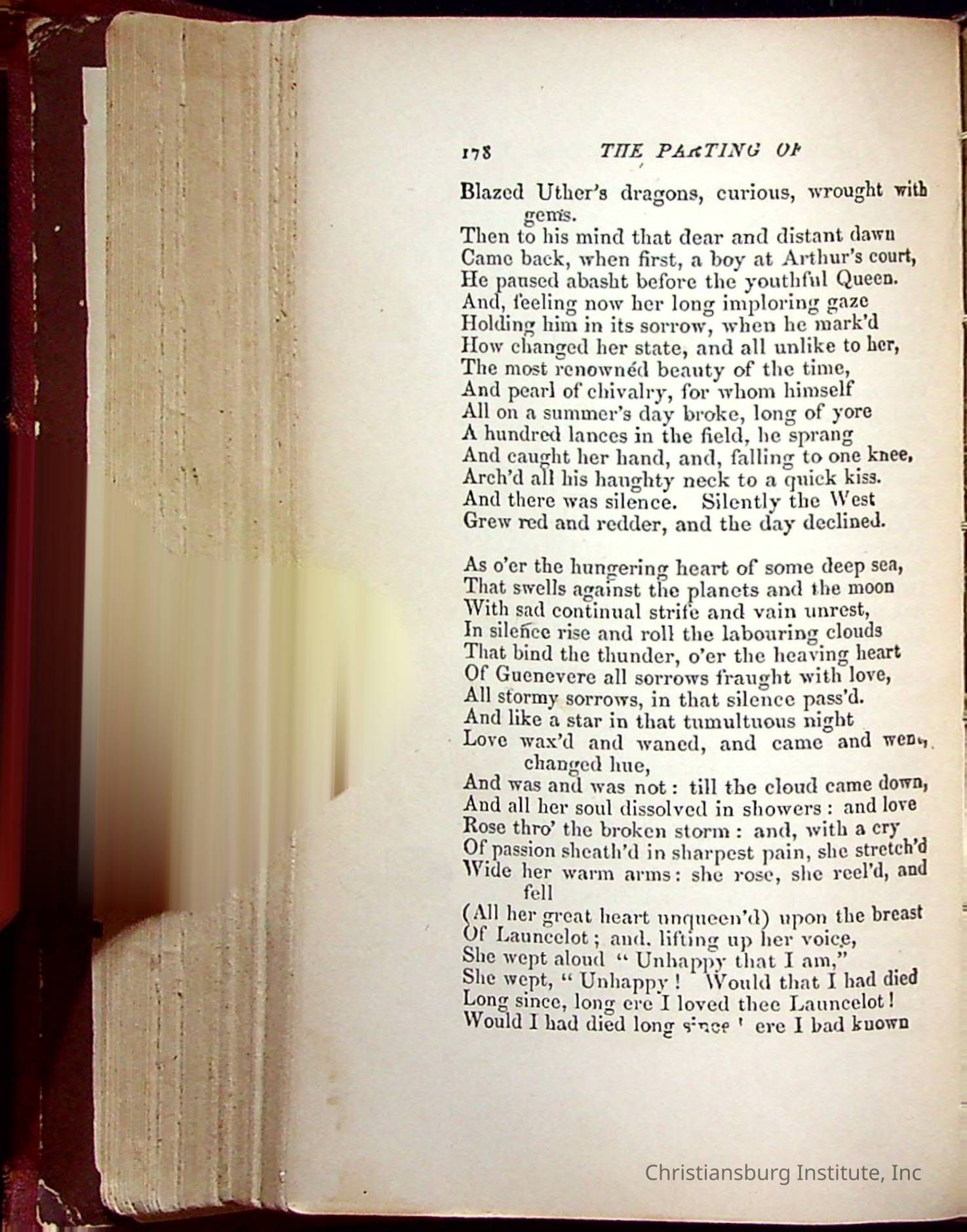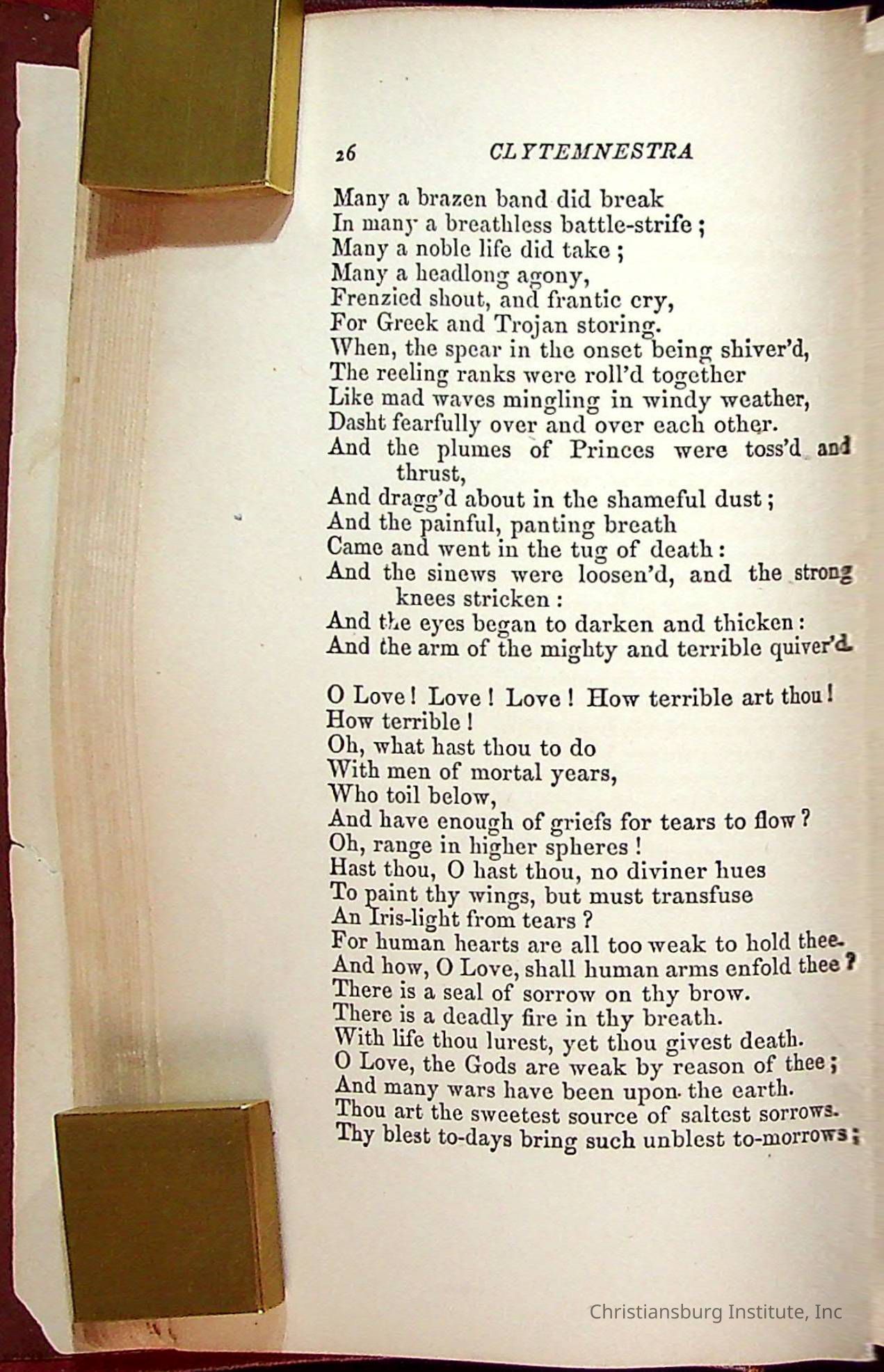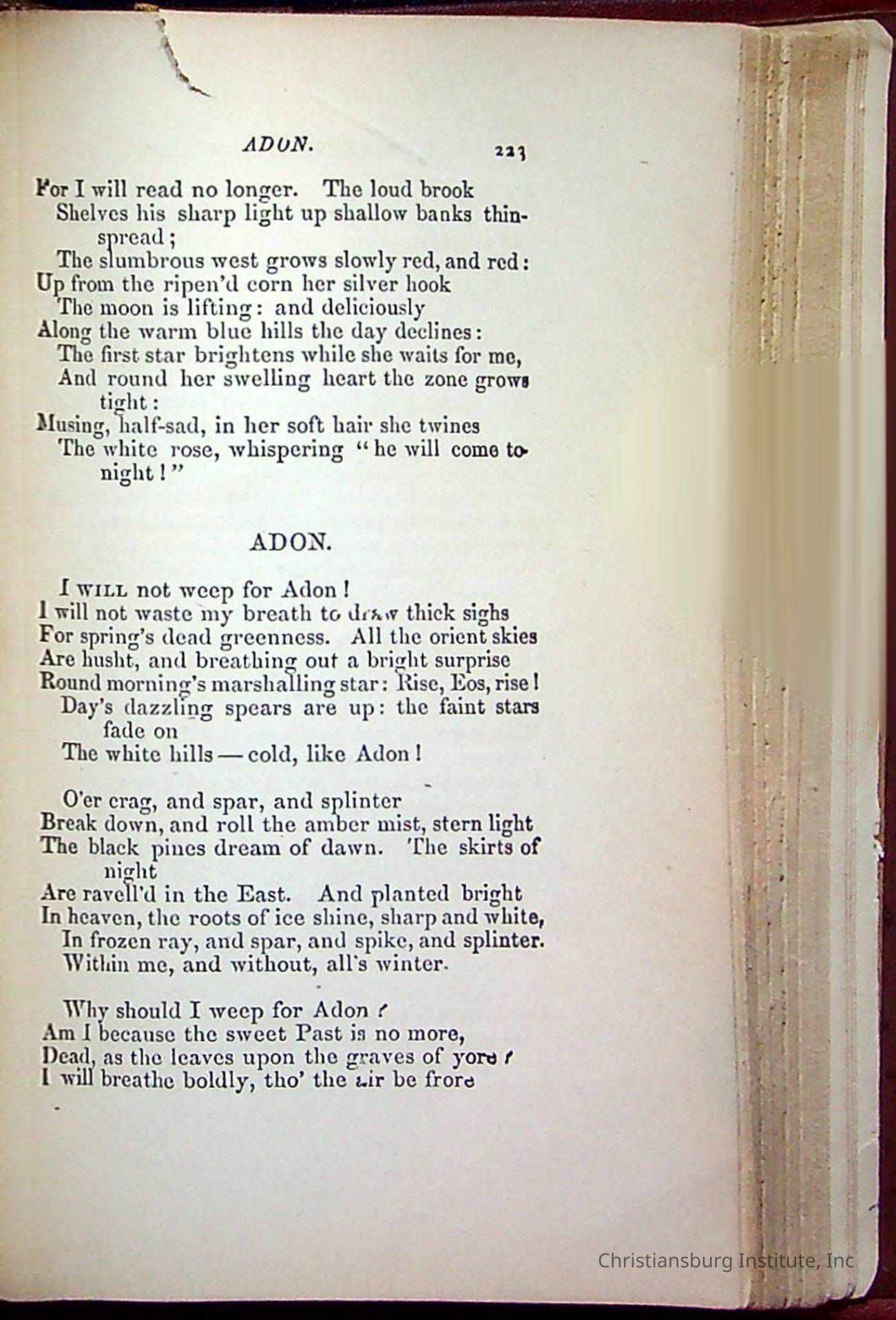 "Poems" written by Owen Meredith and published by James R. Osgood and Company in the year 1875. This book was in the Christiansburg Institute library.
