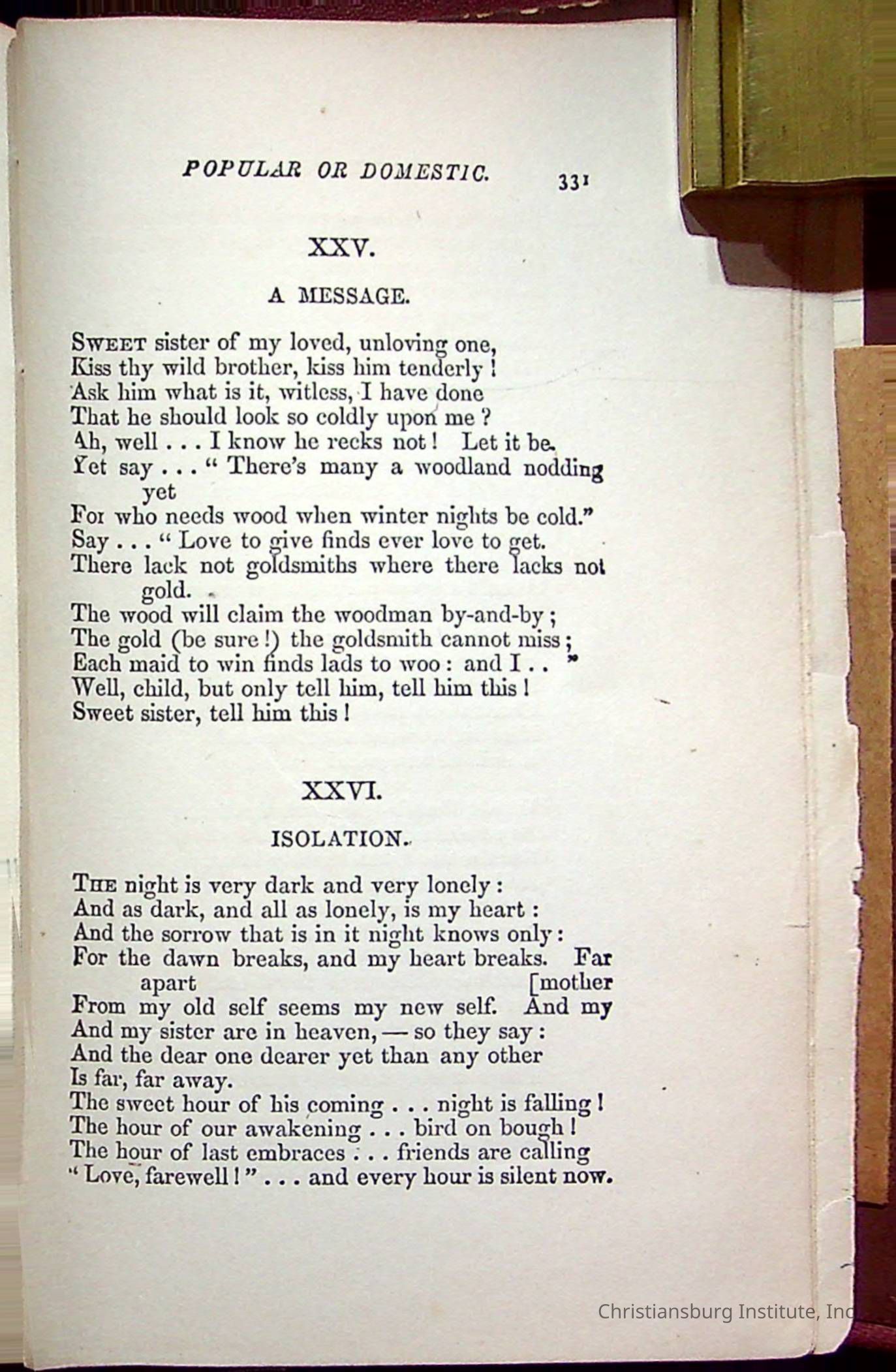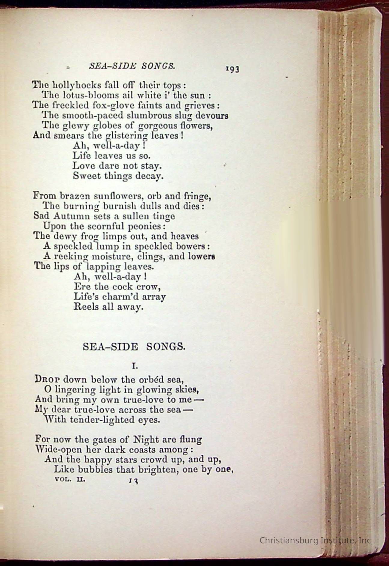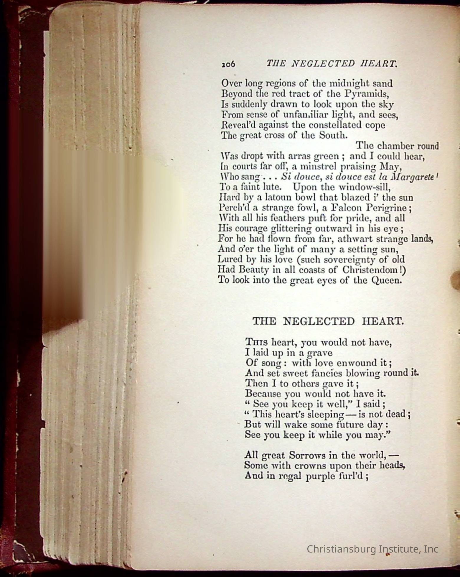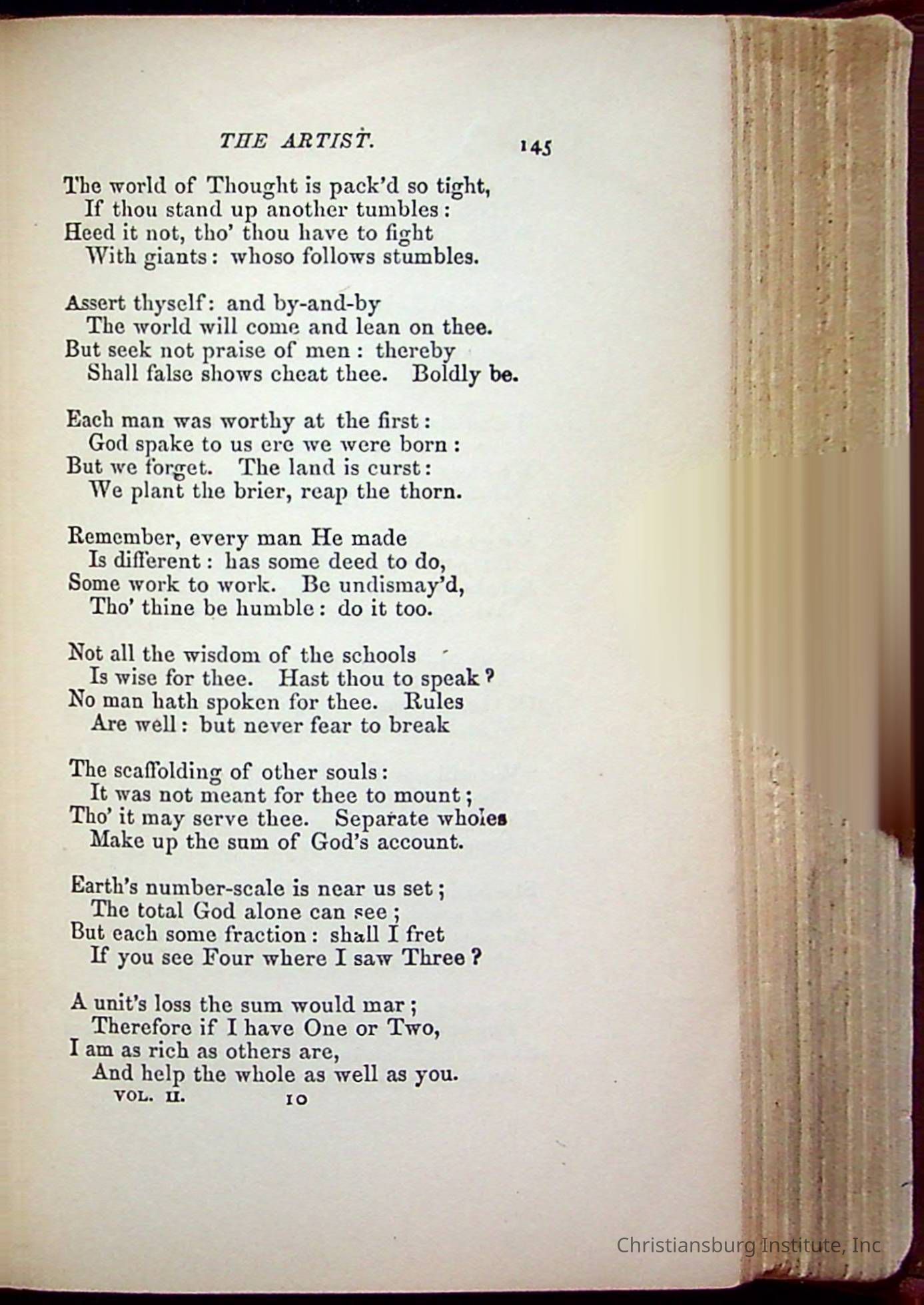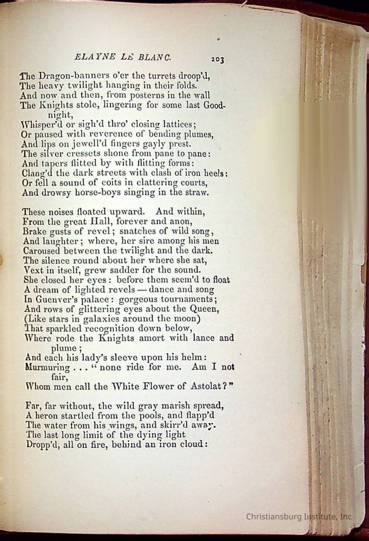 "Poems" written by Owen Meredith and published by James R. Osgood and Company in the year 1875. This book was in the Christiansburg Institute library.