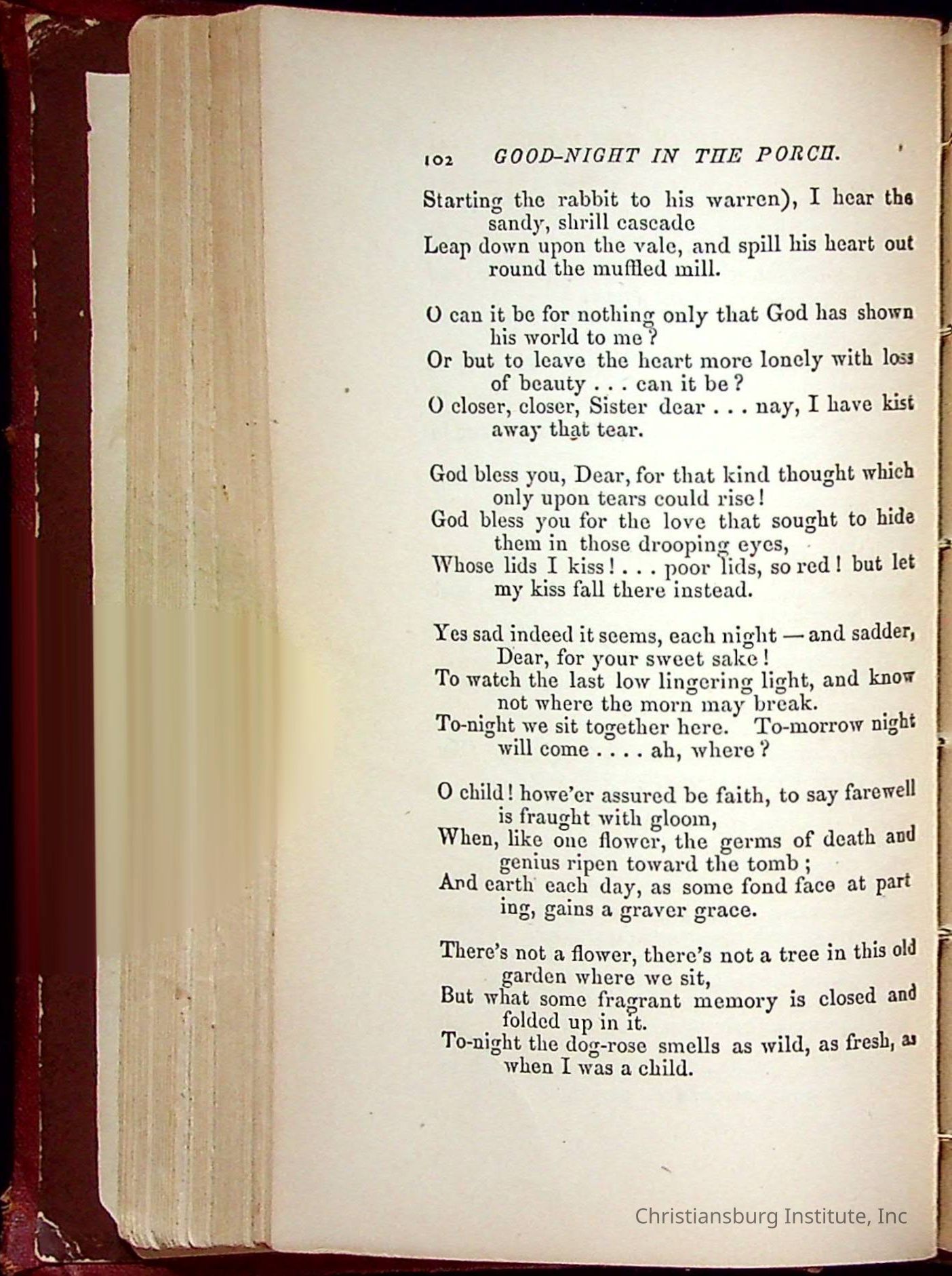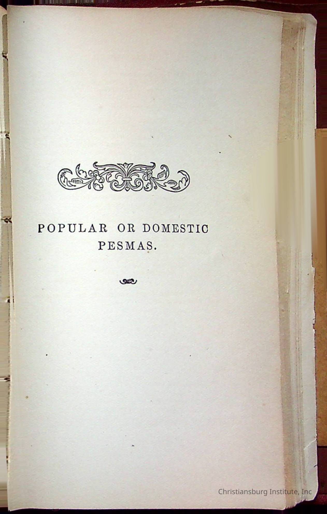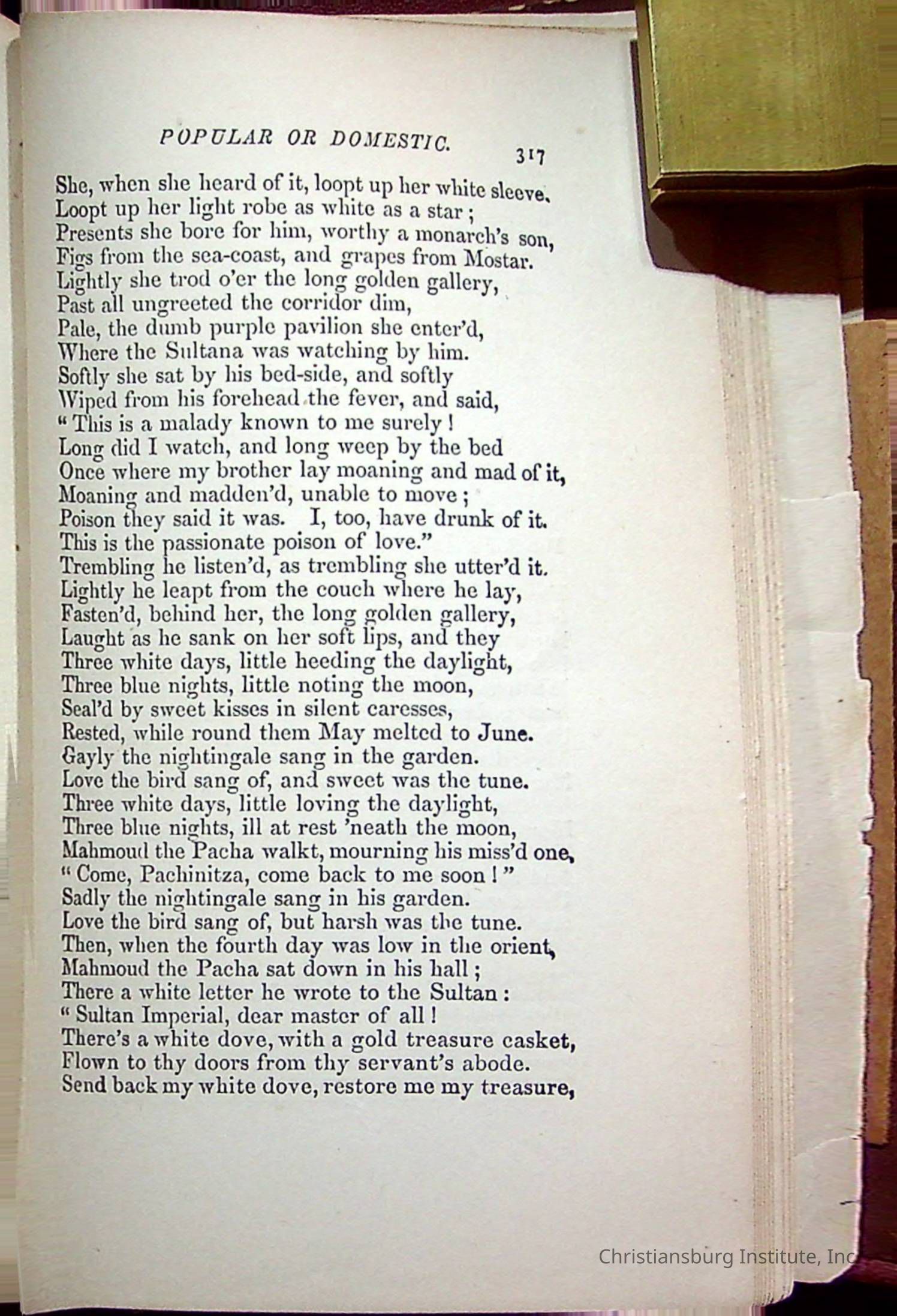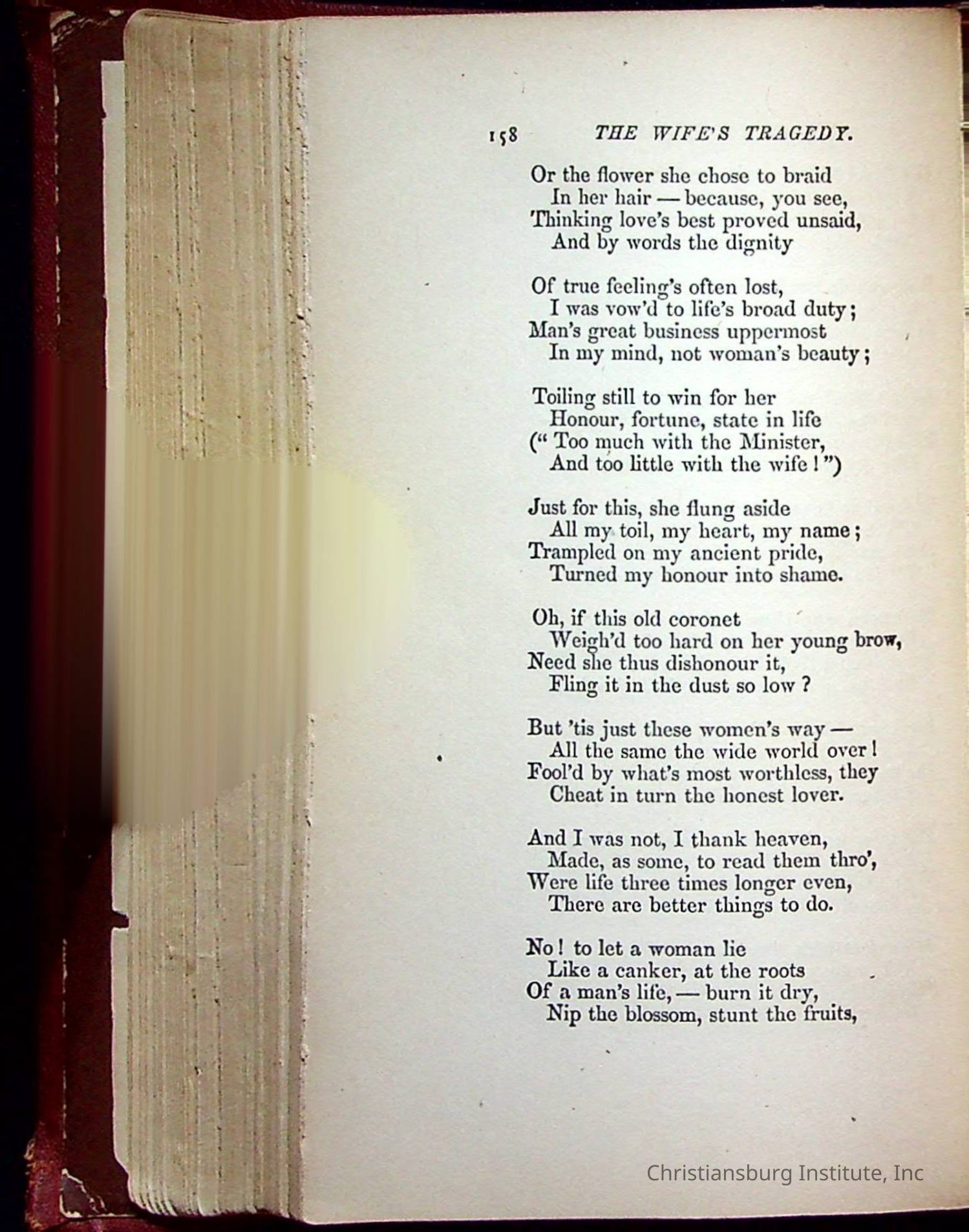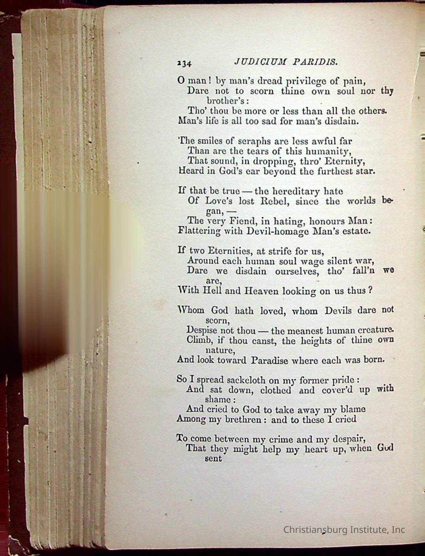 "Poems" written by Owen Meredith and published by James R. Osgood and Company in the year 1875. This book was in the Christiansburg Institute library.