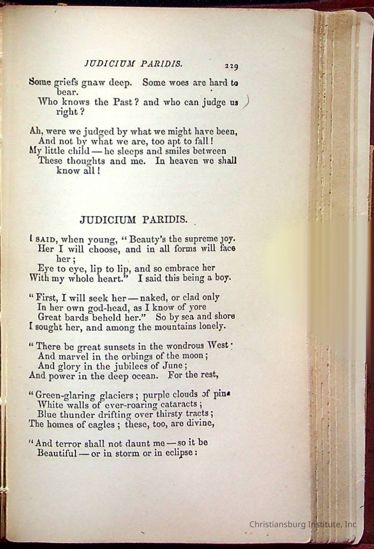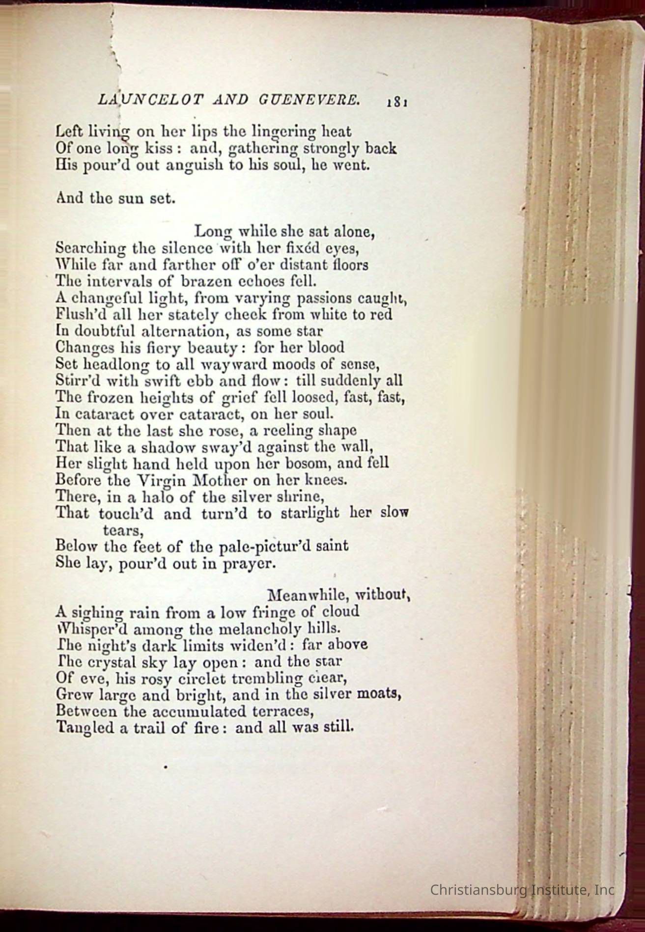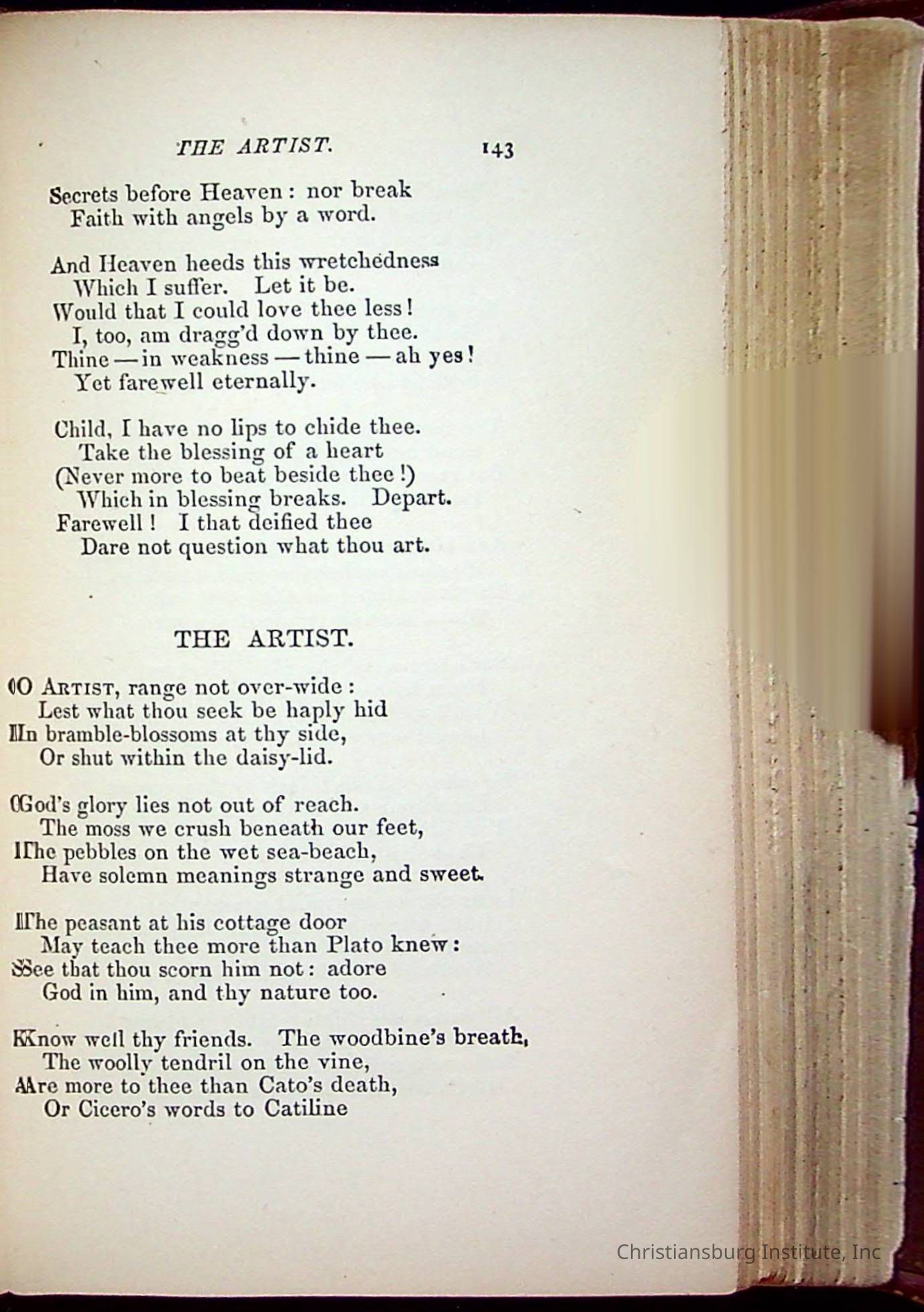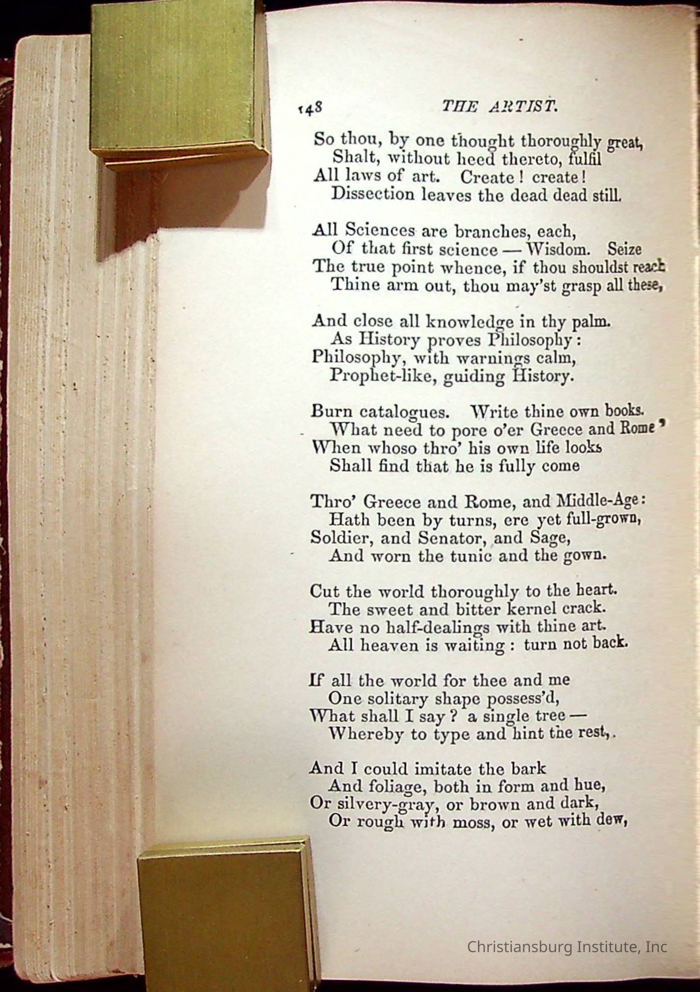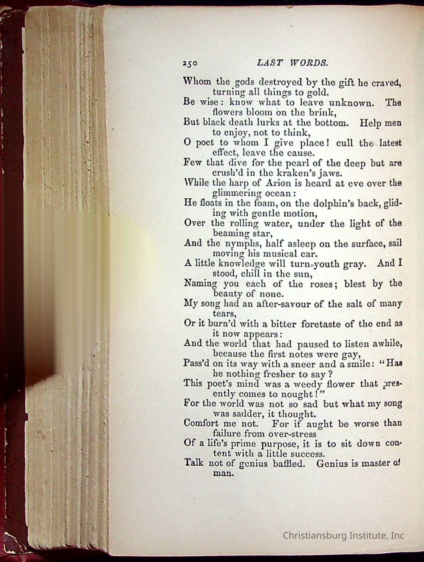 "Poems" written by Owen Meredith and published by James R. Osgood and Company in the year 1875. This book was in the Christiansburg Institute library.