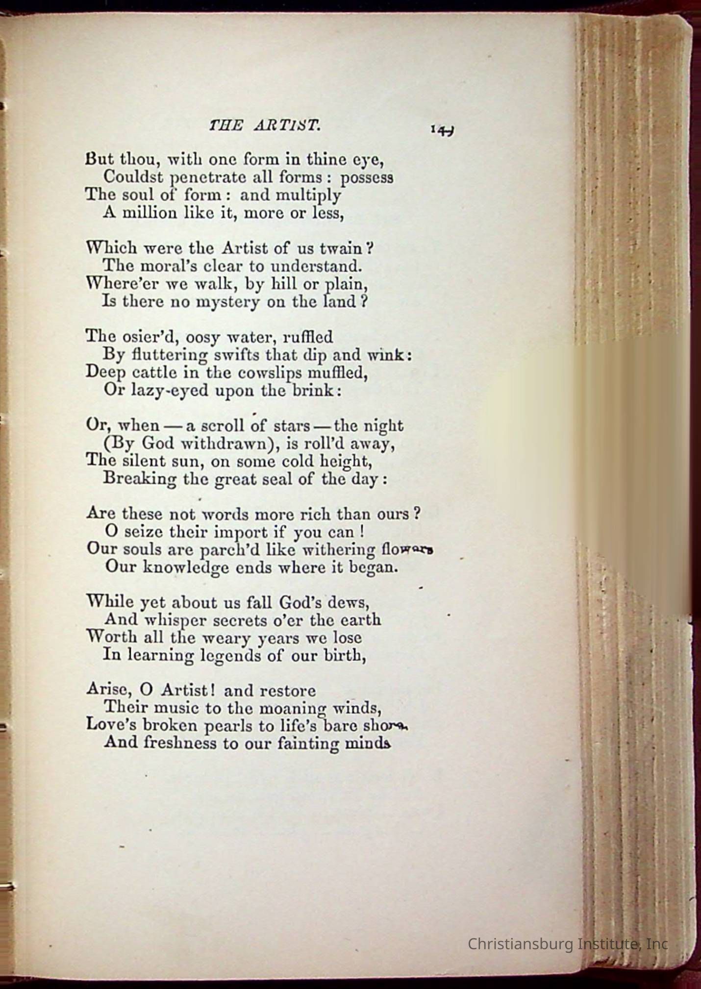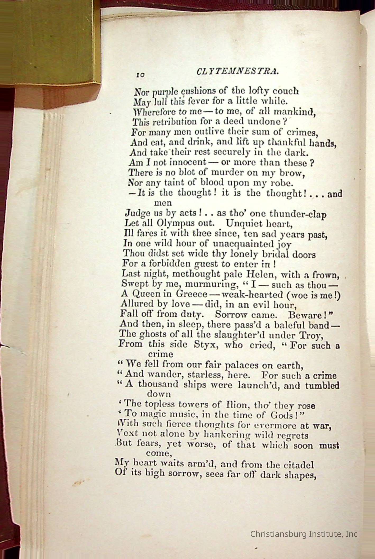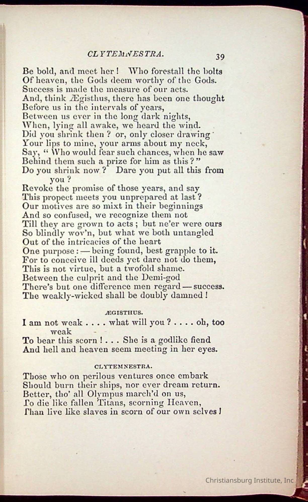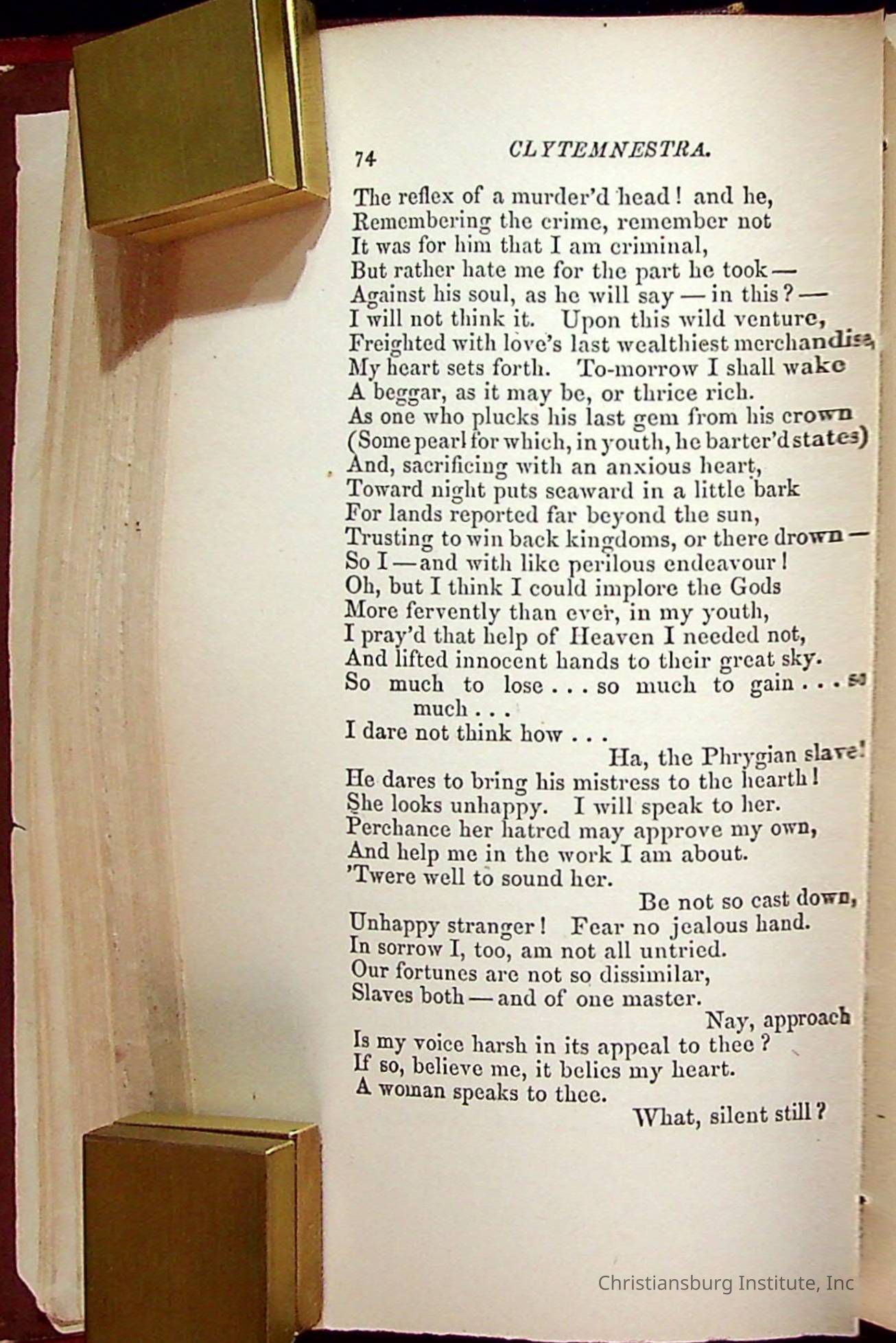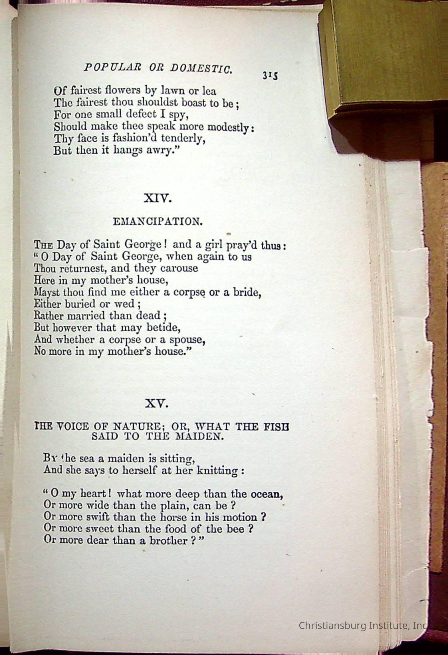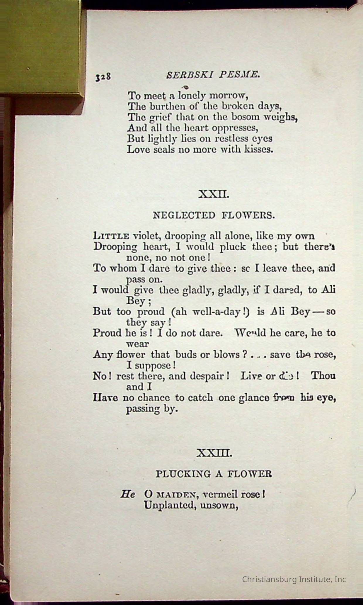 "Poems" written by Owen Meredith and published by James R. Osgood and Company in the year 1875. This book was in the Christiansburg Institute library.