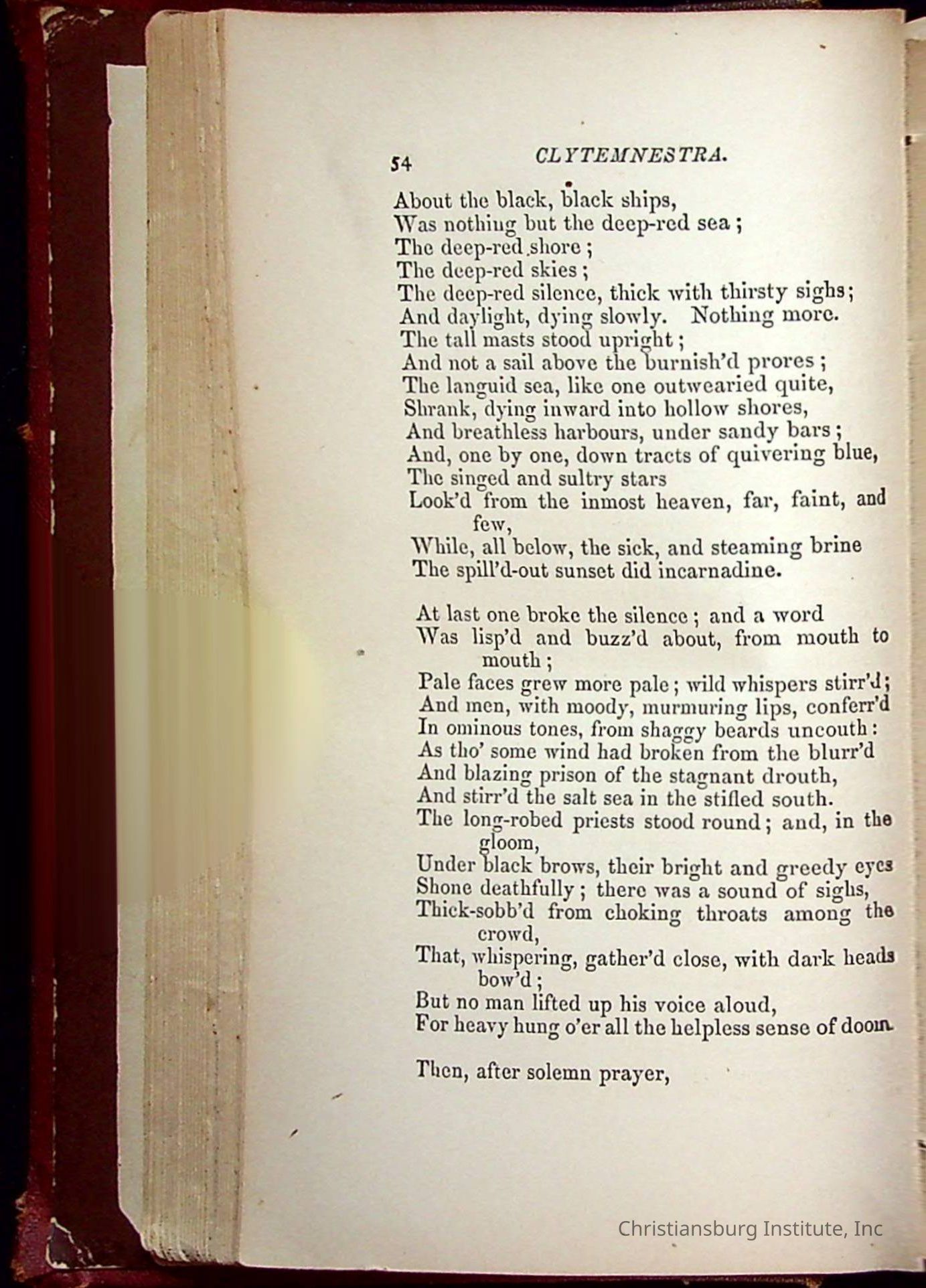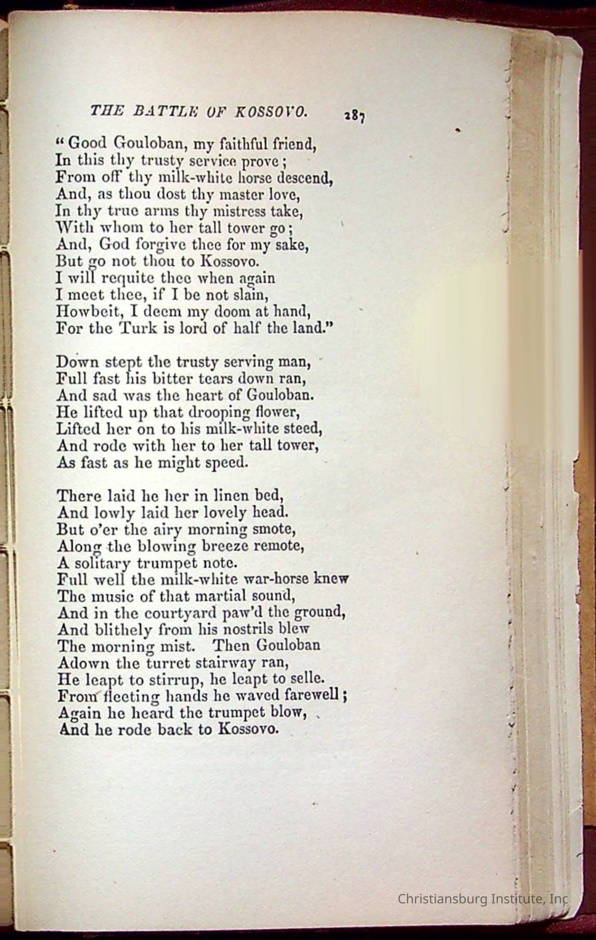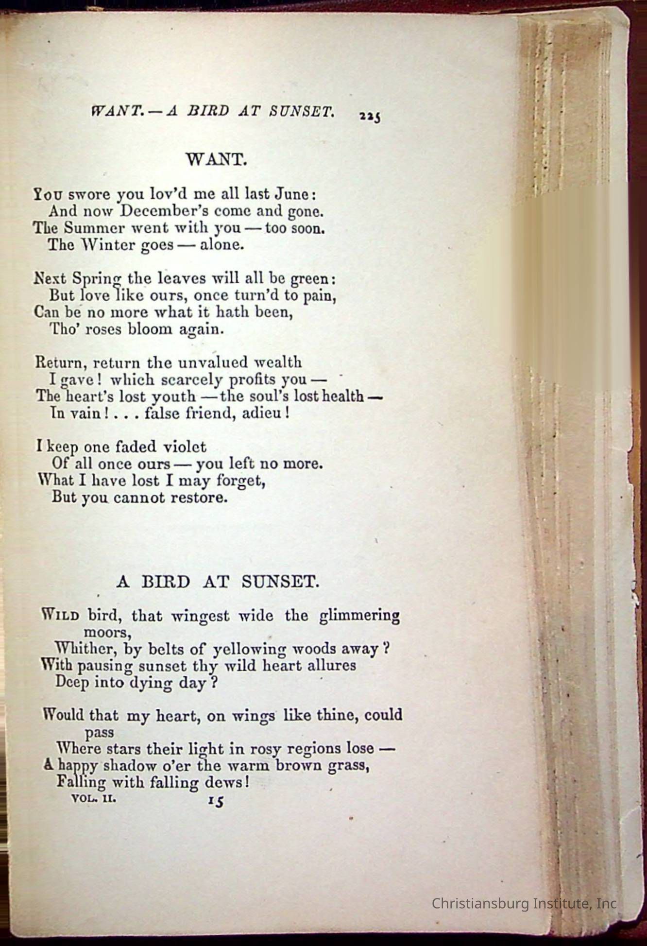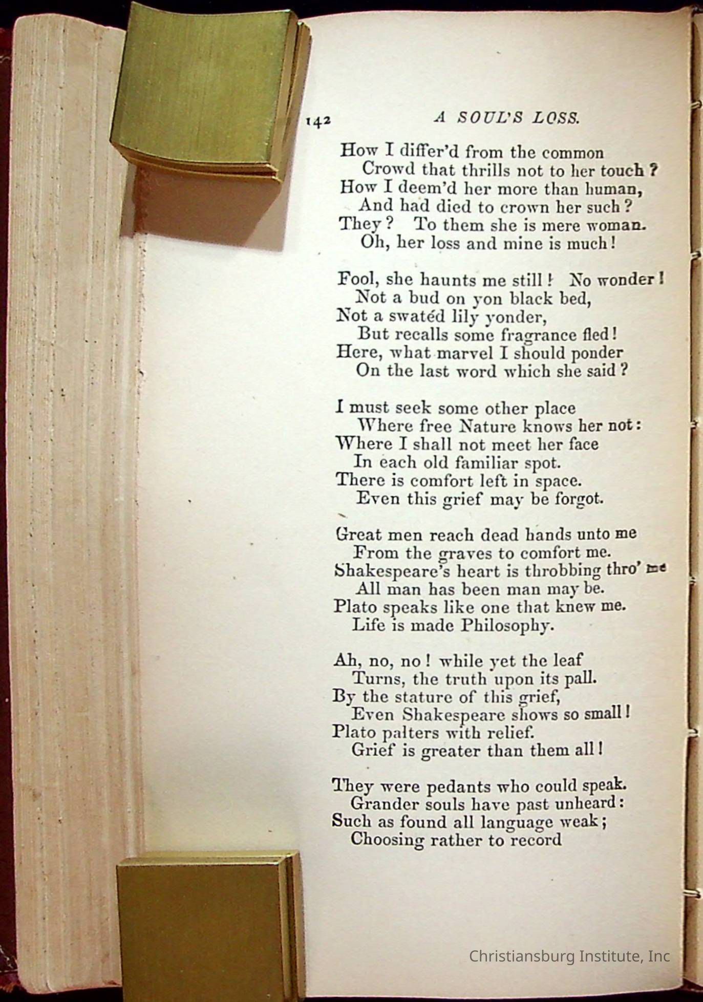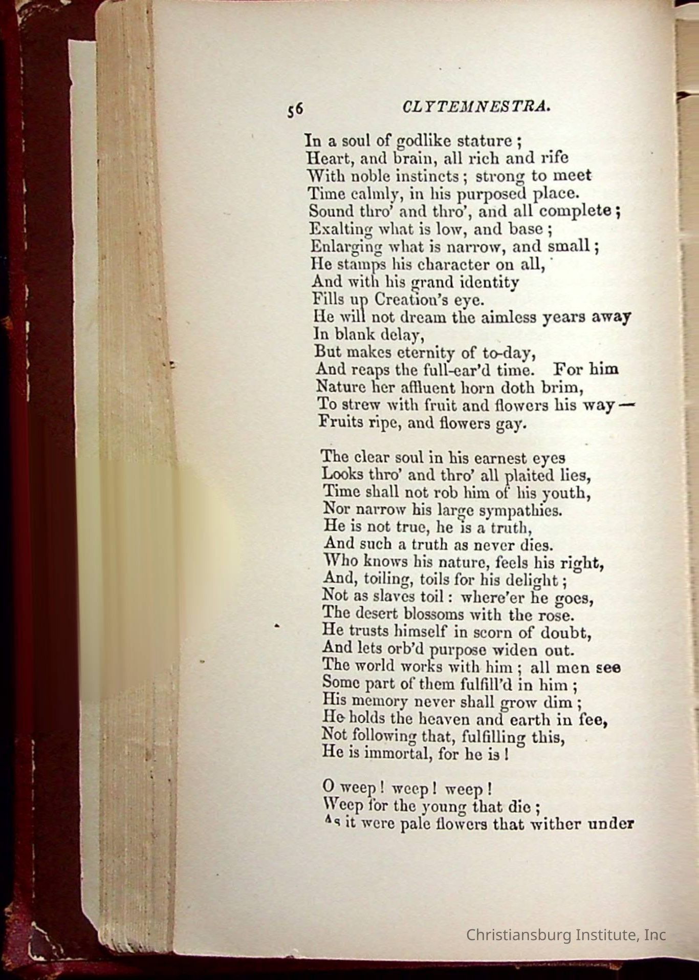 "Poems" written by Owen Meredith and published by James R. Osgood and Company in the year 1875. This book was in the Christiansburg Institute library.