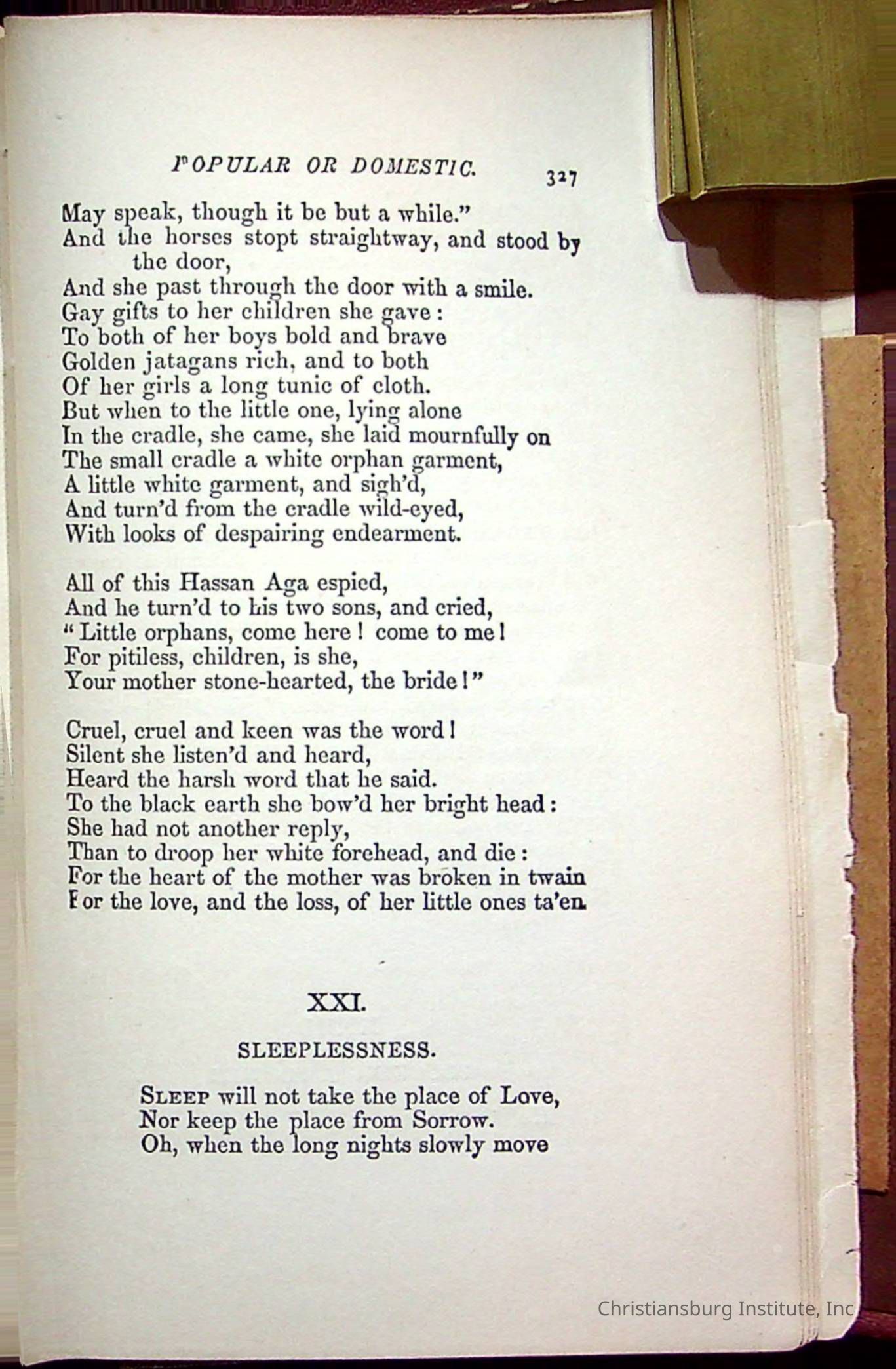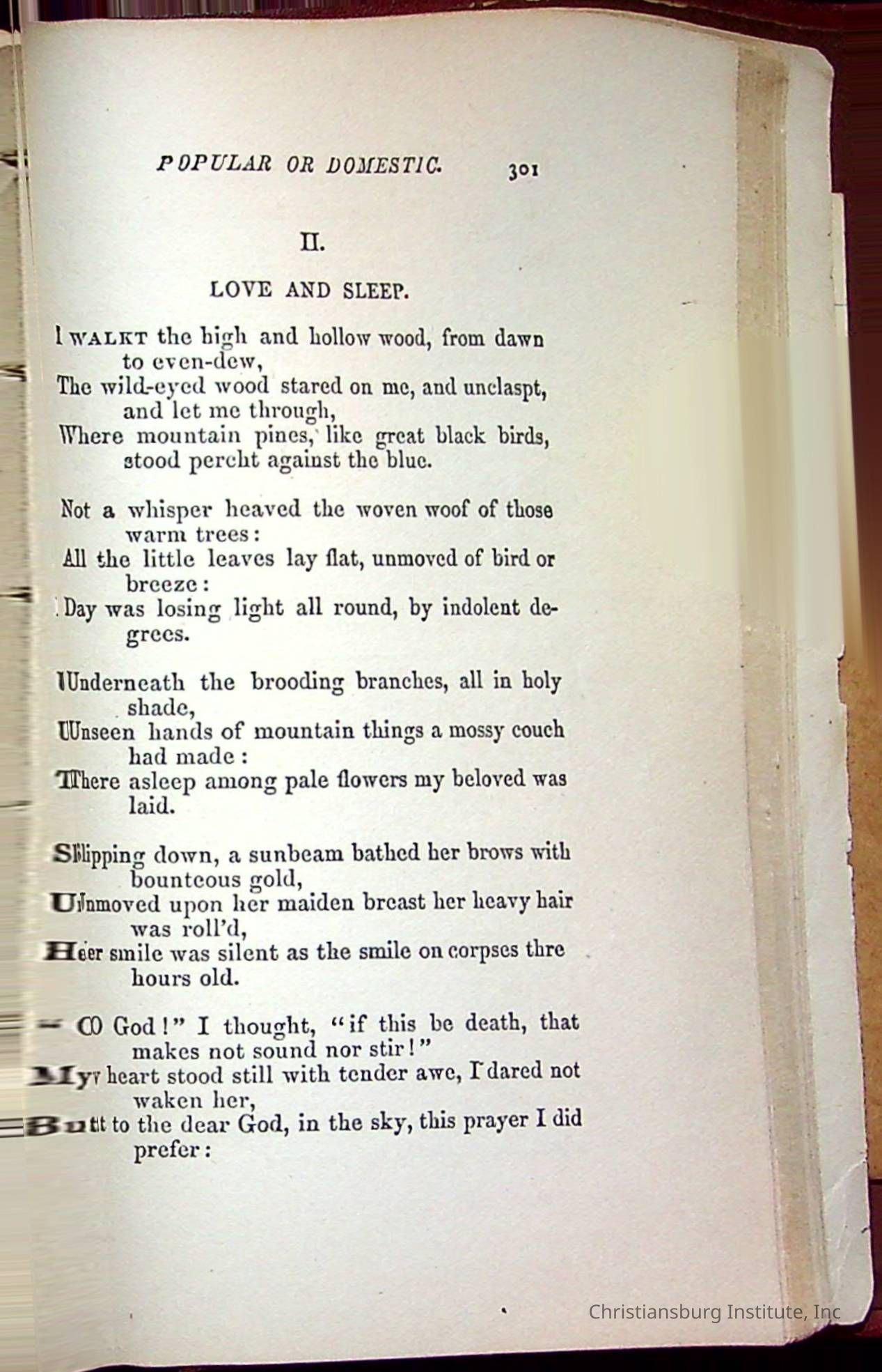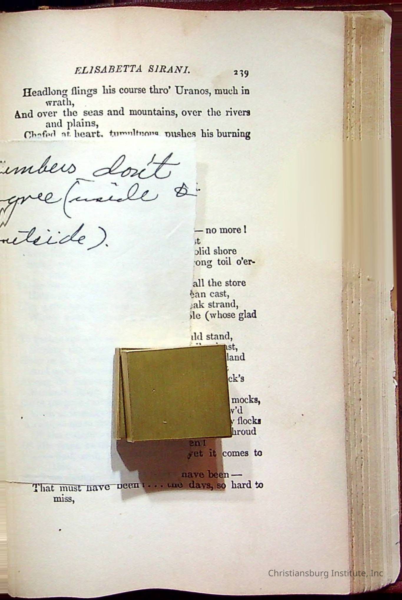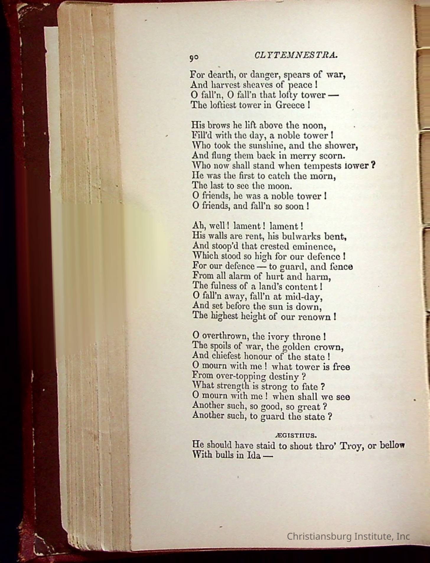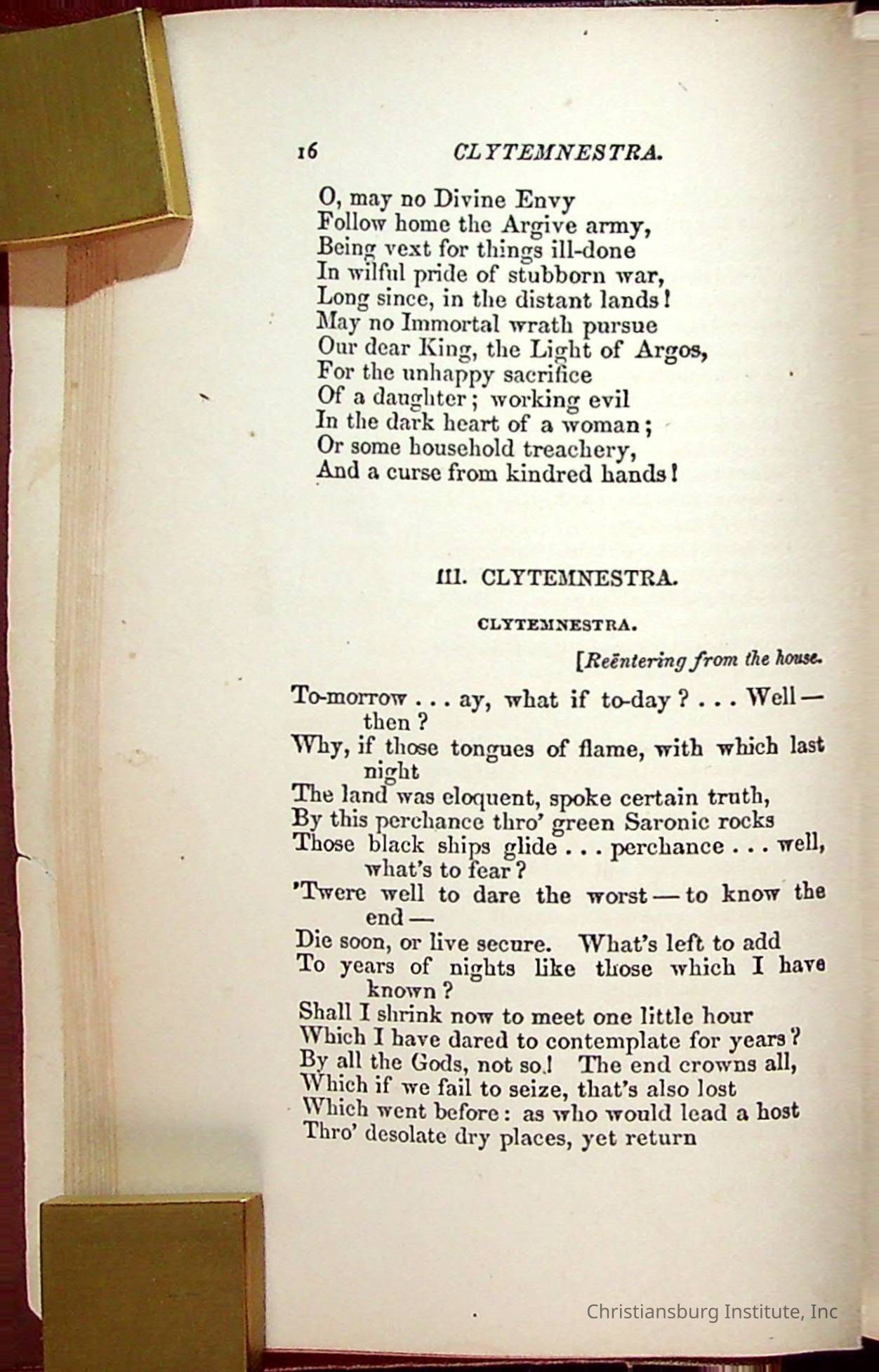 "Poems" written by Owen Meredith and published by James R. Osgood and Company in the year 1875. This book was in the Christiansburg Institute library.