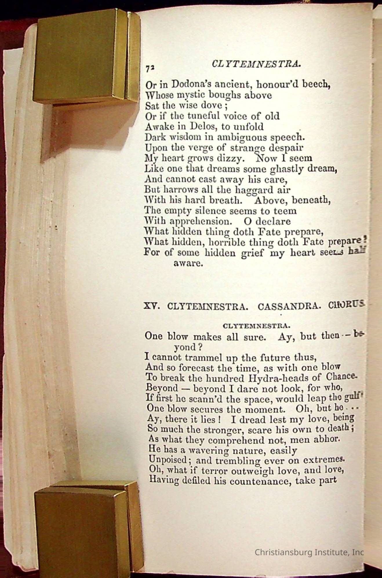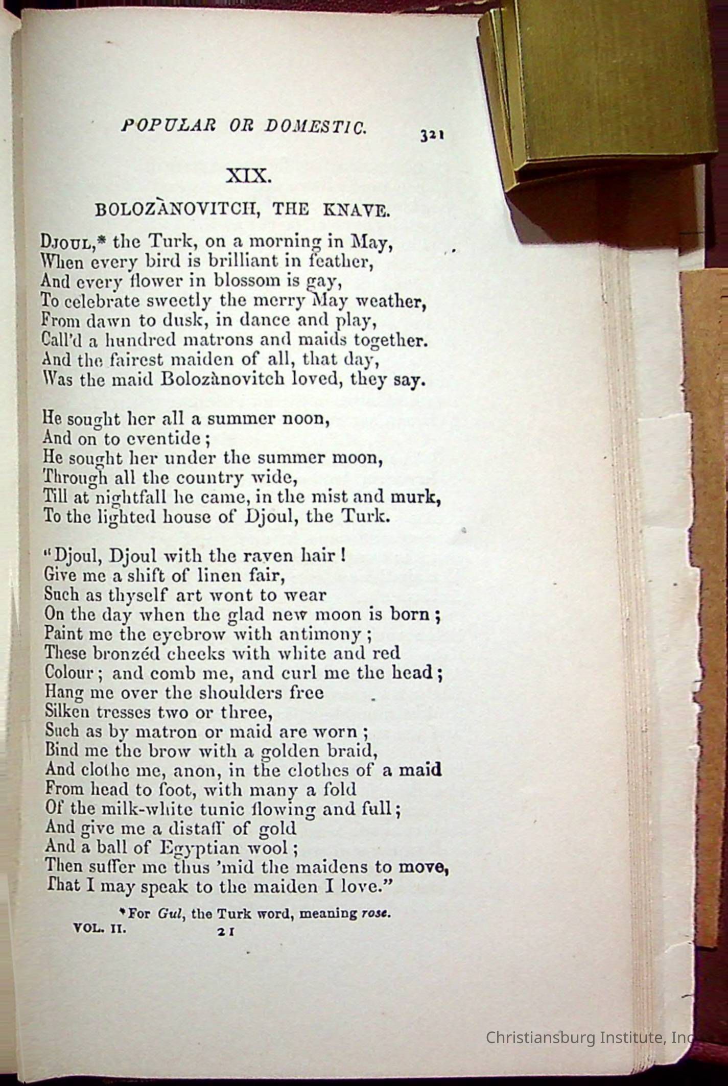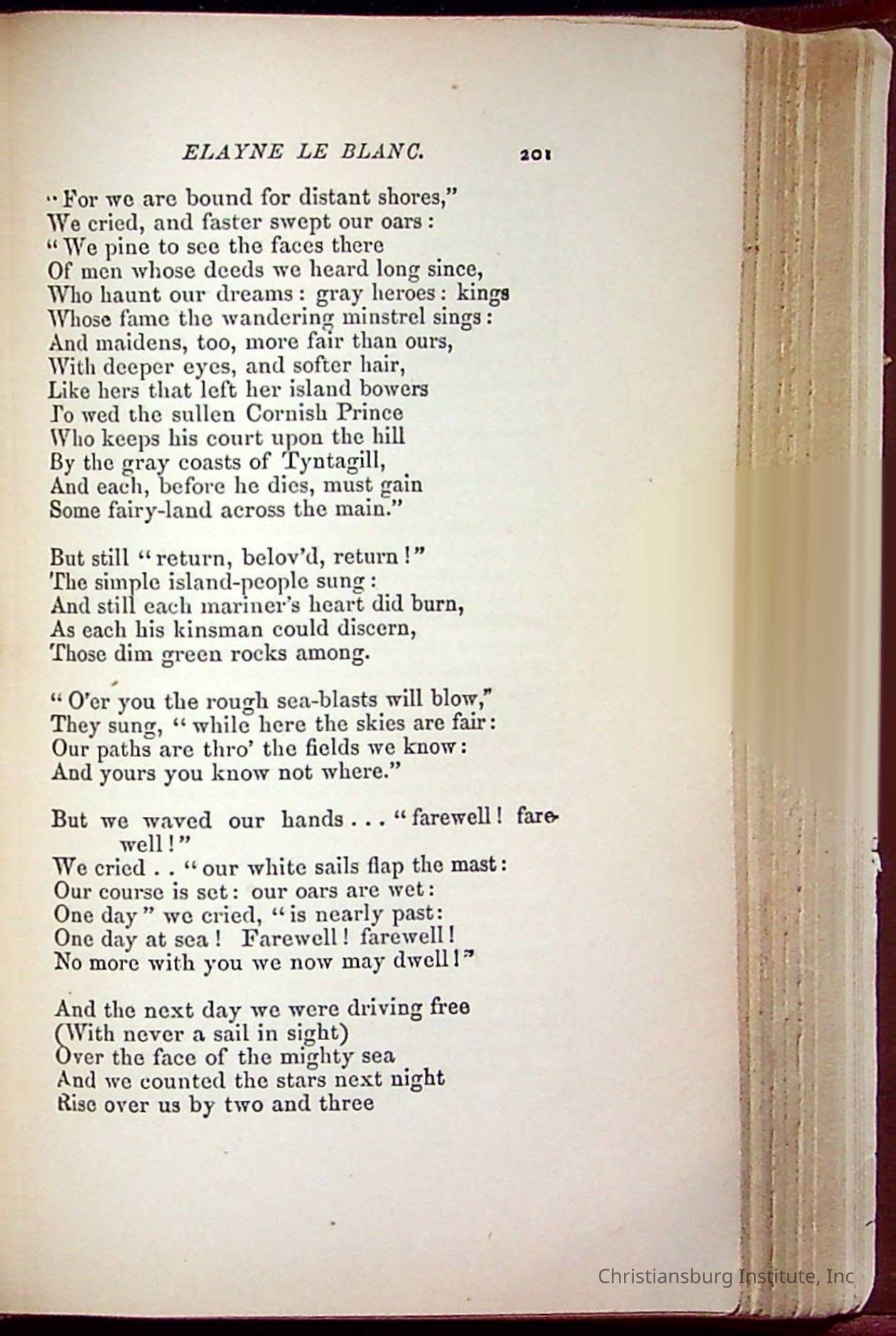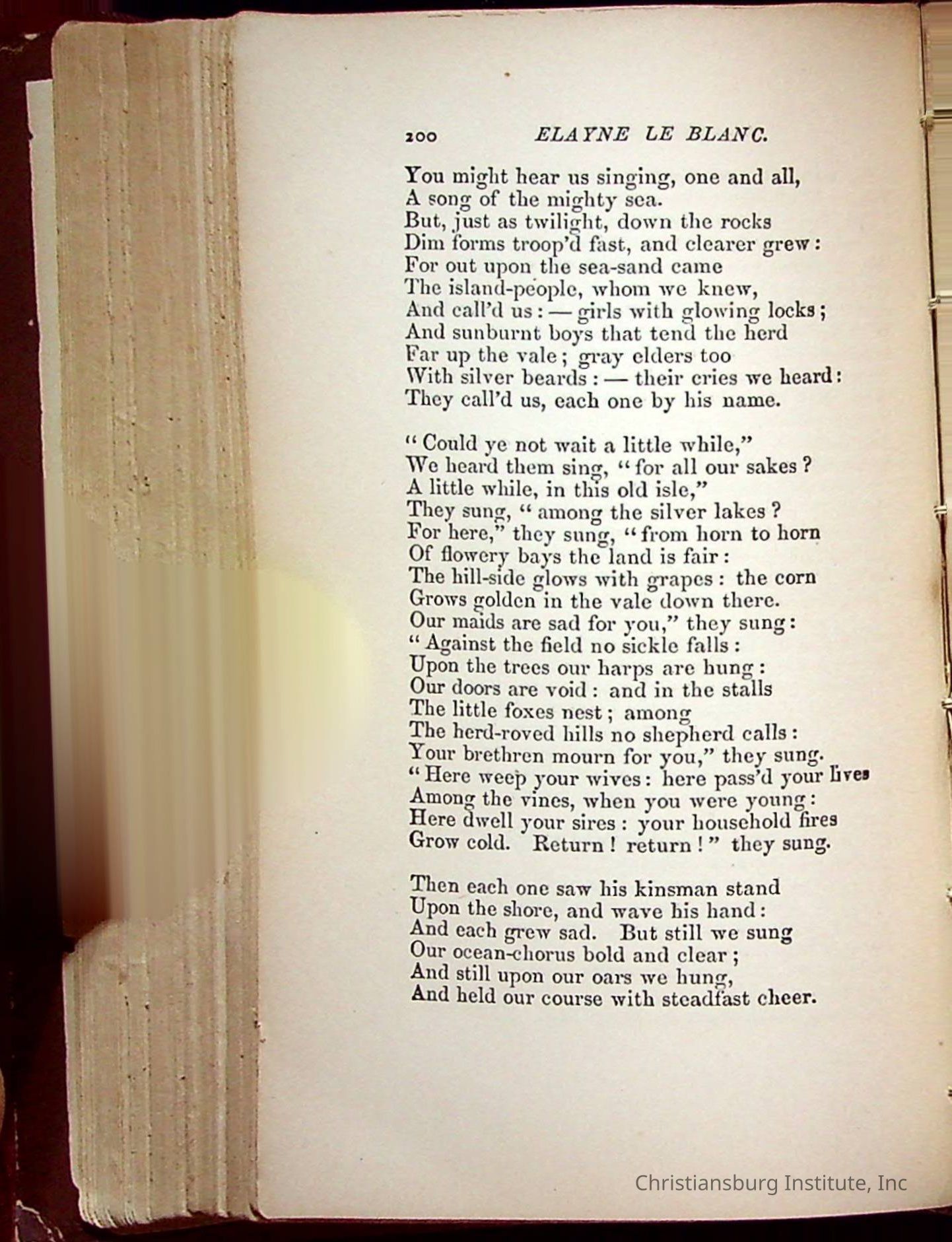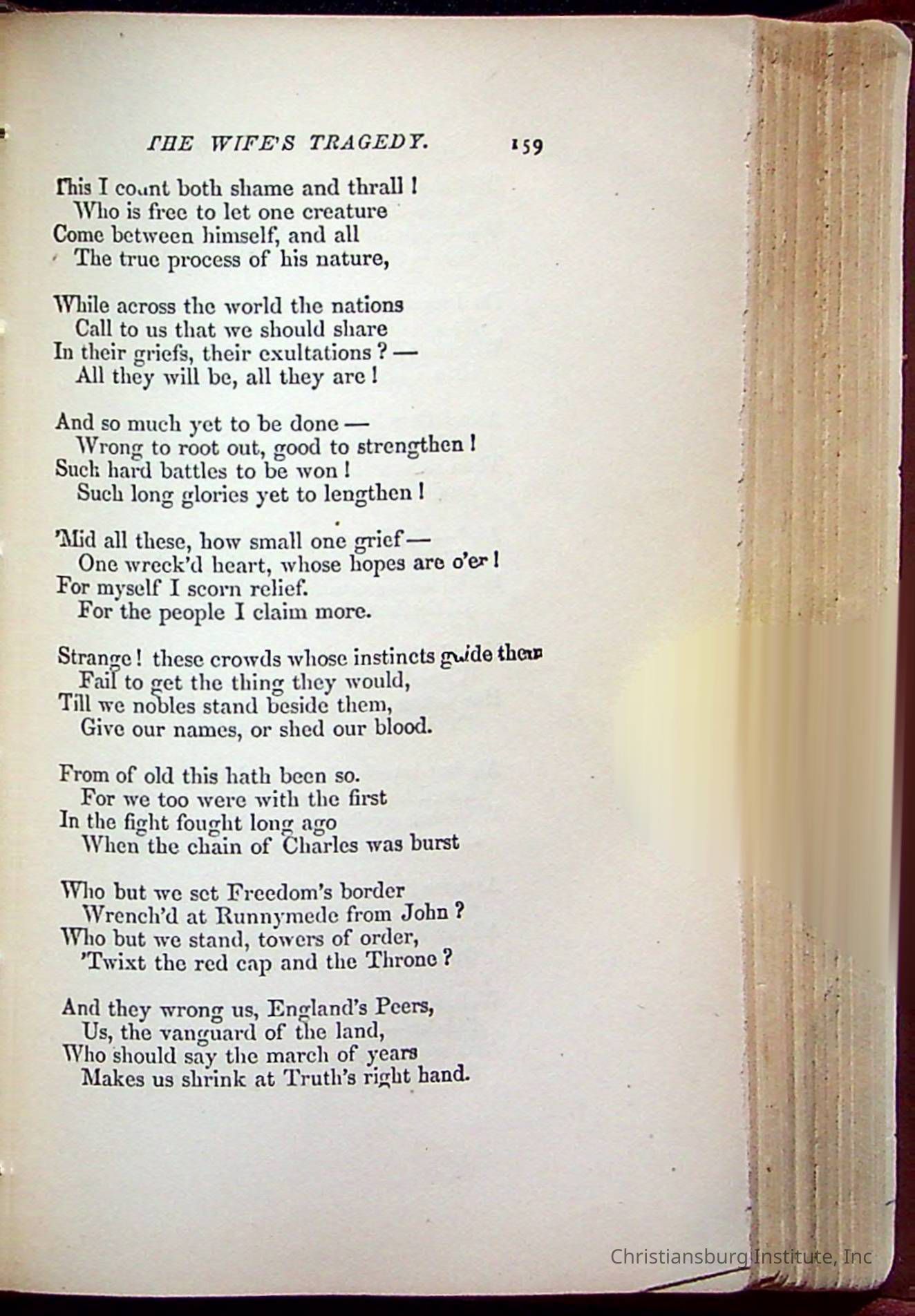 "Poems" written by Owen Meredith and published by James R. Osgood and Company in the year 1875. This book was in the Christiansburg Institute library.