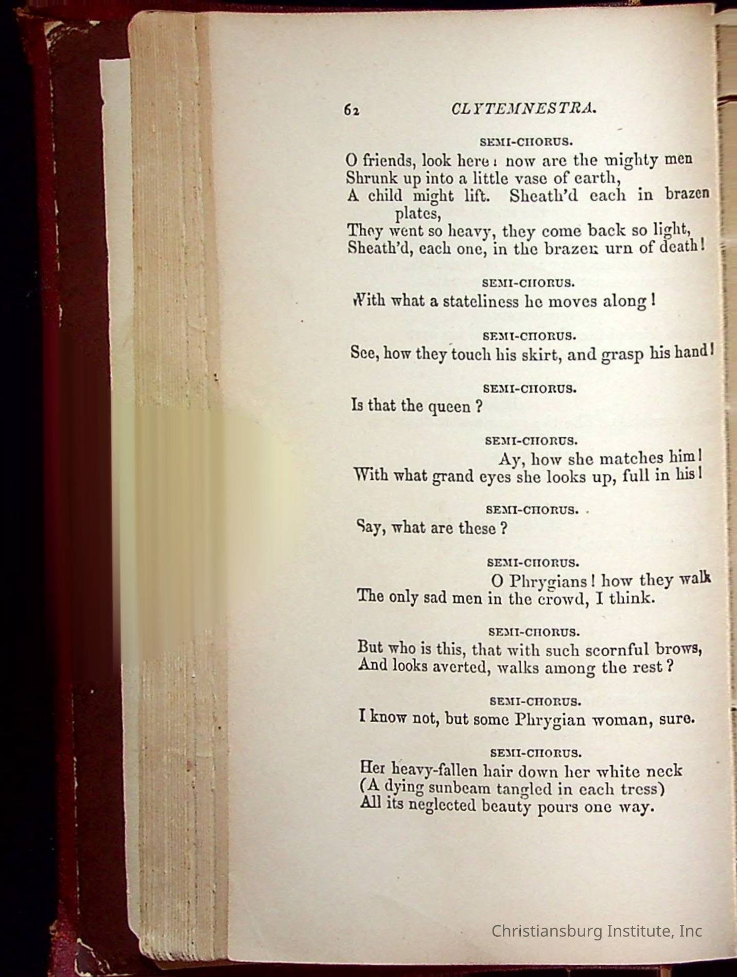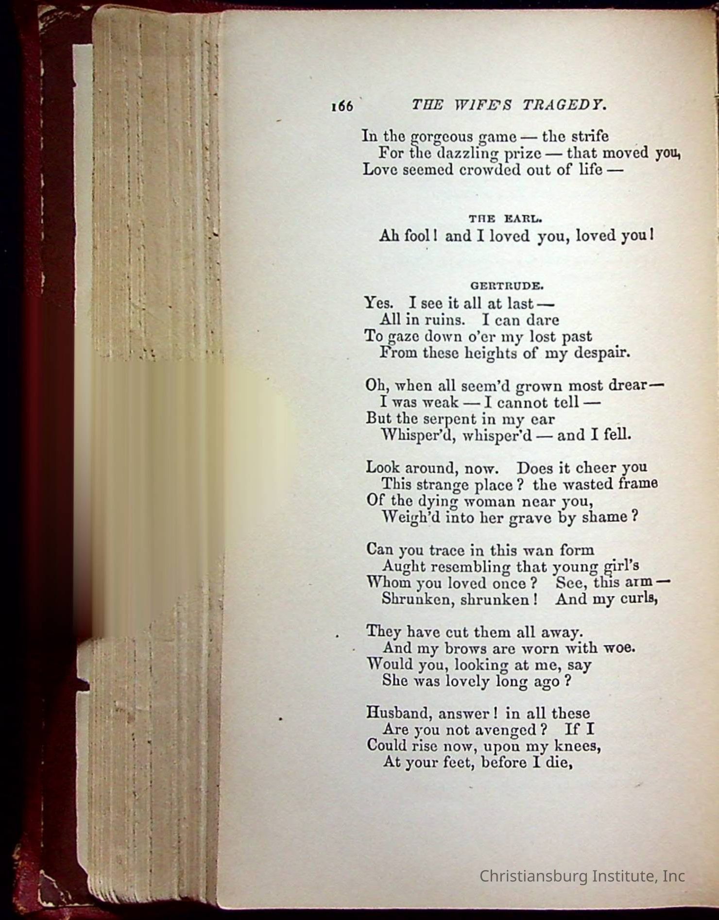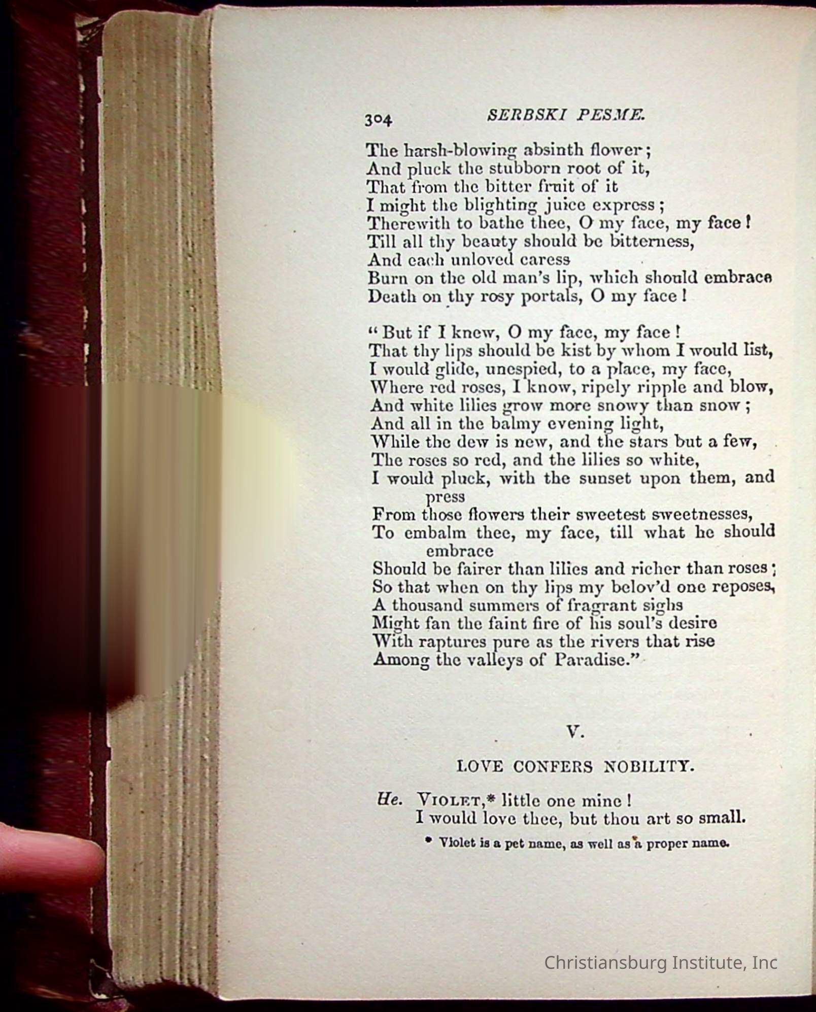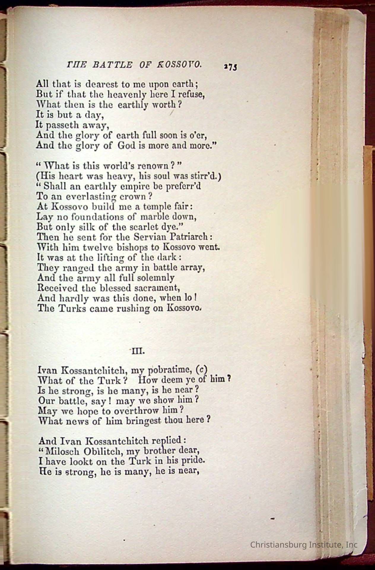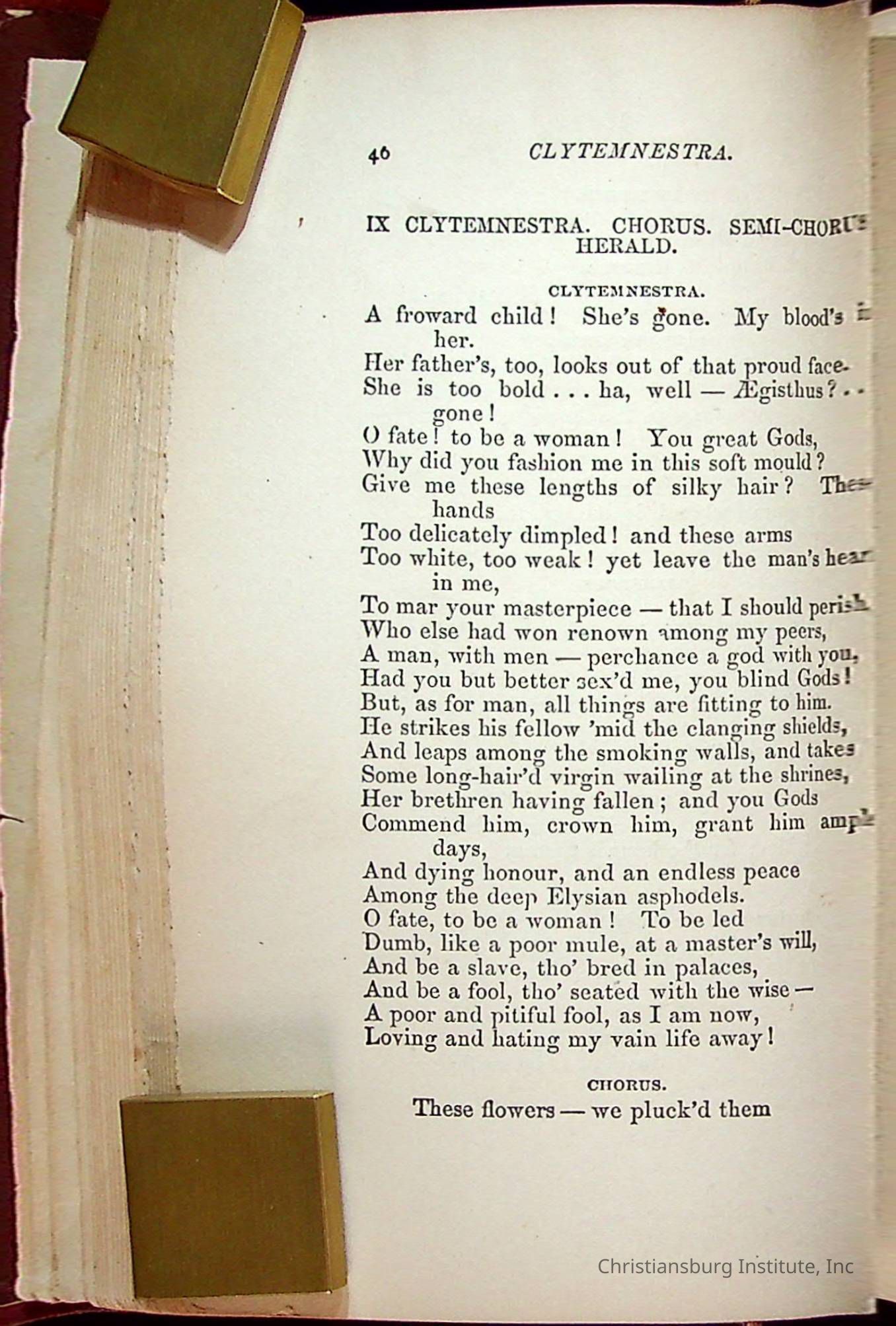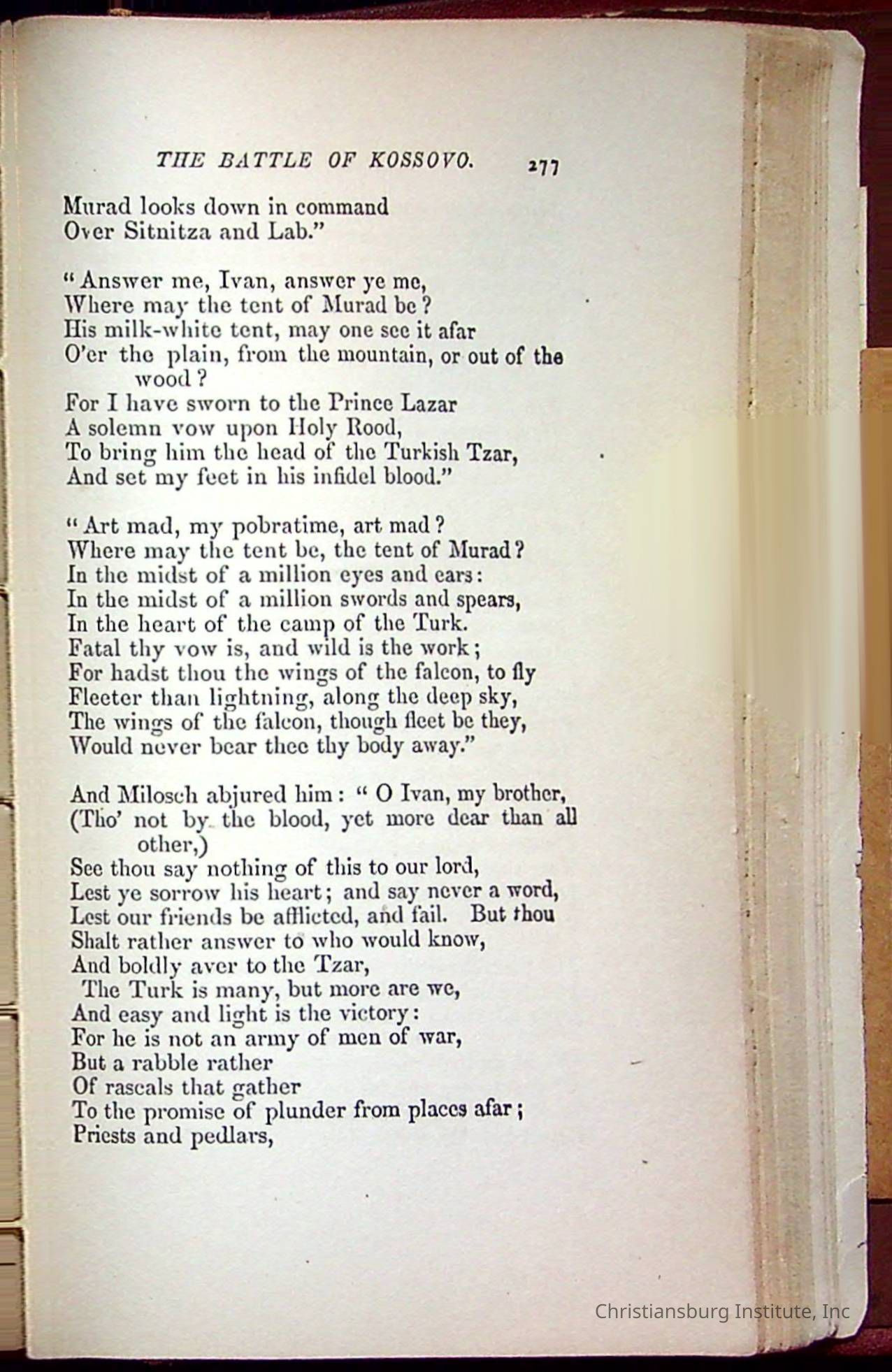 "Poems" written by Owen Meredith and published by James R. Osgood and Company in the year 1875. This book was in the Christiansburg Institute library.
