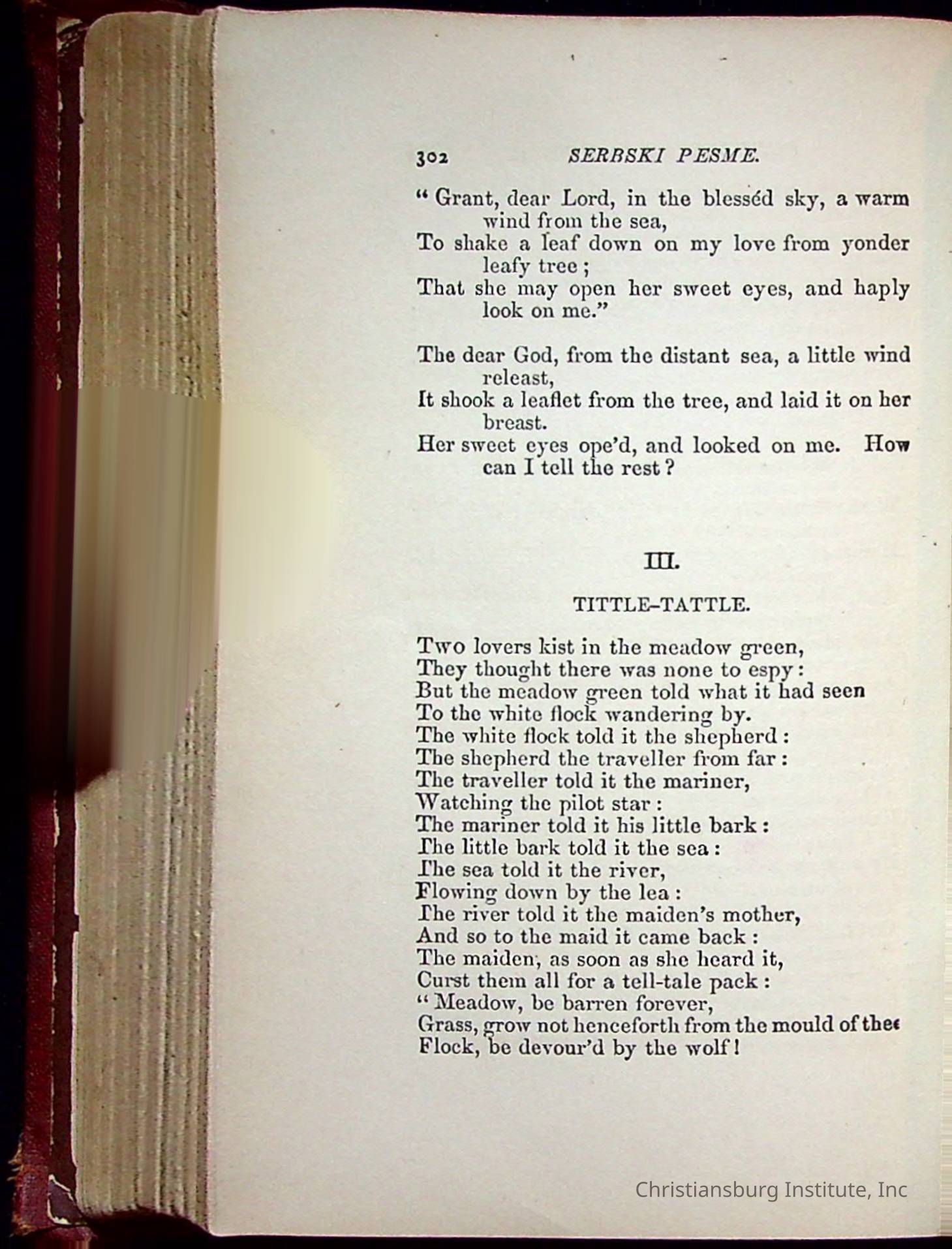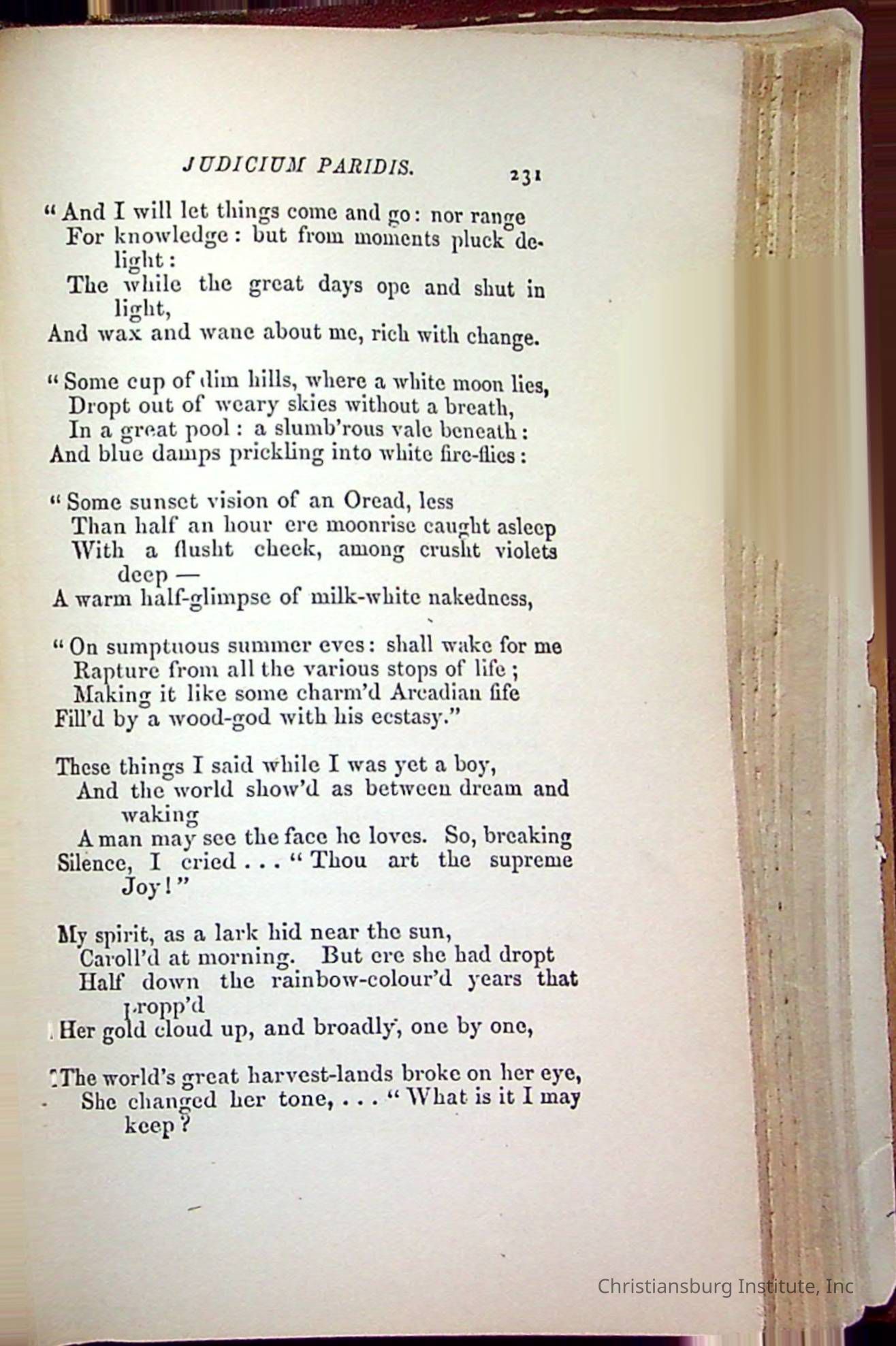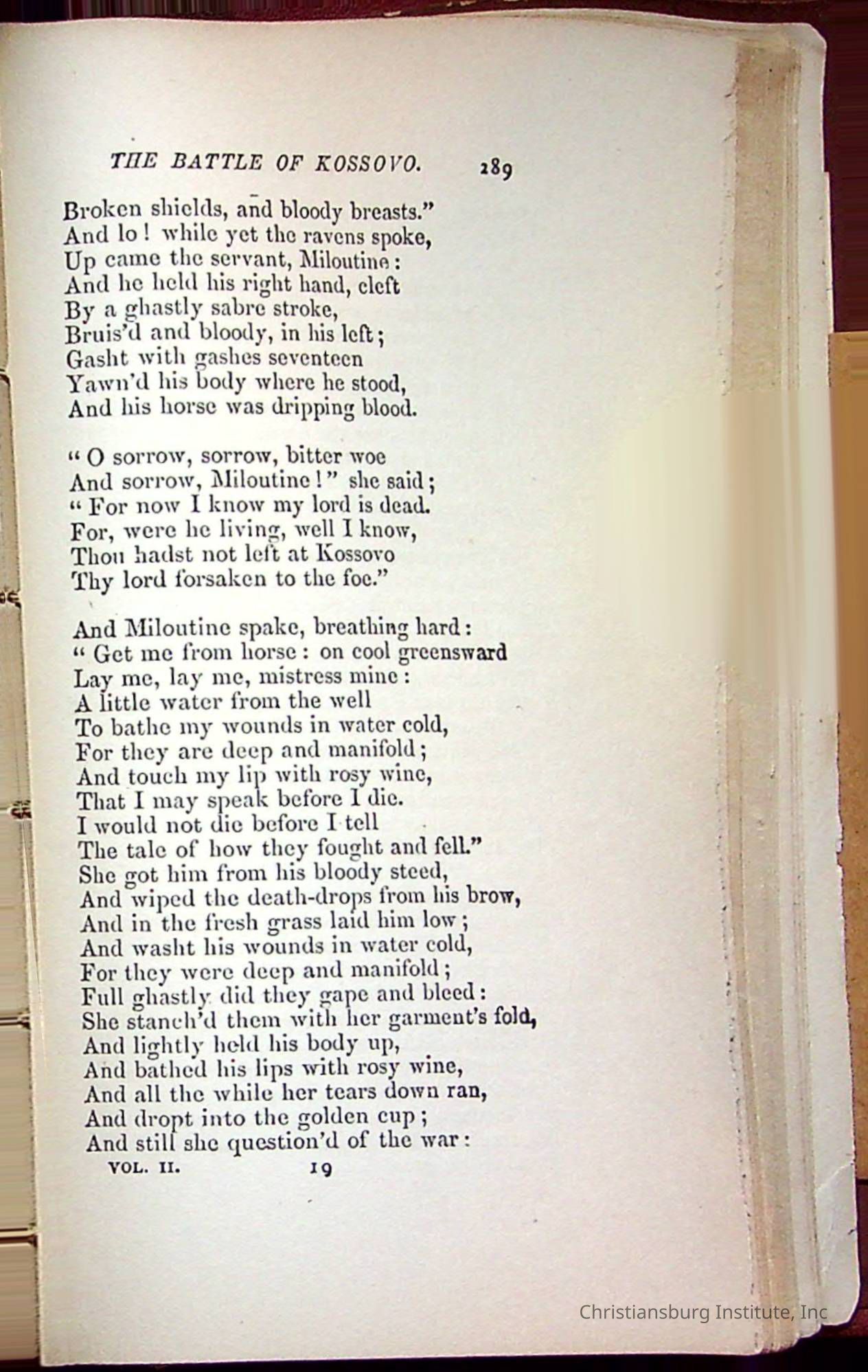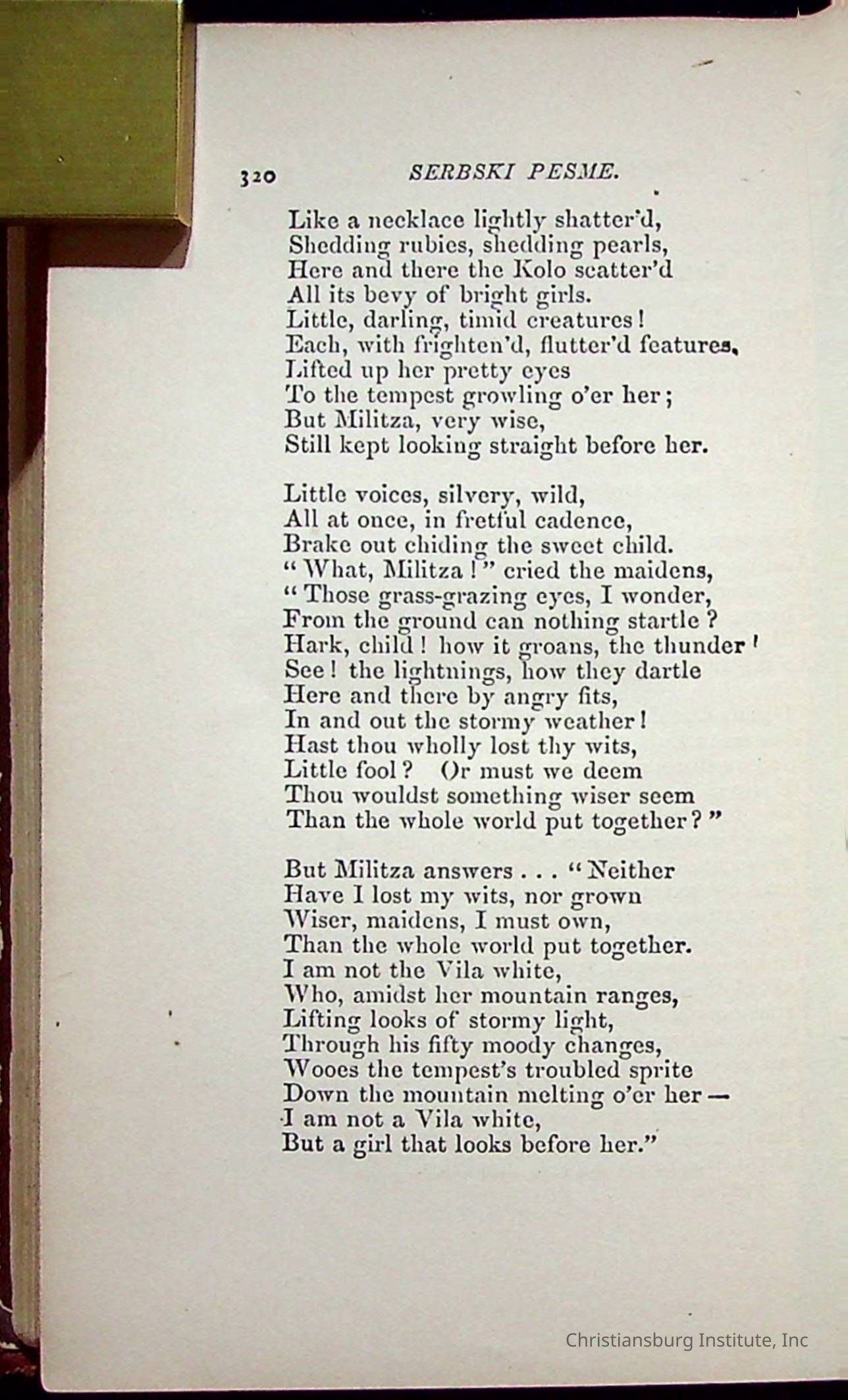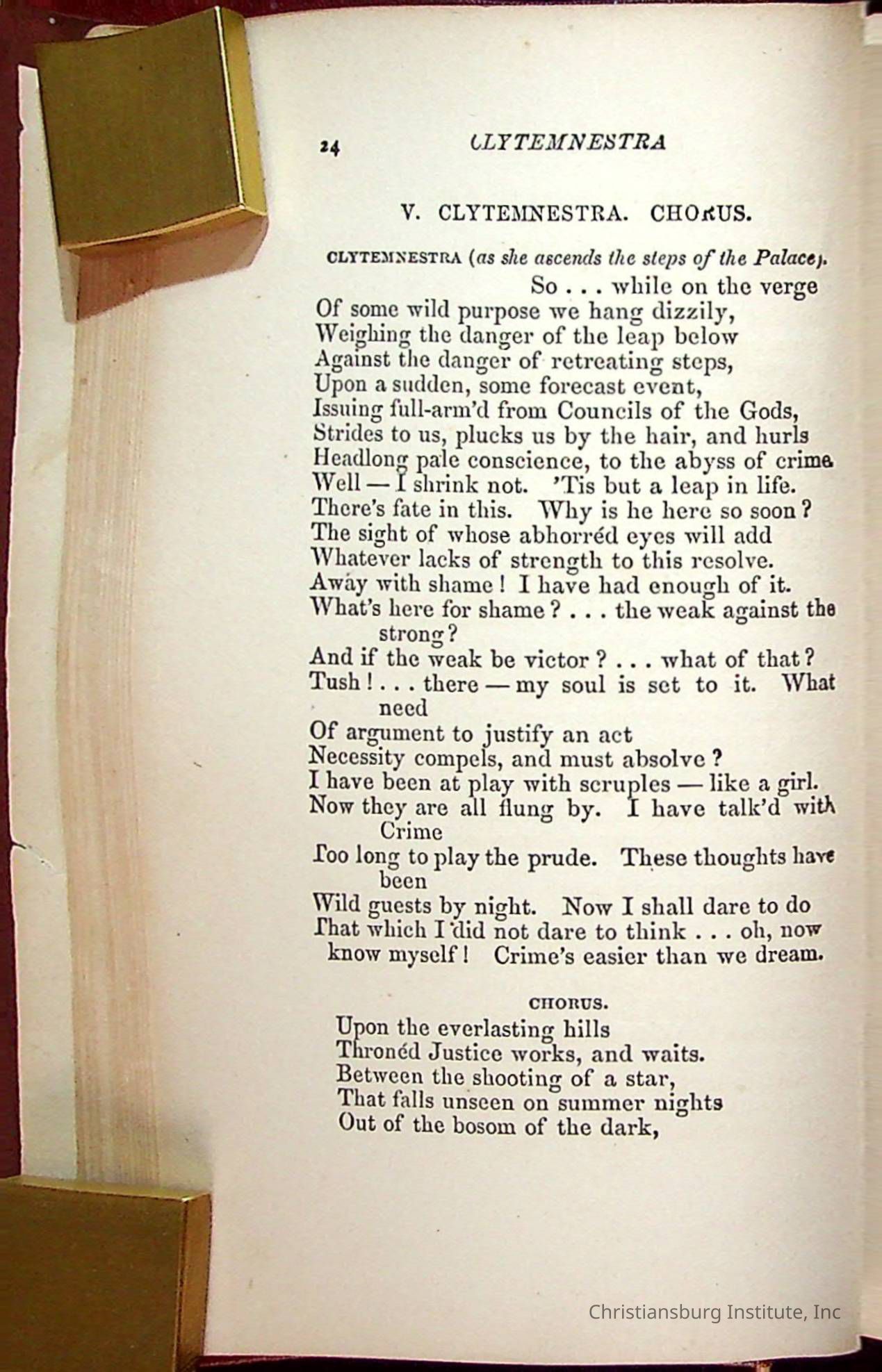 "Poems" written by Owen Meredith and published by James R. Osgood and Company in the year 1875. This book was in the Christiansburg Institute library.