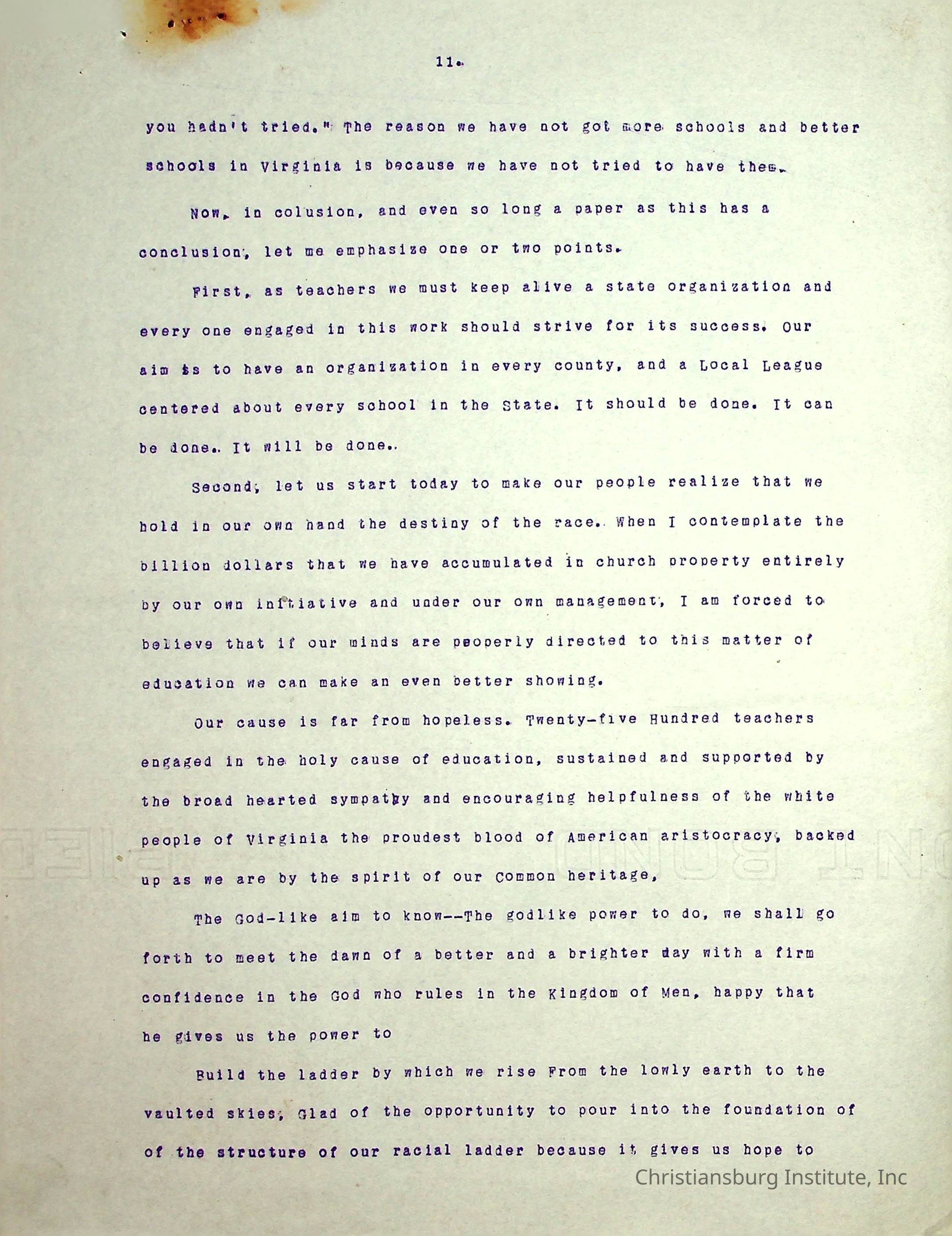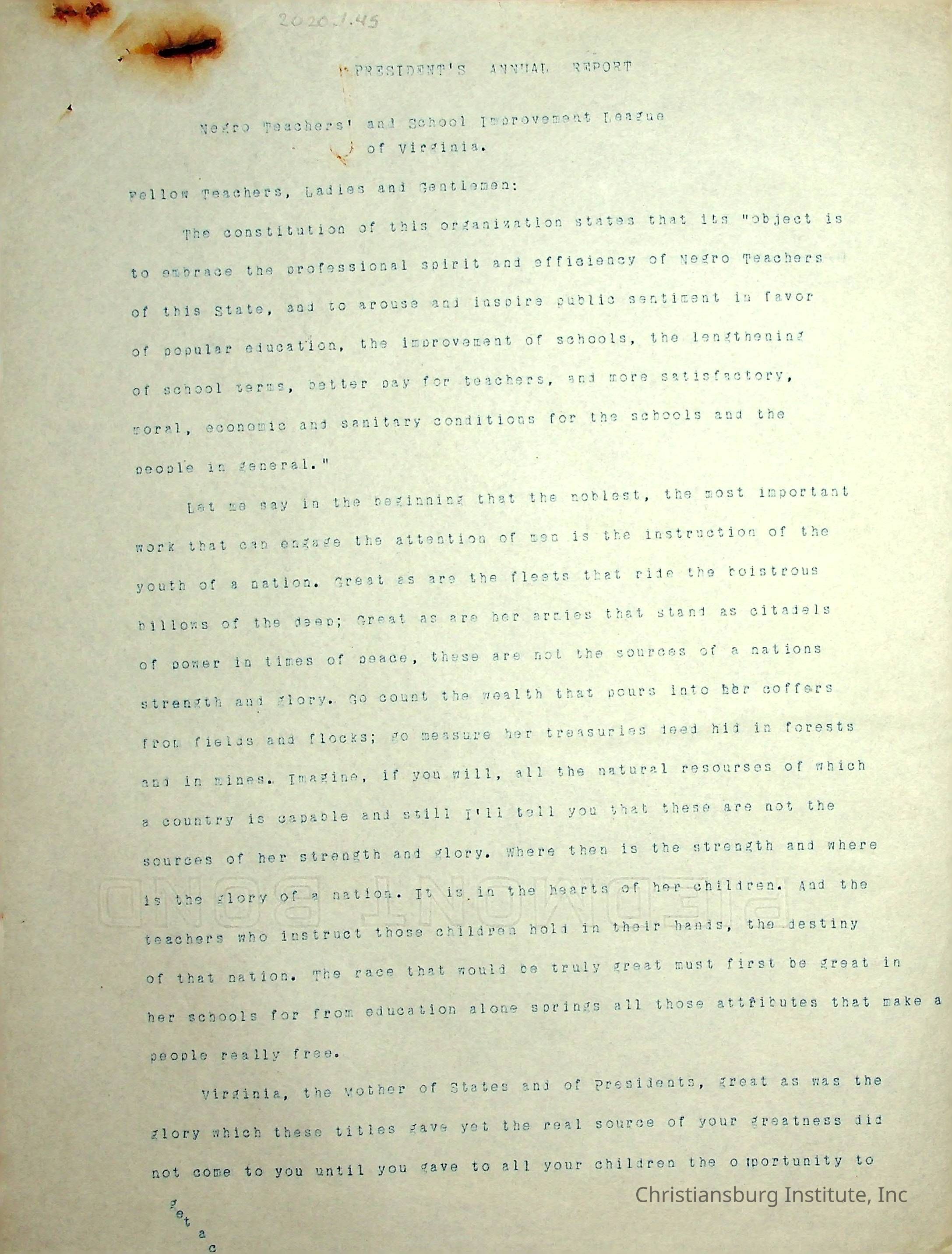 A typed speech written by Edgar A. Long titled 'President's Annual Report/ Negro Teachers' spoken at the State Teachers Association in 1912. Gifted by Carlton Banks in 2001.Collection
