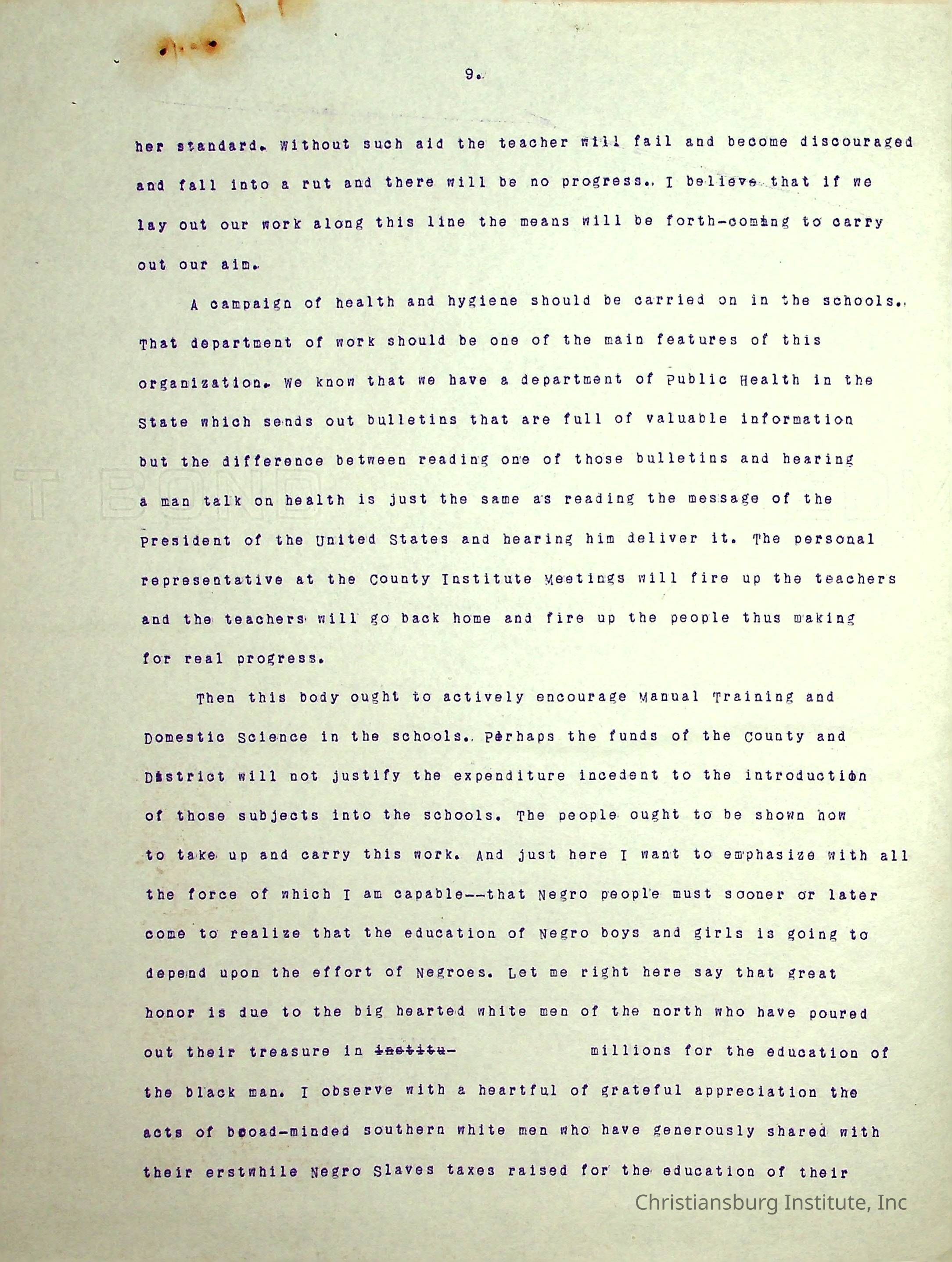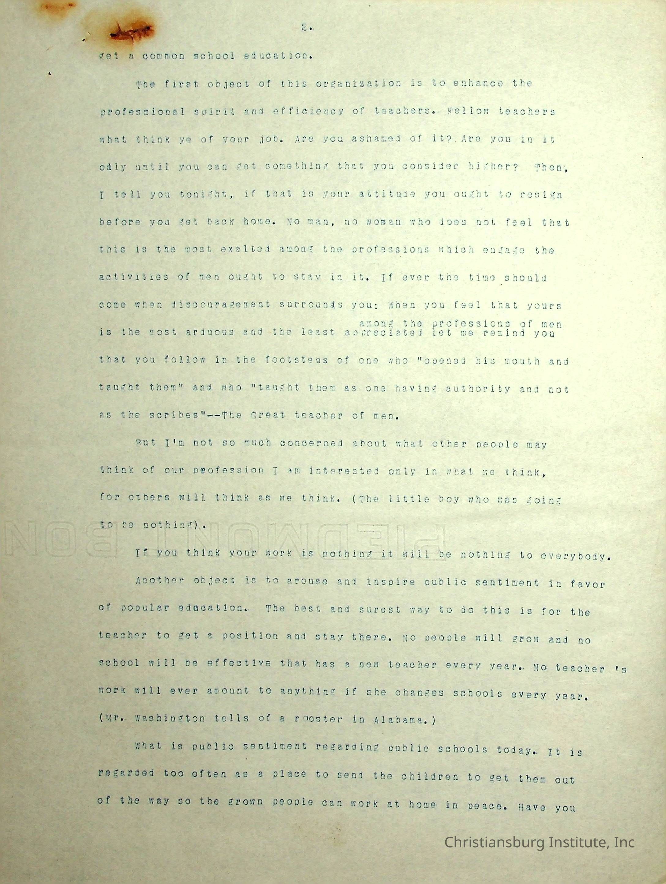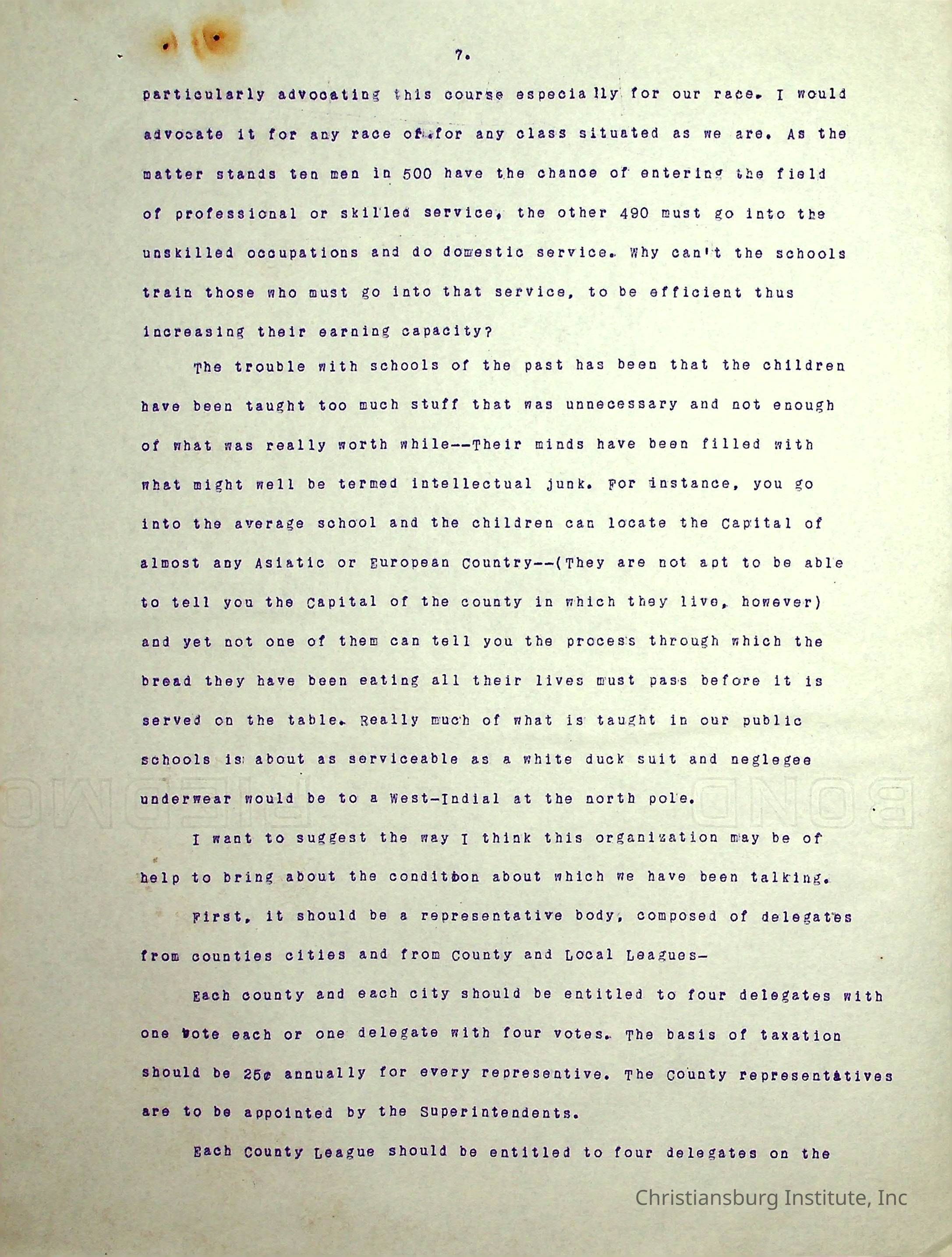 A typed speech written by Edgar A. Long titled 'President's Annual Report/ Negro Teachers' spoken at the State Teachers Association in 1912. Gifted by Carlton Banks in 2001.Creator