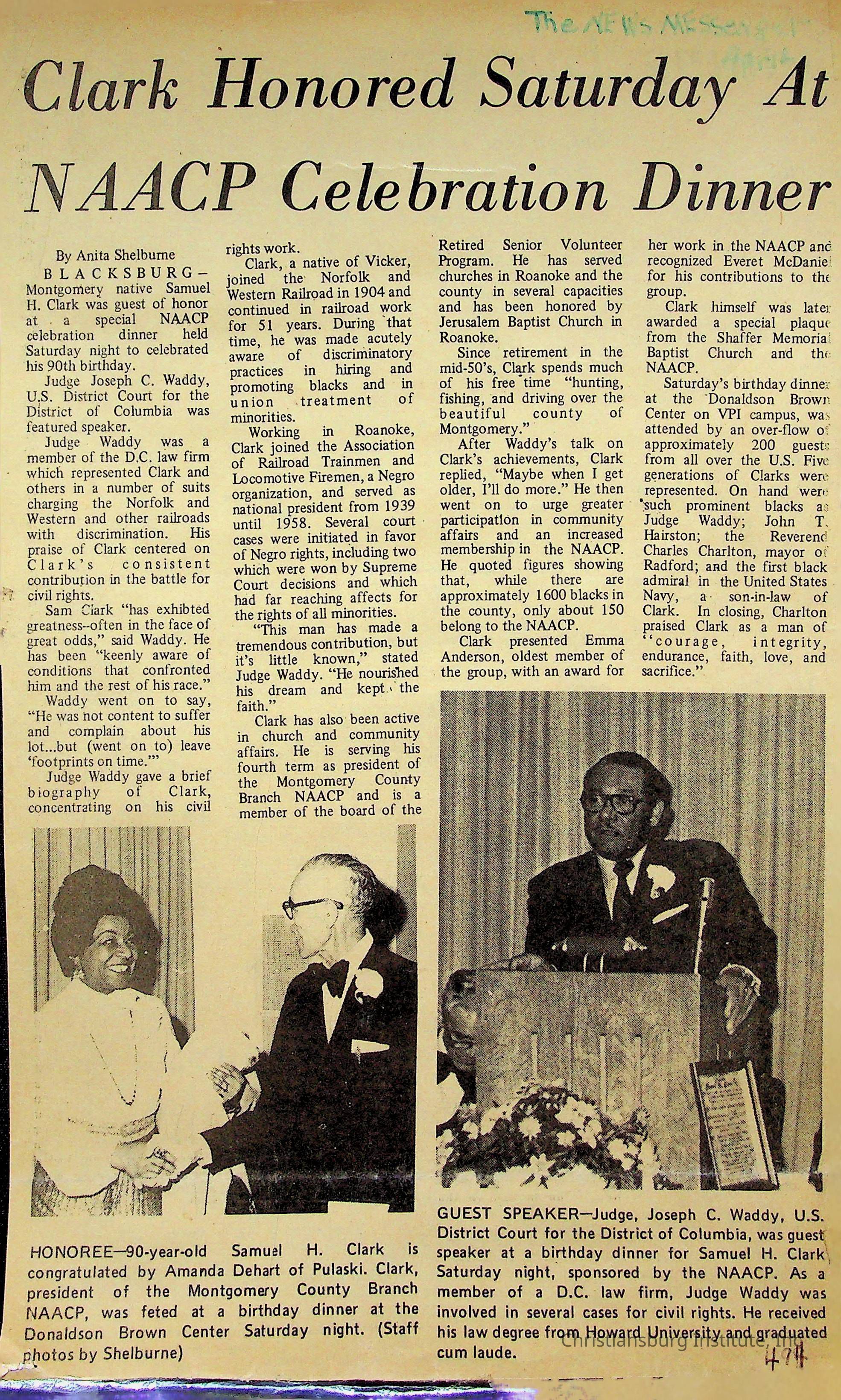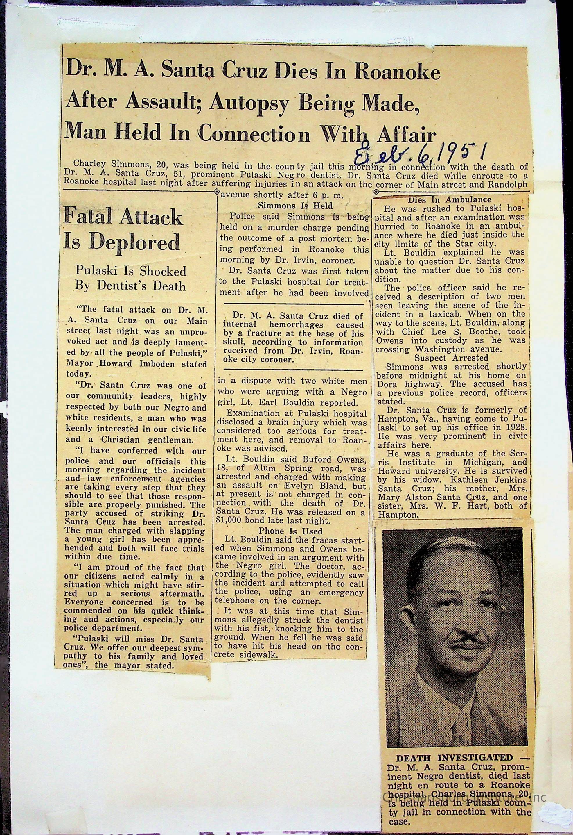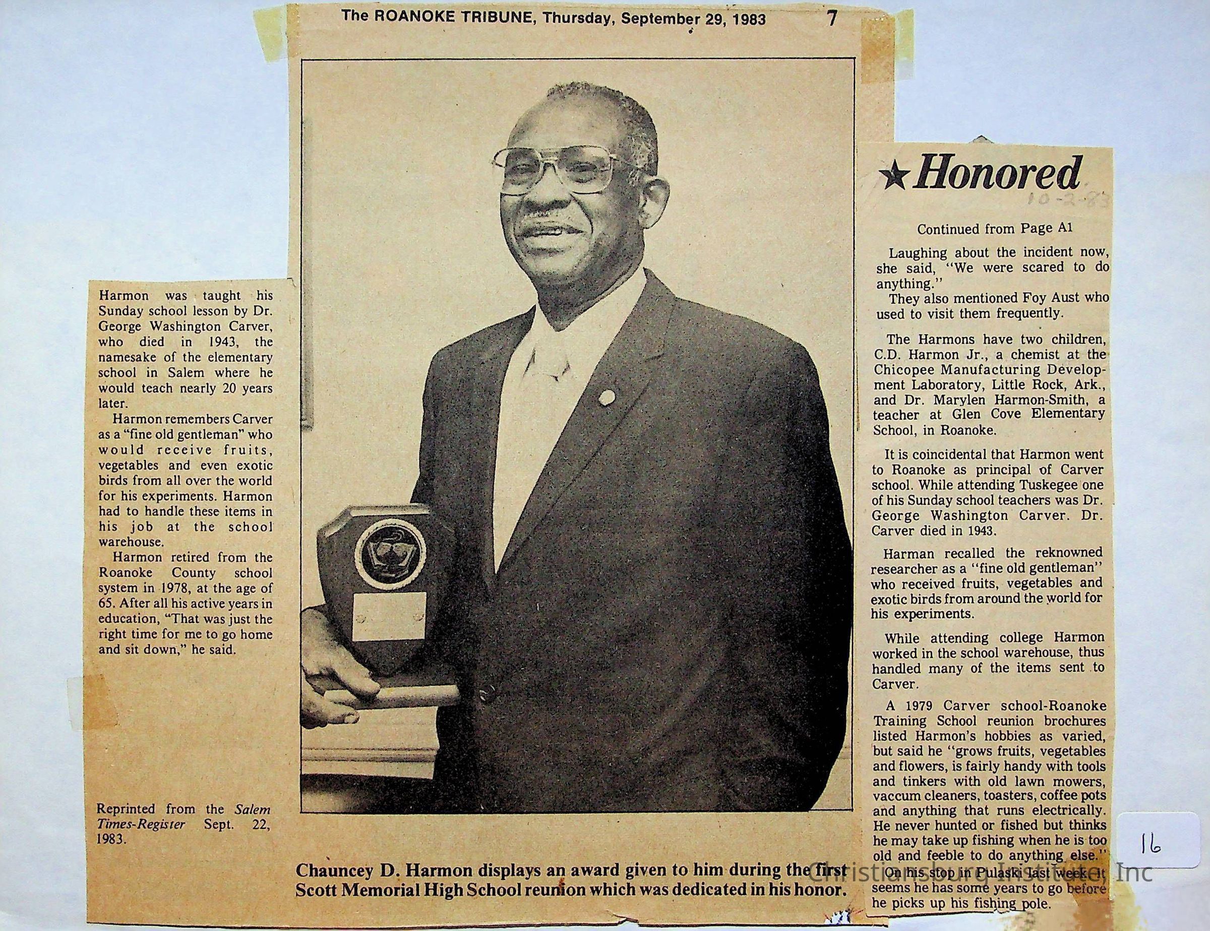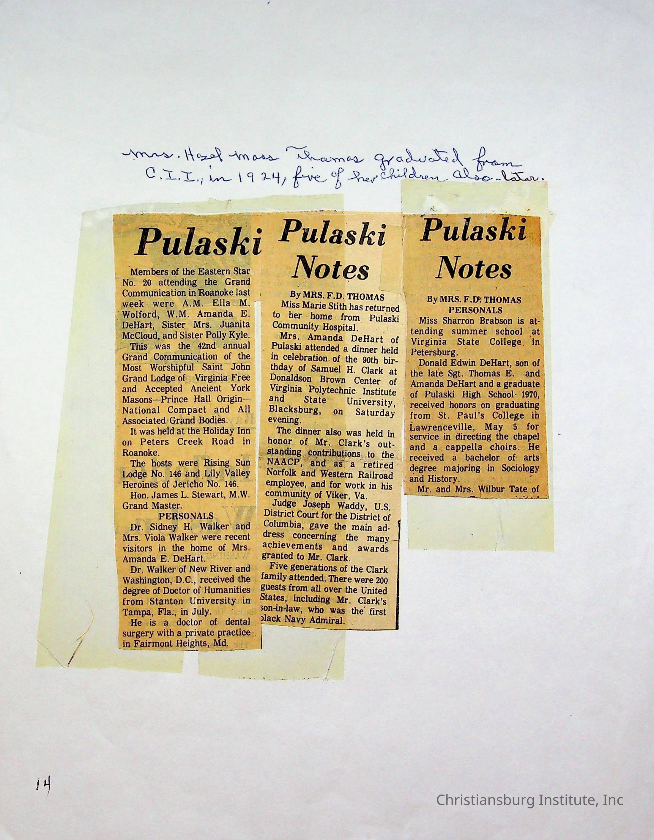 An archive of newspaper articles from Pulaski, Virginia about notable Pulaski Black history figures, dated 1921-1990.Collection