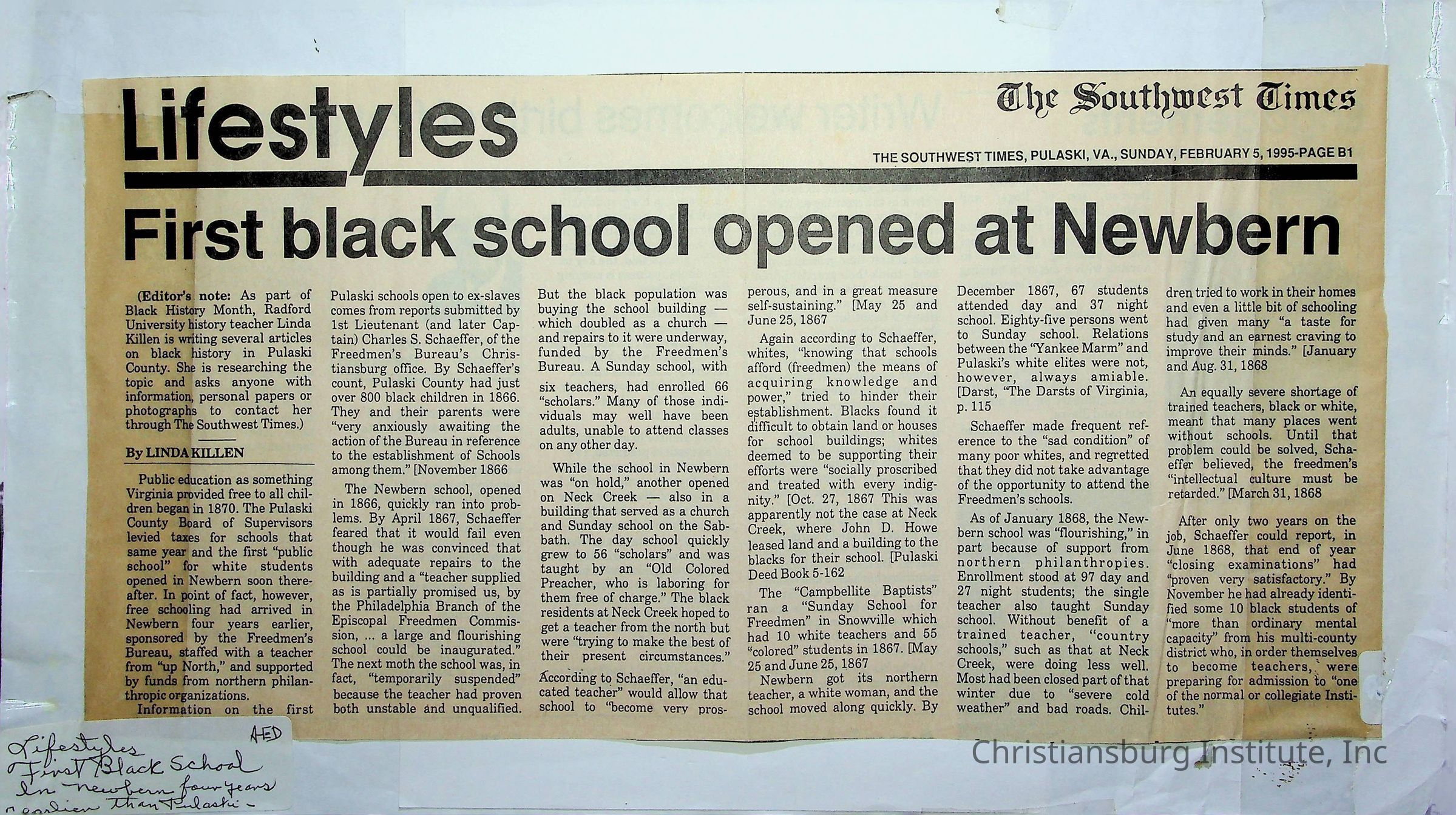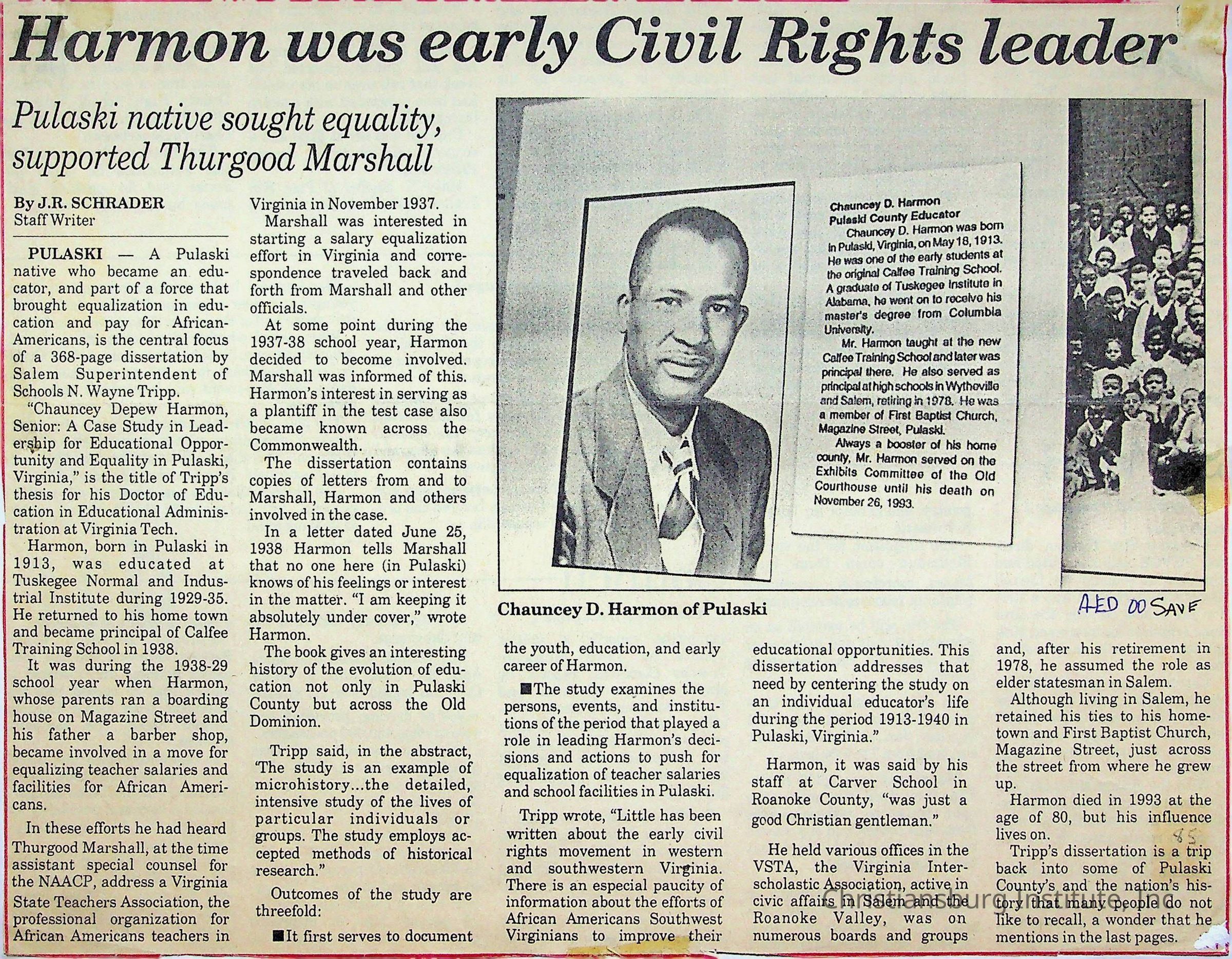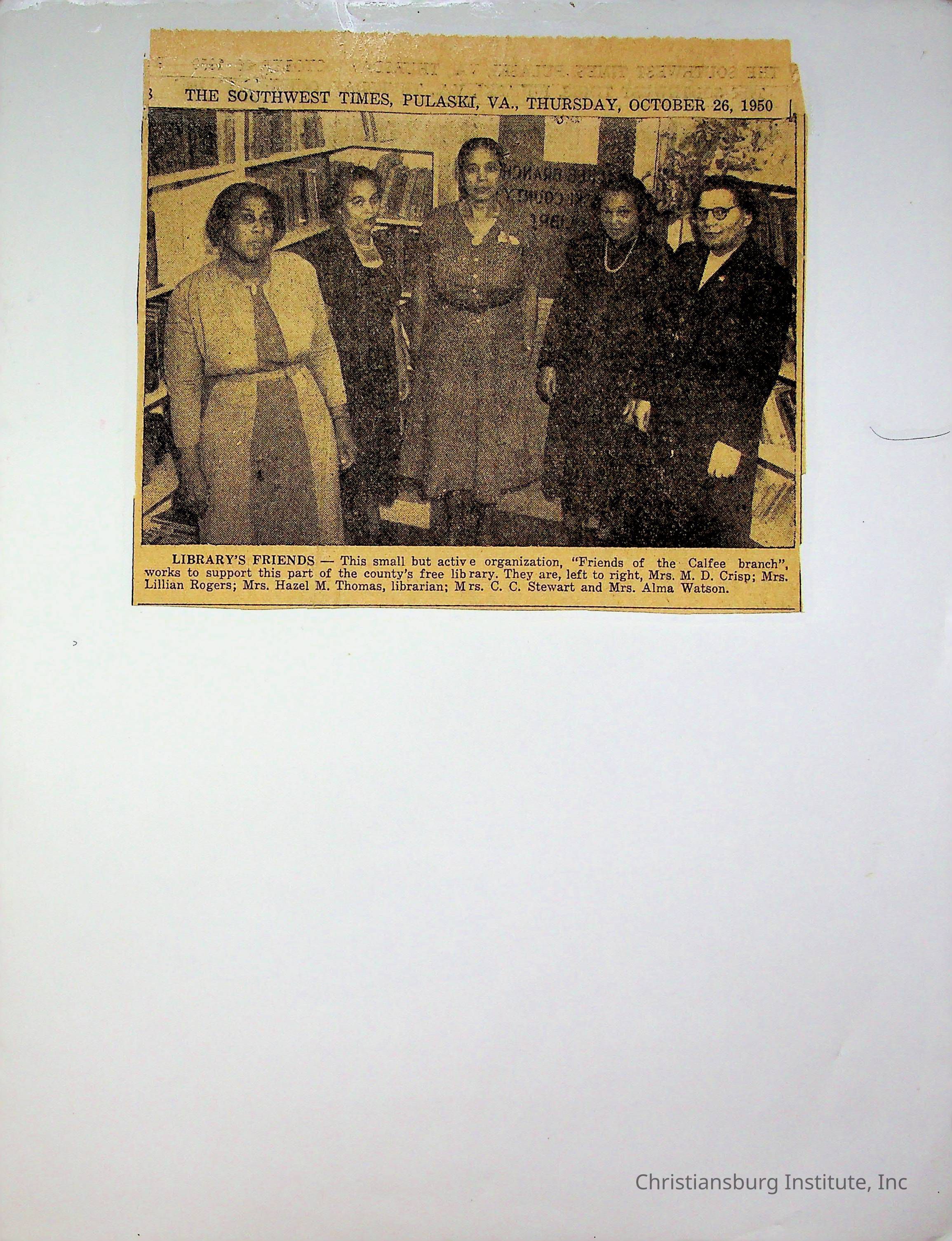 An archive of newspaper articles from Pulaski, Virginia about notable Pulaski Black history figures, dated 1921-1990.Collection