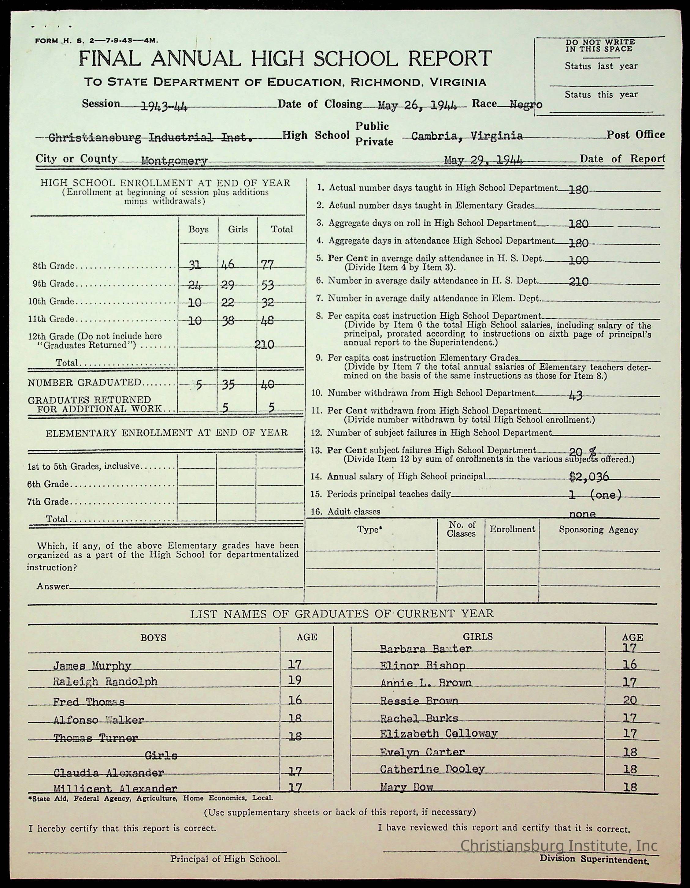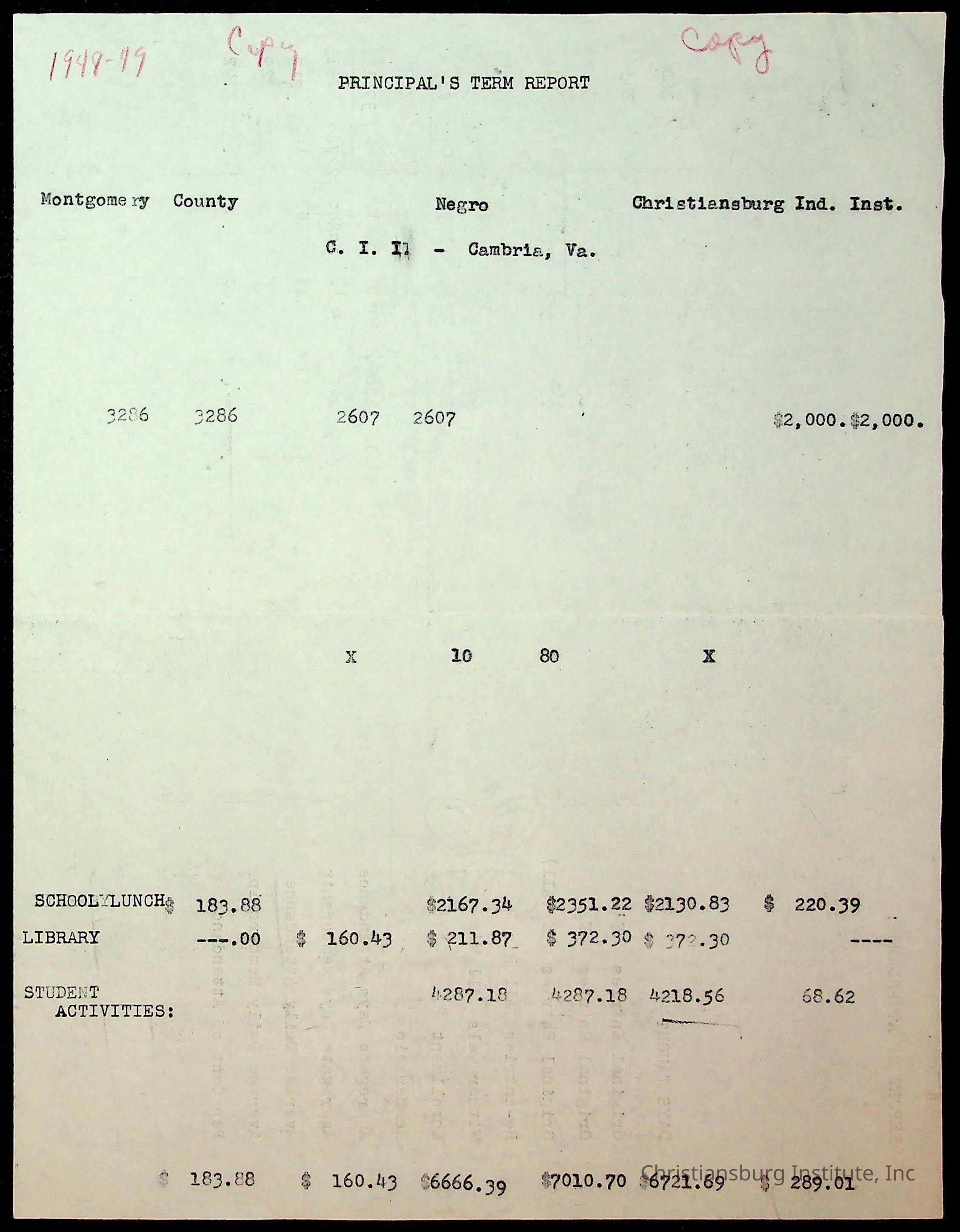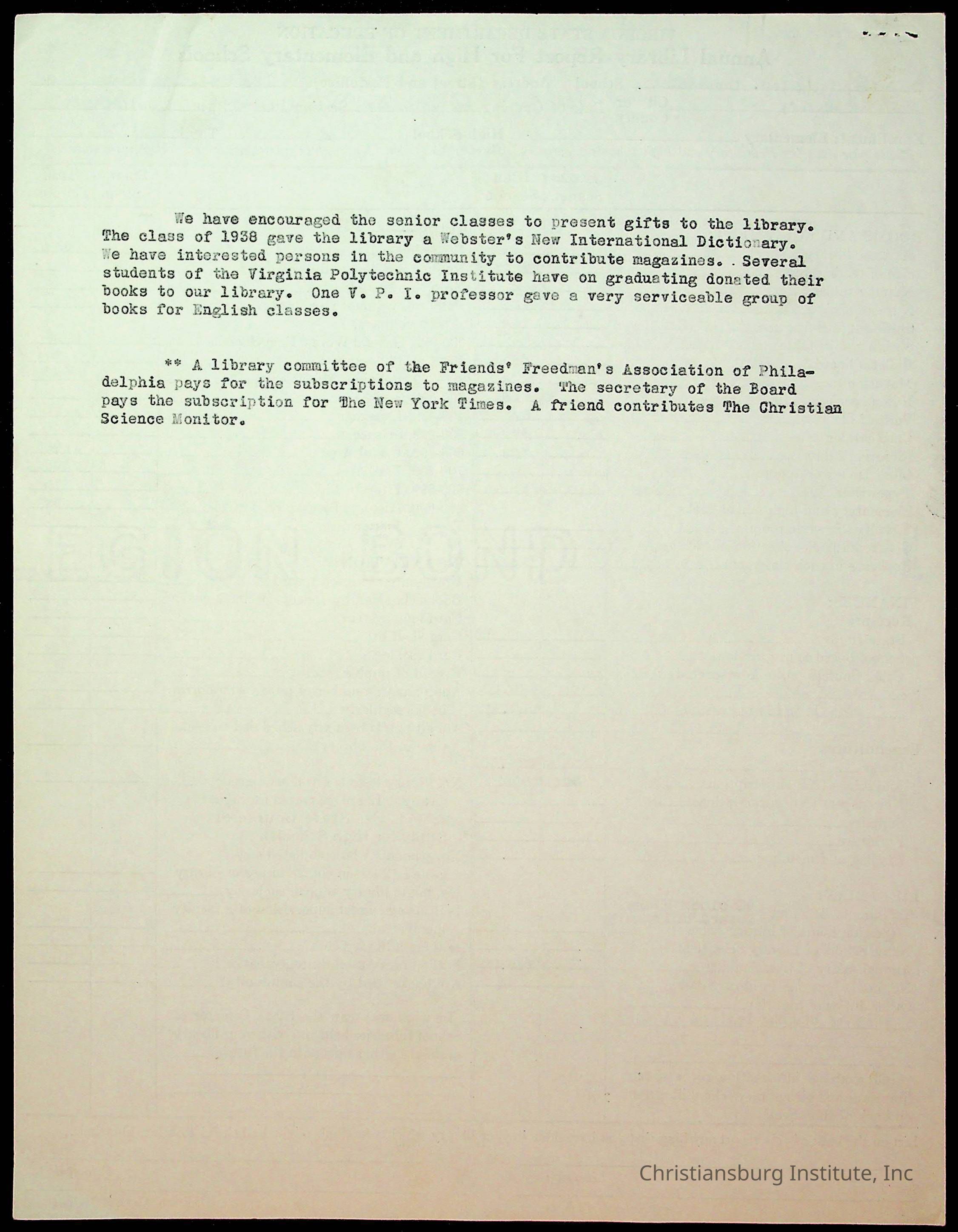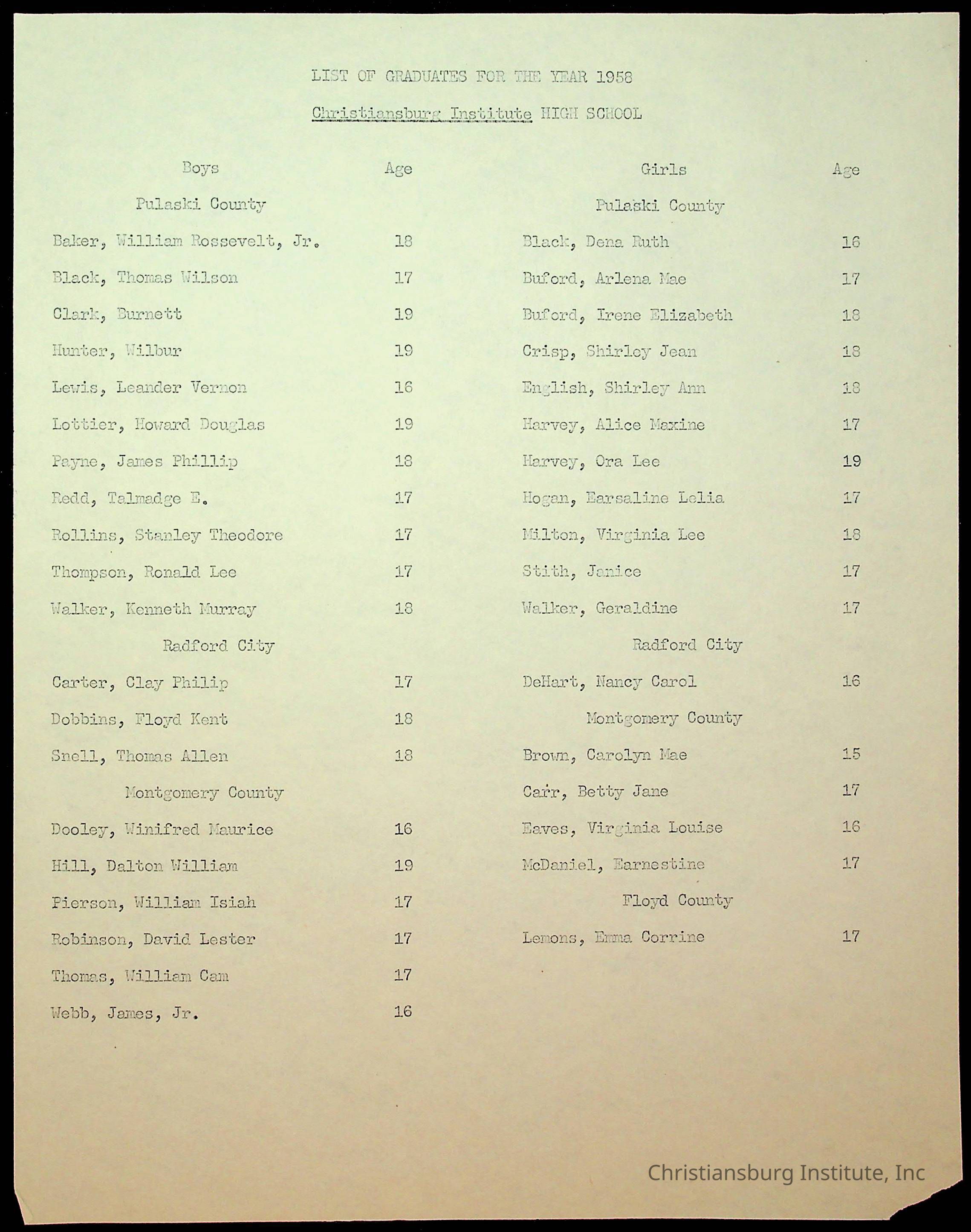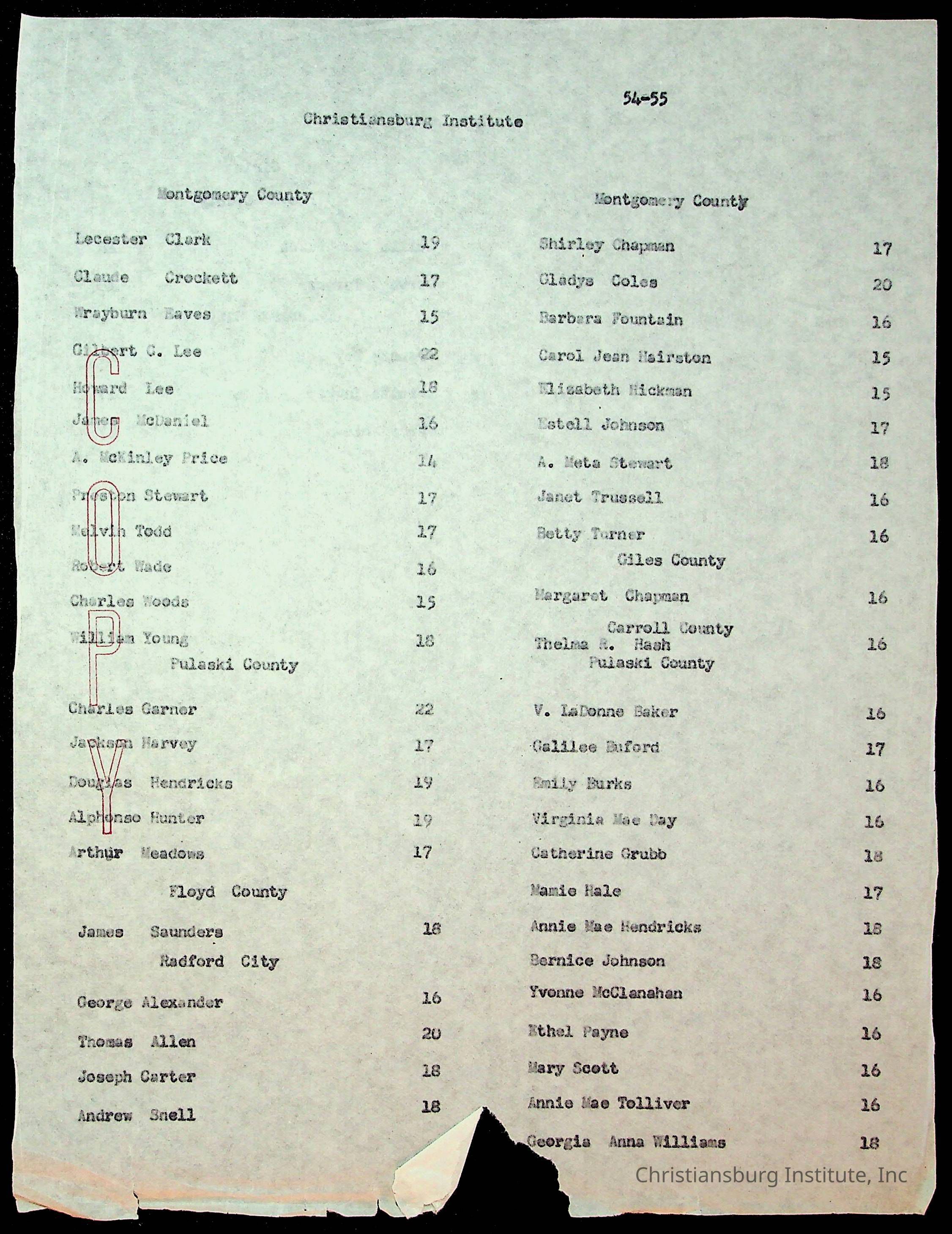 Copyright has been assigned to Christiansburg Institute Museum & Archives by Montgomery County Public Schools. For permission to publish materials created by the donor, contact CIMA@christiansburginstitute.com. Materials not created by Christiansburg Industrial Institute may still be under copyright.