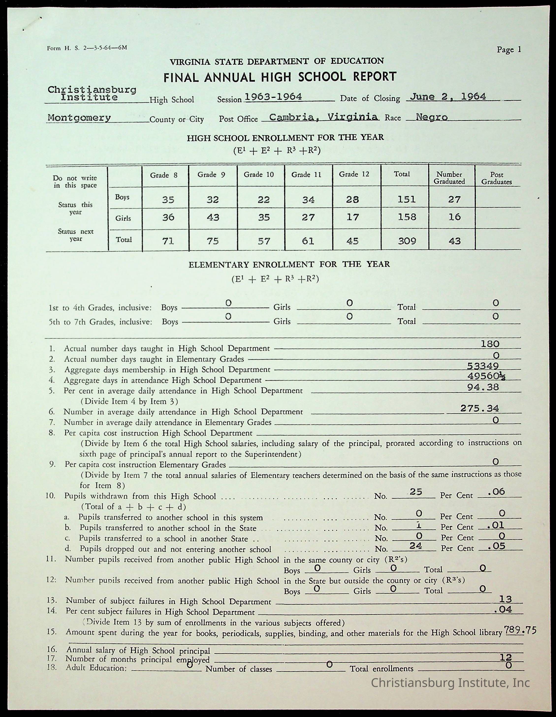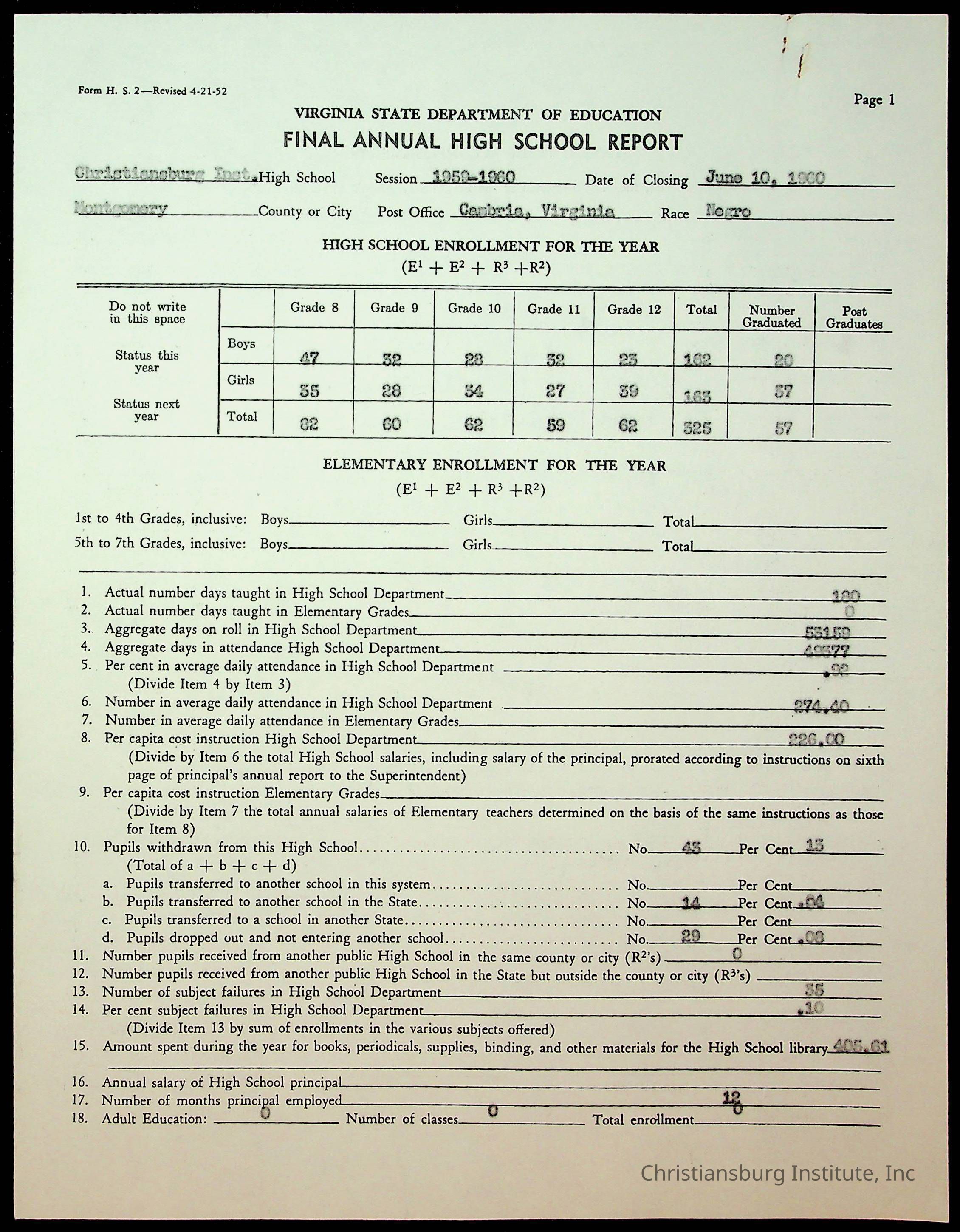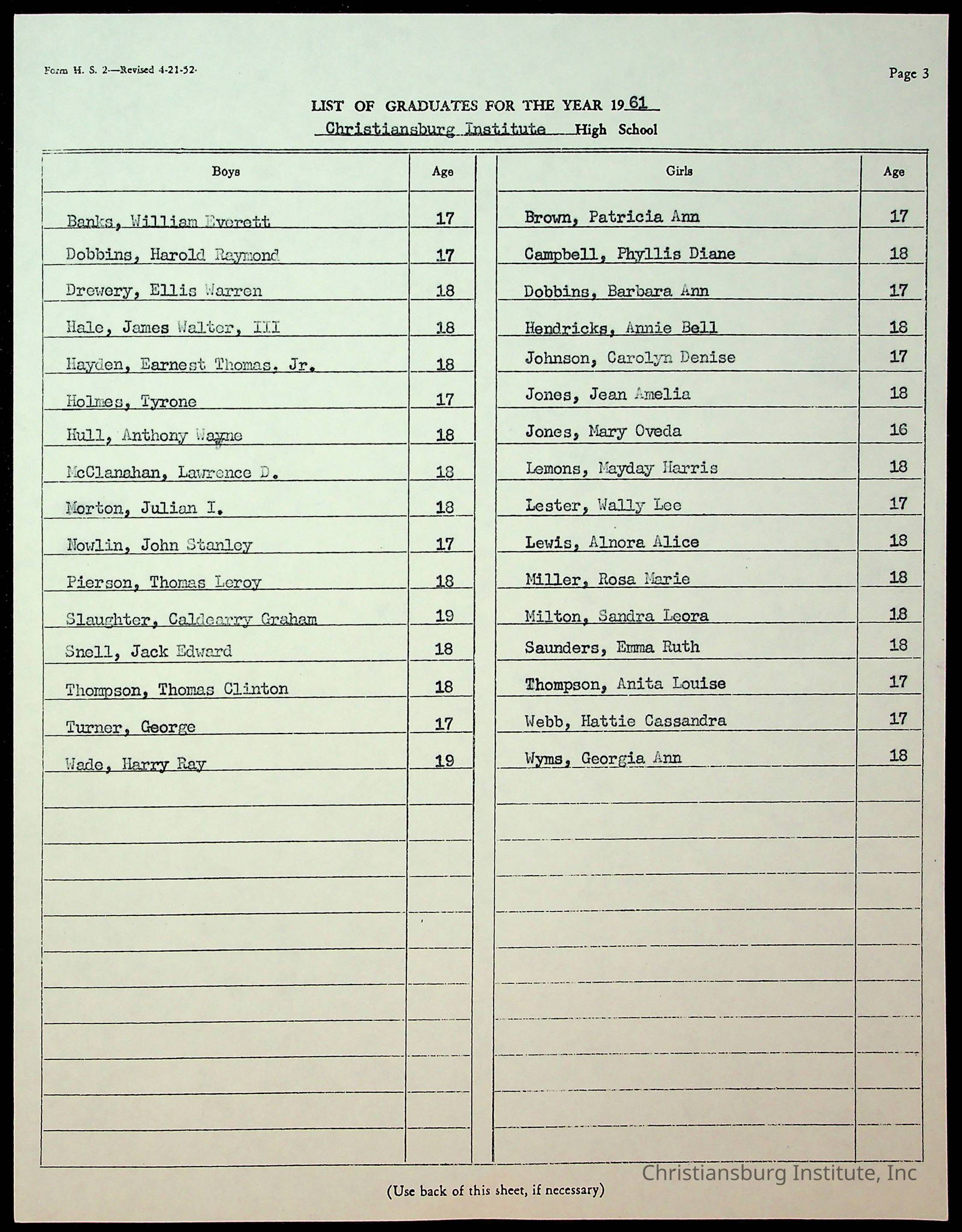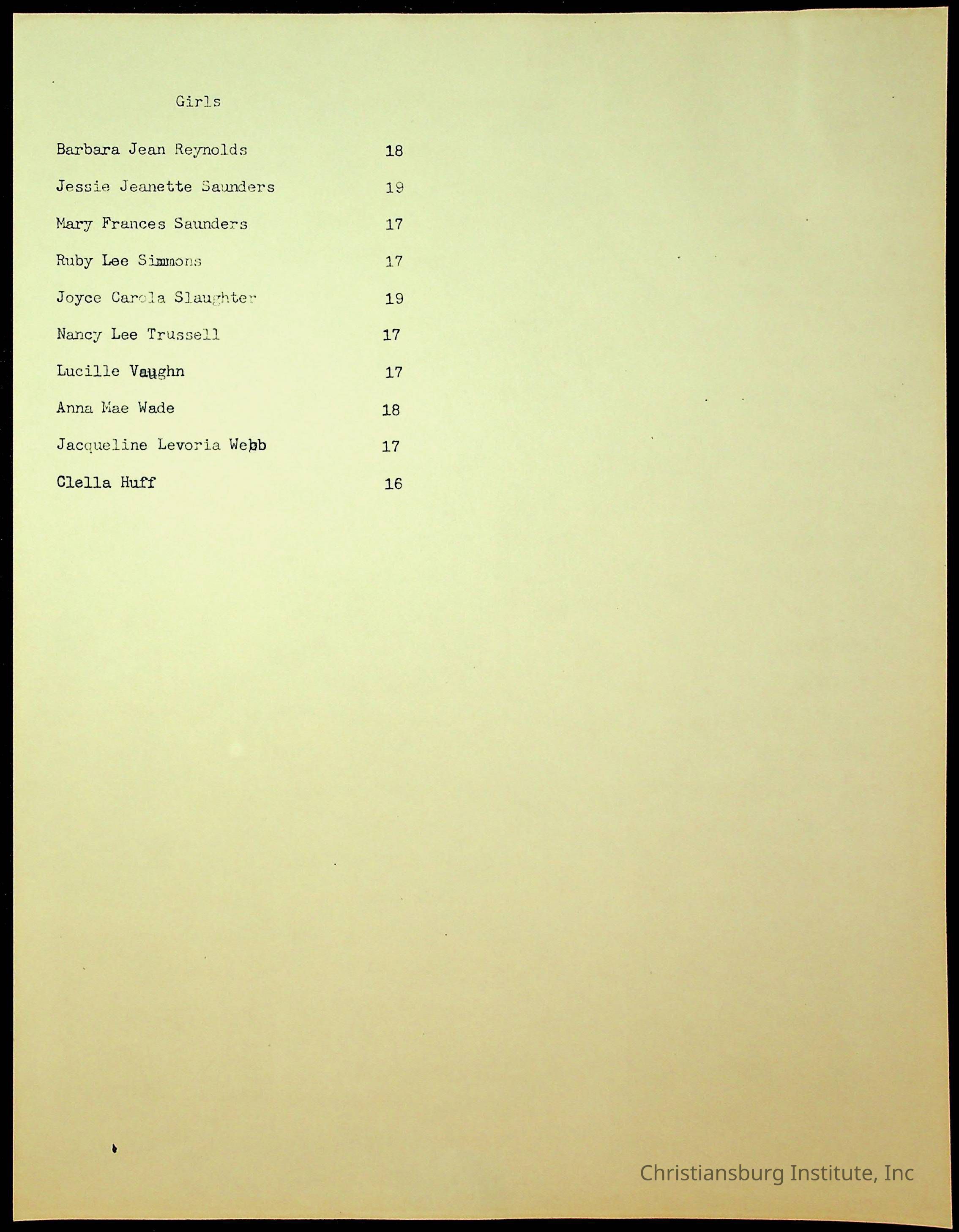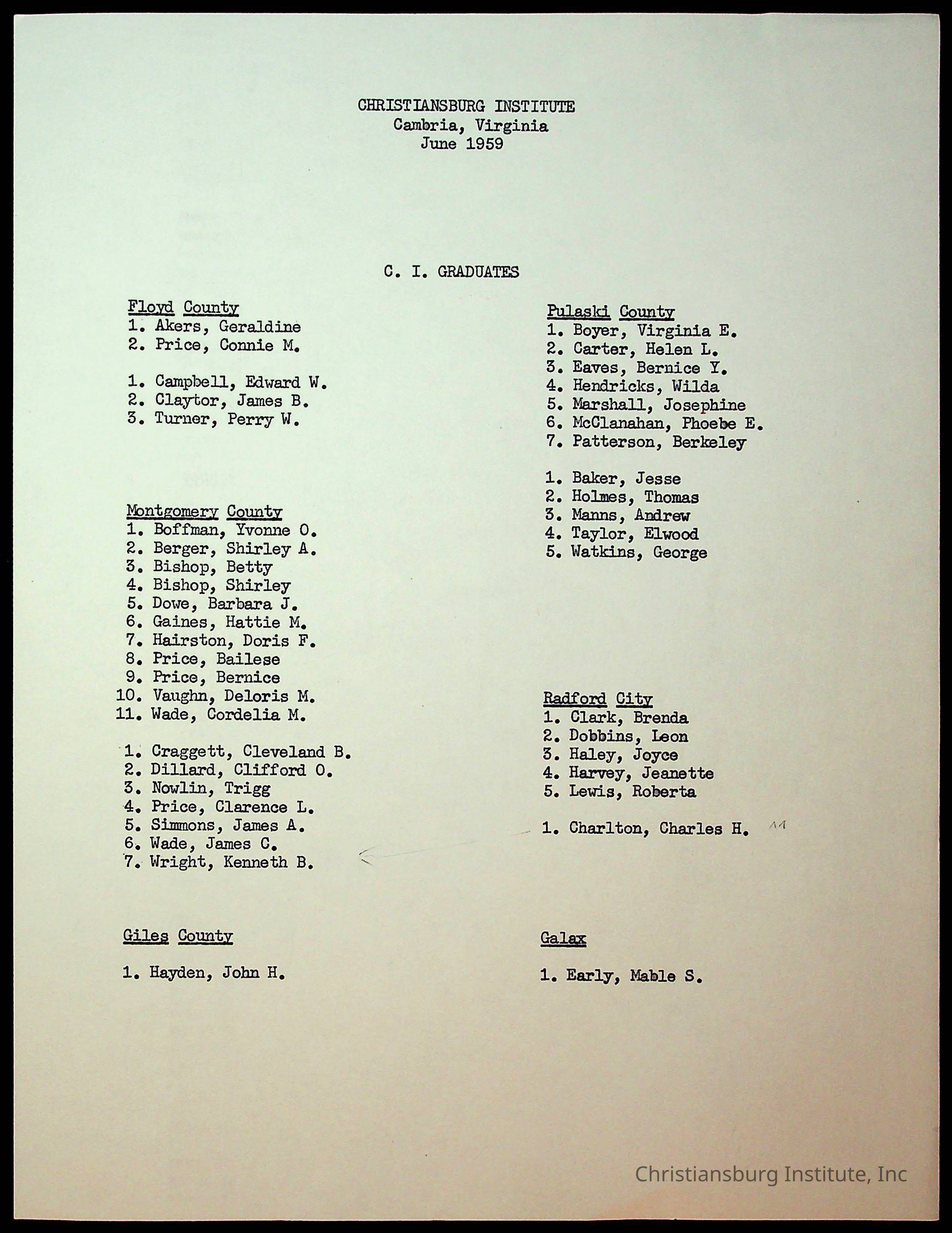 Copyright has been assigned to Christiansburg Institute Museum & Archives by Montgomery County Public Schools. For permission to publish materials created by the donor, contact CIMA@christiansburginstitute.com. Materials not created by Christiansburg Industrial Institute may still be under copyright.