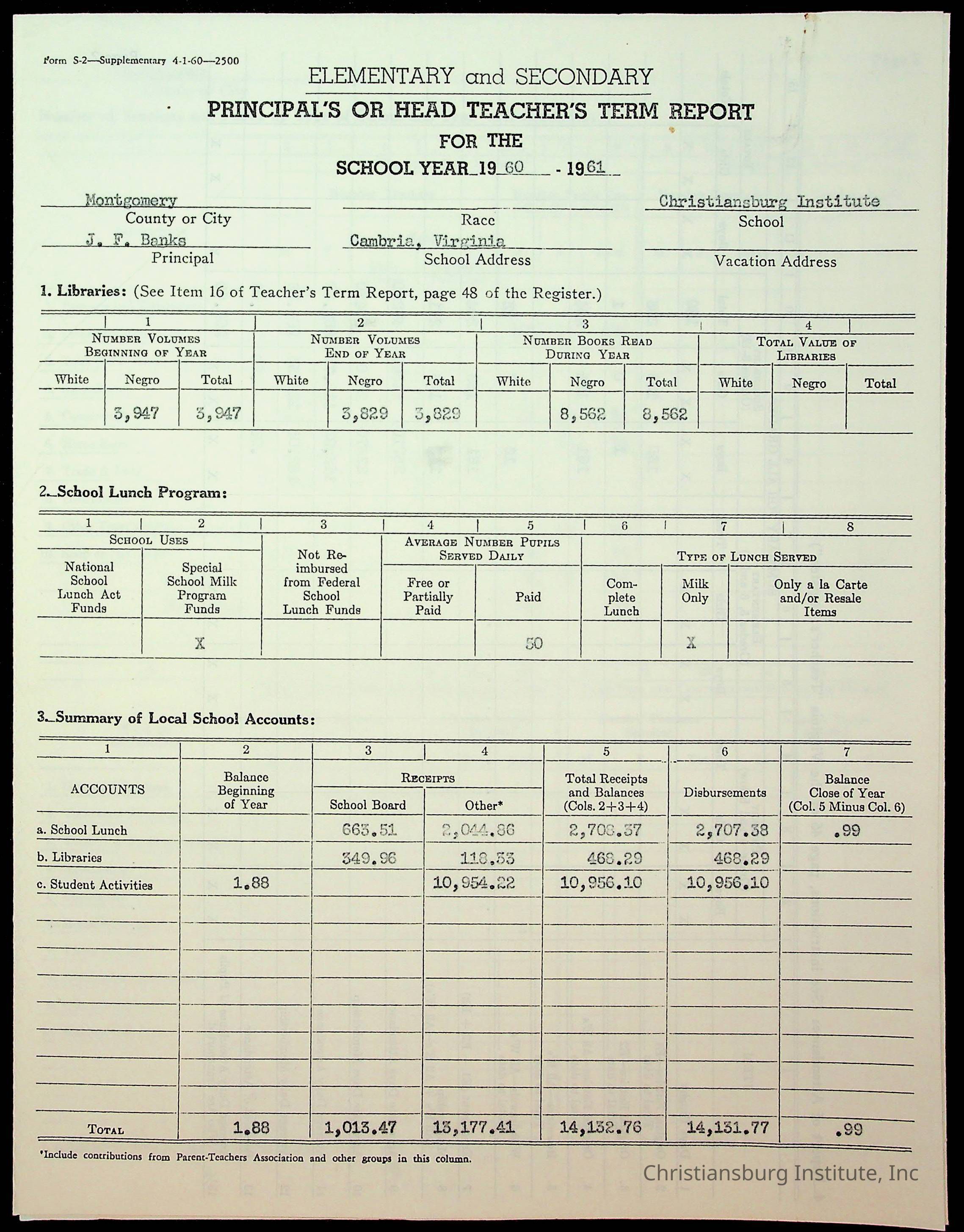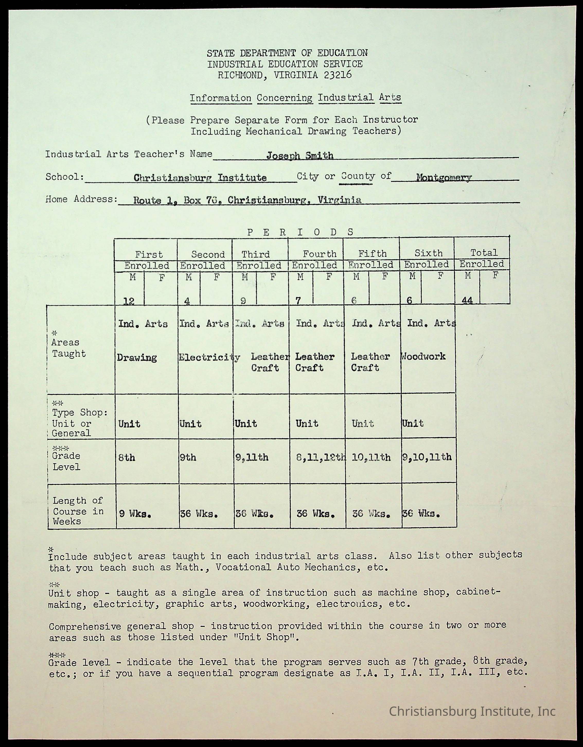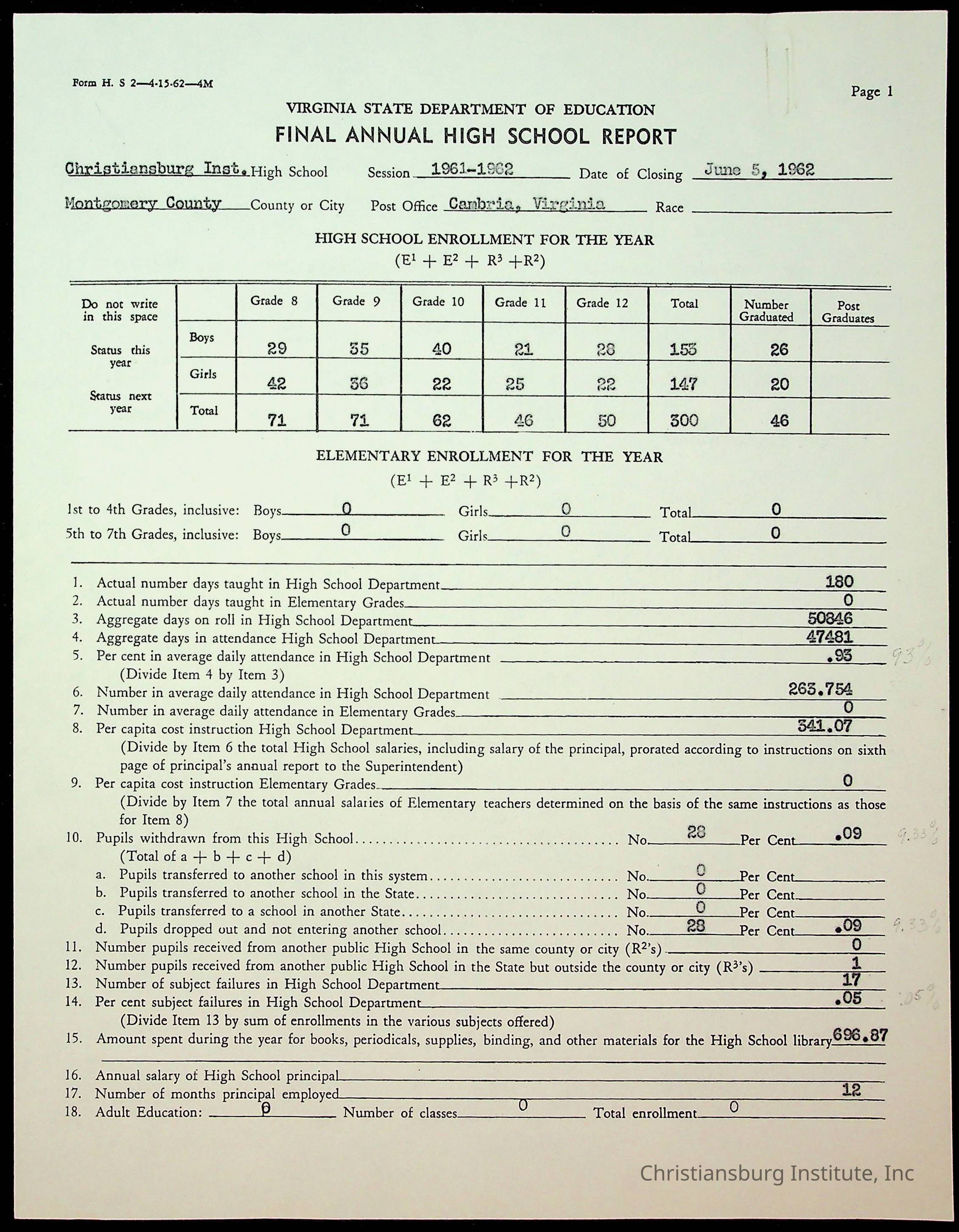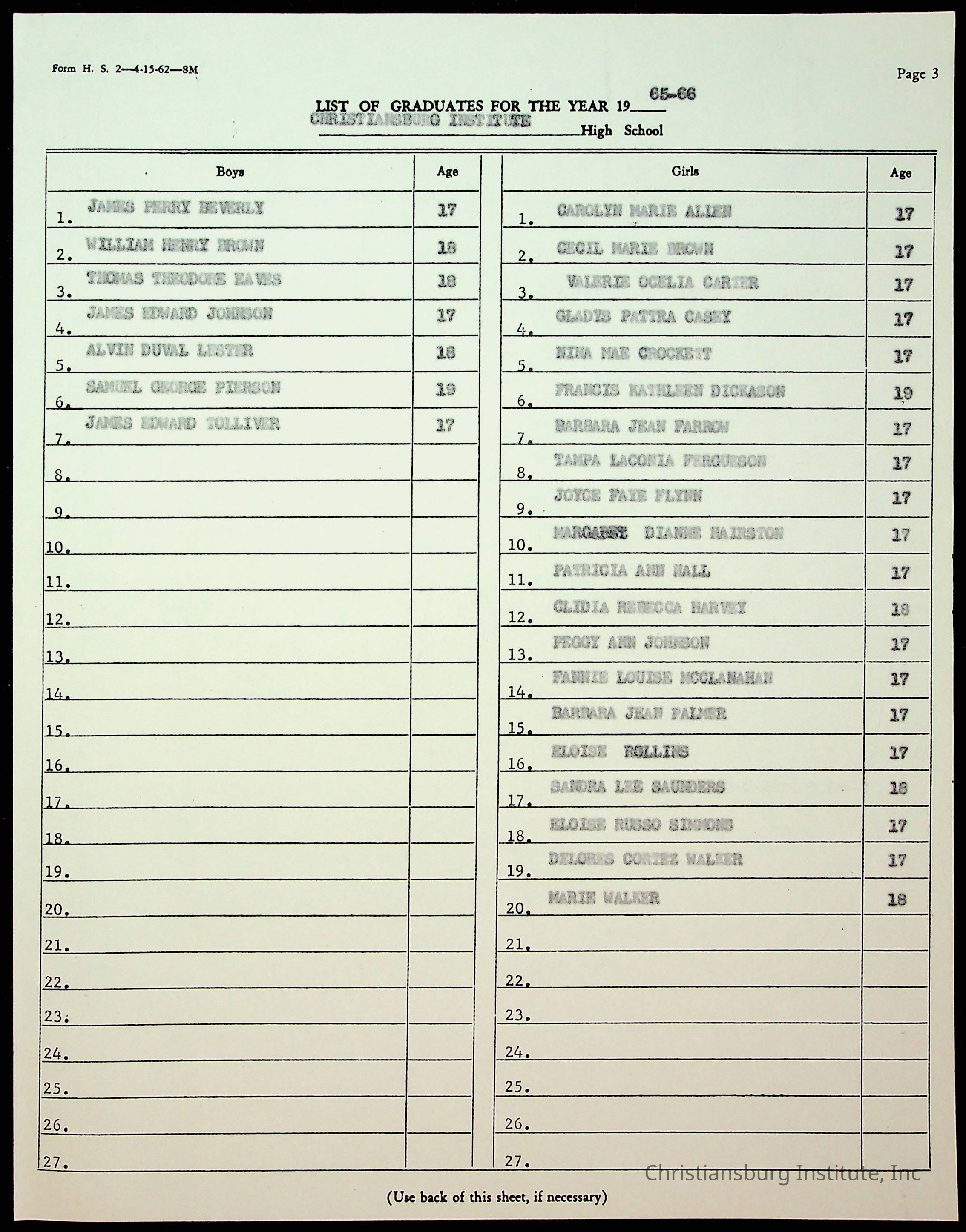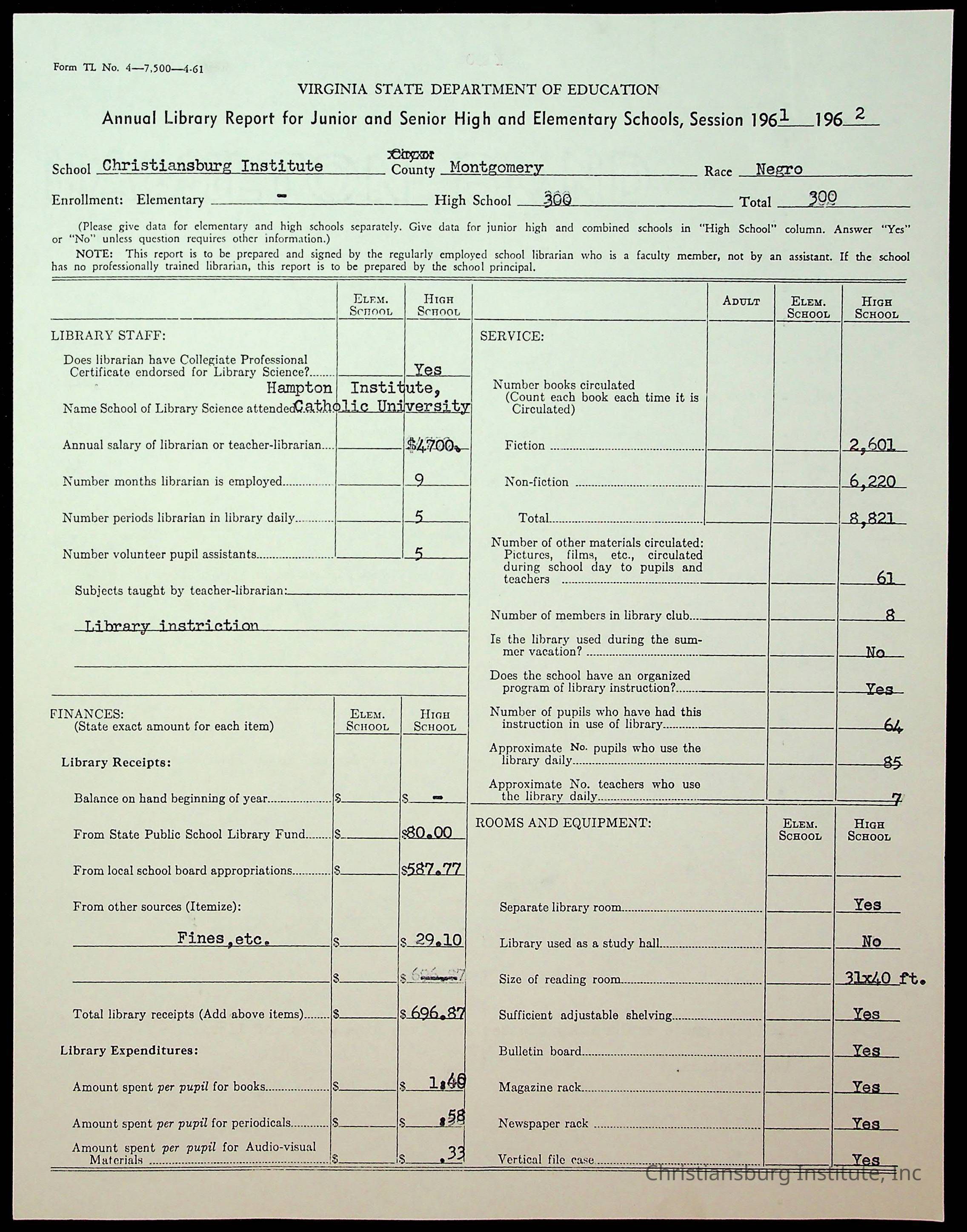 Copyright has been assigned to Christiansburg Institute Museum & Archives by Montgomery County Public Schools. For permission to publish materials created by the donor, contact CIMA@christiansburginstitute.com. Materials not created by Christiansburg Industrial Institute may still be under copyright.
