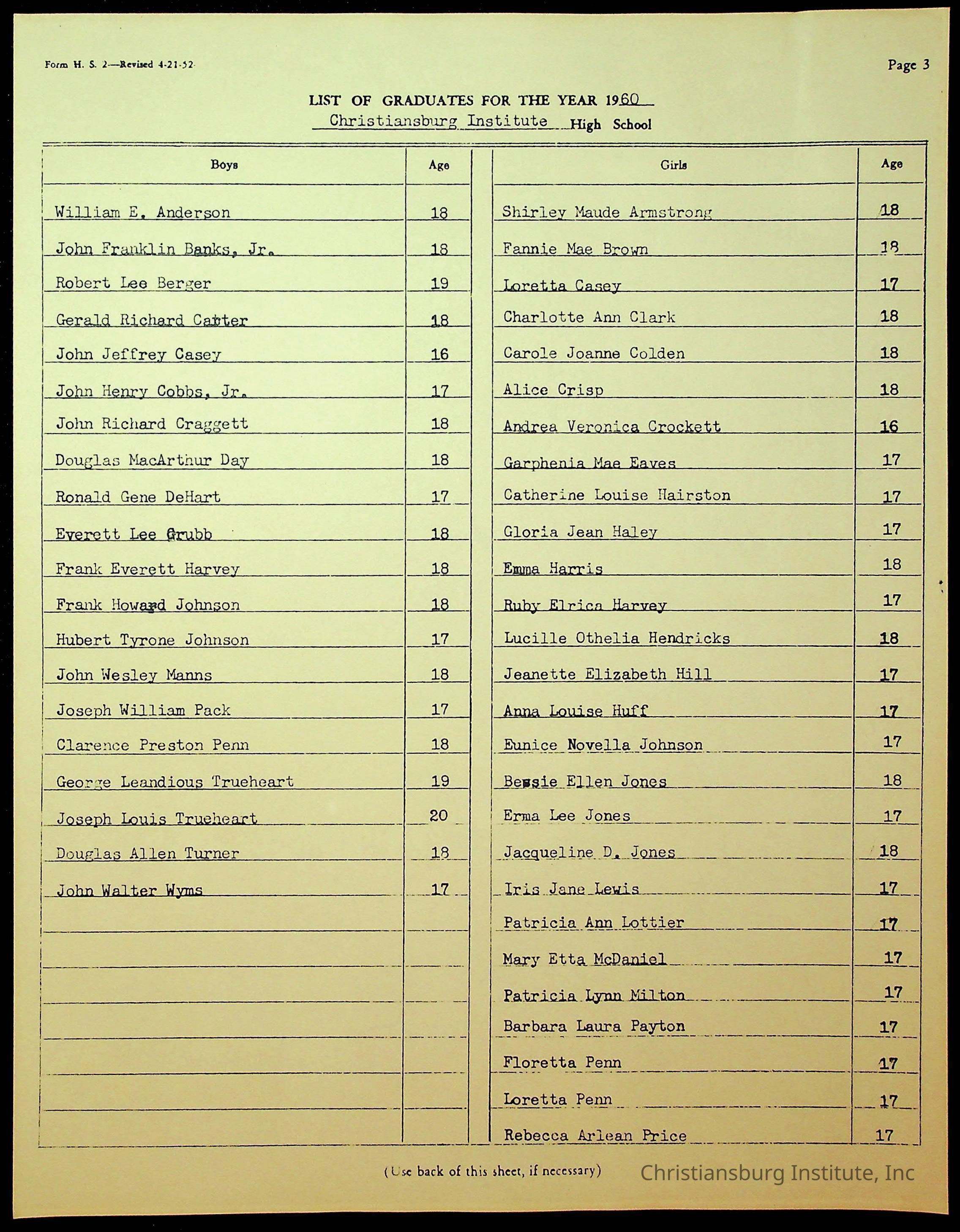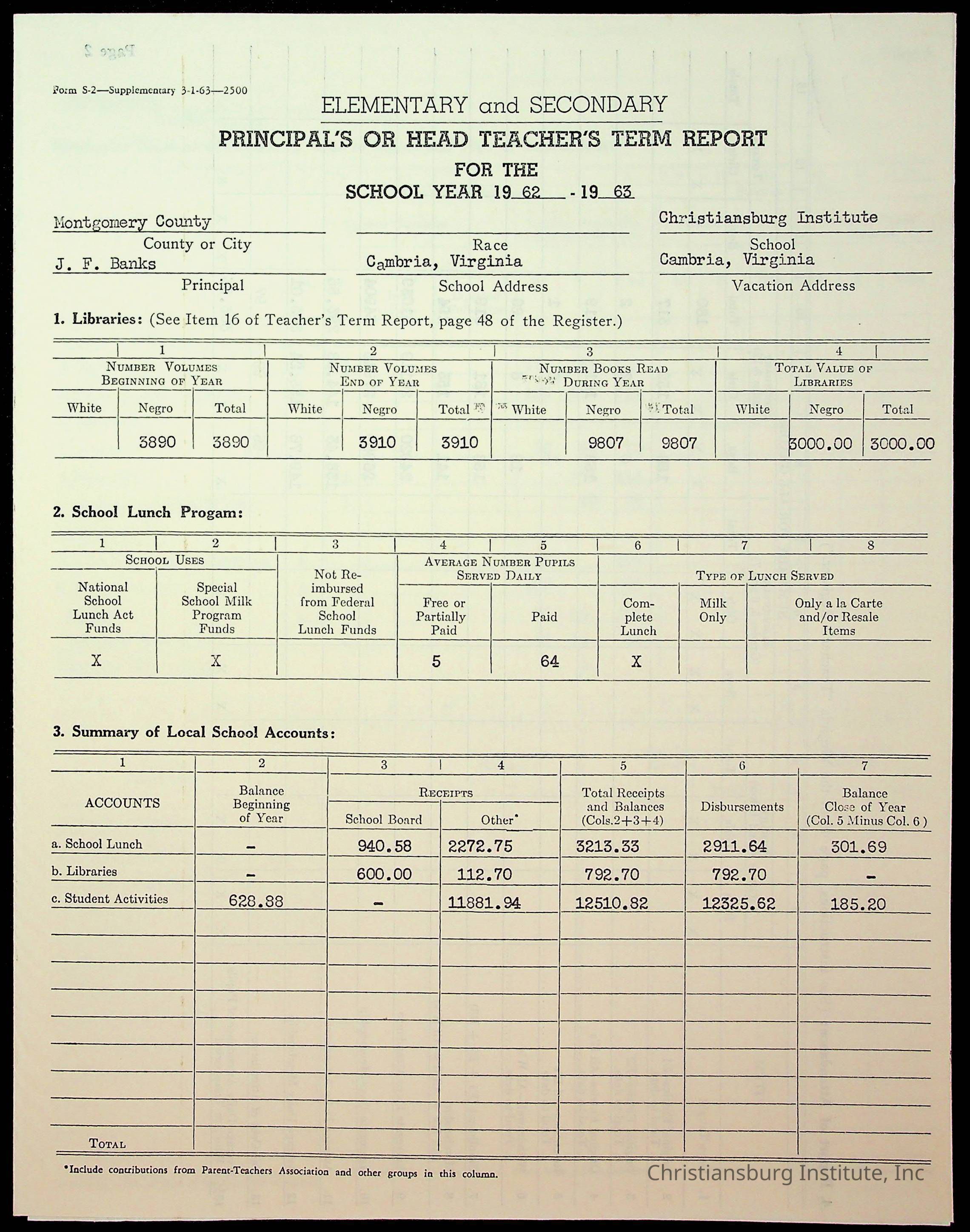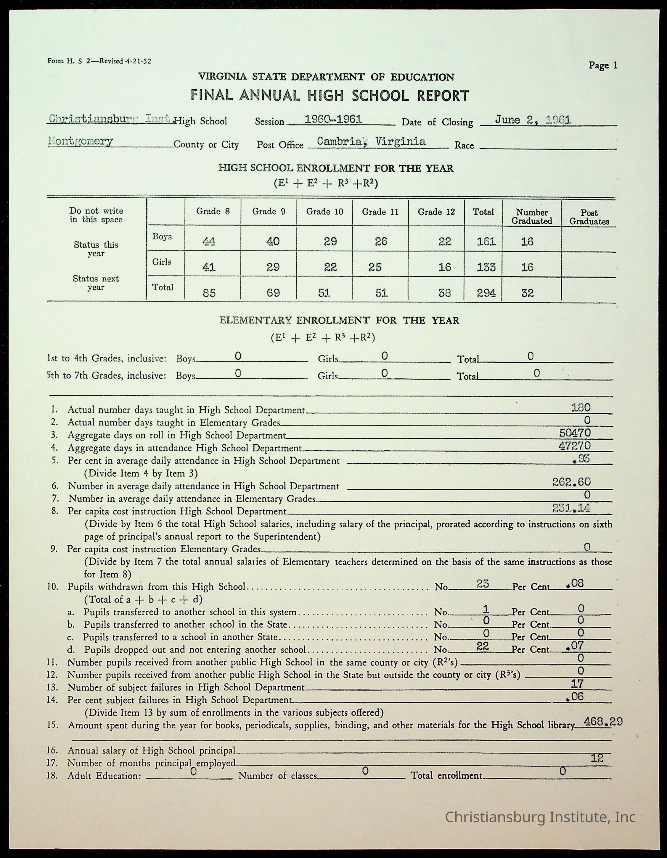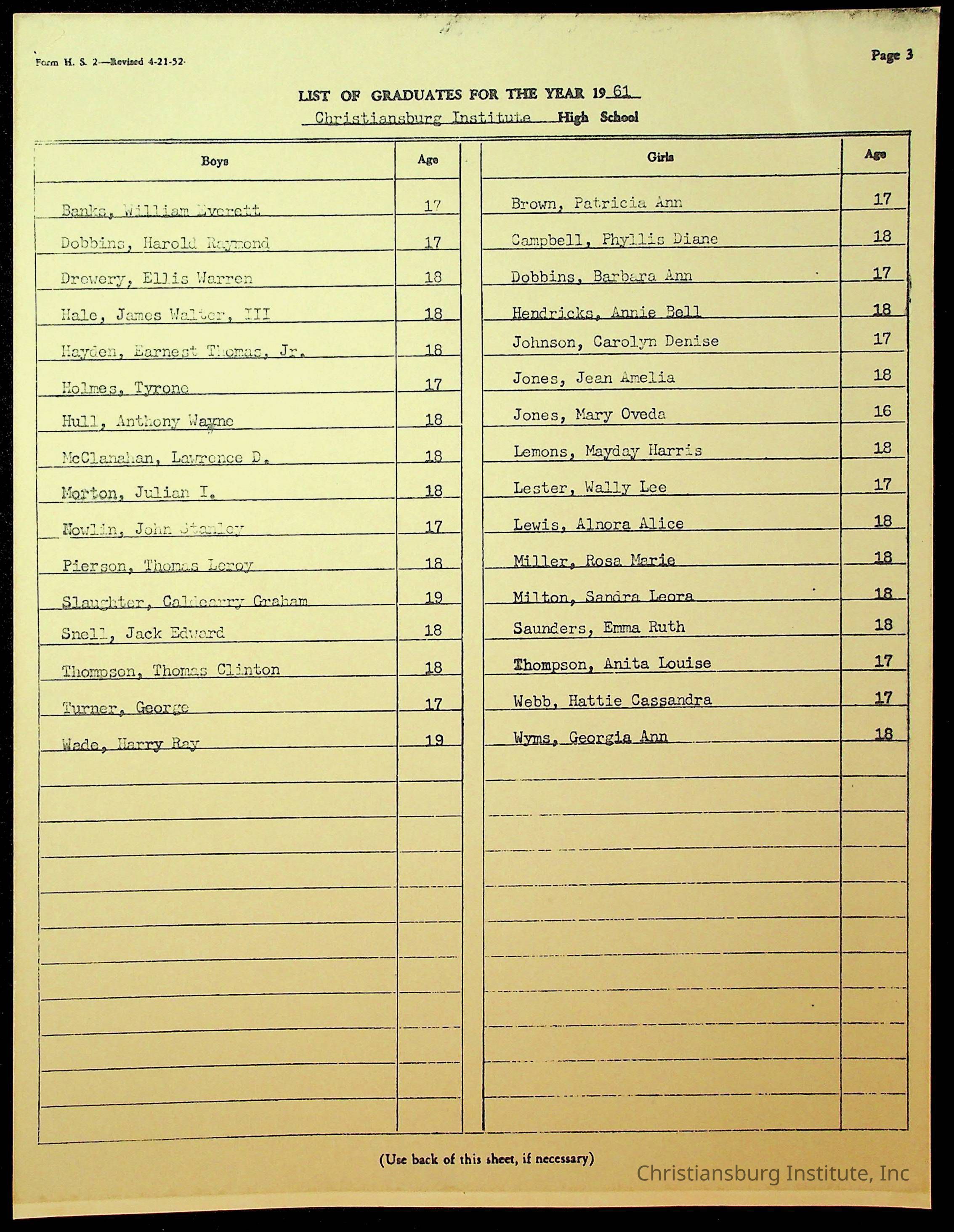 Copyright has been assigned to Christiansburg Institute Museum & Archives by Montgomery County Public Schools. For permission to publish materials created by the donor, contact CIMA@christiansburginstitute.com. Materials not created by Christiansburg Industrial Institute may still be under copyright.