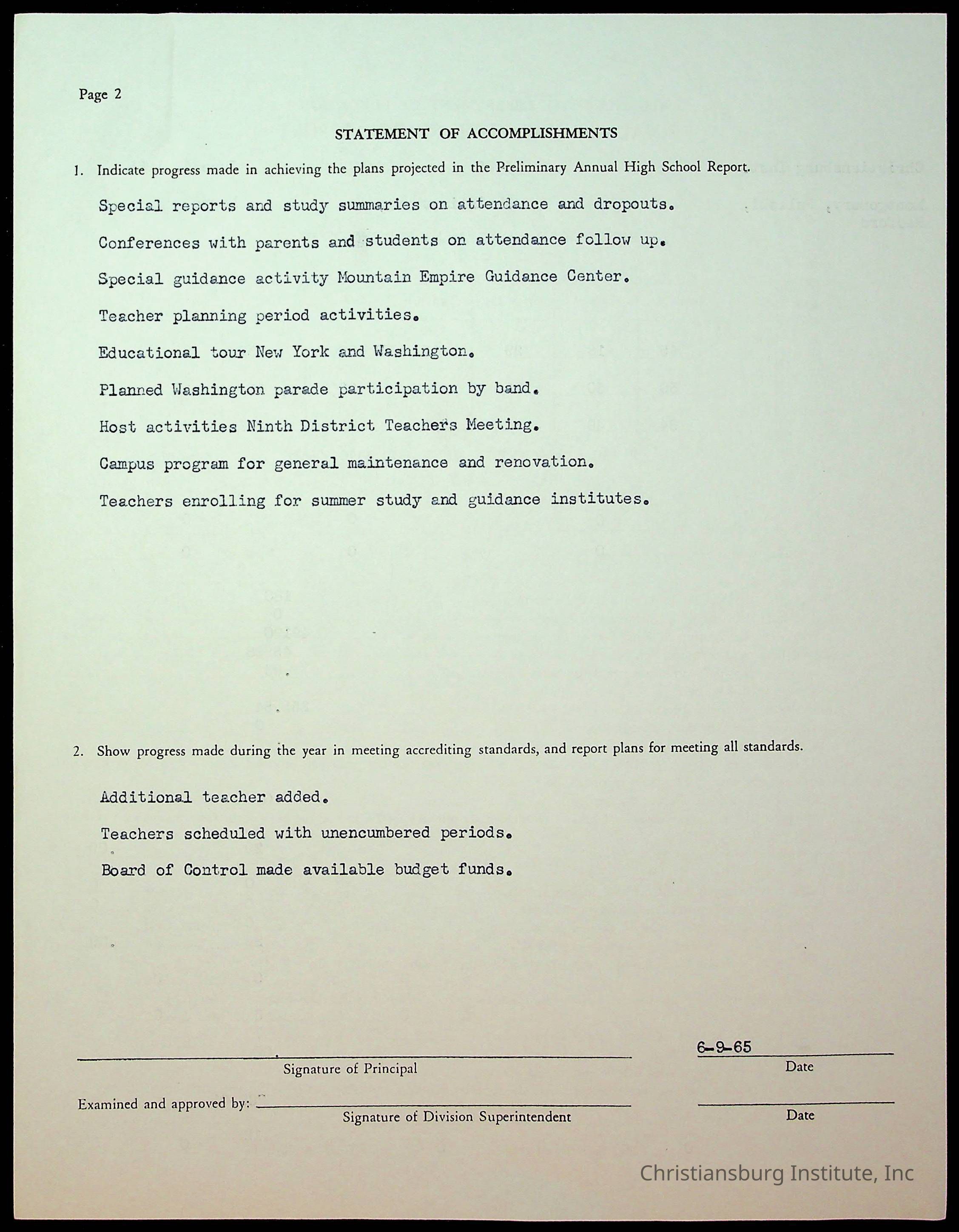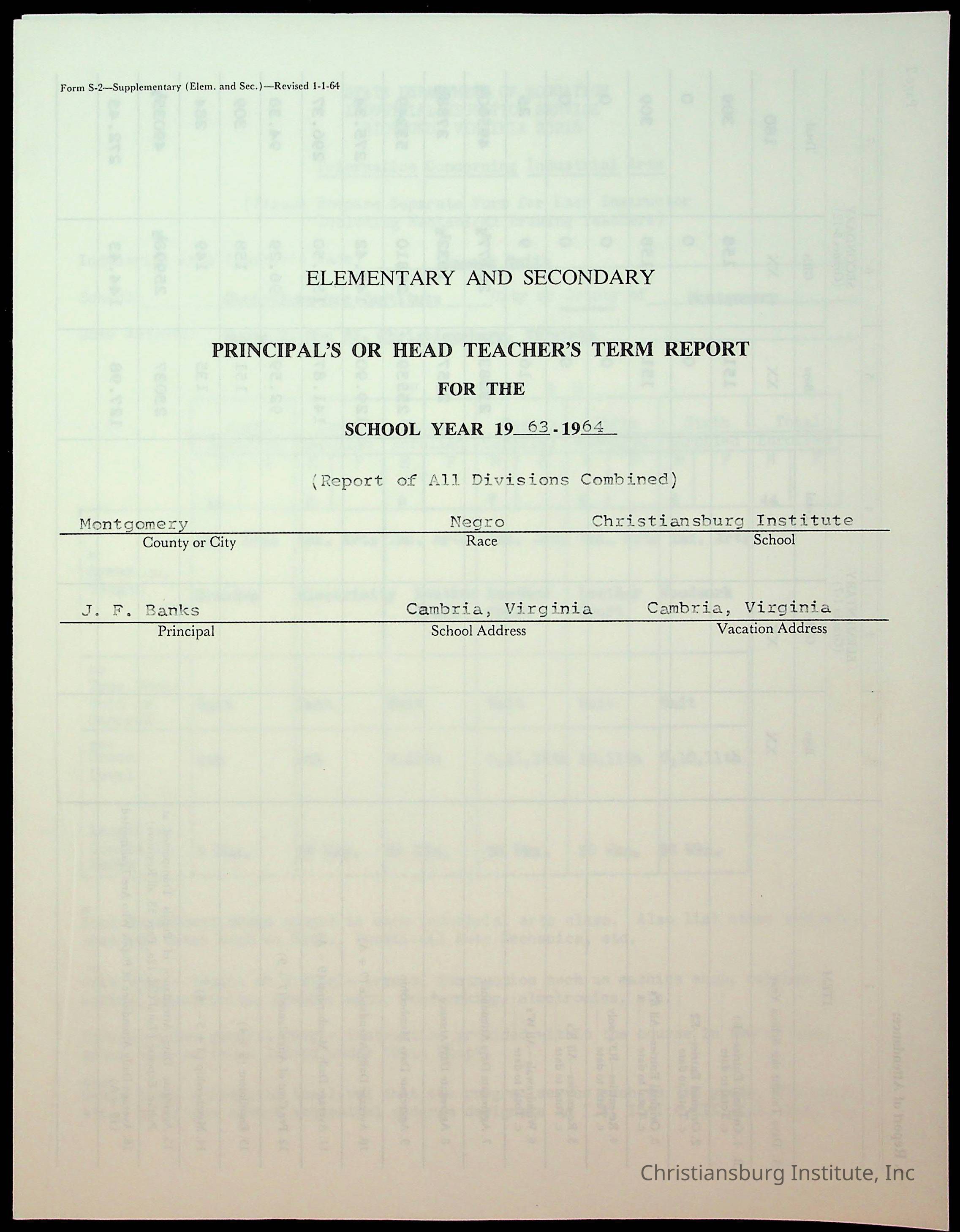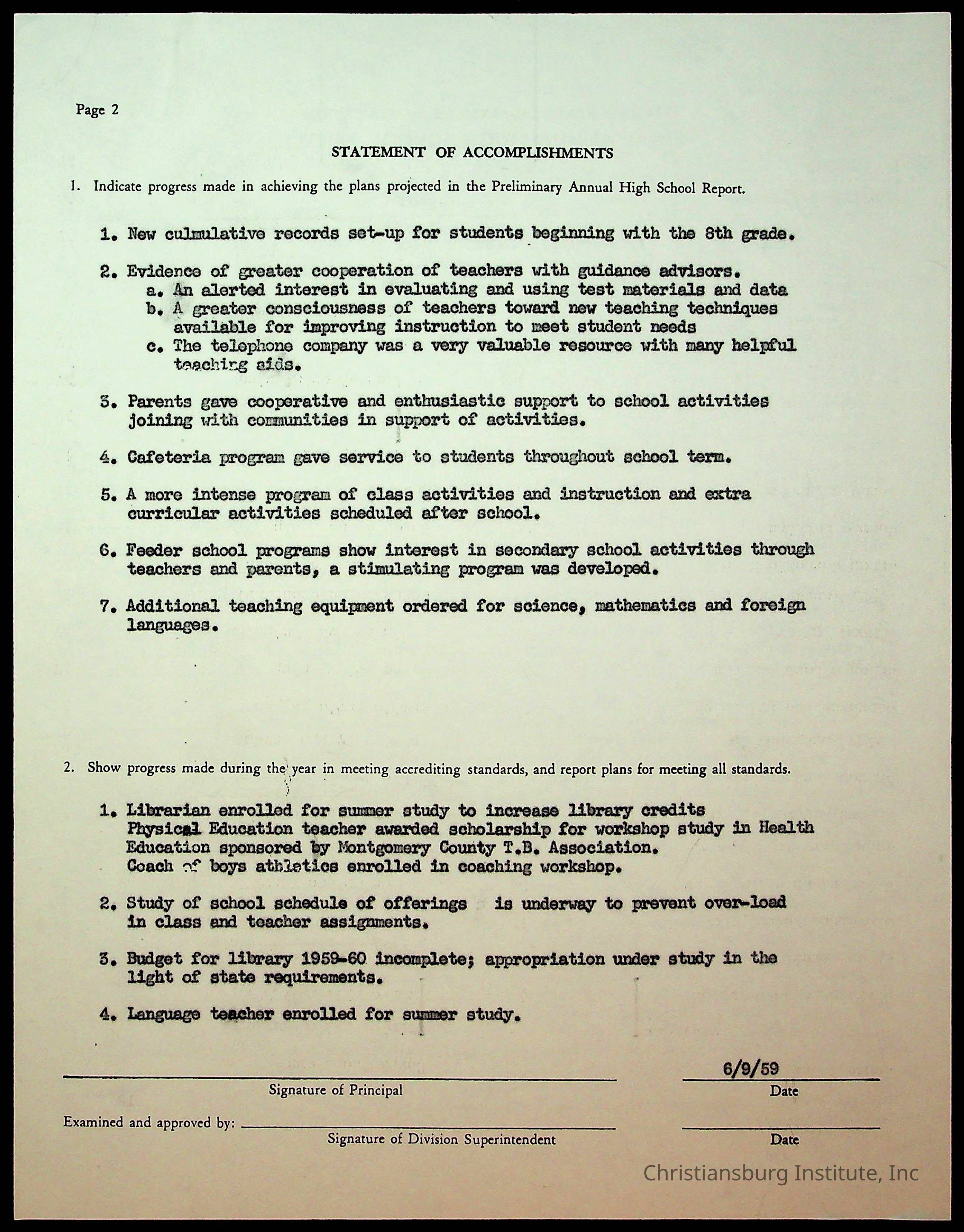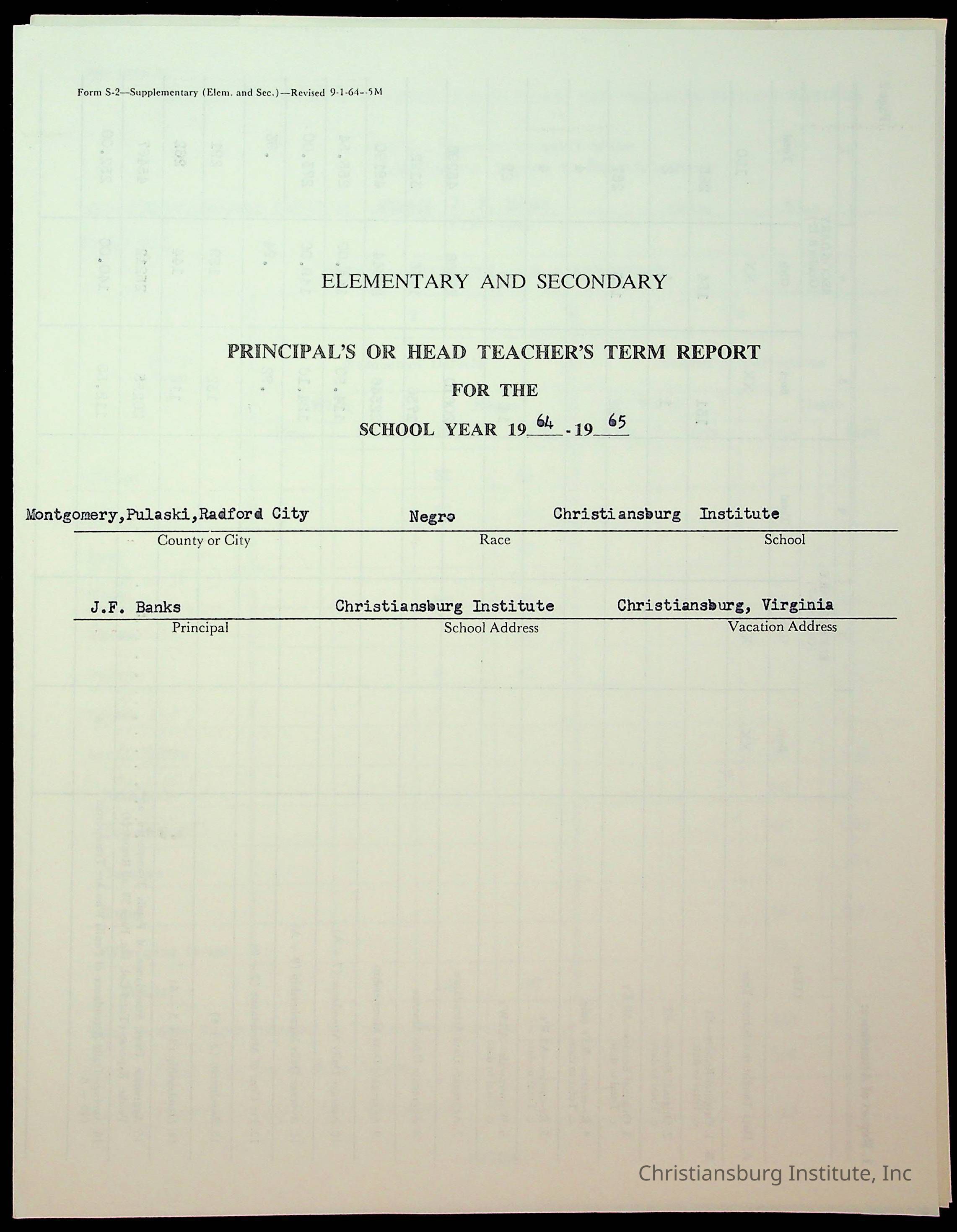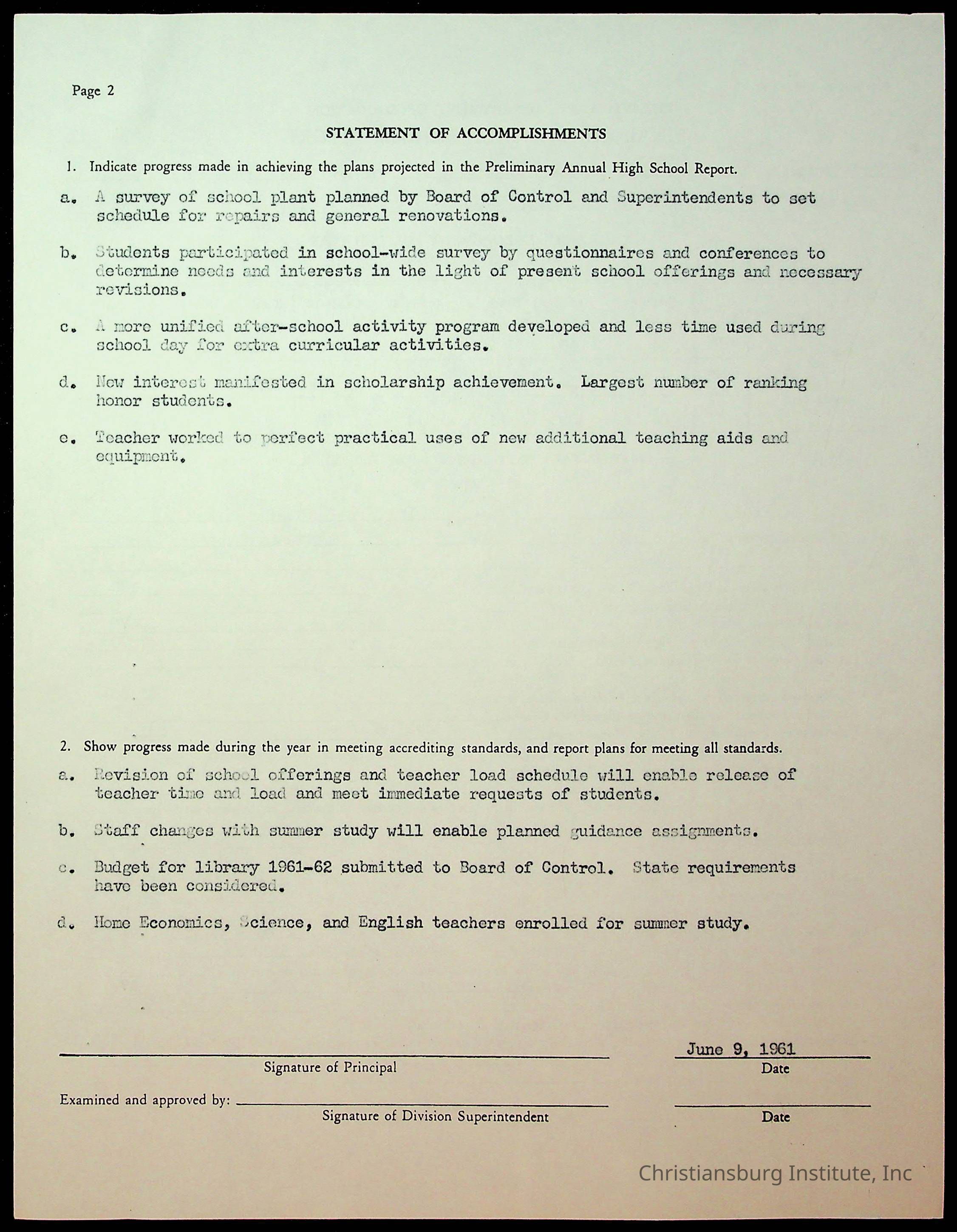 The second folder of an archive of reports to the Commonwealth of Virginia Department of Education for Christiansburg Institute from 1959 through 1966 to when Christiansburg Institute closed.