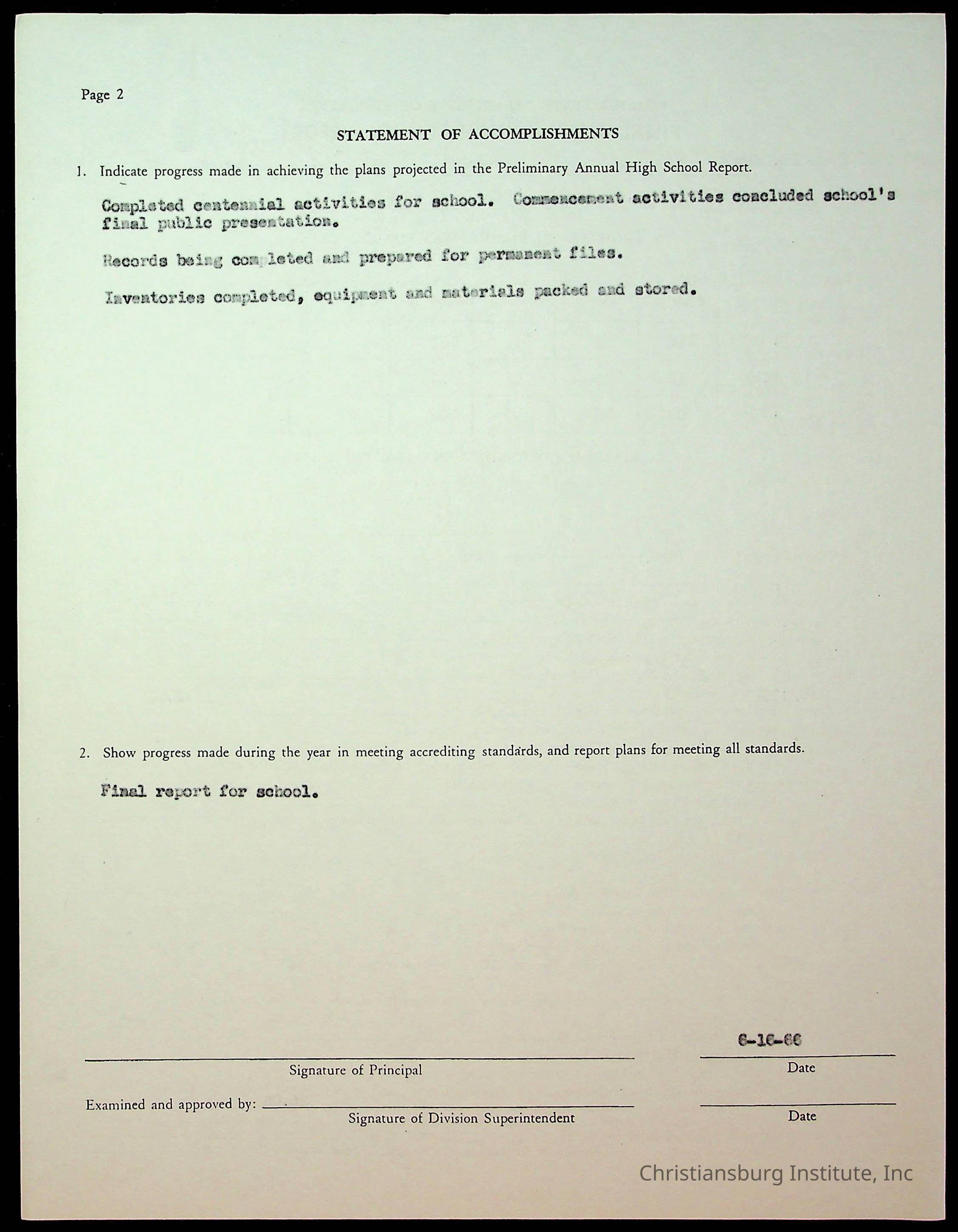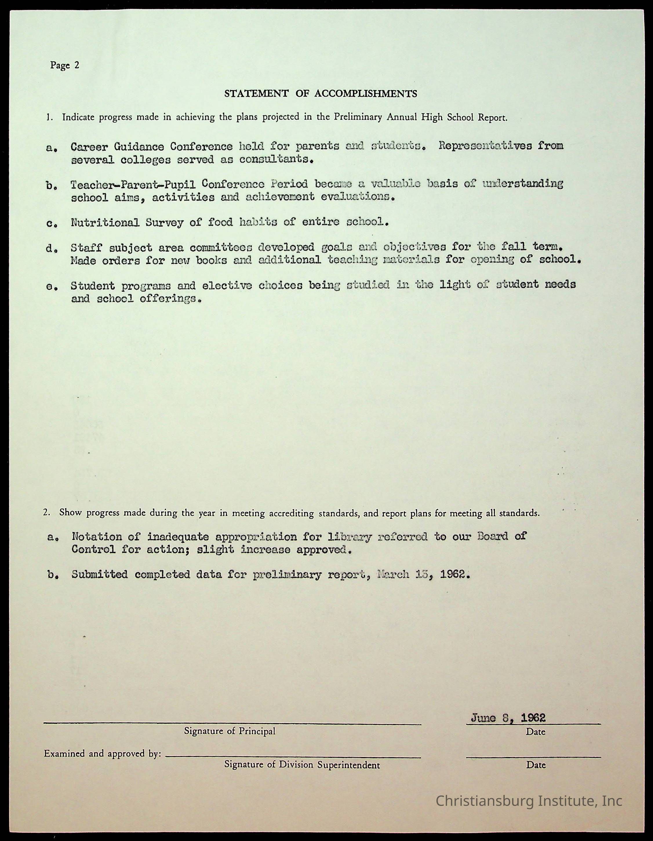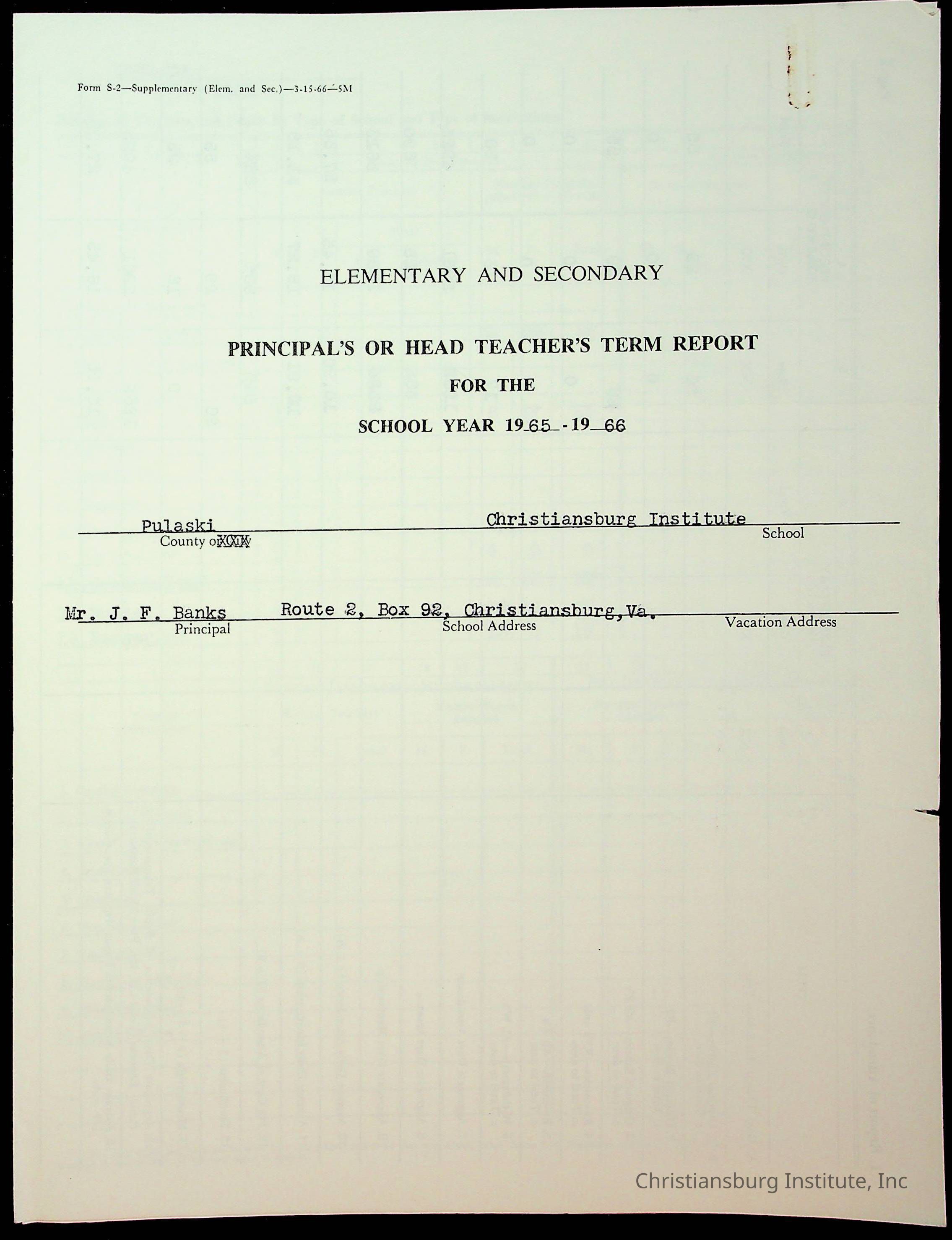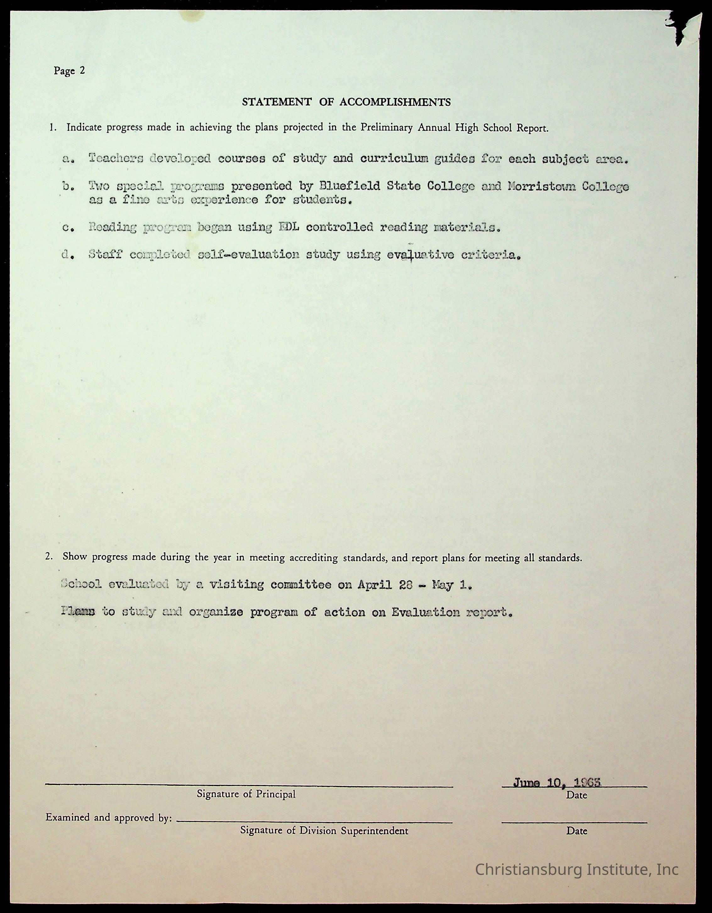 The second folder of an archive of reports to the Commonwealth of Virginia Department of Education for Christiansburg Institute from 1959 through 1966 to when Christiansburg Institute closed.
