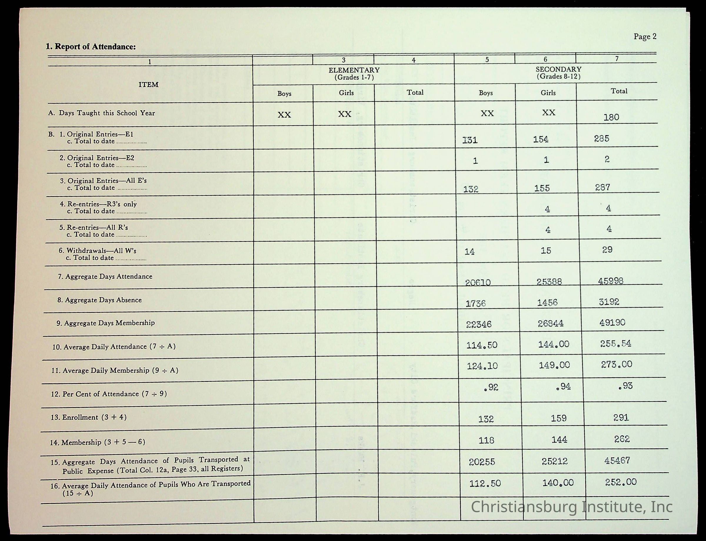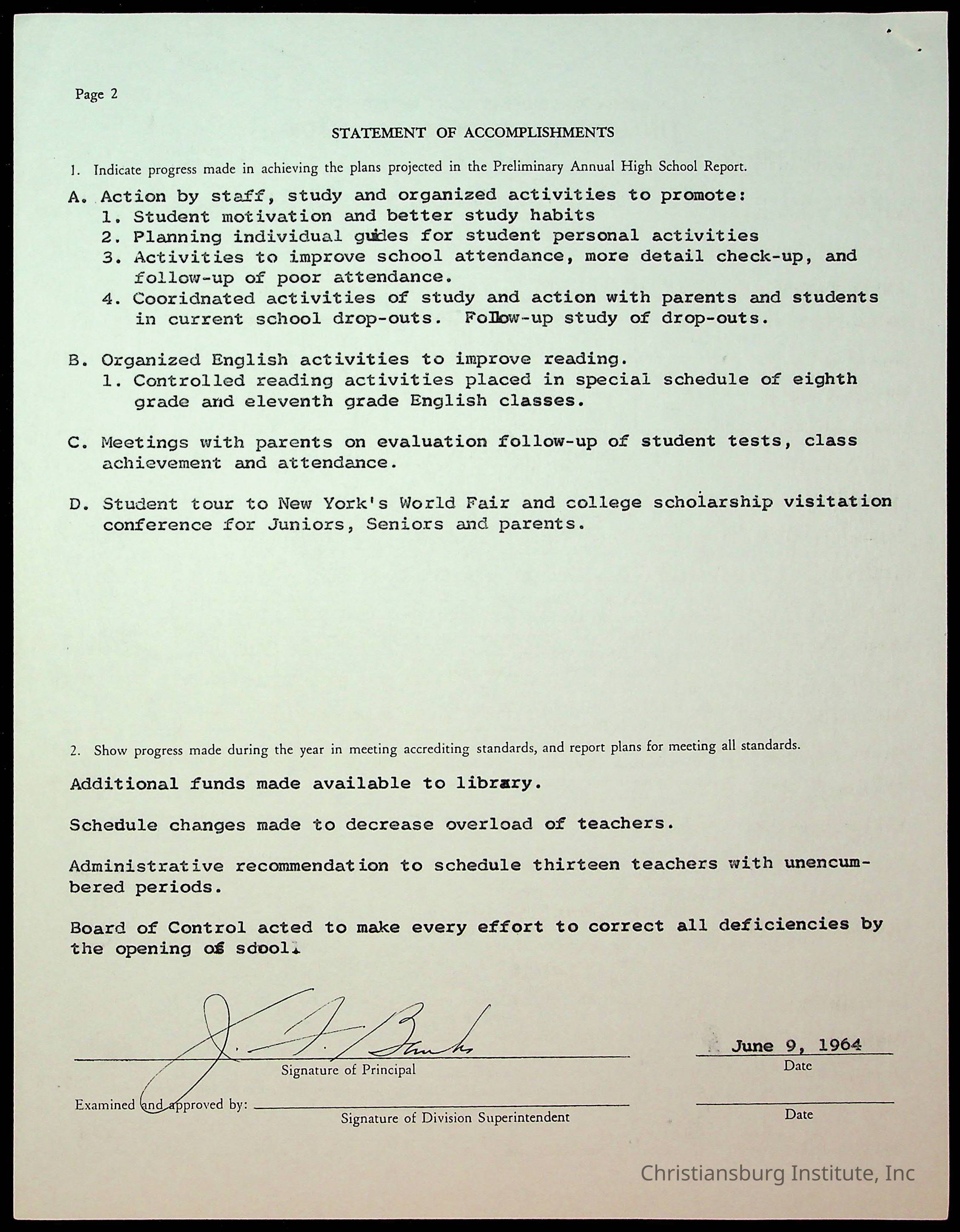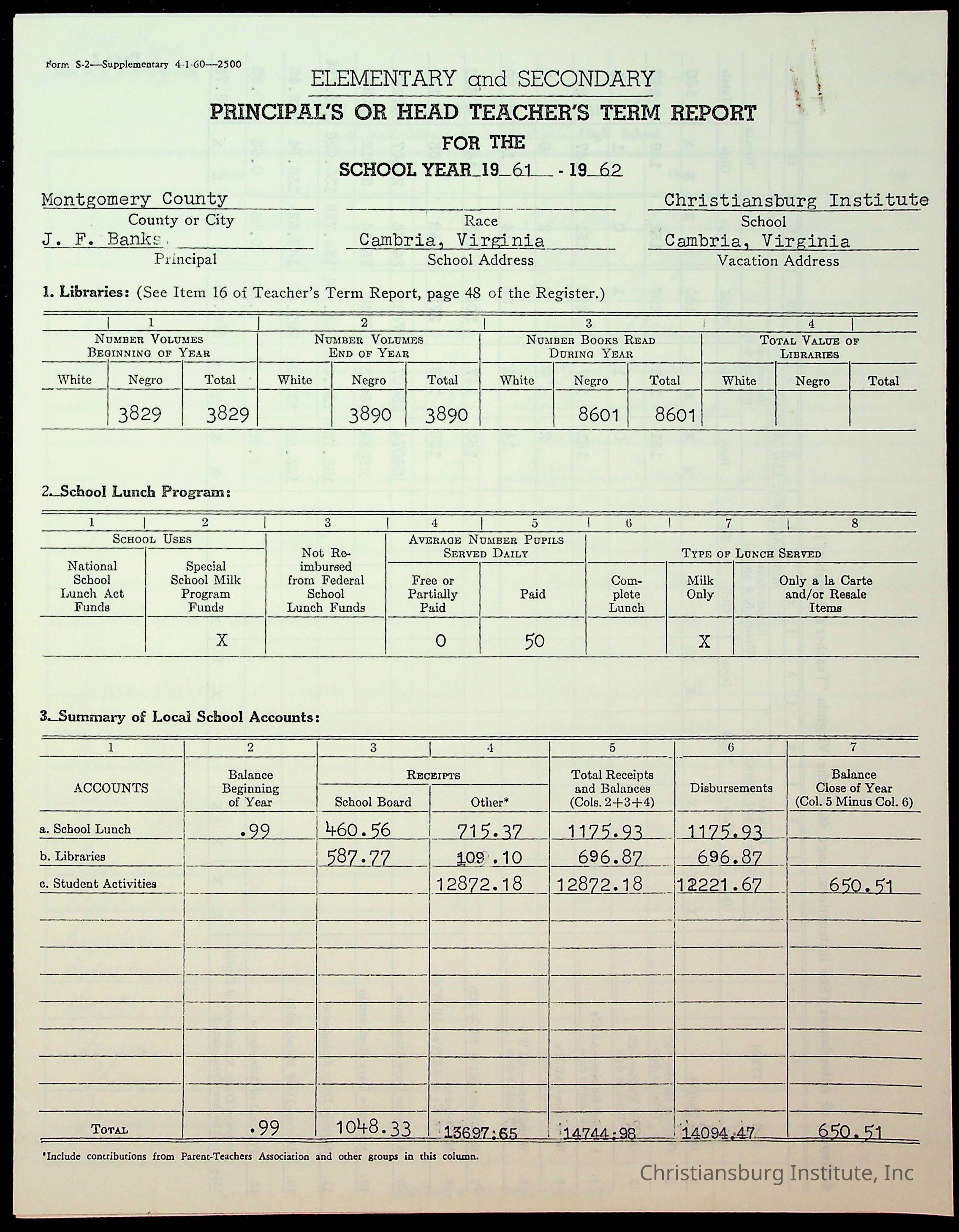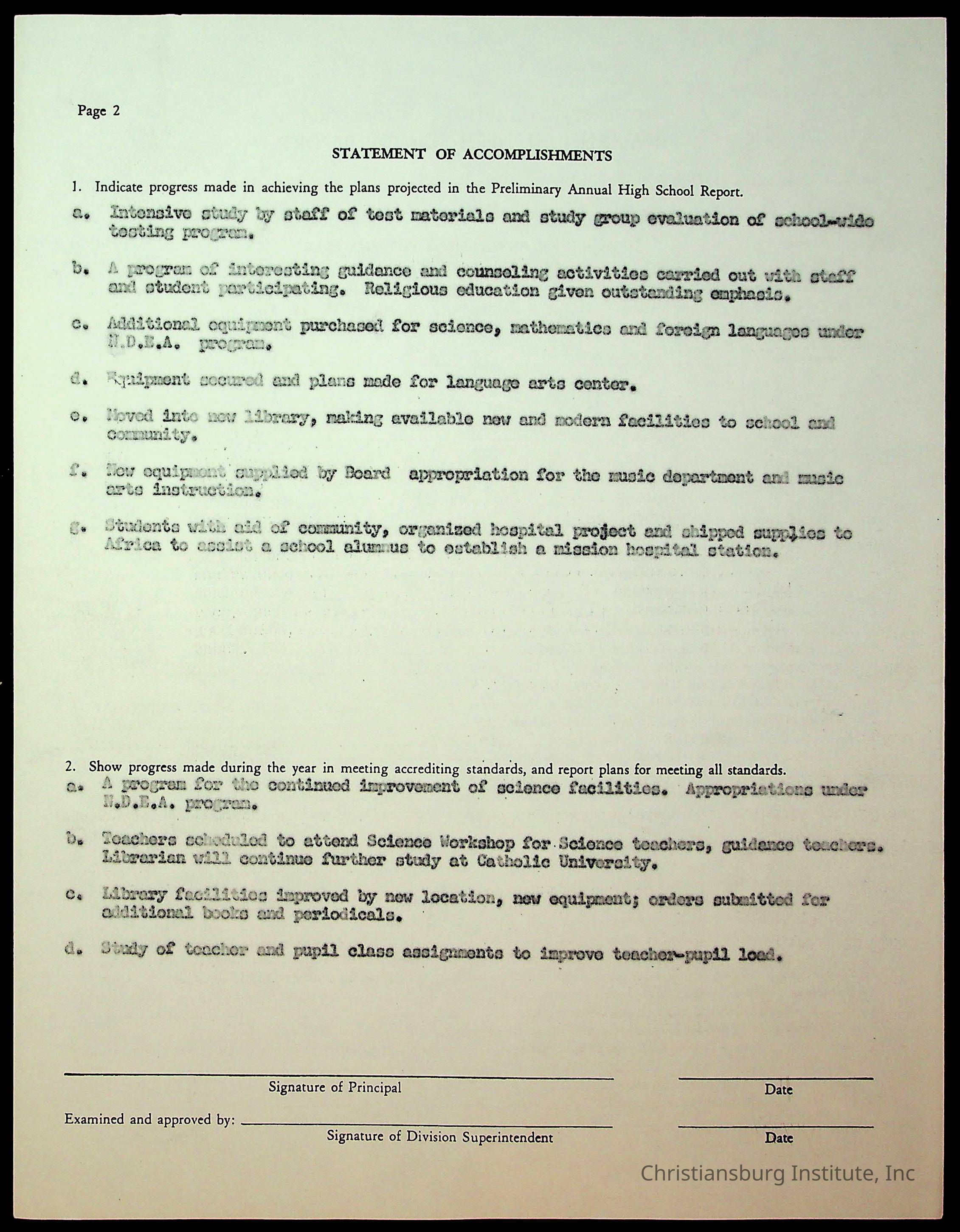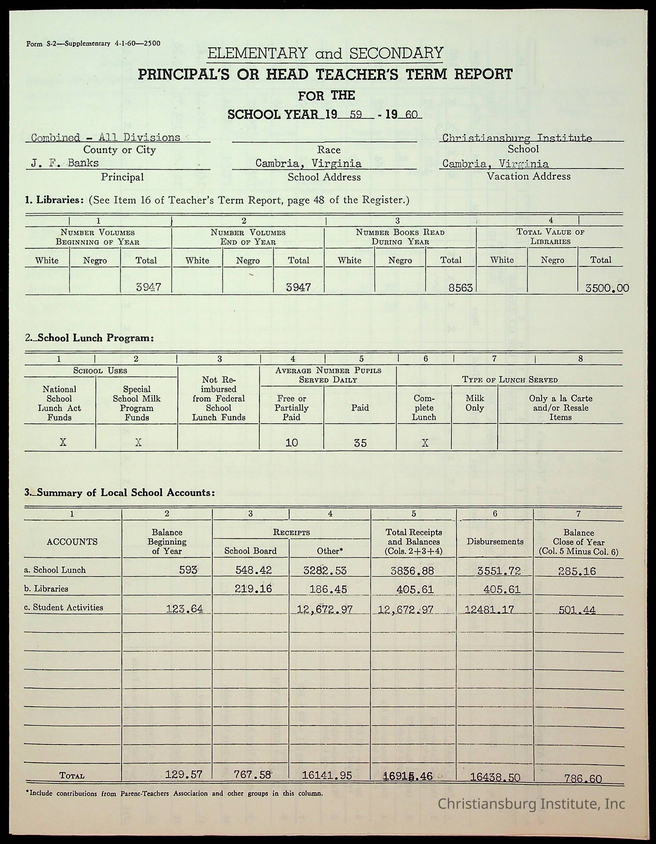 The second folder of an archive of reports to the Commonwealth of Virginia Department of Education for Christiansburg Institute from 1959 through 1966 to when Christiansburg Institute closed.