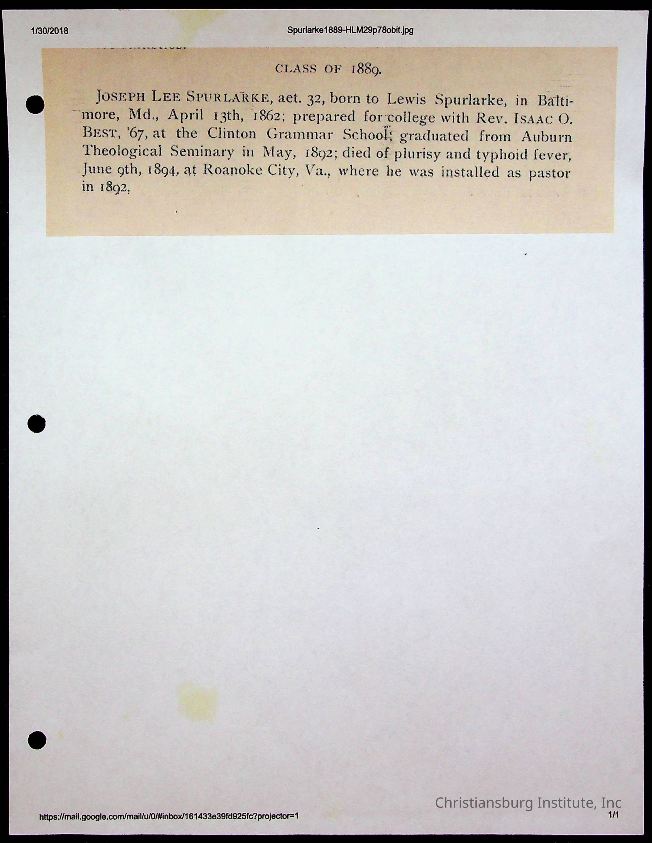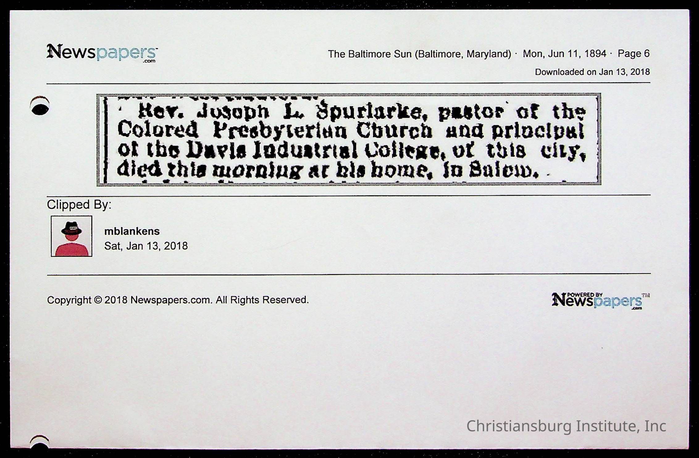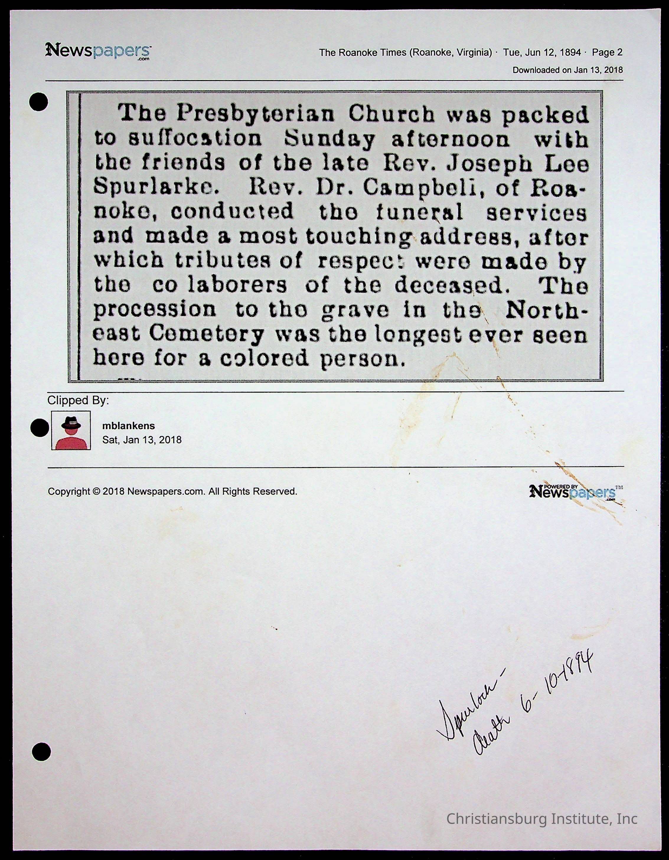 A collection of materials that pertain to Reverend Joseph Lee Spurlarke and to events that happened during the time he served at the church. He served as a reverend at Fifth Avenue Presbyterian Church.Collection