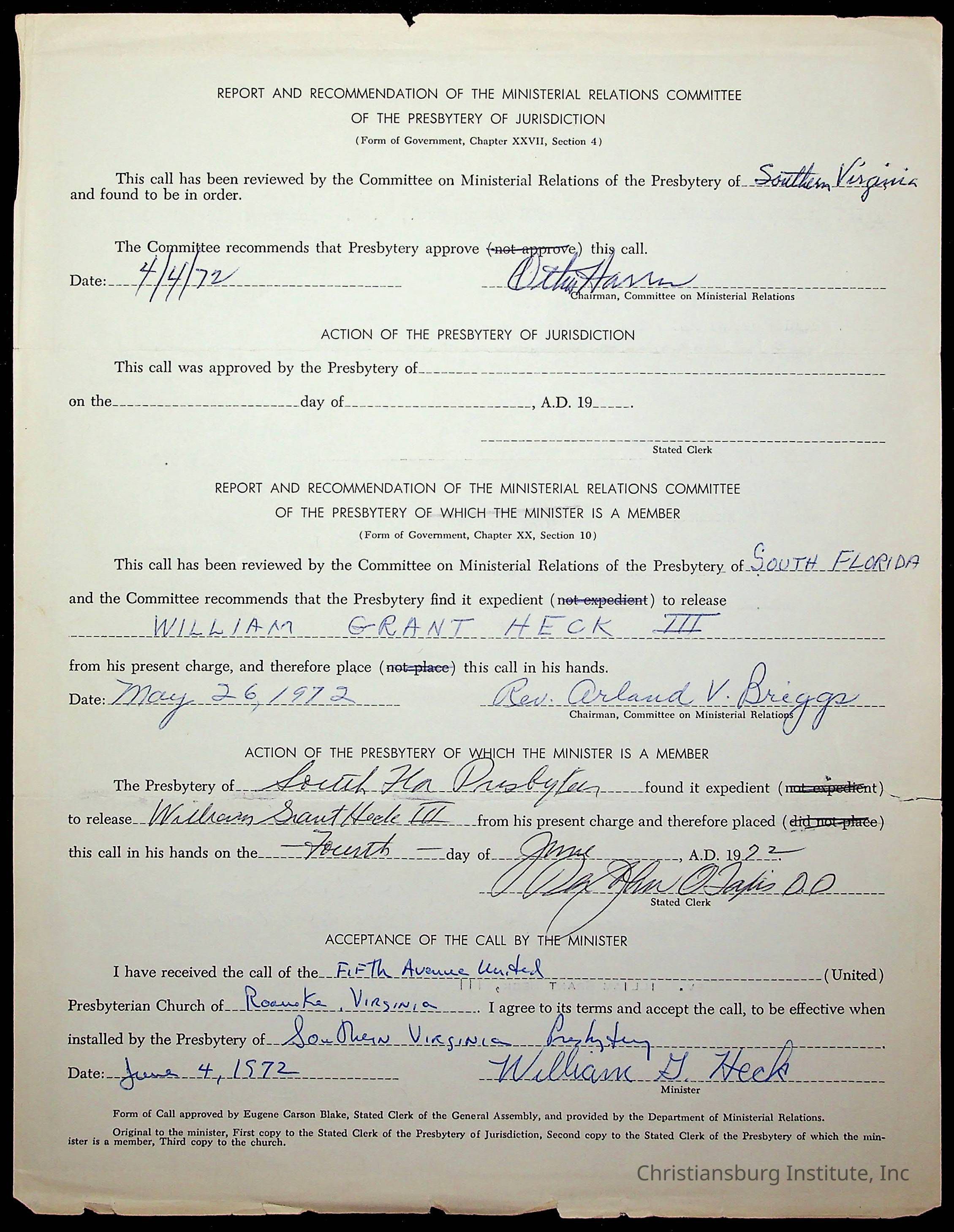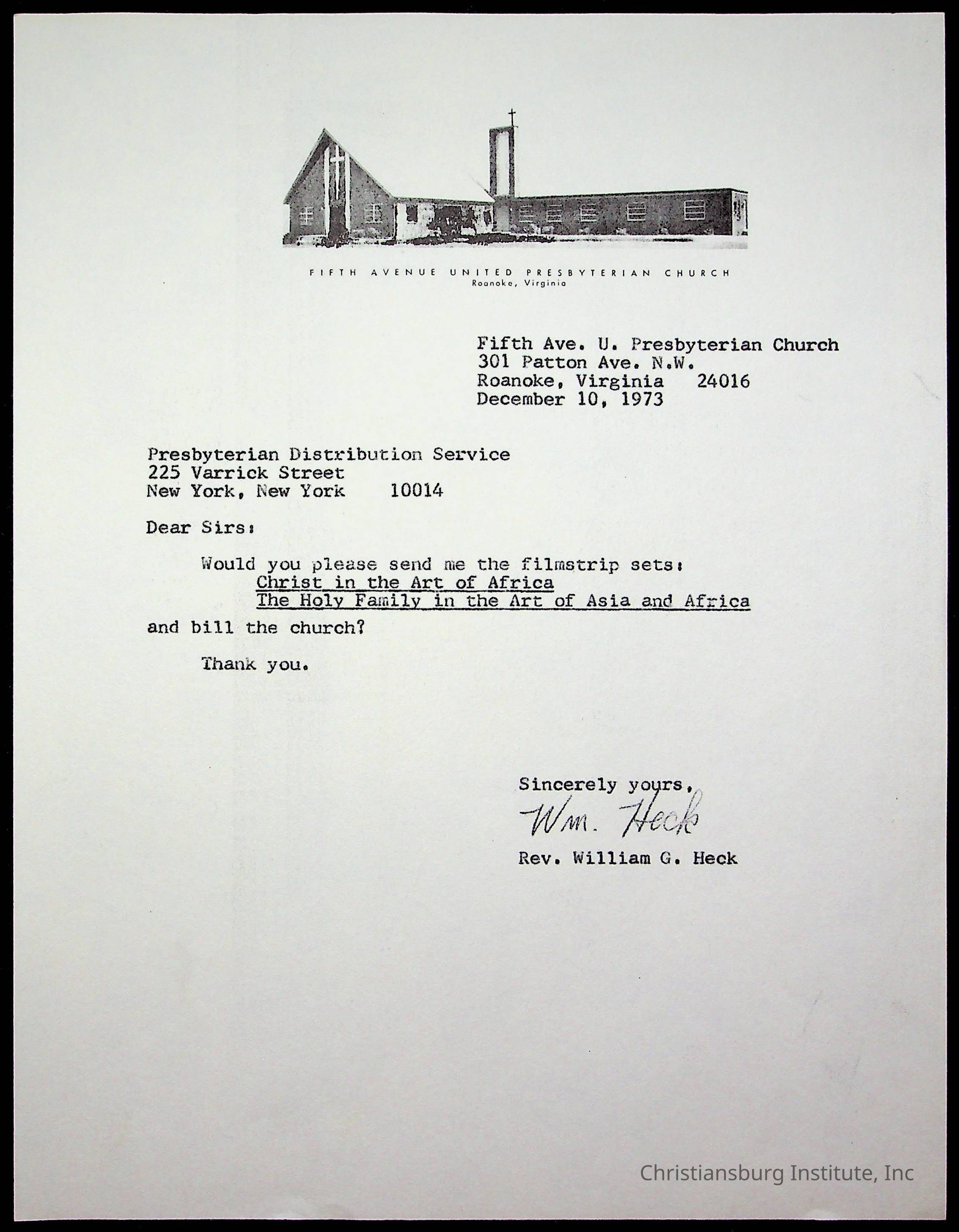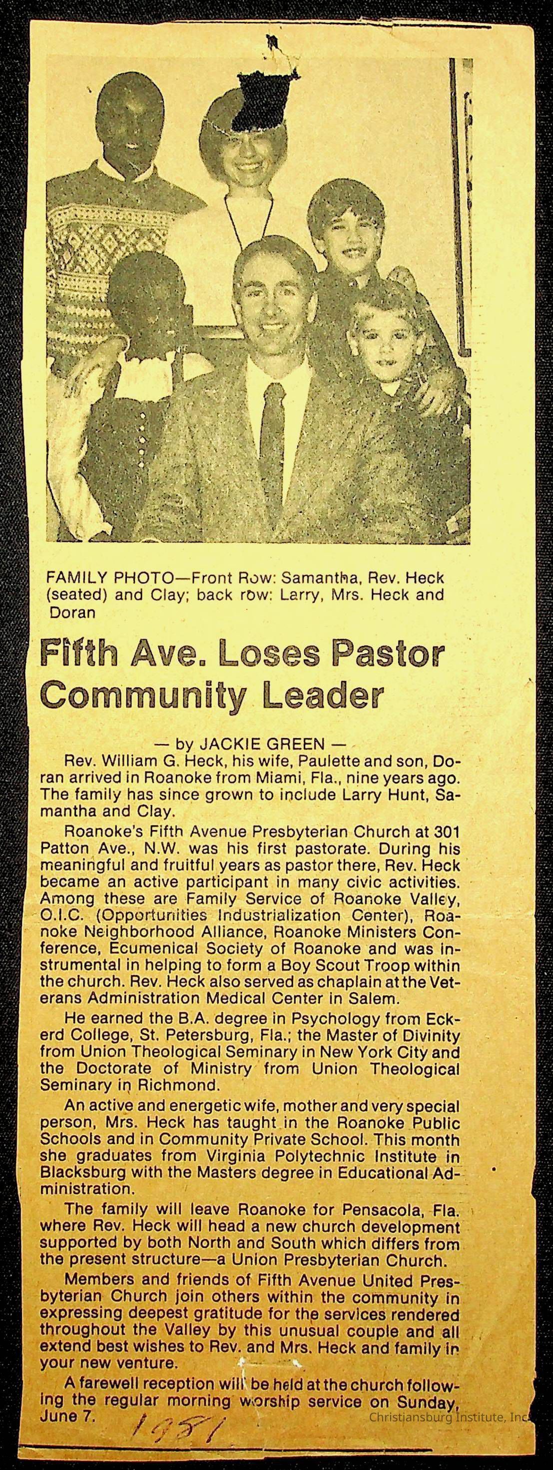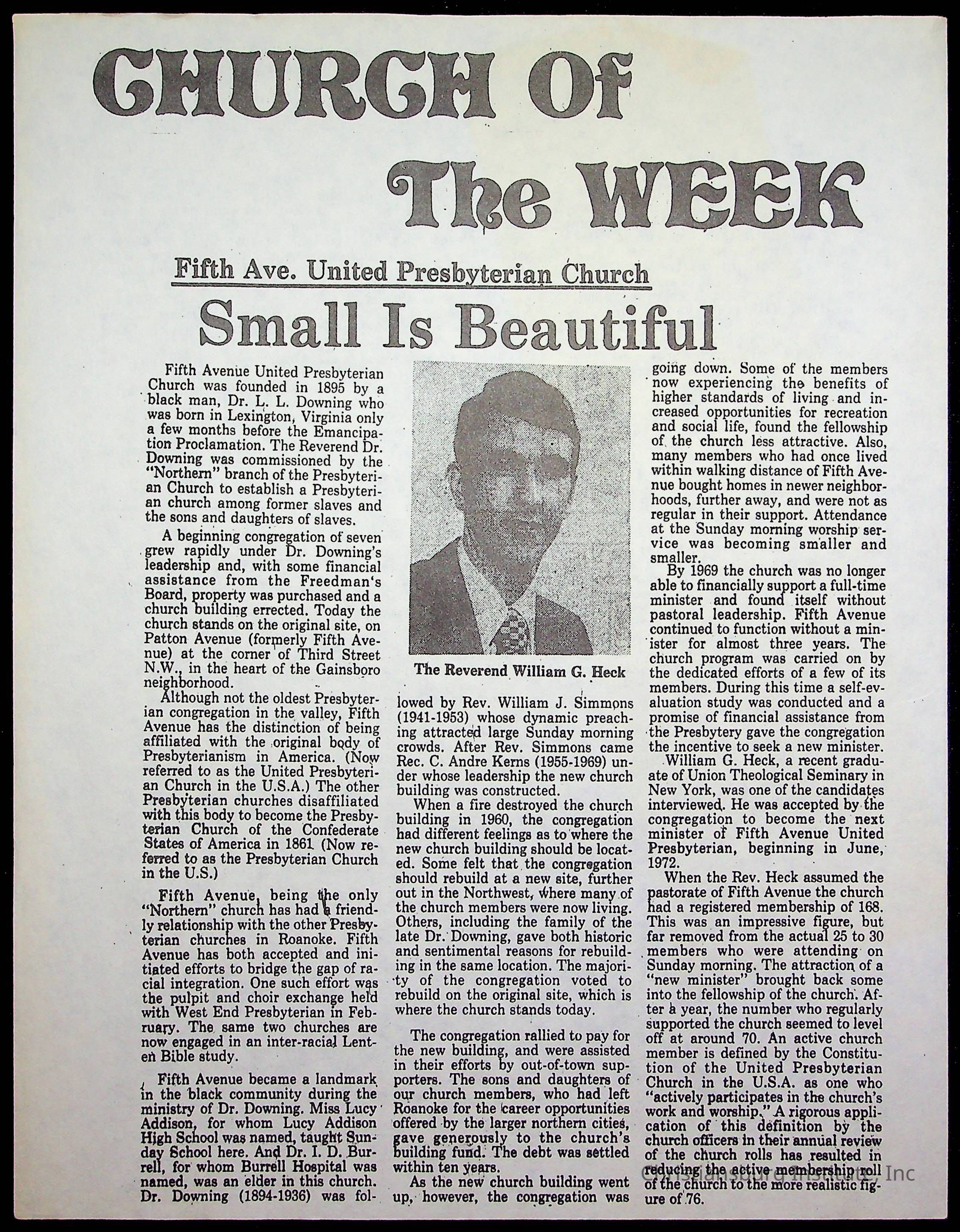 A collection of materials that pertain to Reverend William G. Heck III and to events that happened during the time he served at the church. He served as a reverend at Fifth Avenue Presbyterian Church.Collection