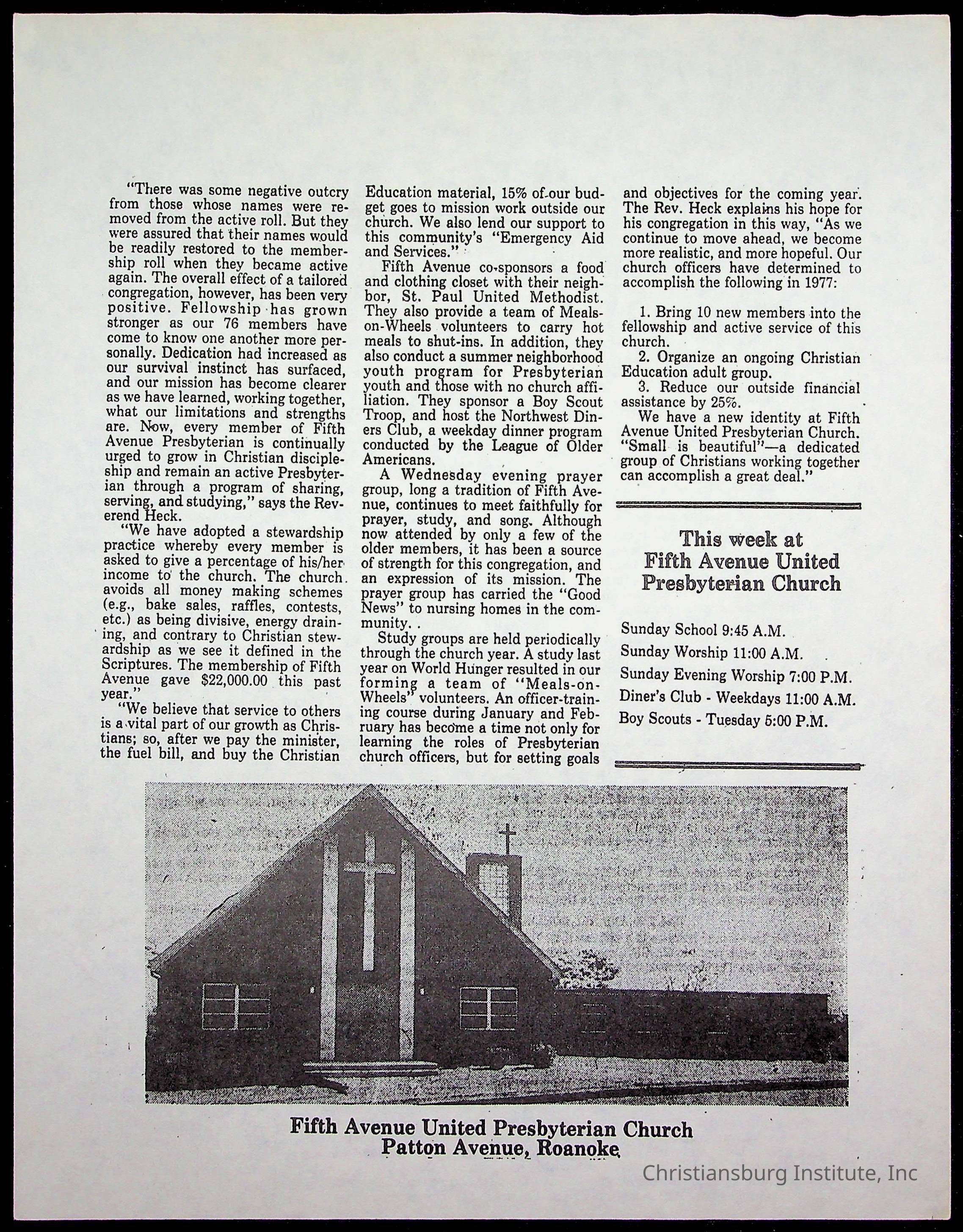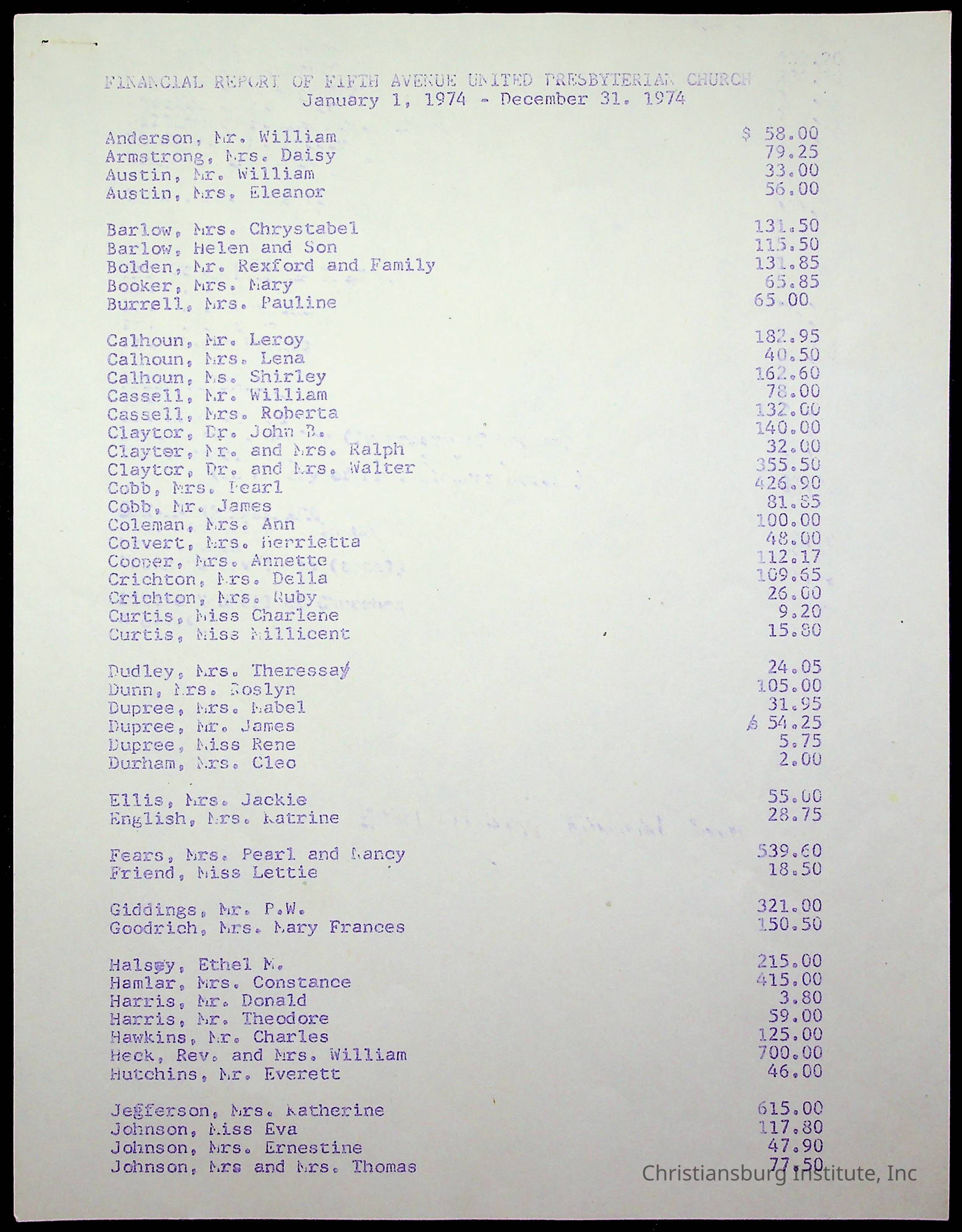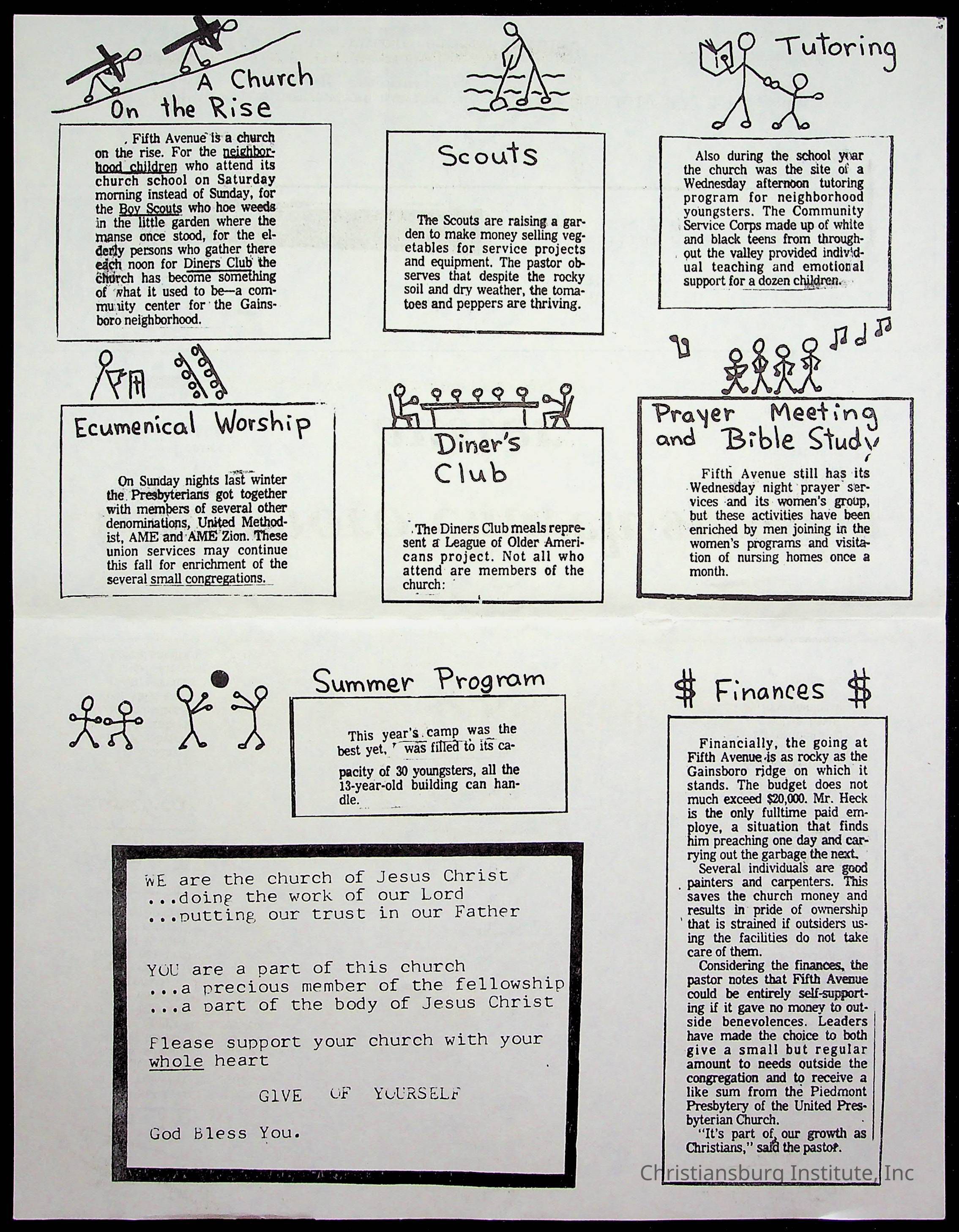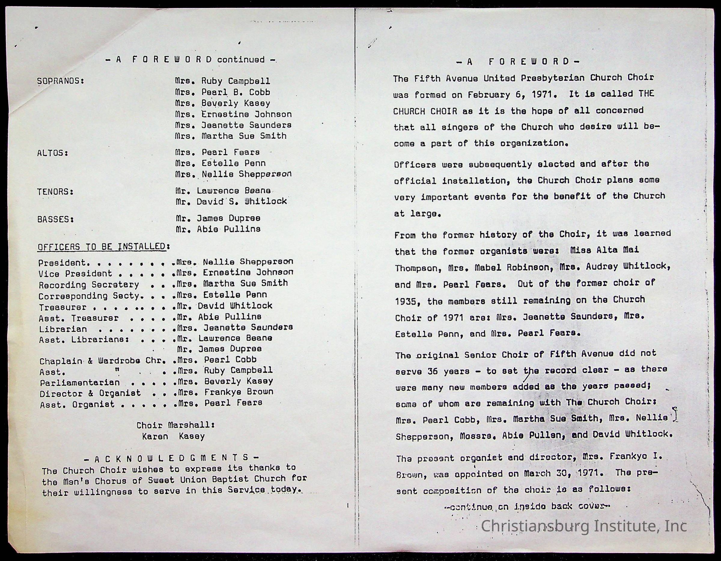 Copyright has been assigned to Christiansburg Institute Museum & Archives by Fifth Avenue Presbyterian Church. For permission to publish materials created by the donor, contact CIMA@christiansburginstitute.com. Materials not created by Fifth Avenue Presbyterian Church may still be under copyright.