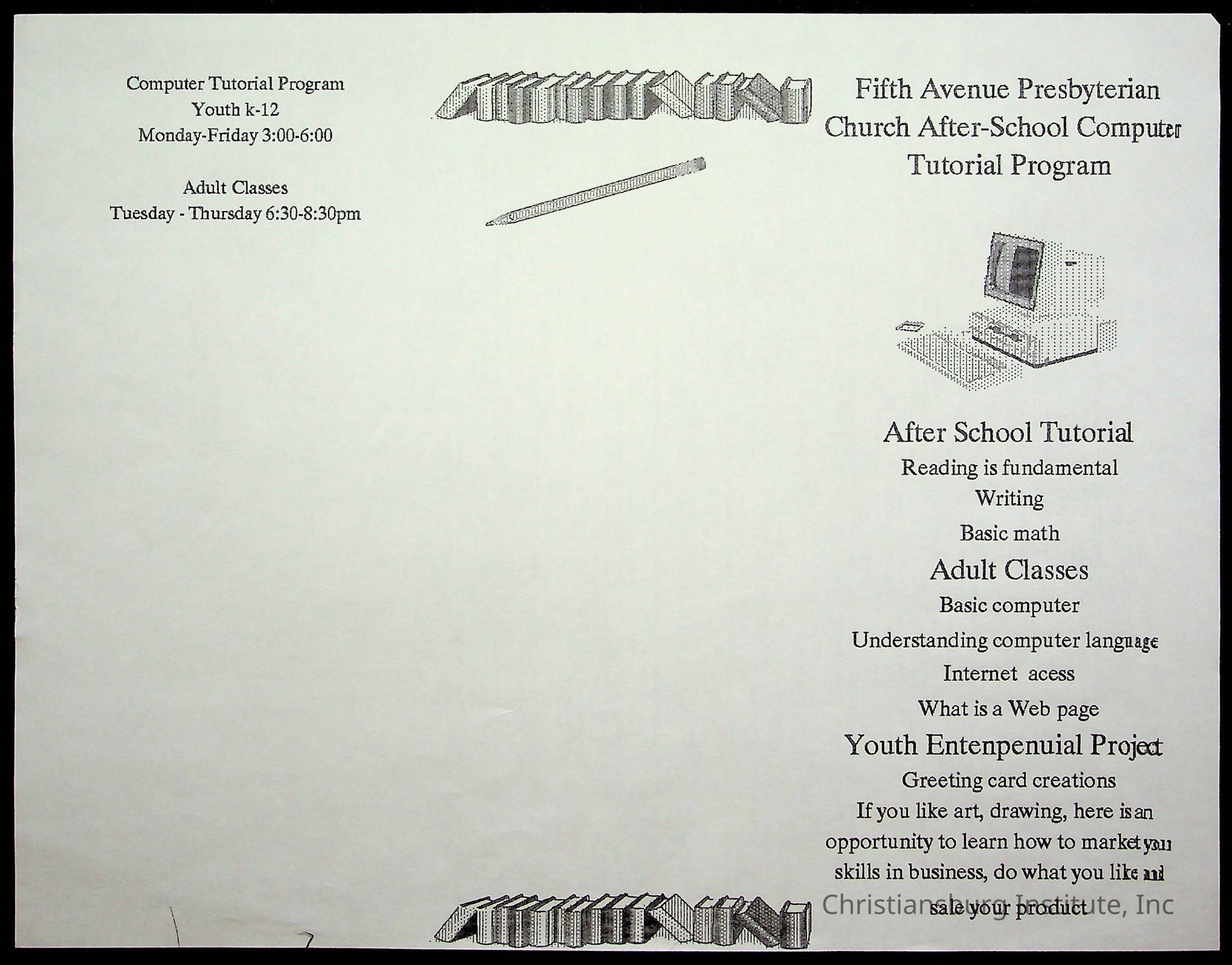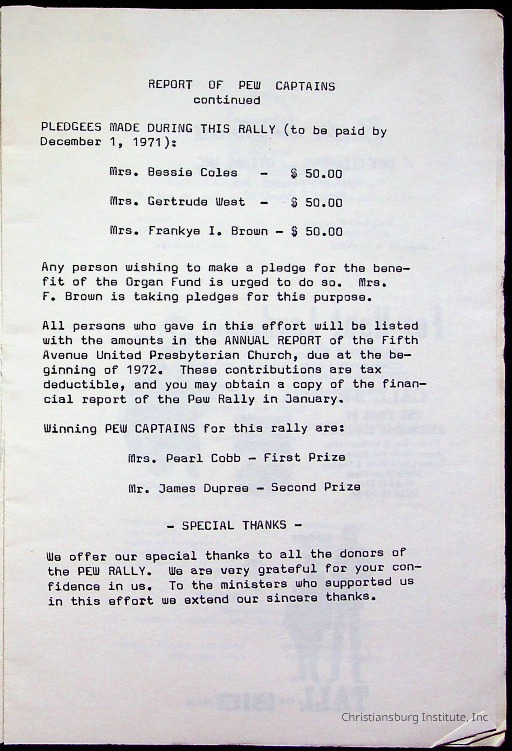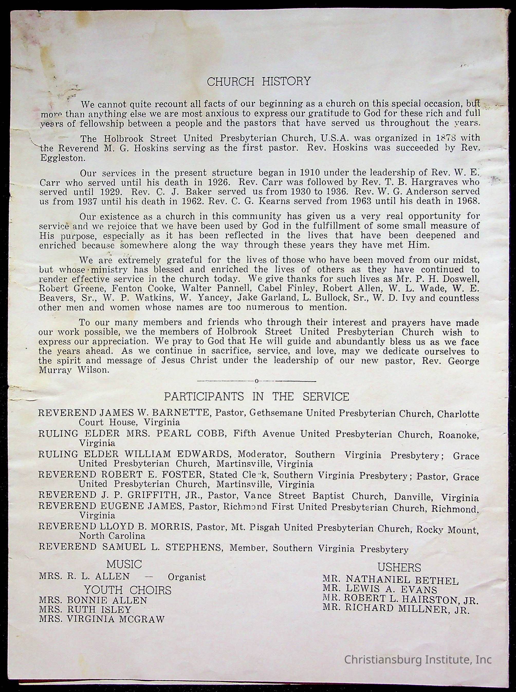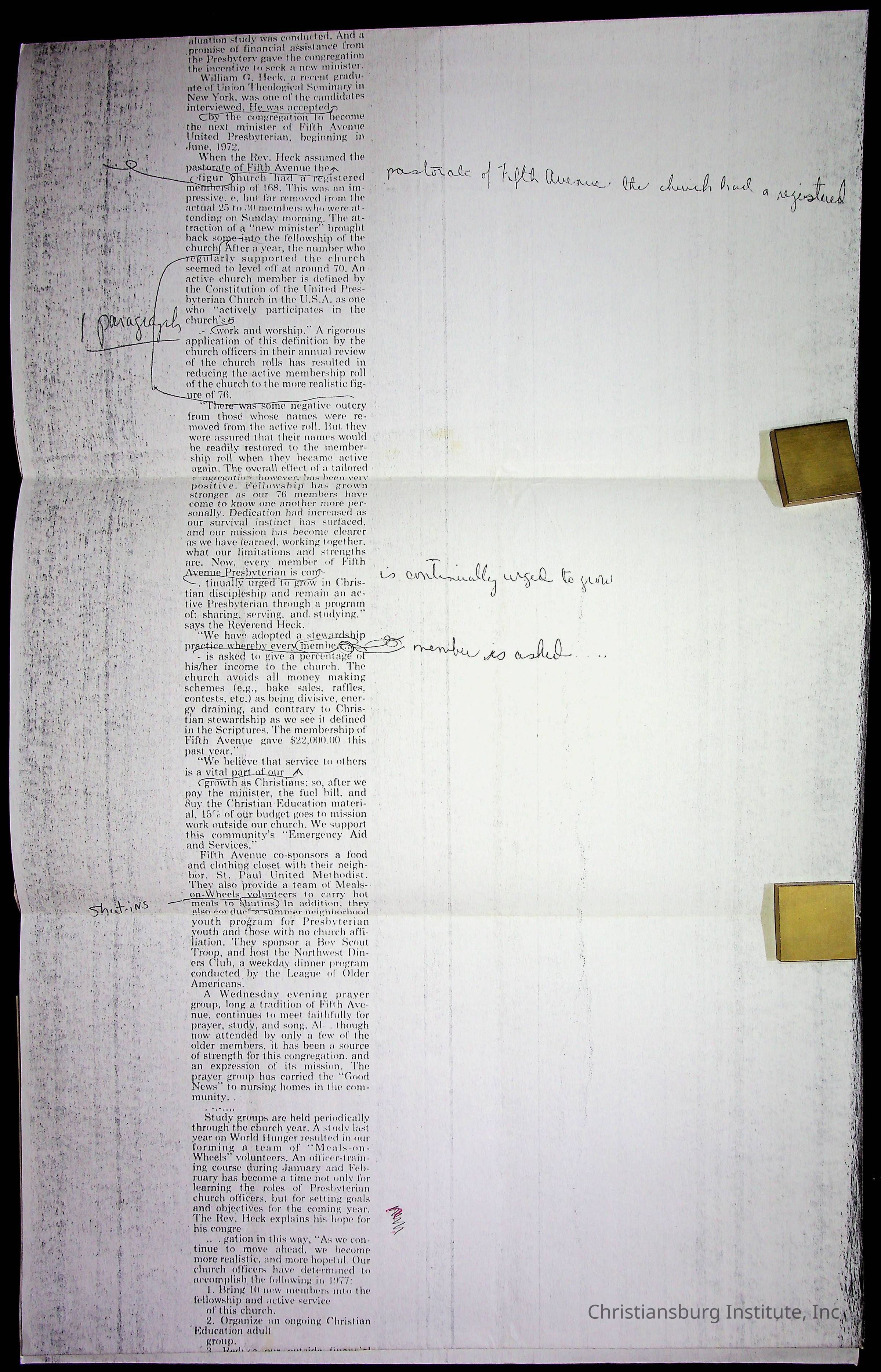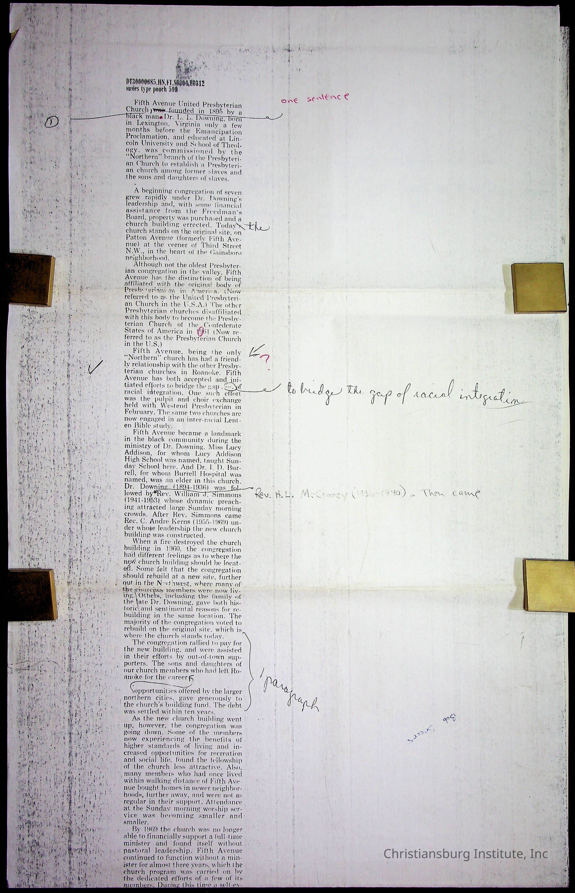 Copyright has been assigned to Christiansburg Institute Museum & Archives by Fifth Avenue Presbyterian Church. For permission to publish materials created by the donor, contact CIMA@christiansburginstitute.com. Materials not created by Fifth Avenue Presbyterian Church may still be under copyright.