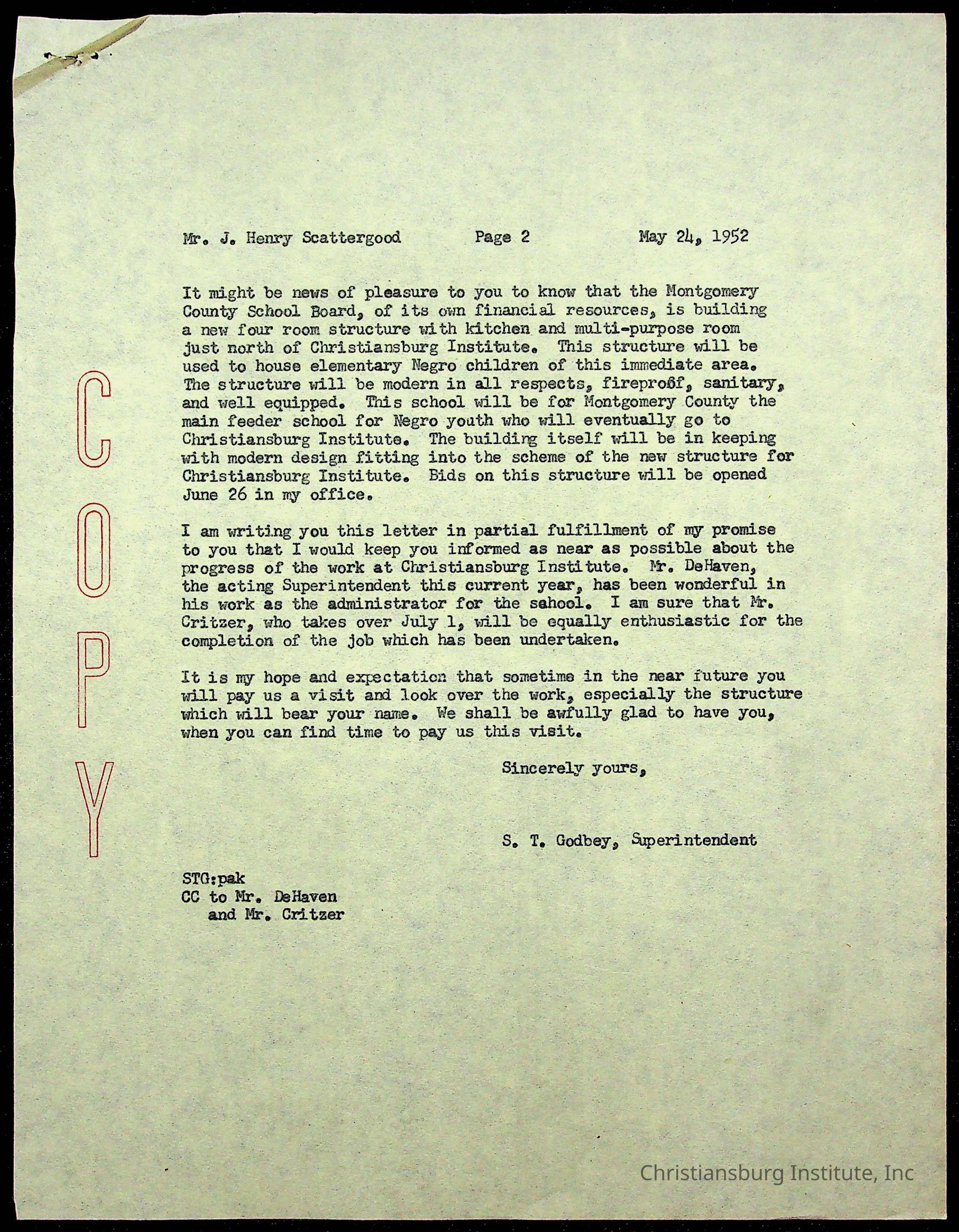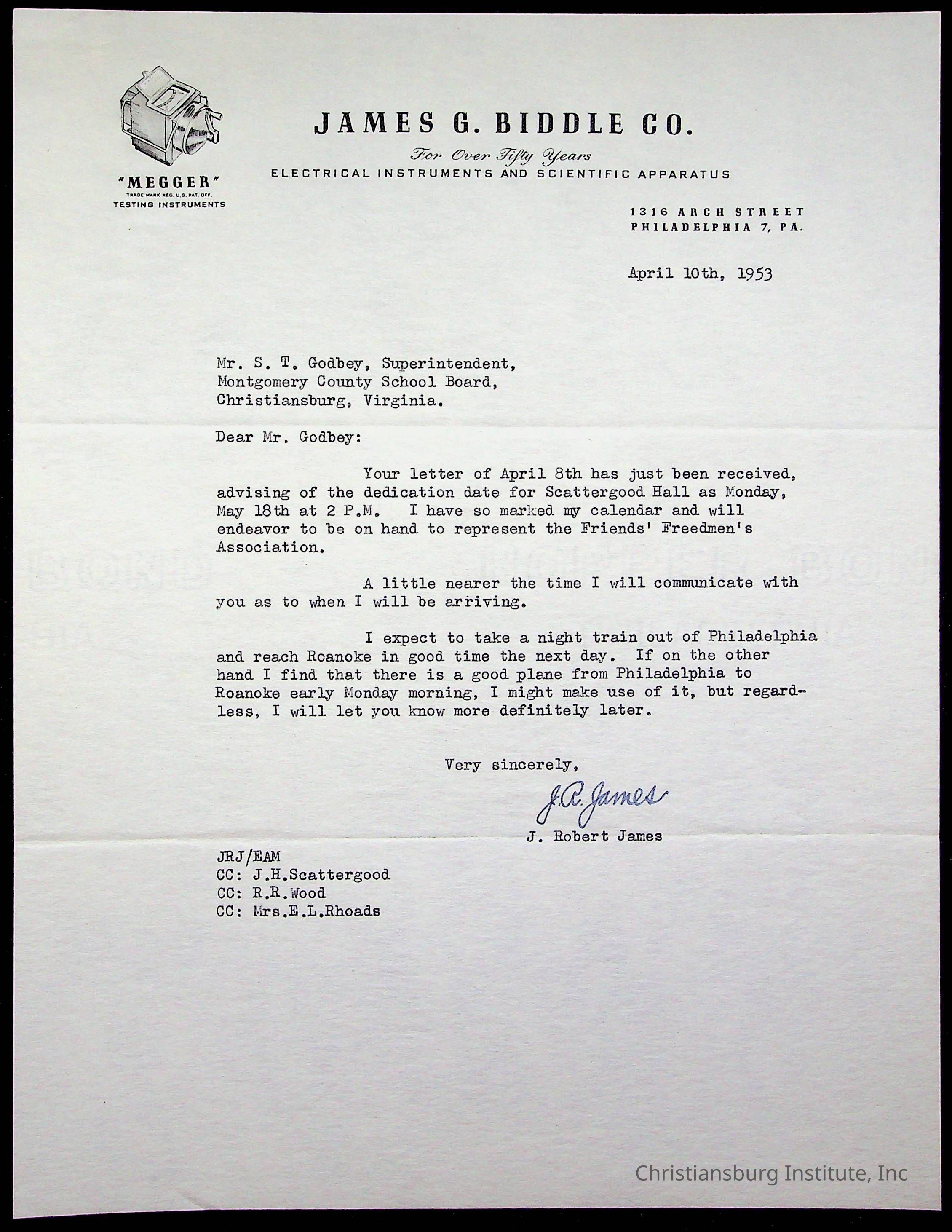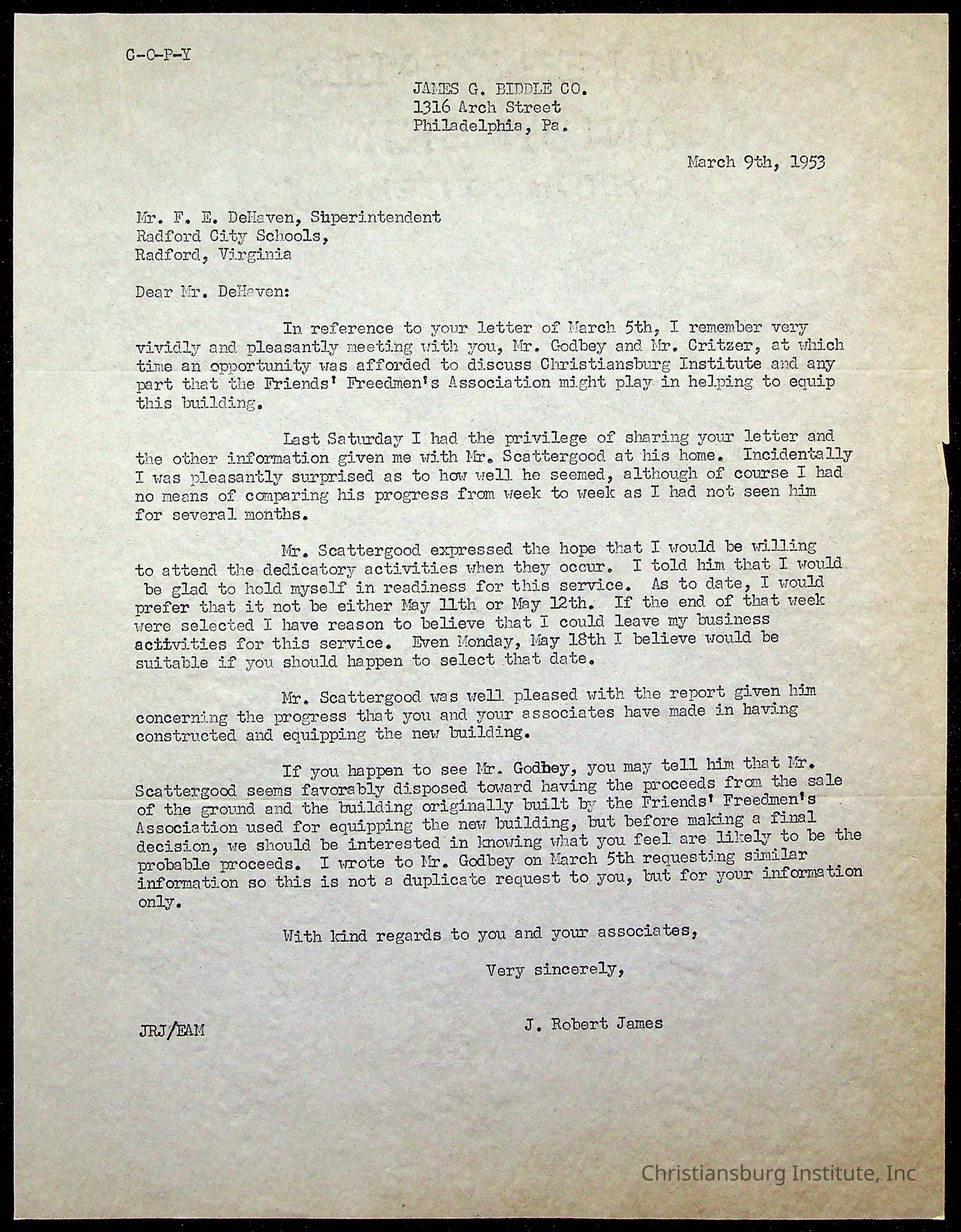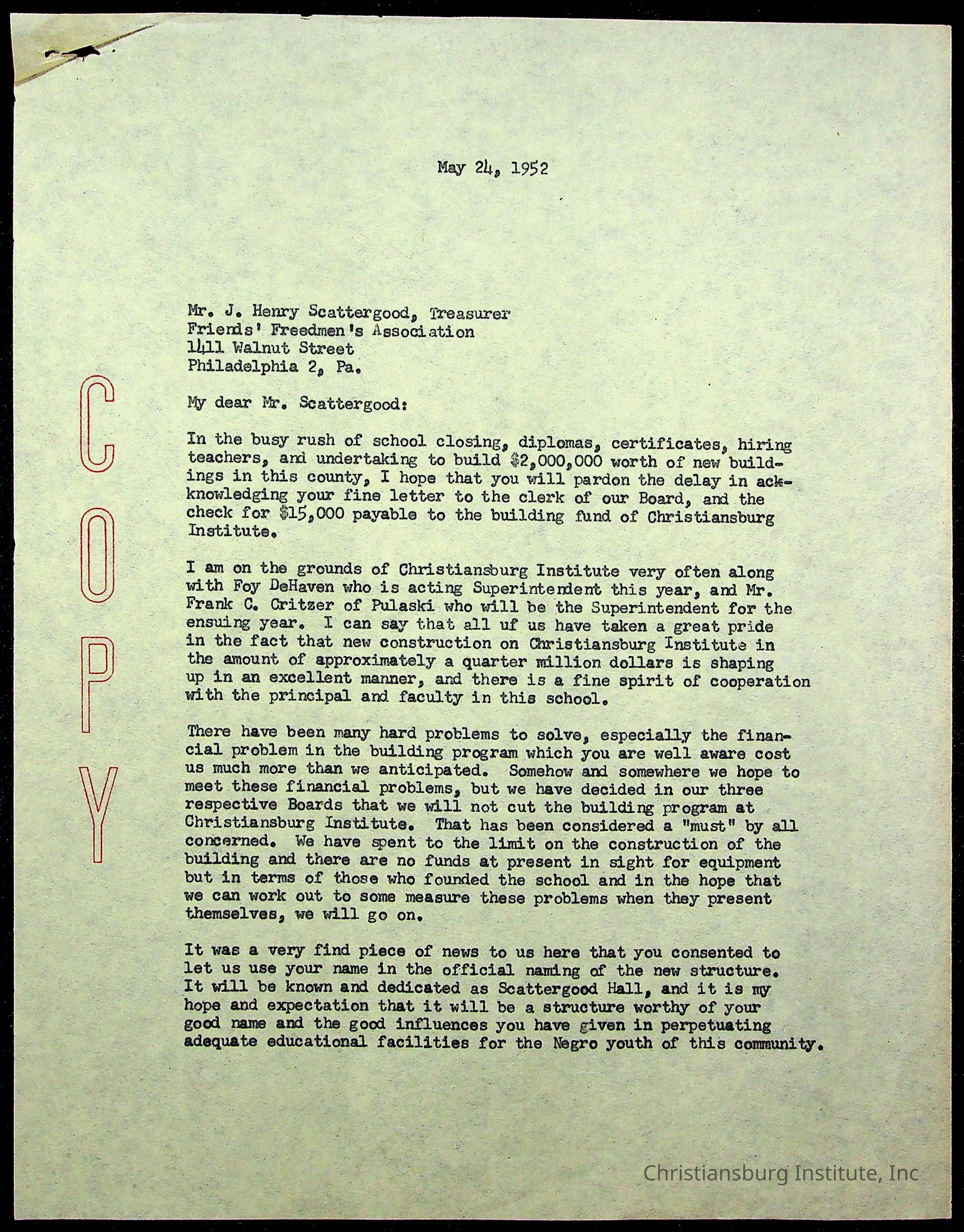 An archive of correspondence relating to Scattergood Hall at Christiansburg Institute, circa 1950s.