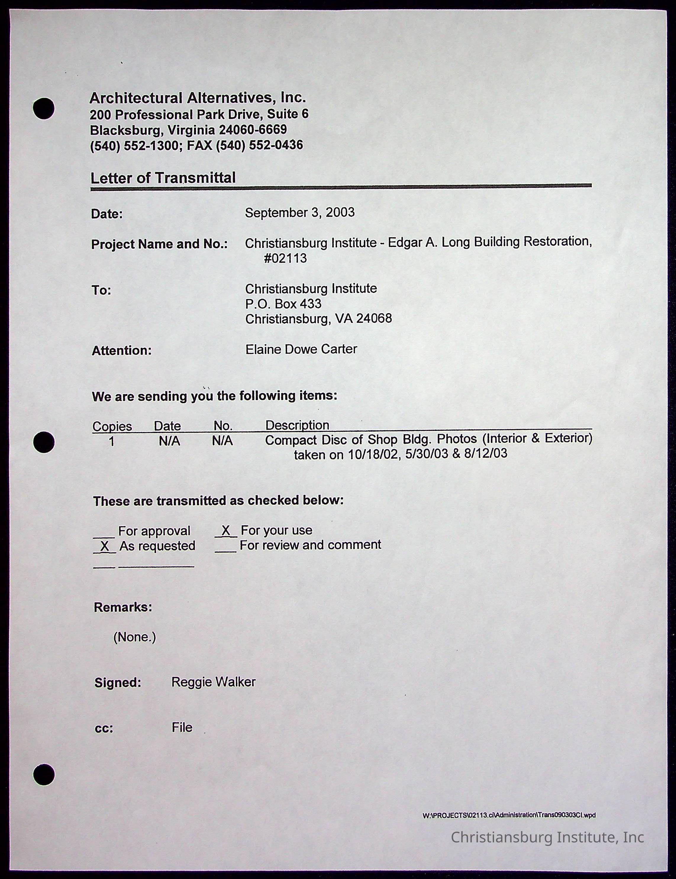 A collection of photographs of the shop building on the historic Christiansburg Institute campus taken by Architectural Alternatives in 2003.Creator