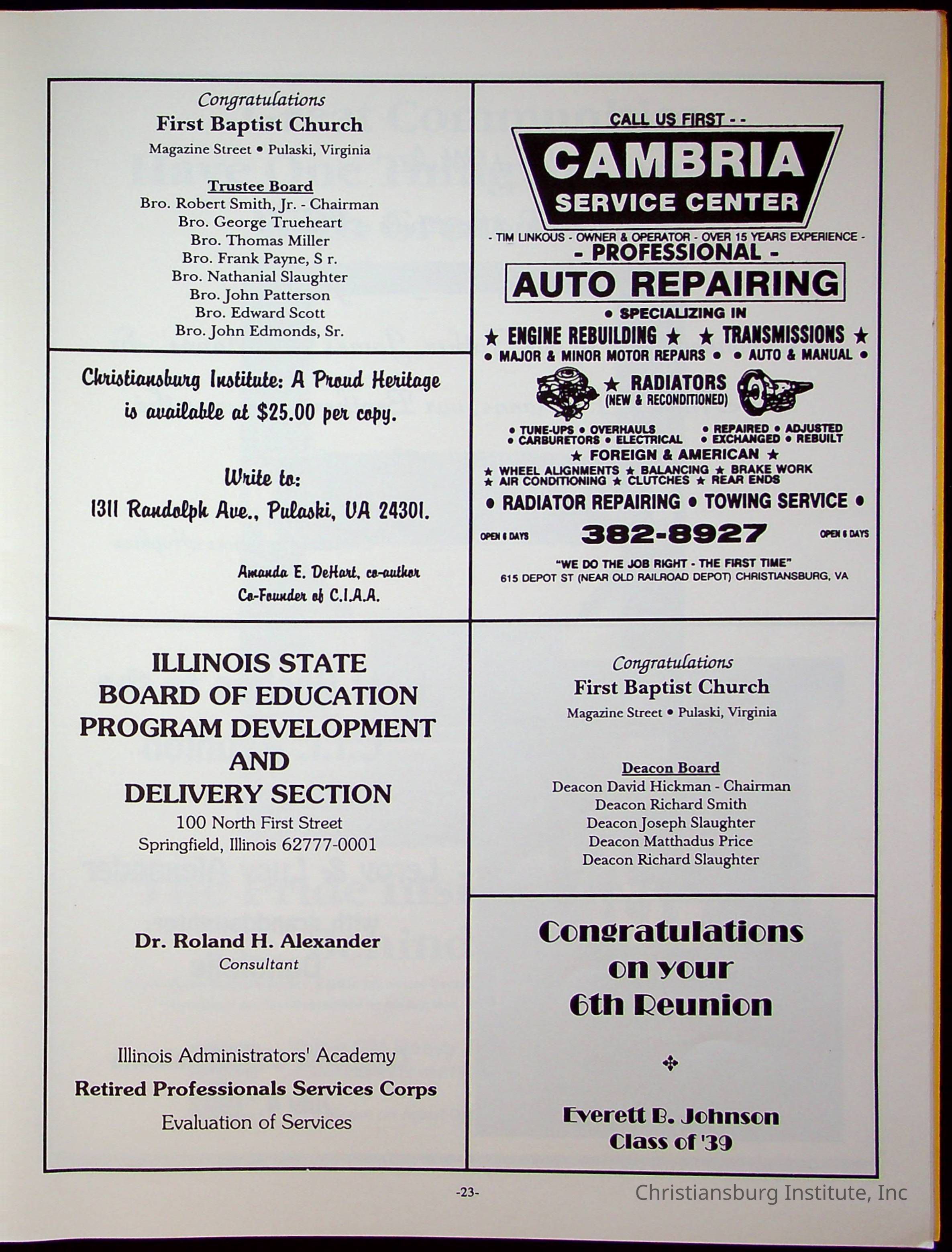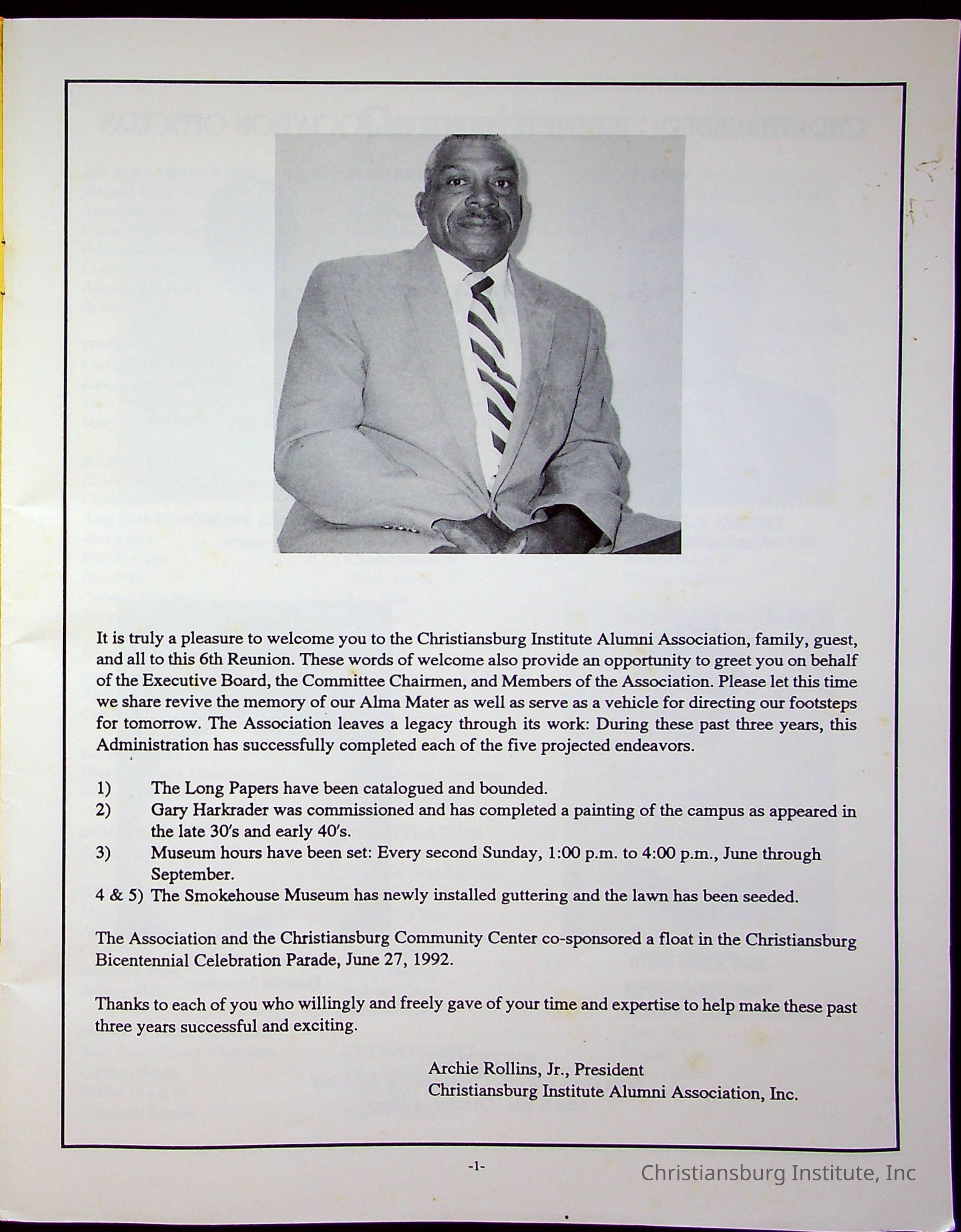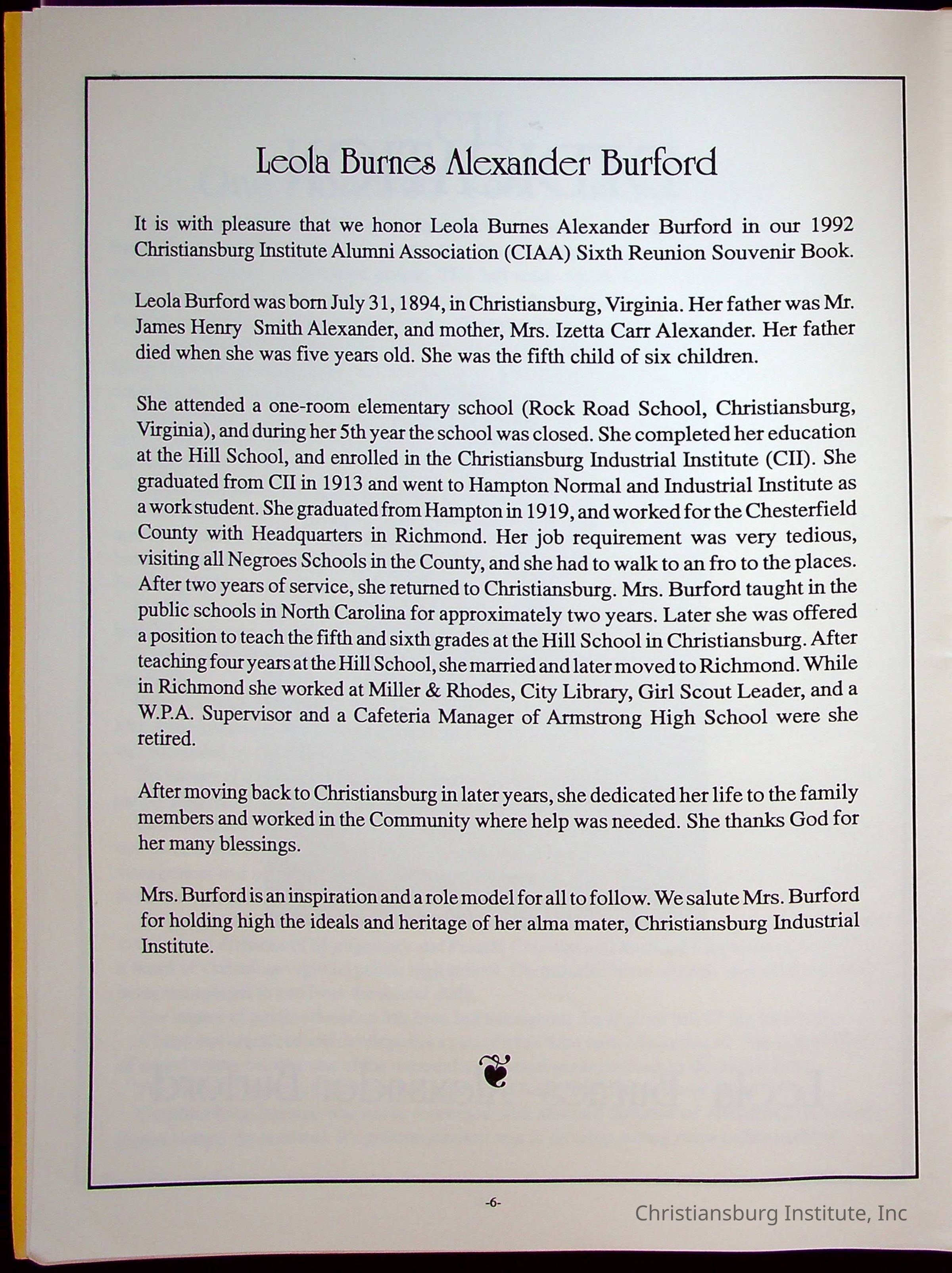 Sixth Reunion Booklet Christiansburg Institute, 1992Description