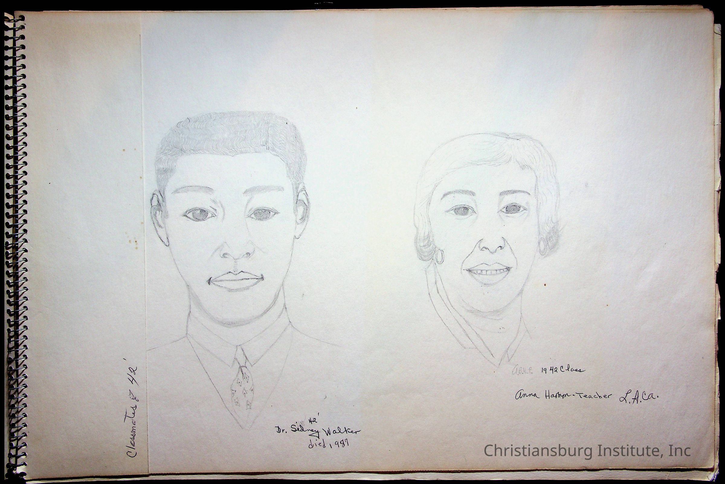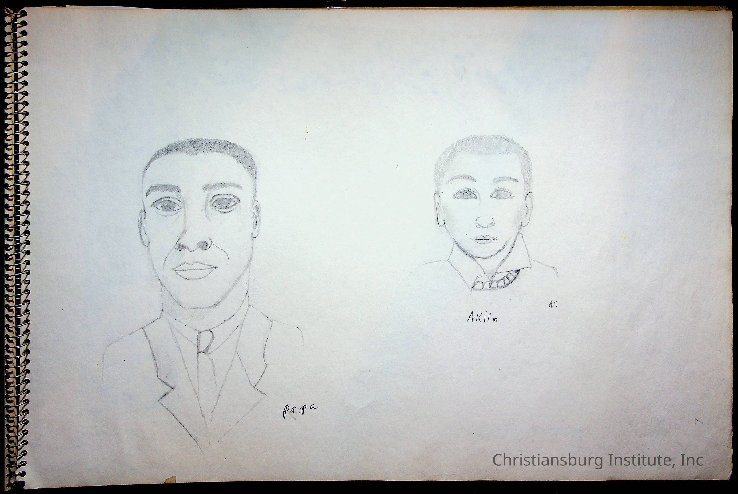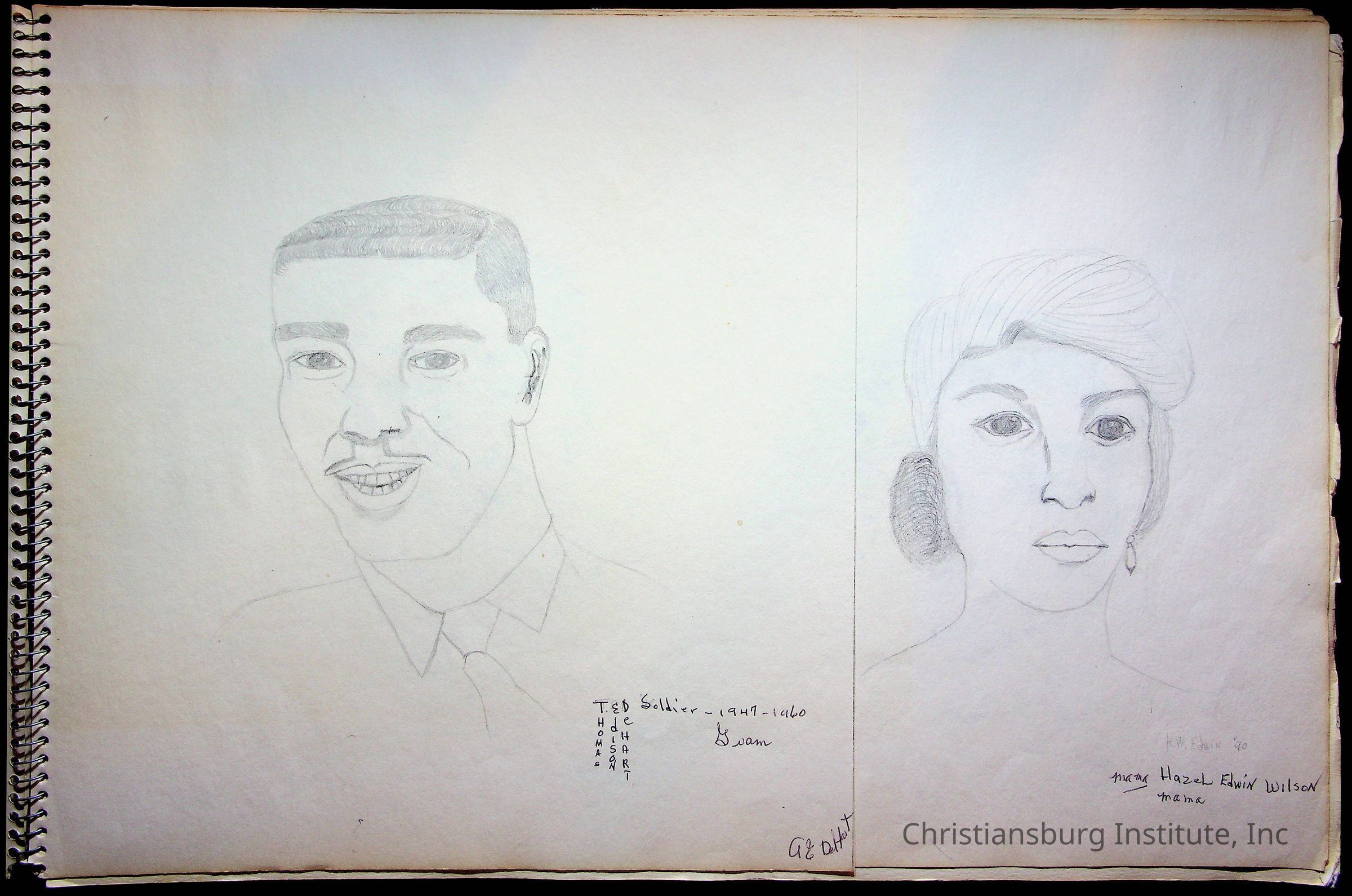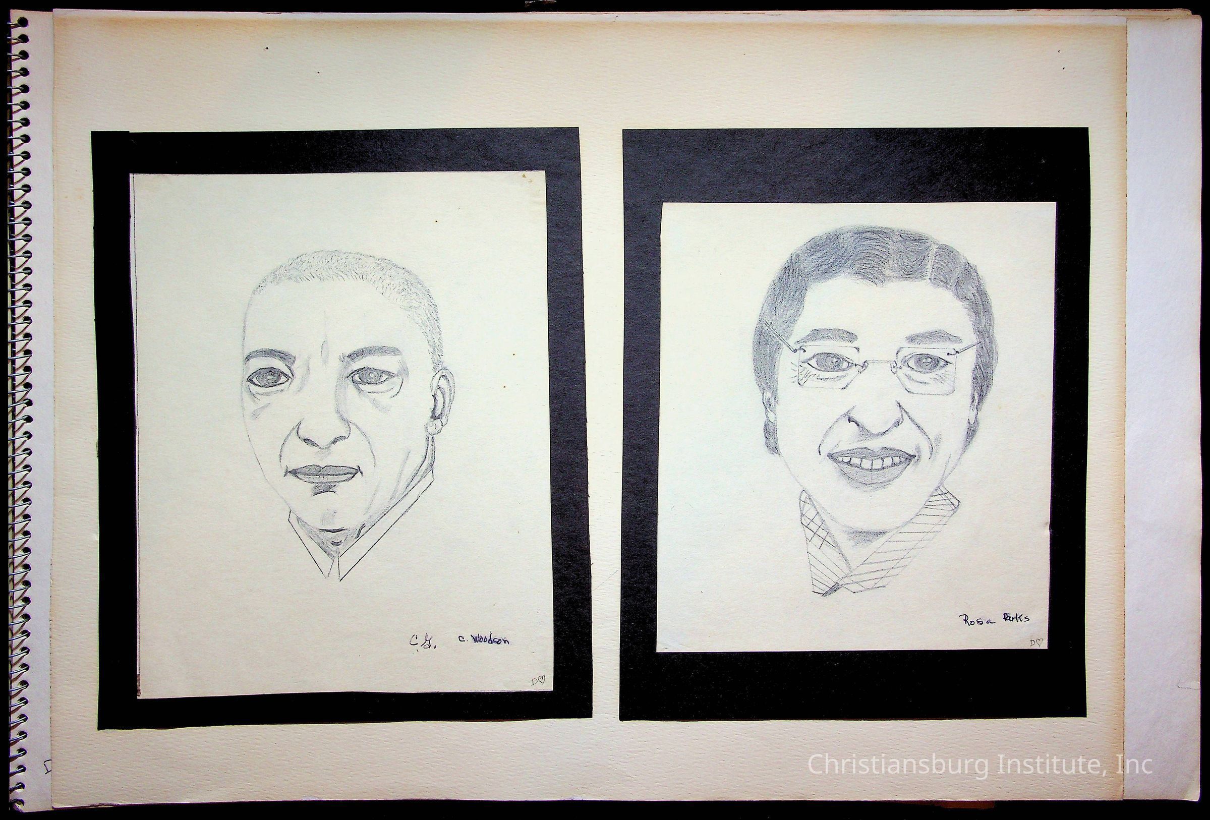 A sketchbook filled with mixed media of different people, including sketches and photographs drawn and compiled by Amanda DeHart, undated.Collection