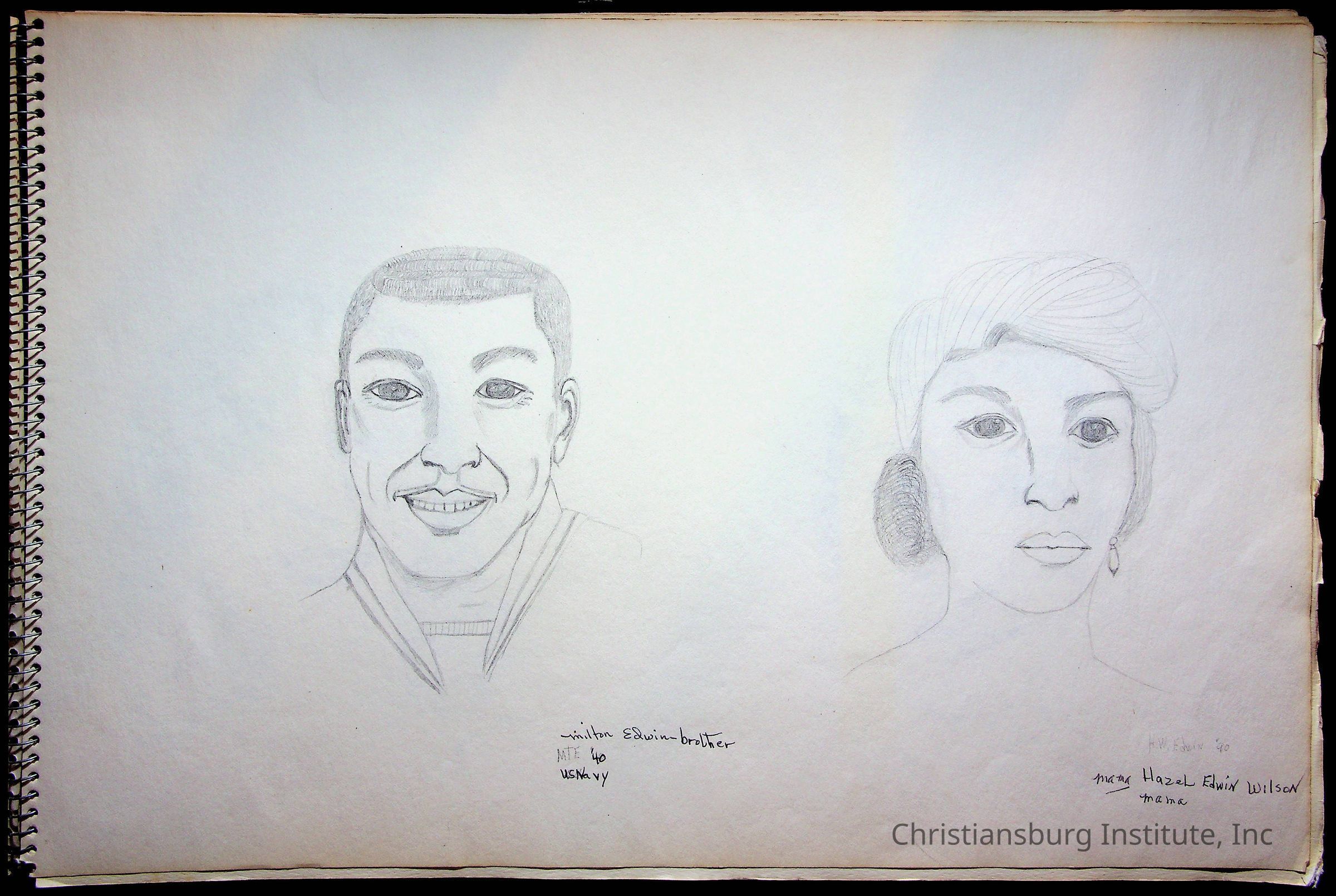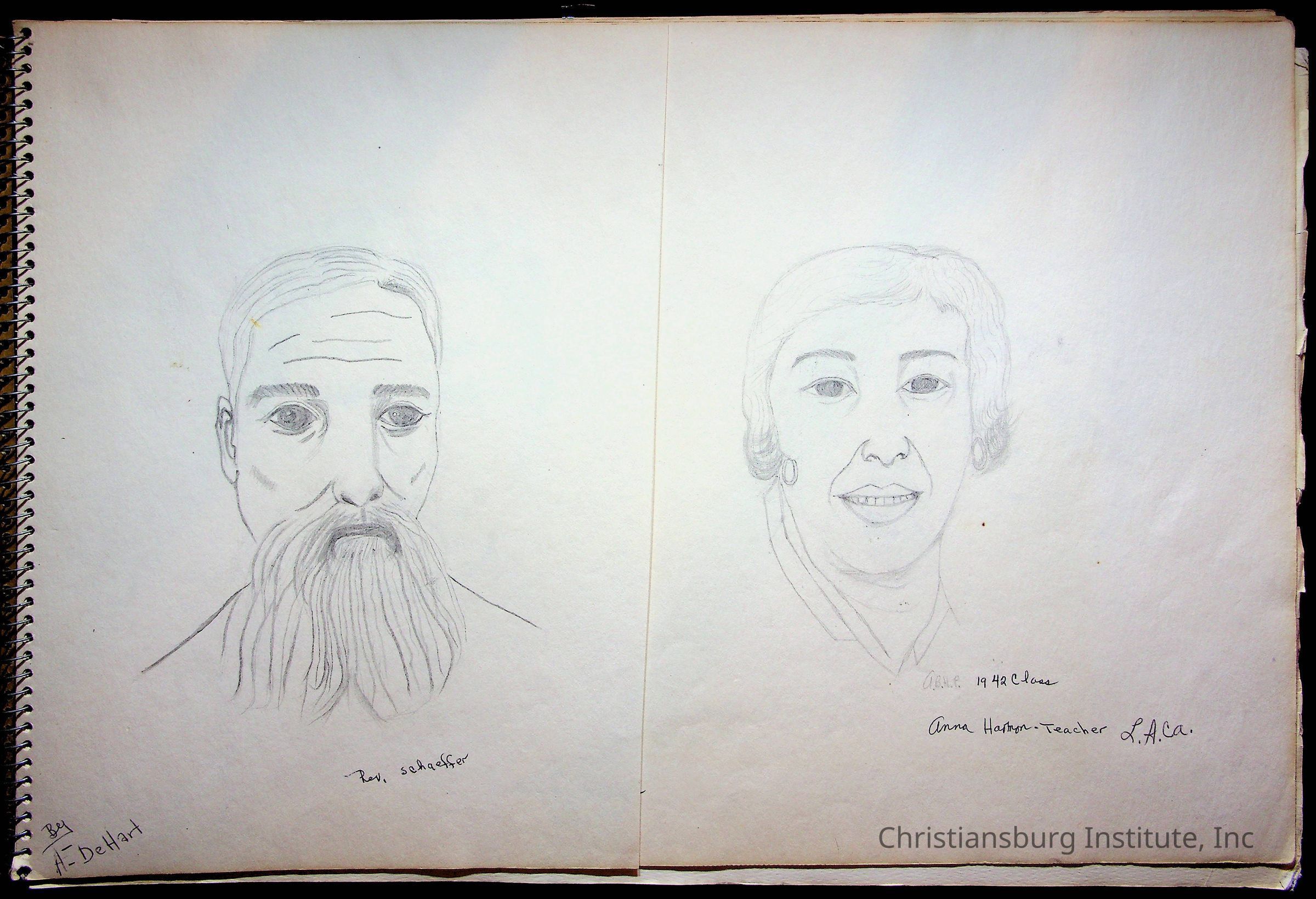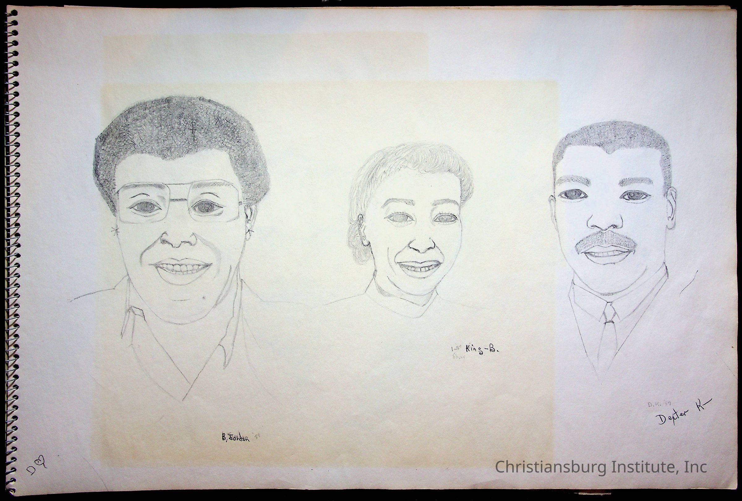 A sketchbook filled with mixed media of different people, including sketches and photographs drawn and compiled by Amanda DeHart, undated.Collection