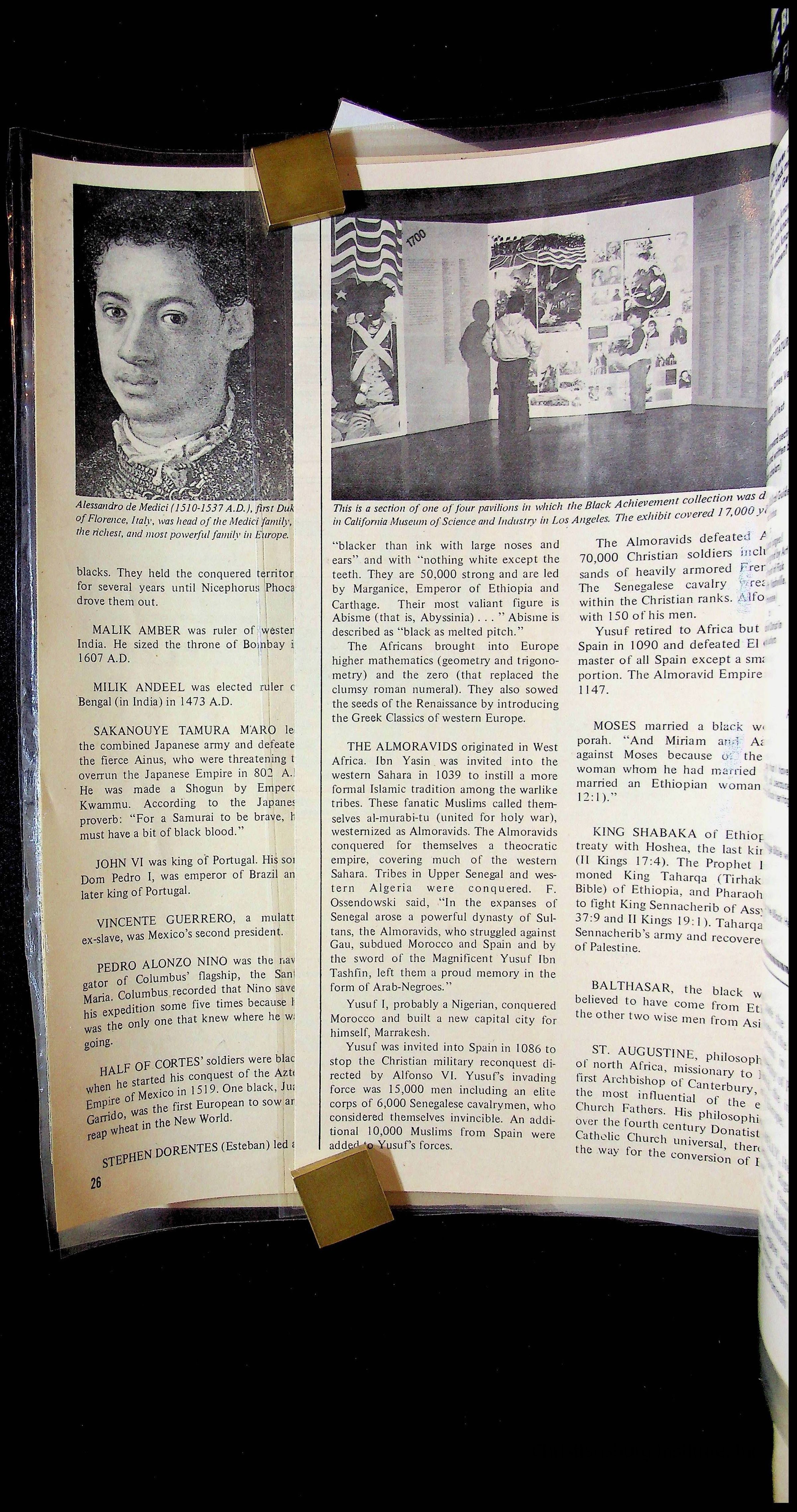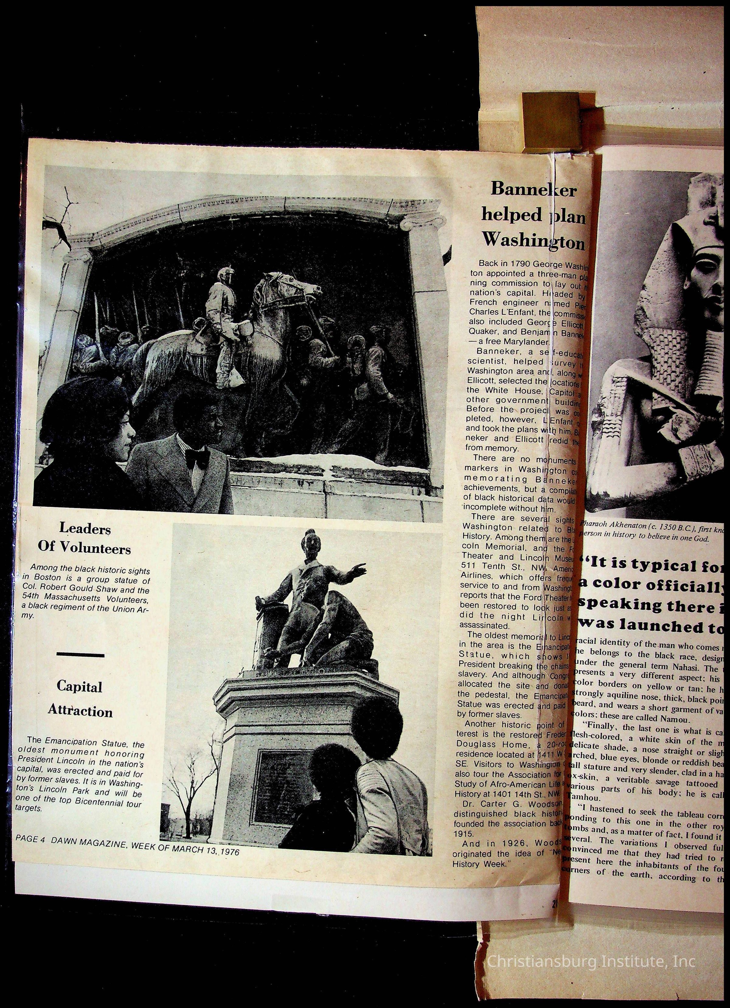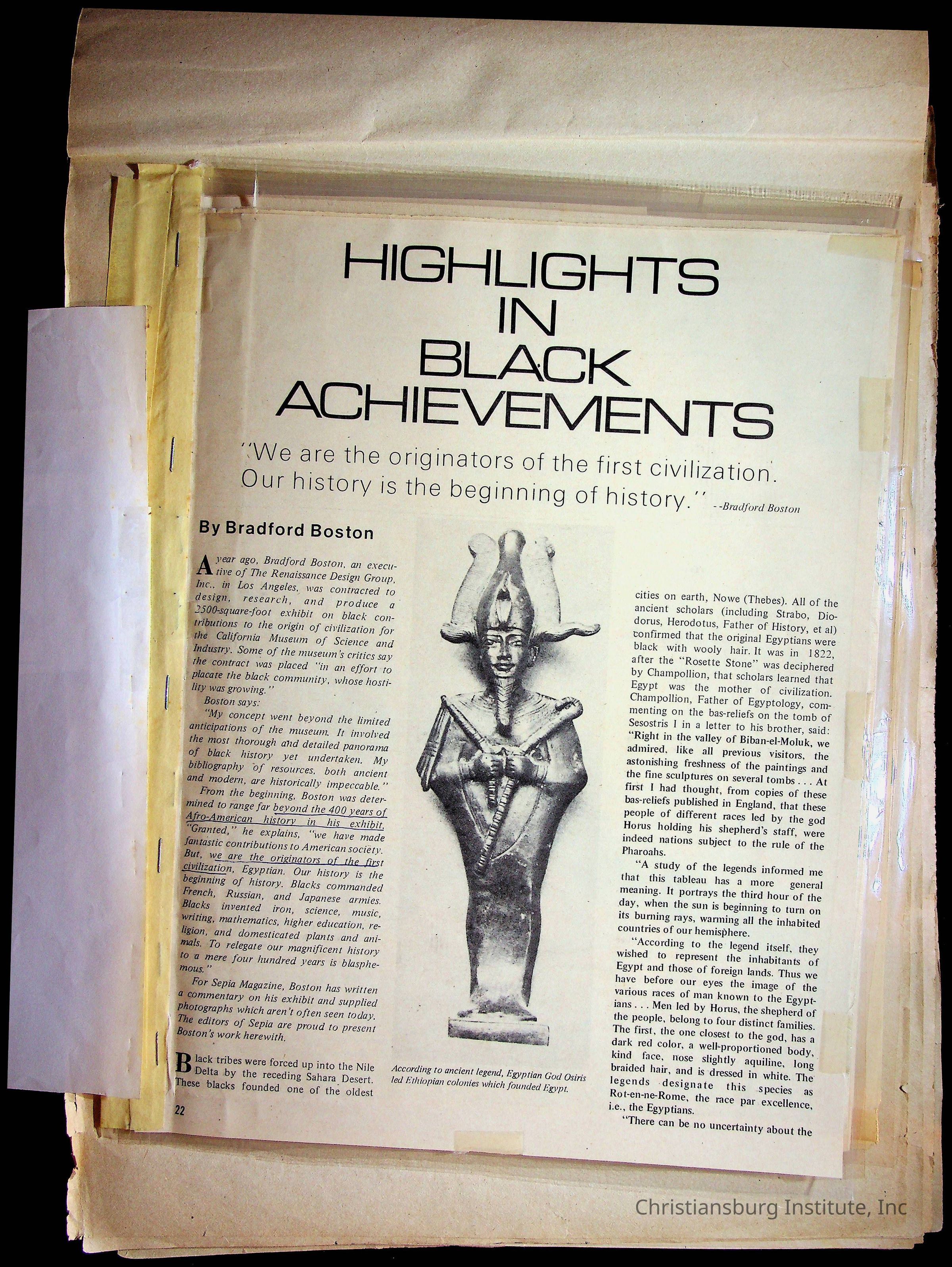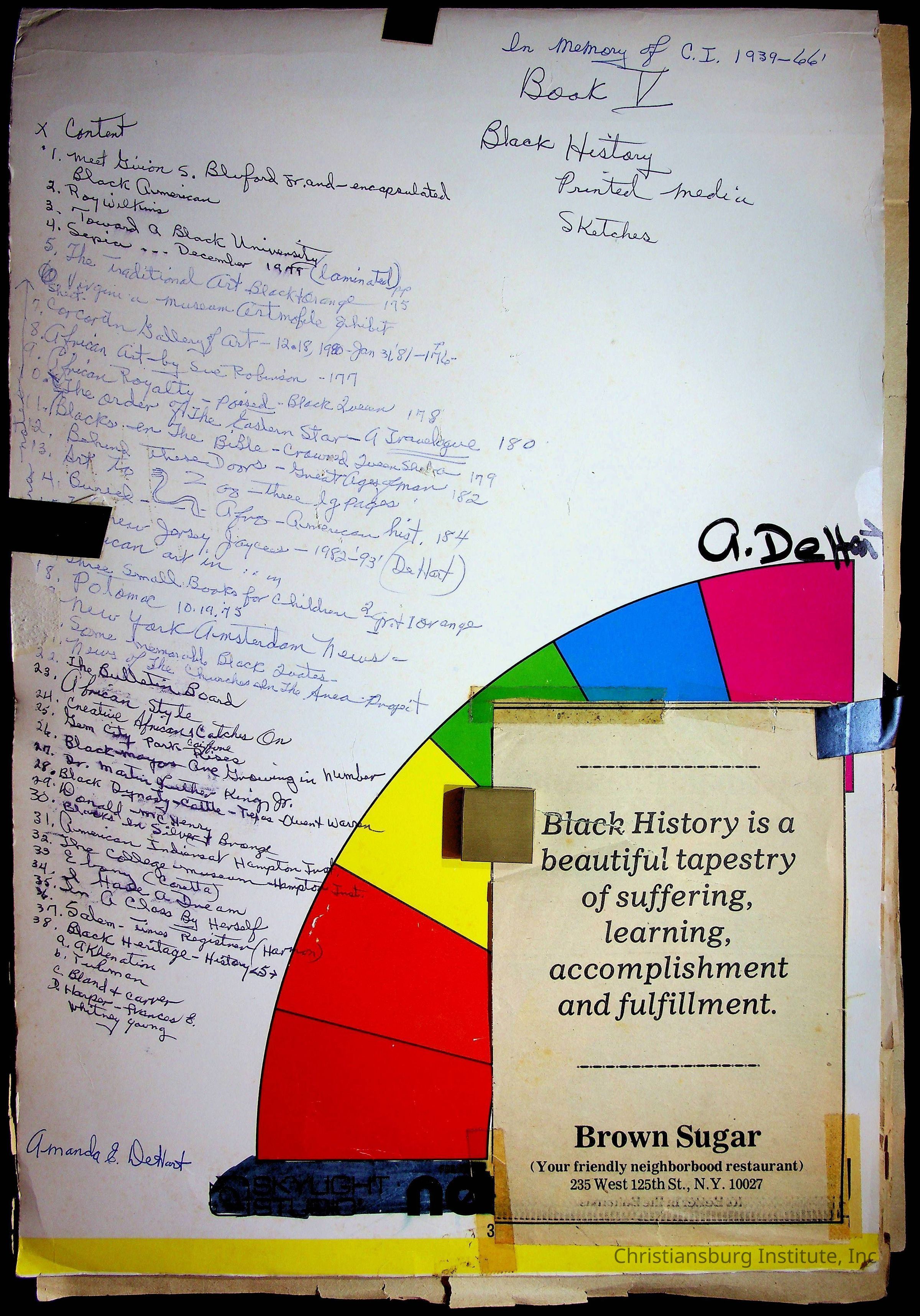 A sketchbook filled with mixed media about Black history, including sketches, photographs, and media clippings drawn and compiled by Amanda DeHart, undated.Collection
