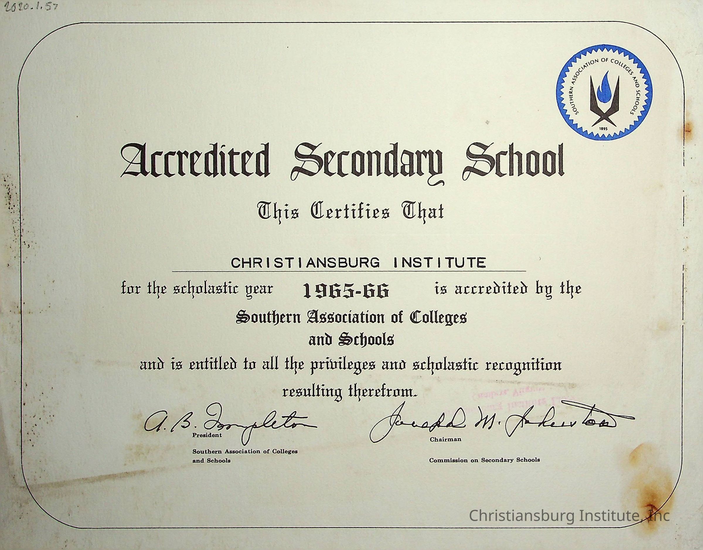 Southern Association (accreditation certificate), 1965-1966Description