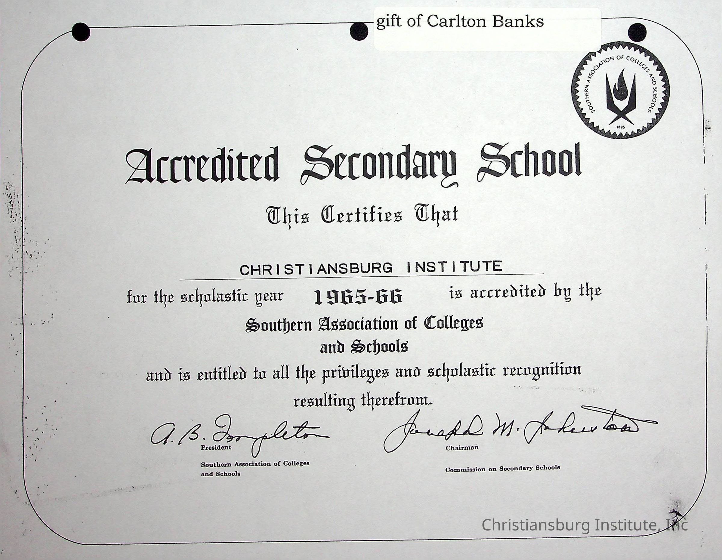 A photocopy version of the Southern Association (accreditation certificate) for Christiansburg Institute from 1965-1966. Gifted by Carlton Banks in 2001.Creator