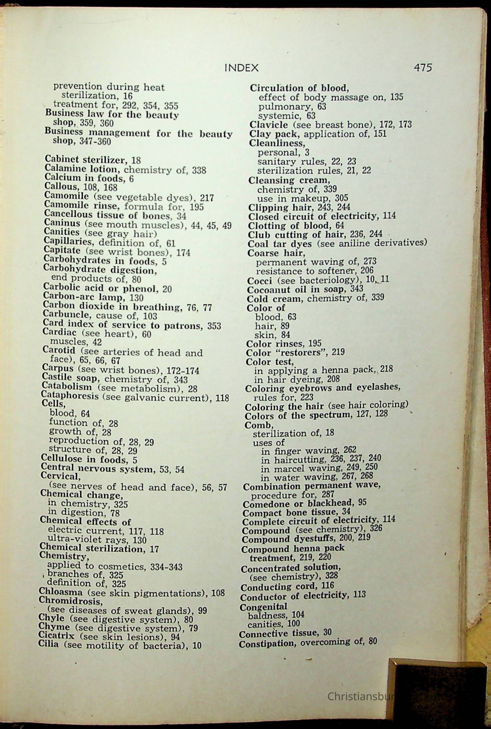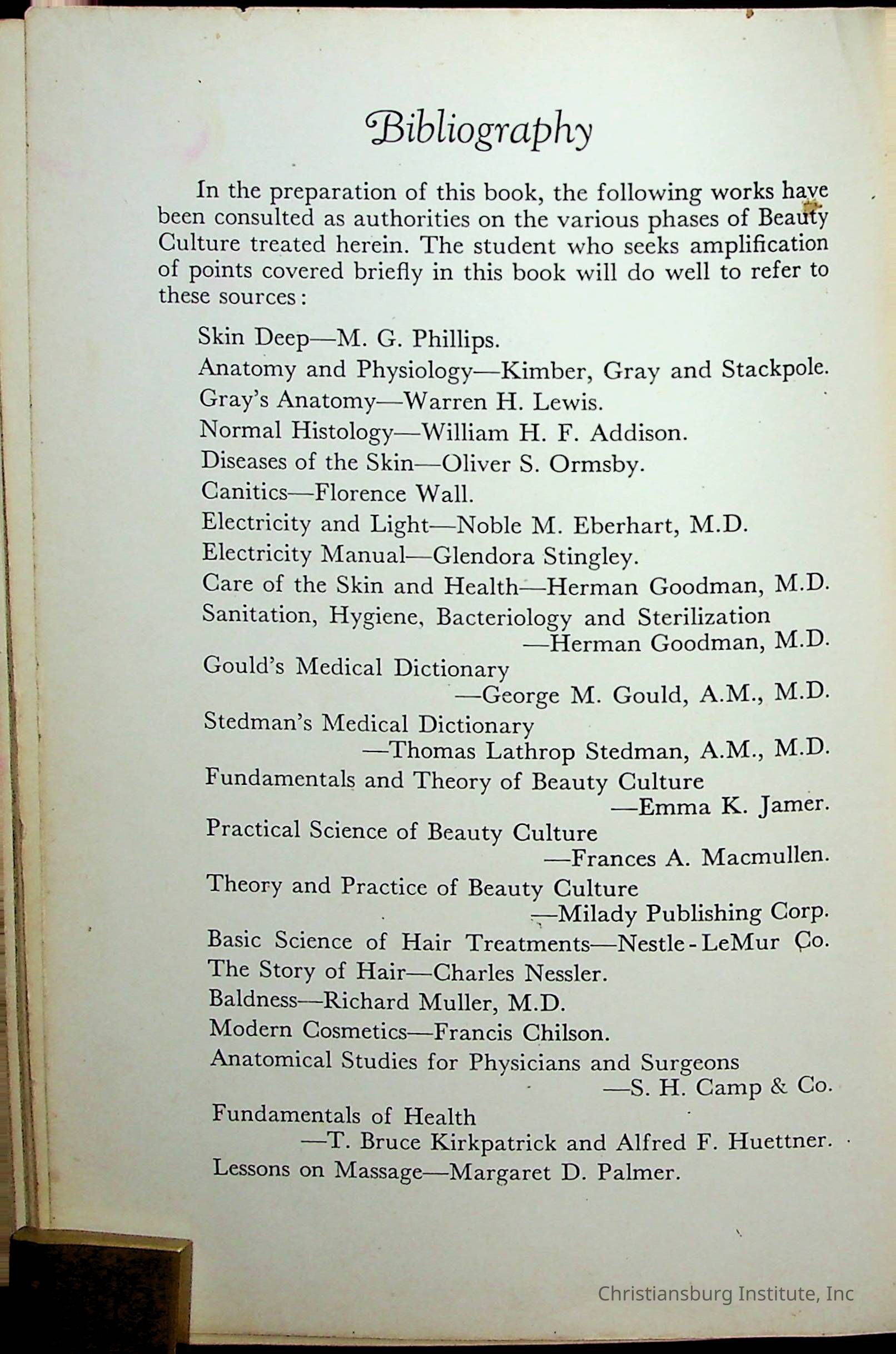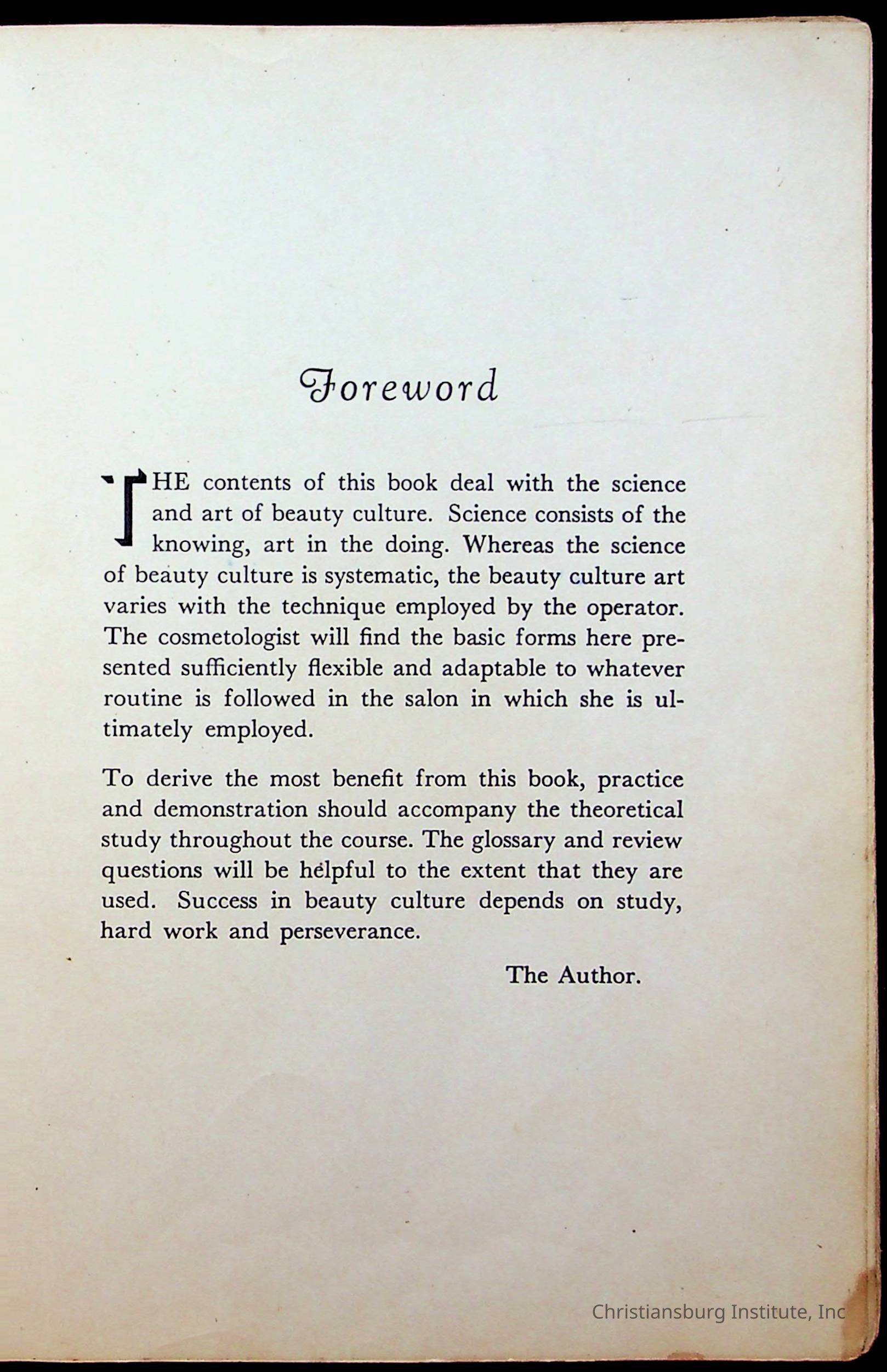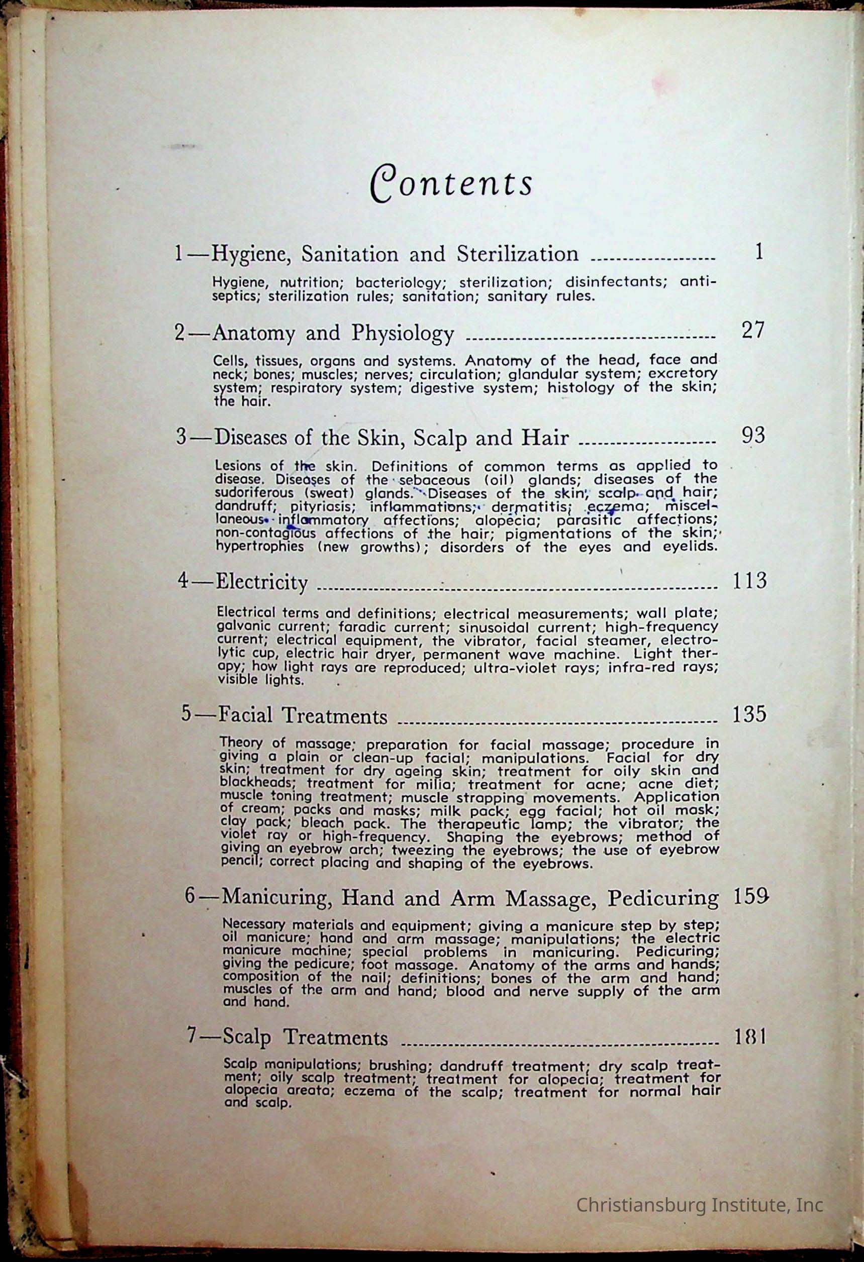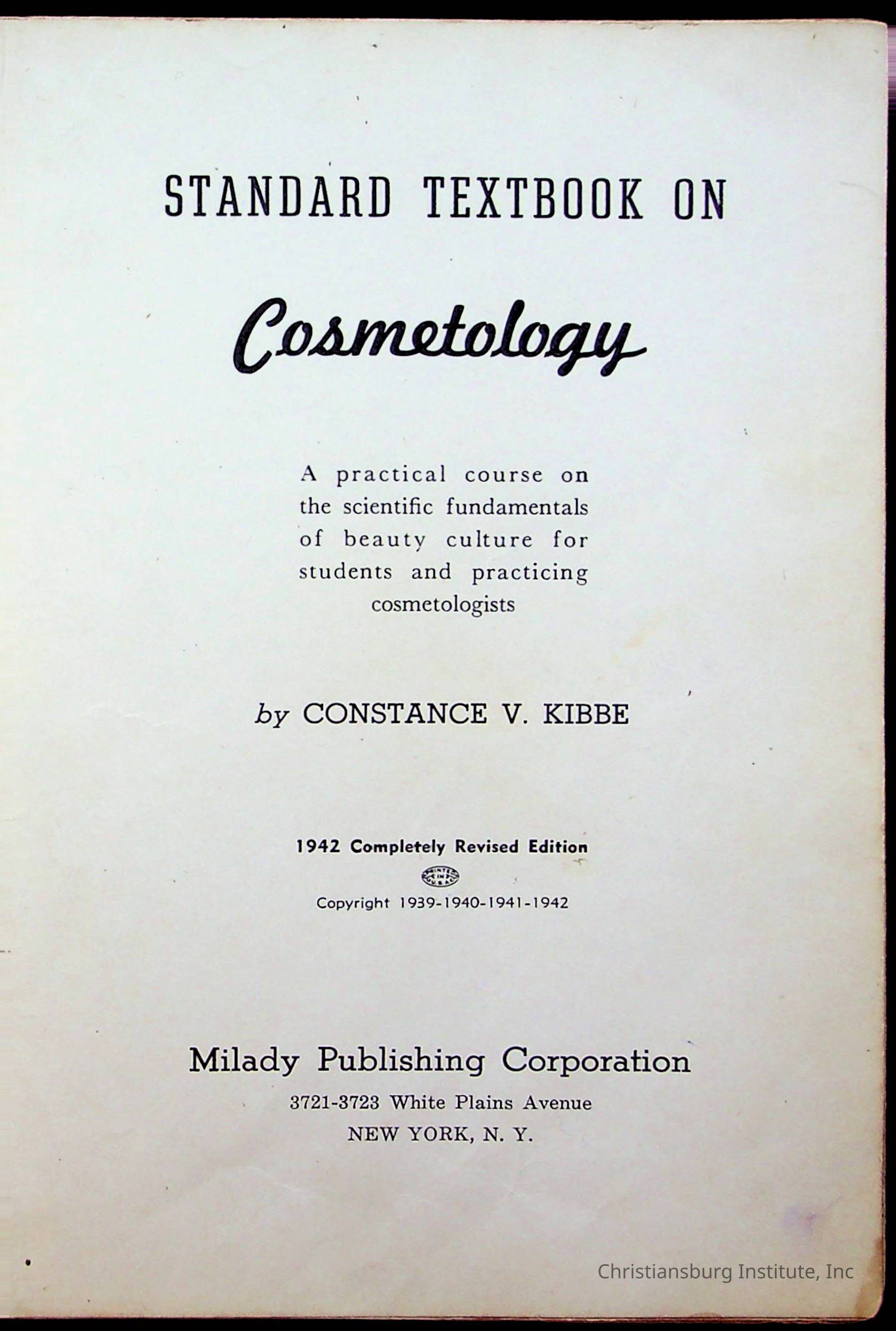A revised version of the textbook titled, "Standard Textbook on Cosmetology" written by Constance V. Kibbe and published in the year 1942. This copy was owned by CII student, Amanda Edwin (later Amanda DeHart).Collection