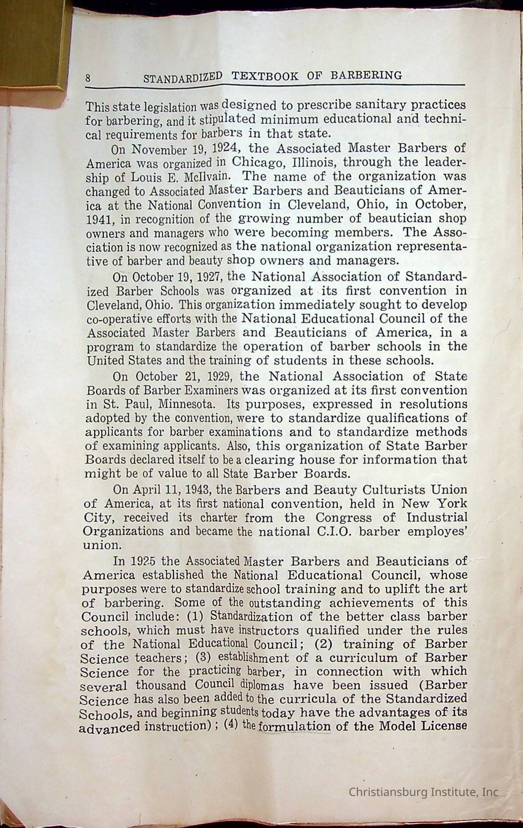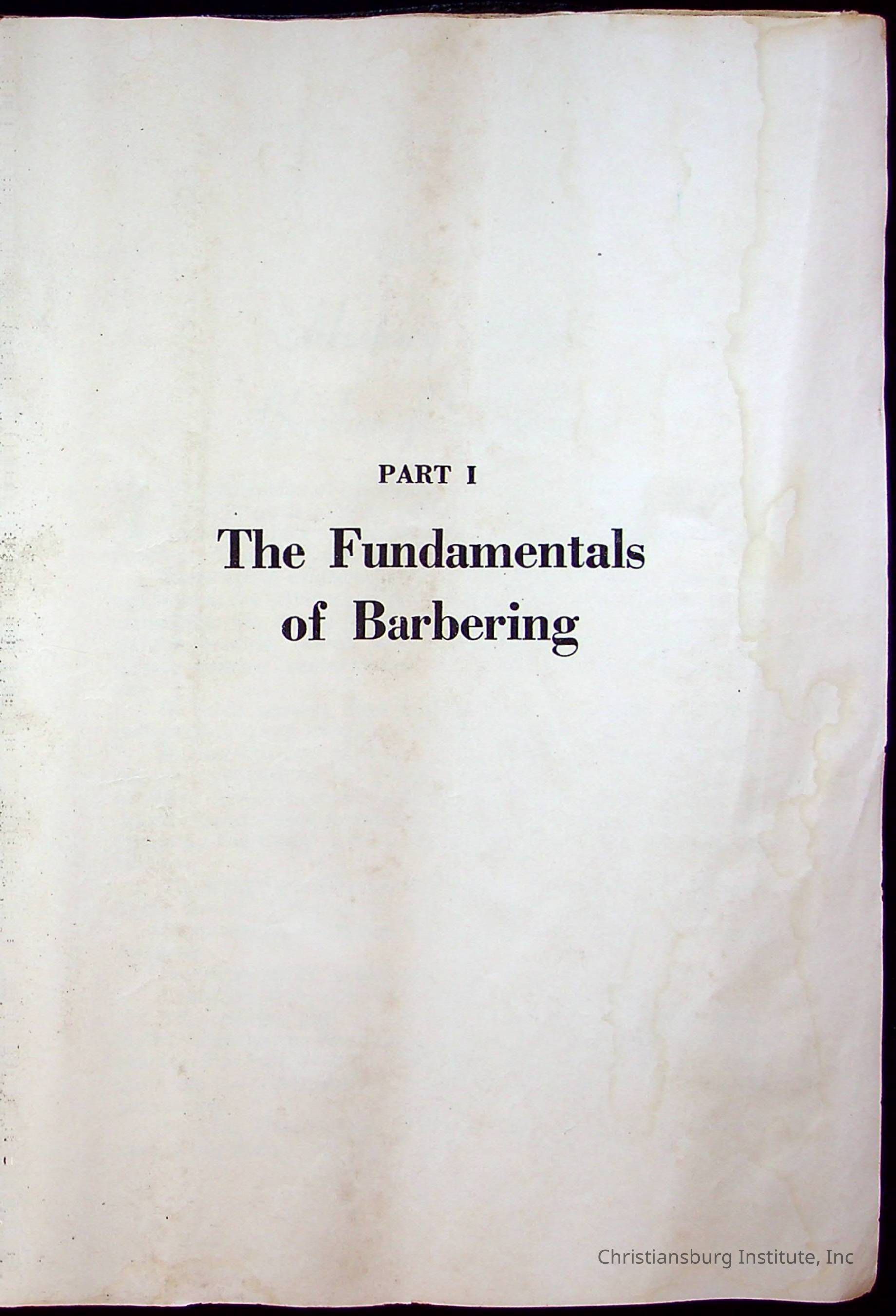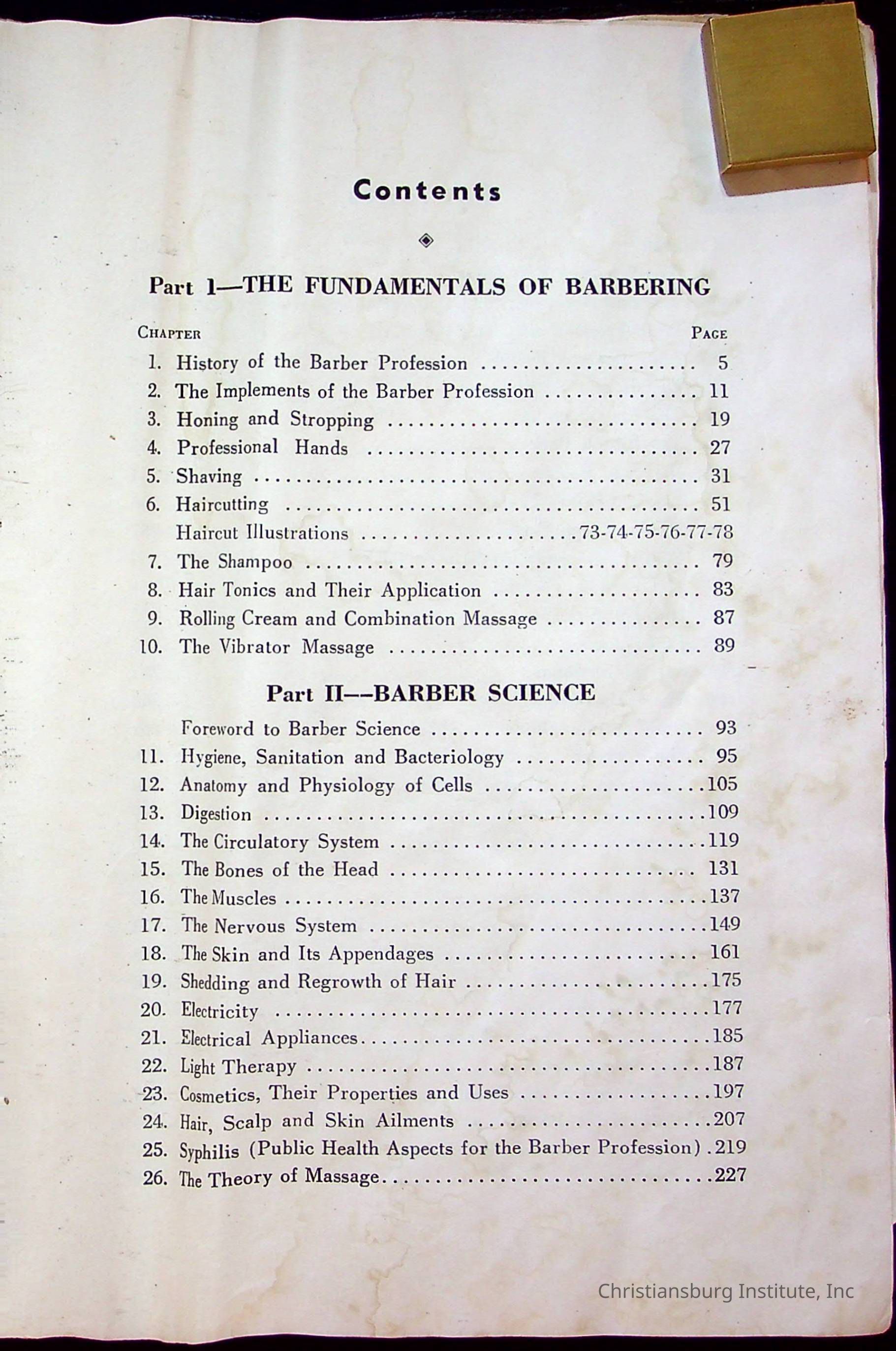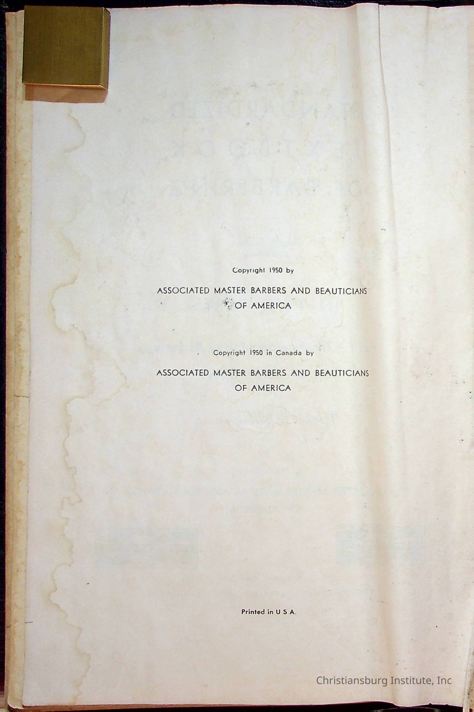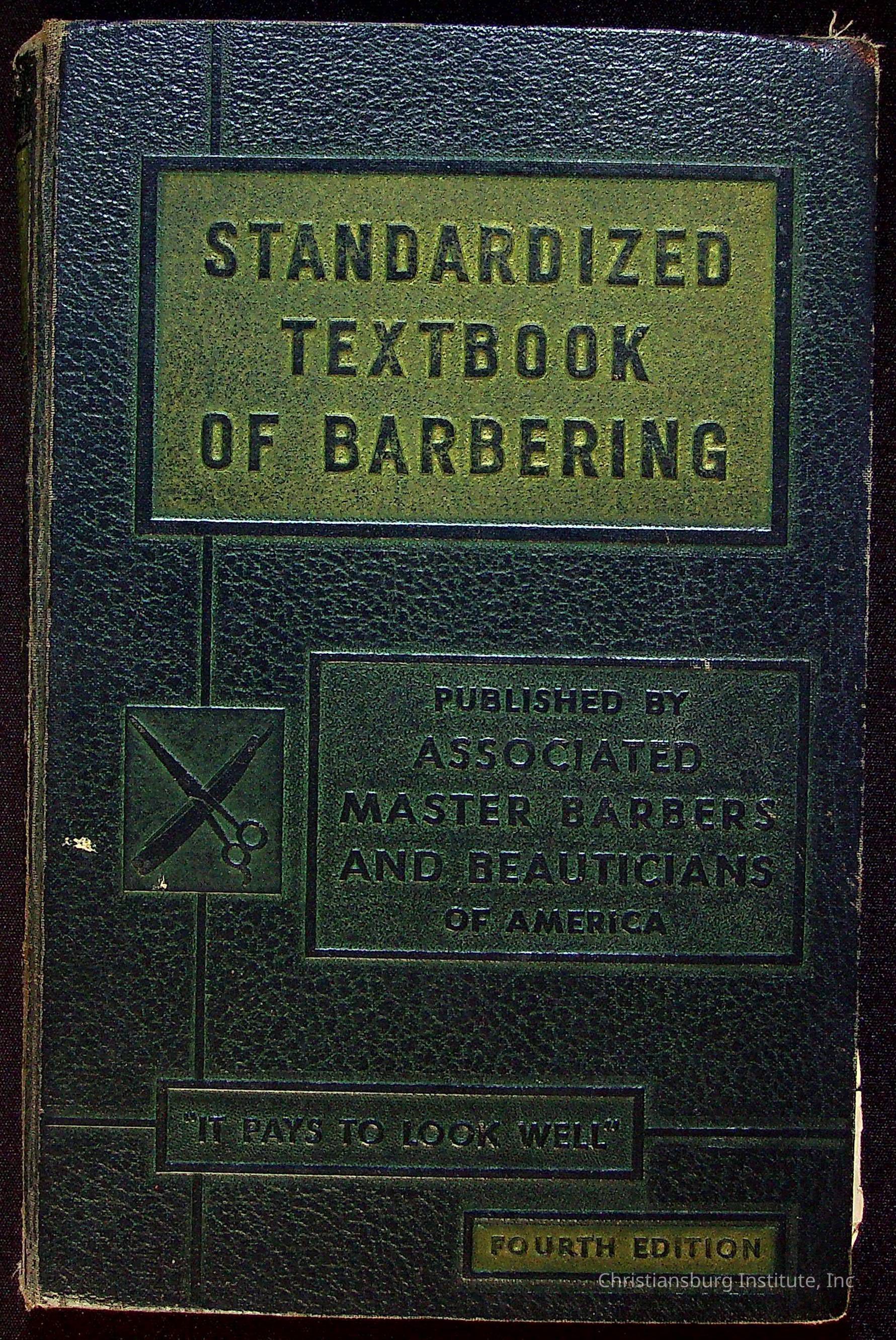 "Standardized Textbook of Barbering: in Two Parts" written and published by the Associated Master Barbers and Beauticians of America in the year 1950. This textbook was in the Christiansburg Institute library.