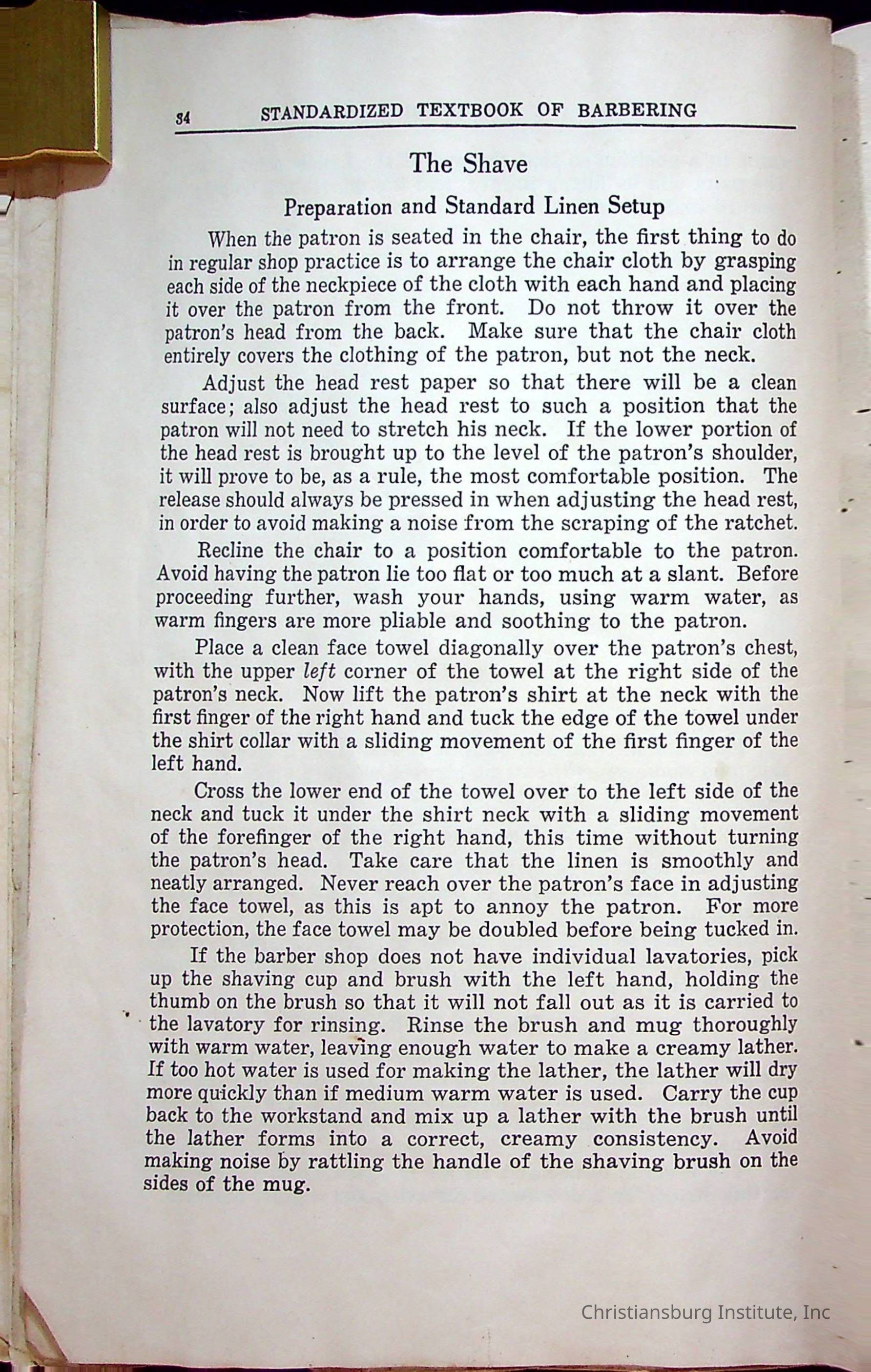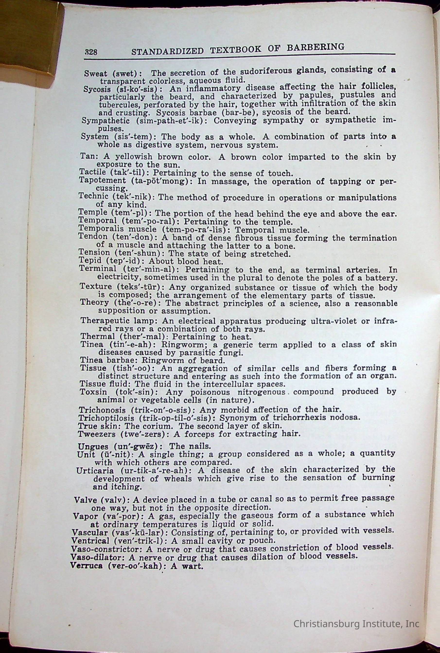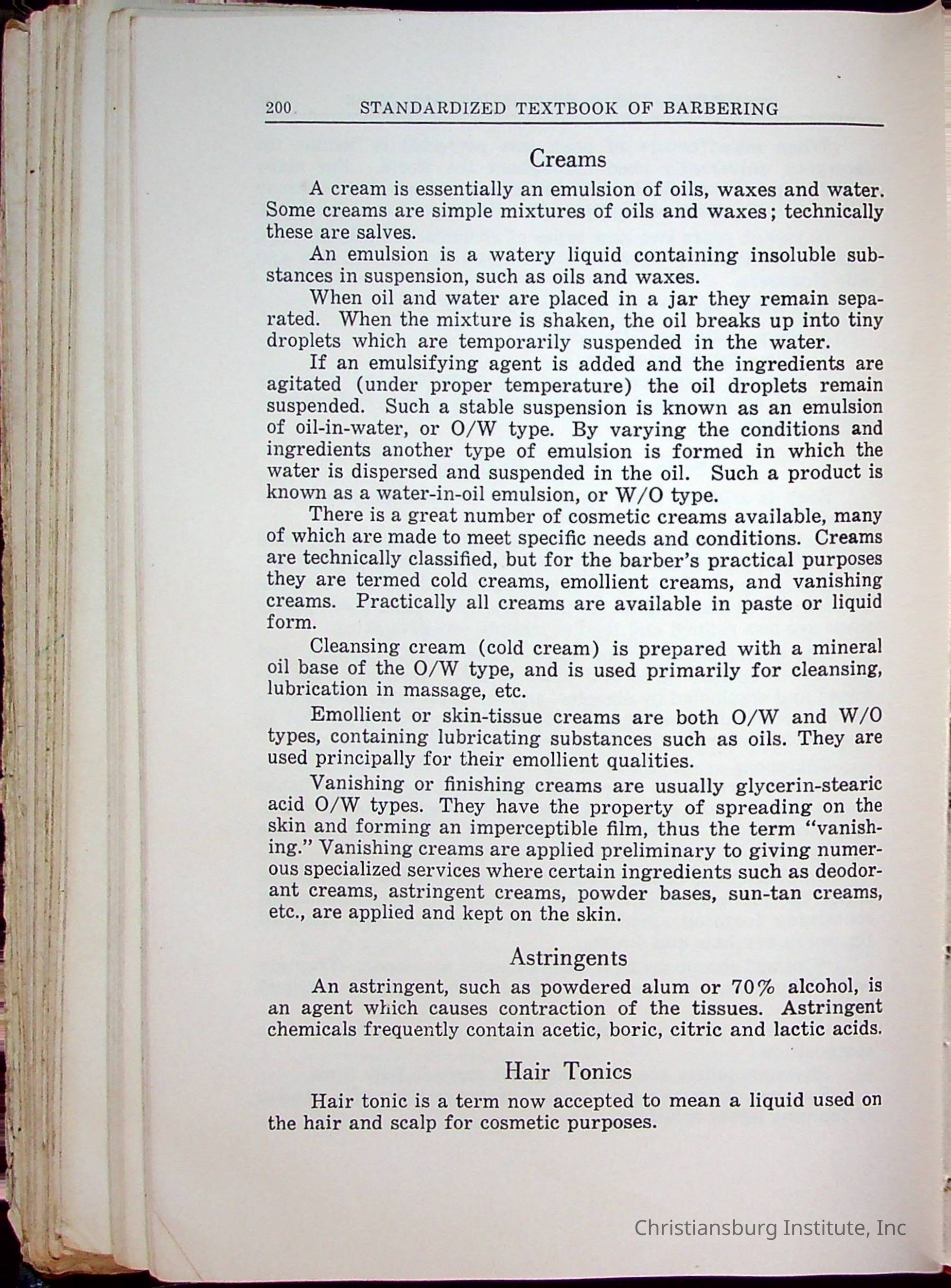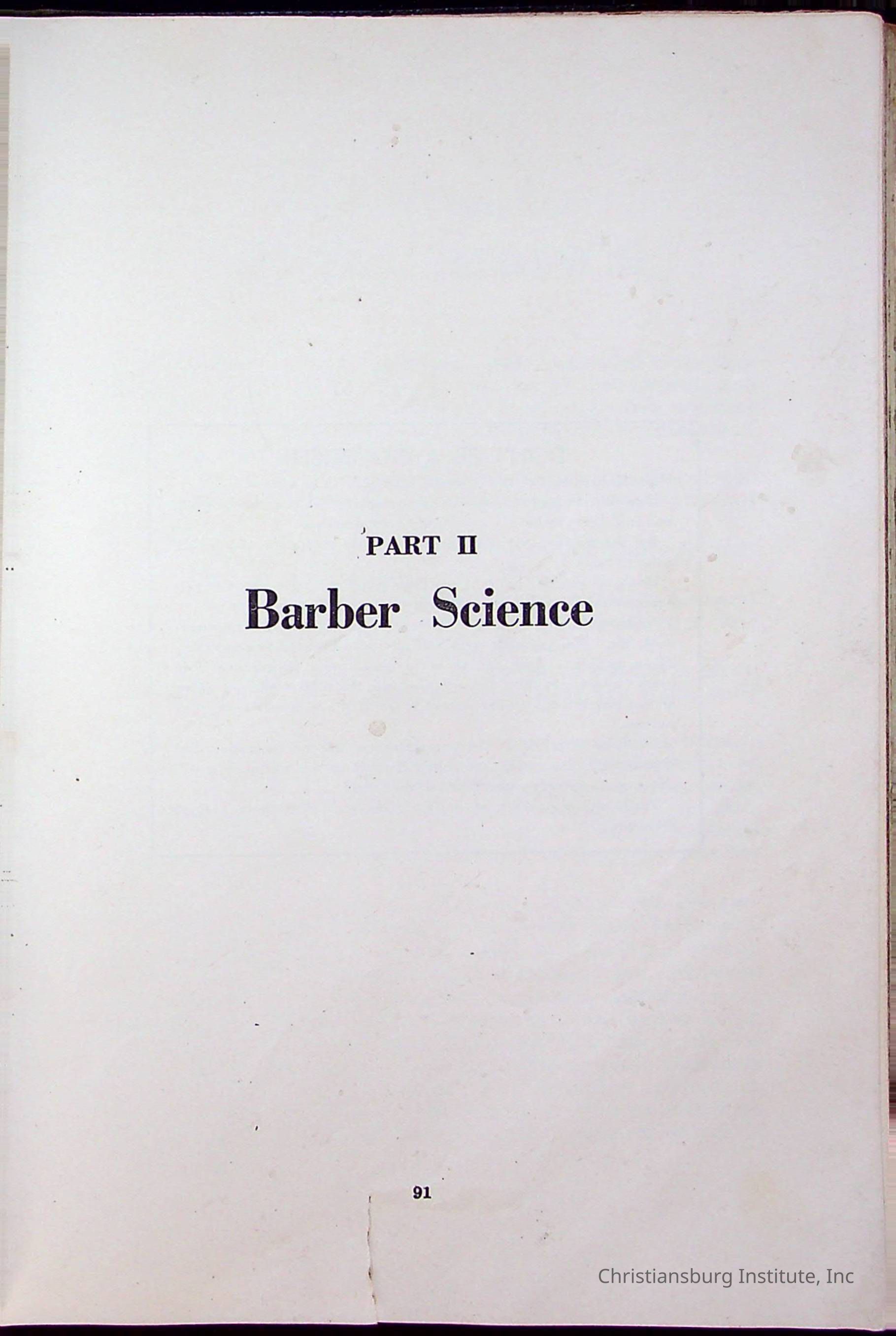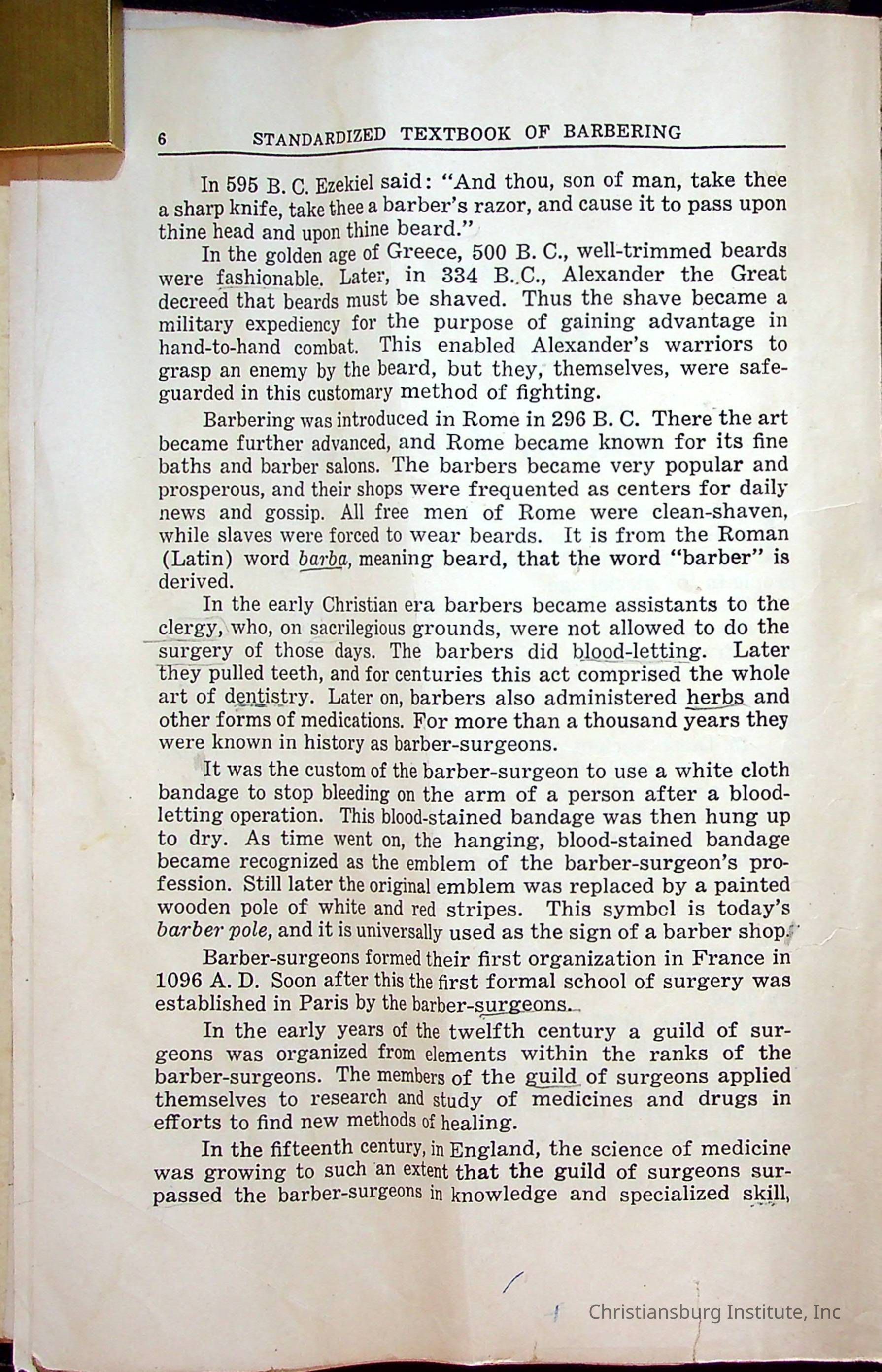 "Standardized Textbook of Barbering: in Two Parts" written and published by the Associated Master Barbers and Beauticians of America in the year 1950. This textbook was in the Christiansburg Institute library.