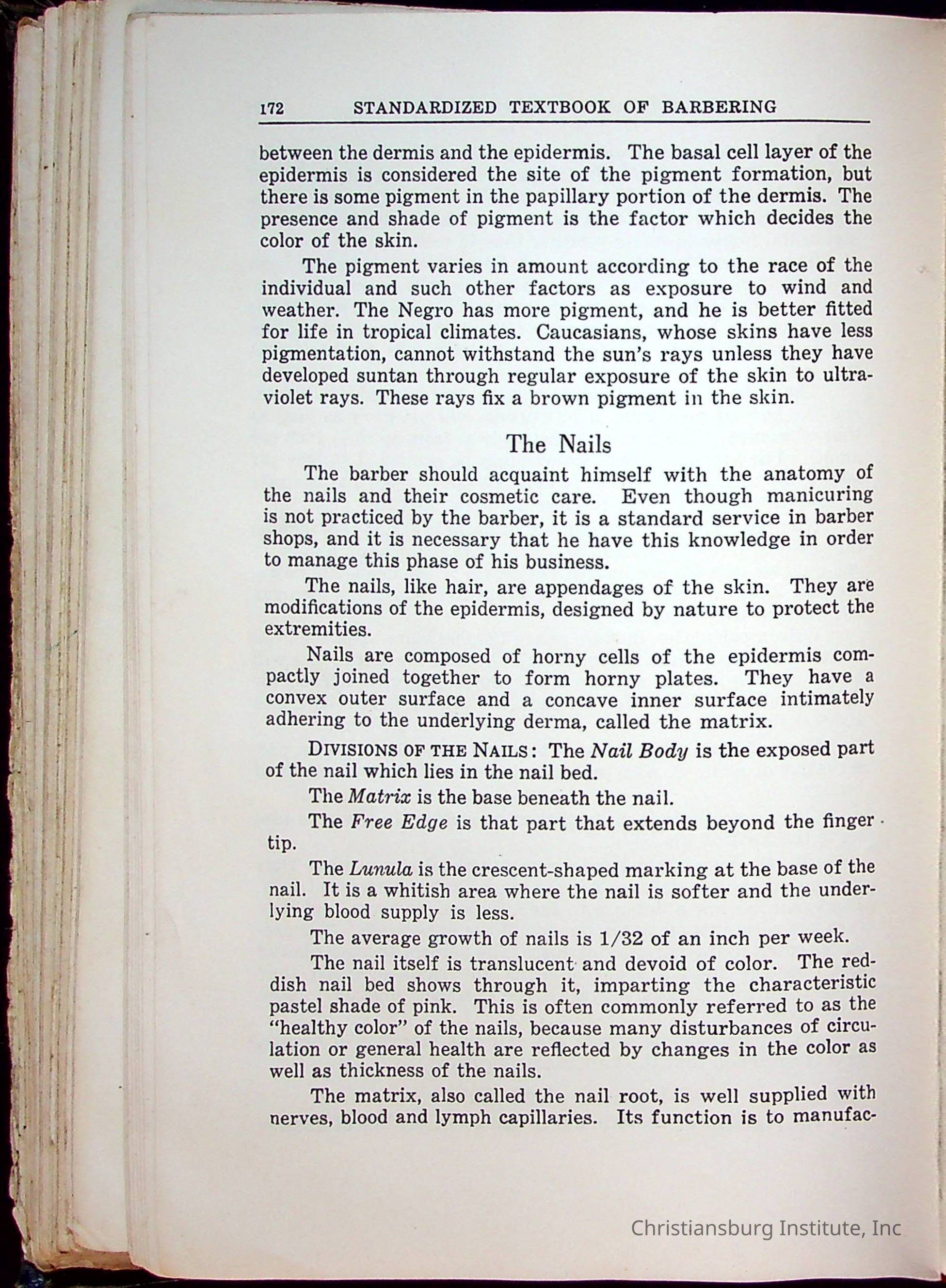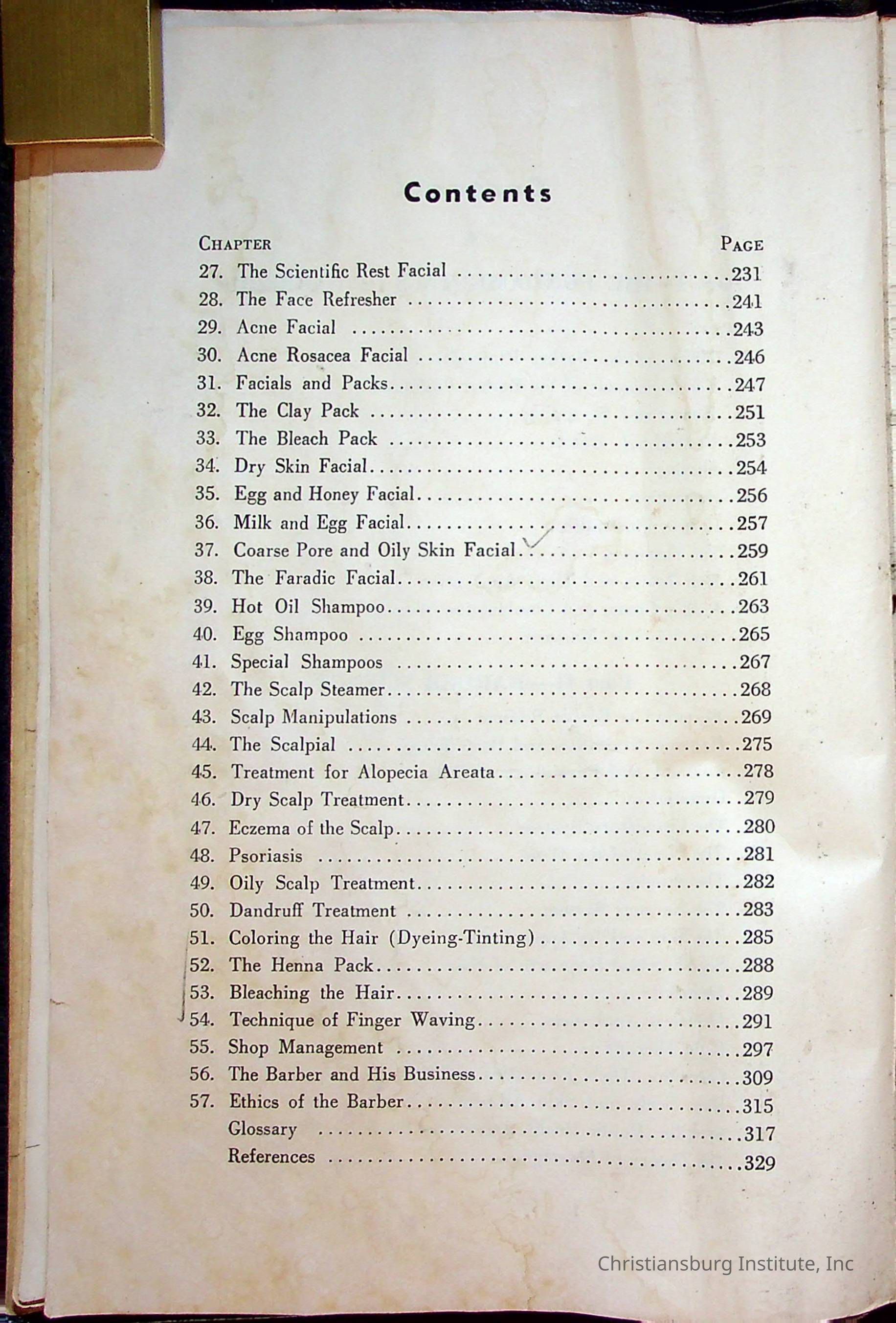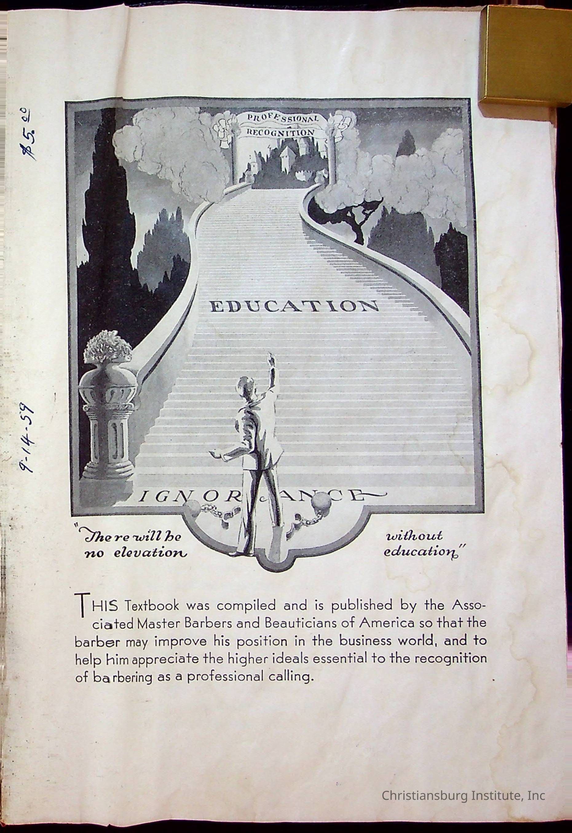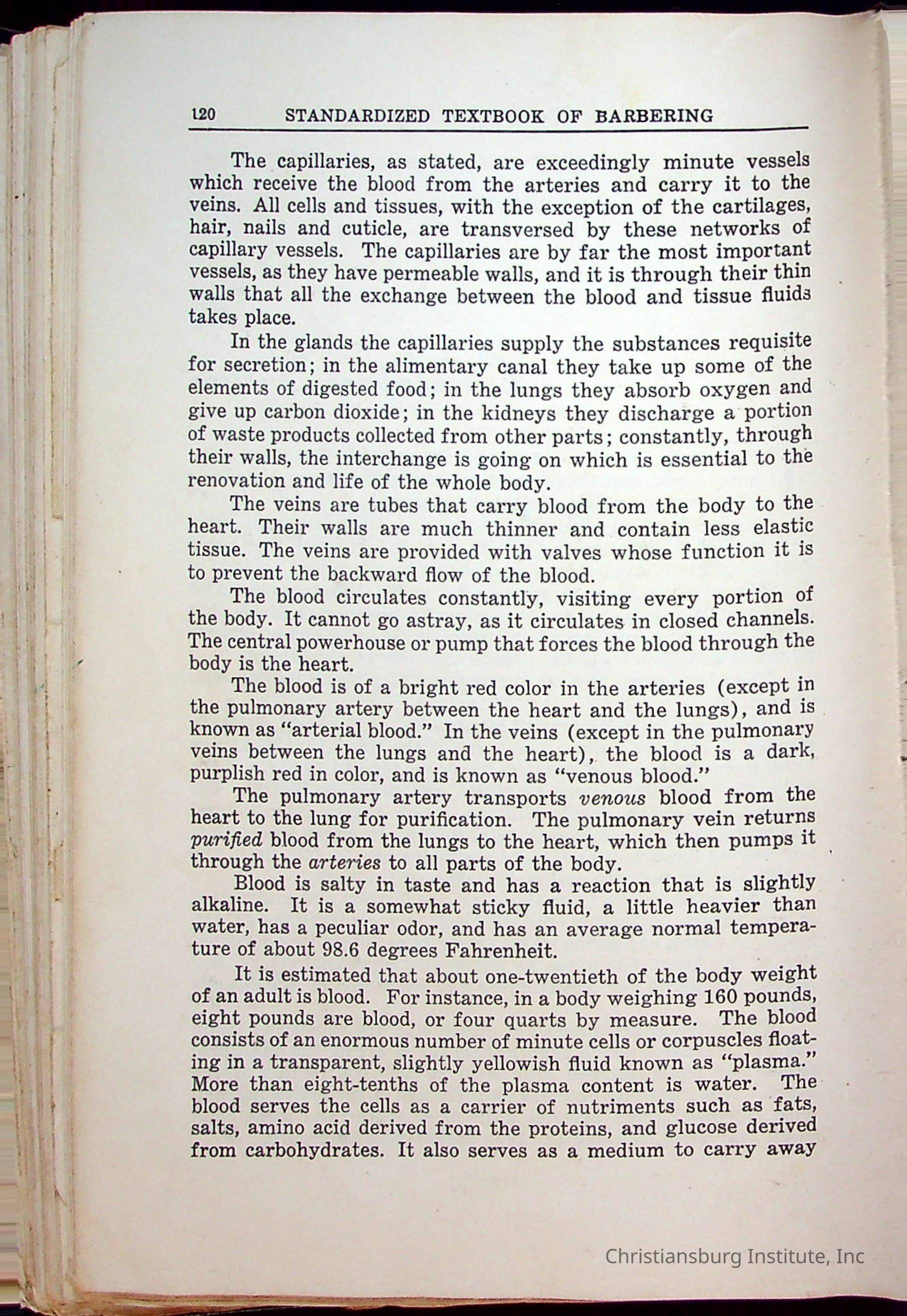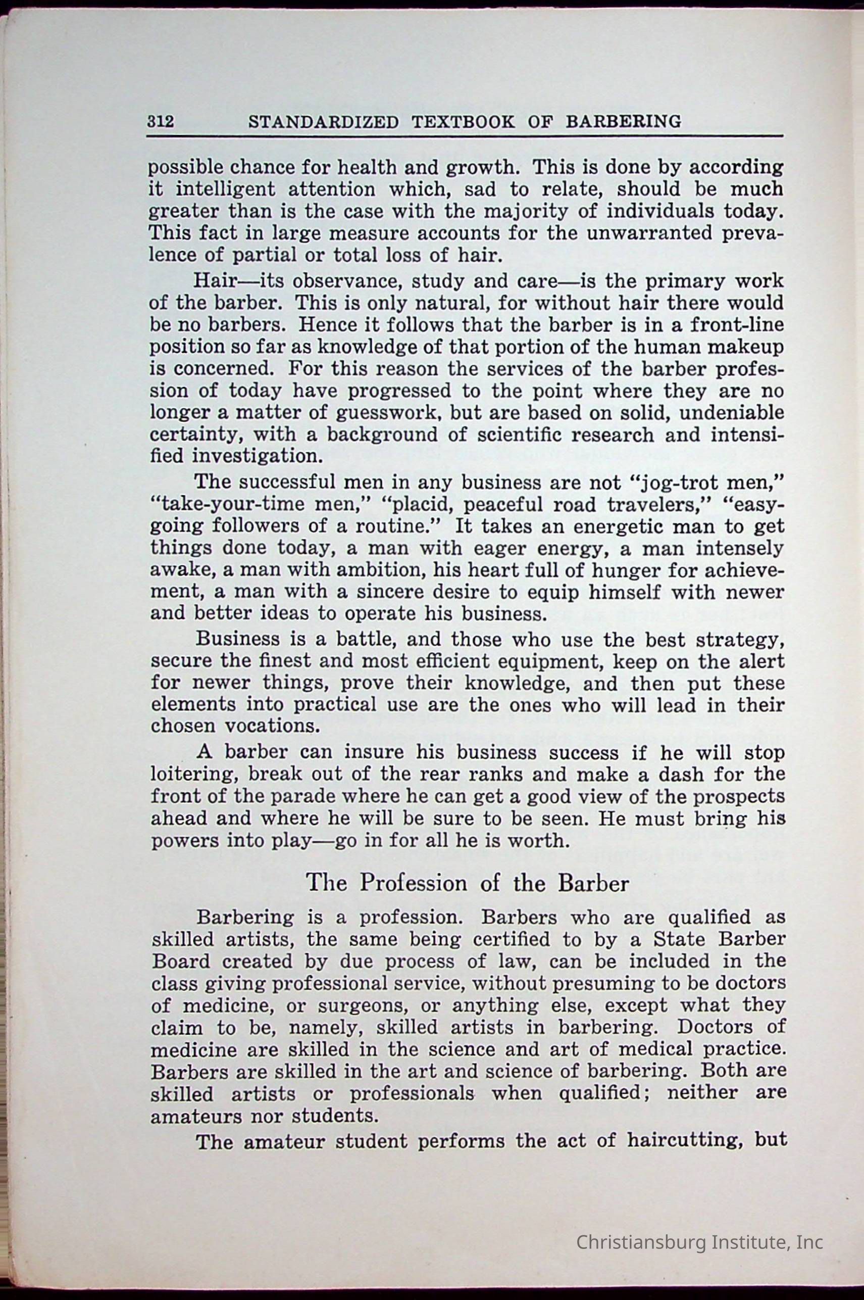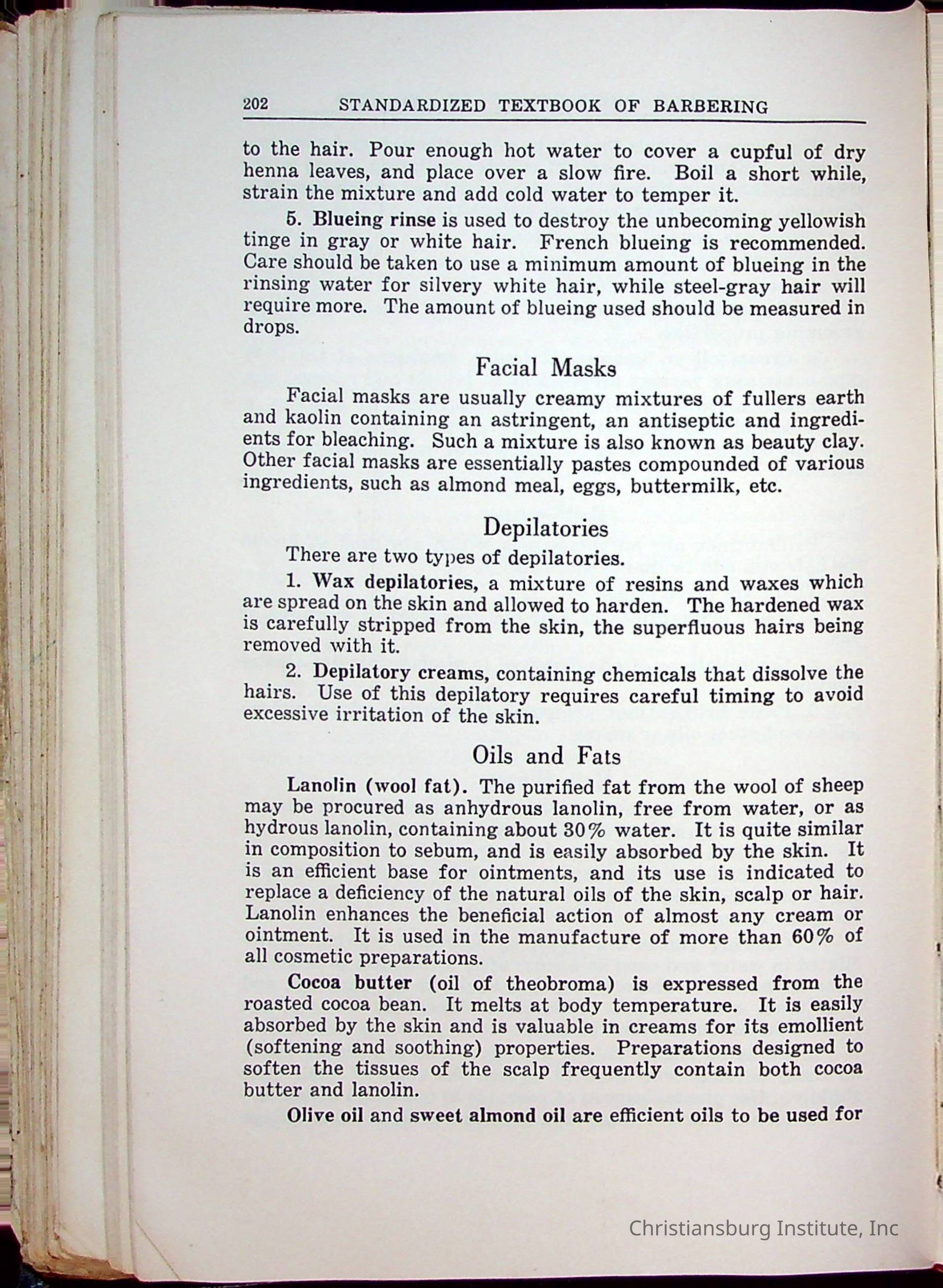 "Standardized Textbook of Barbering: in Two Parts" written and published by the Associated Master Barbers and Beauticians of America in the year 1950. This textbook was in the Christiansburg Institute library.