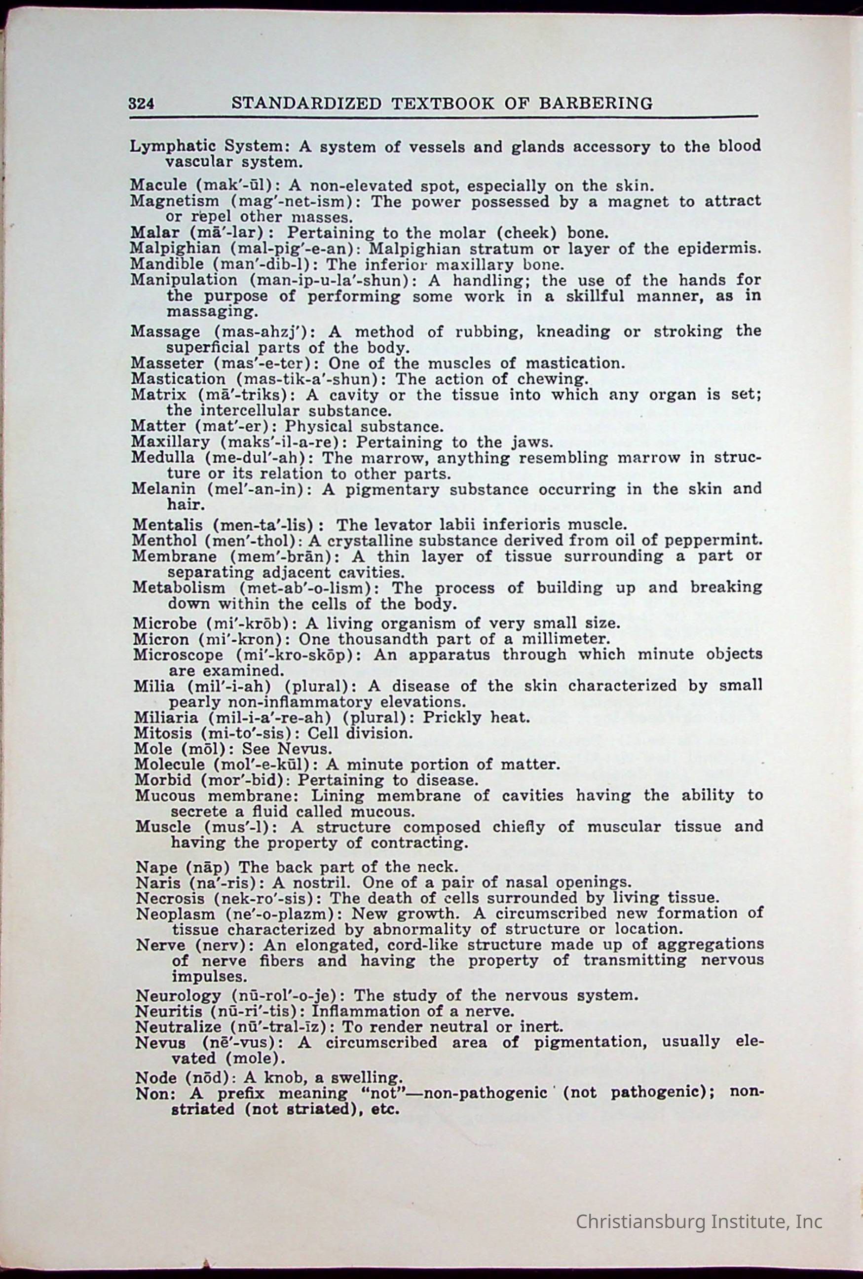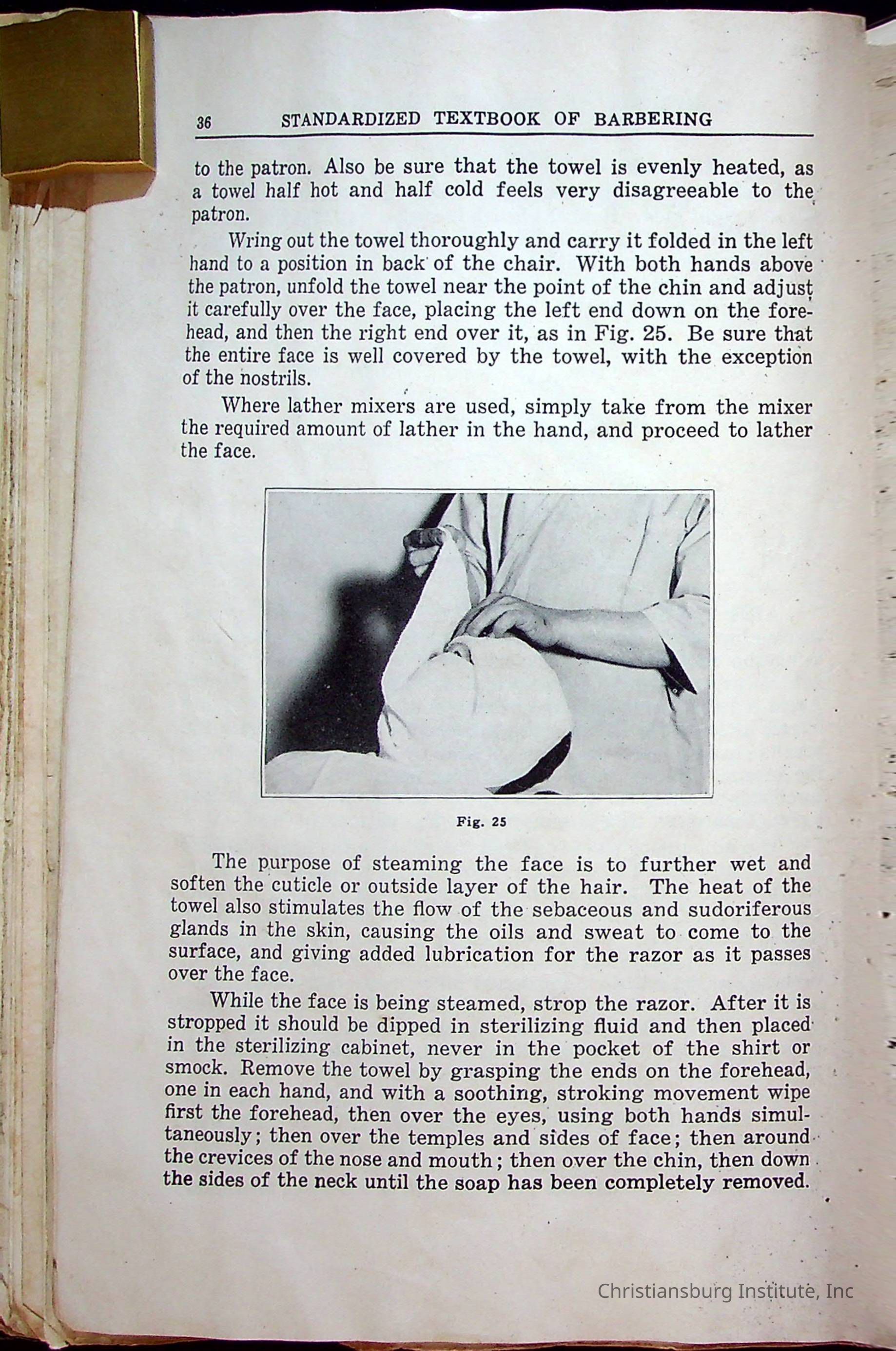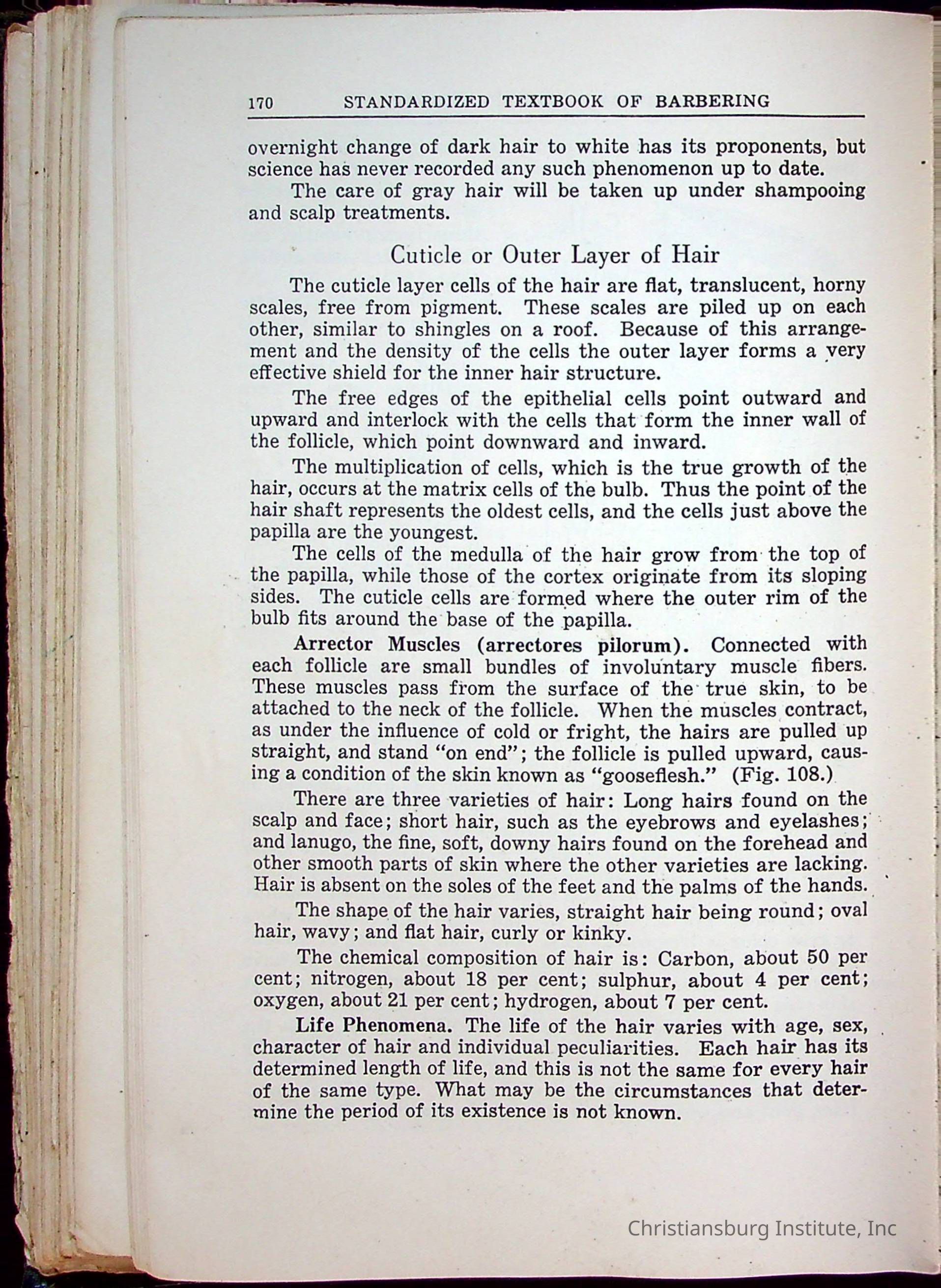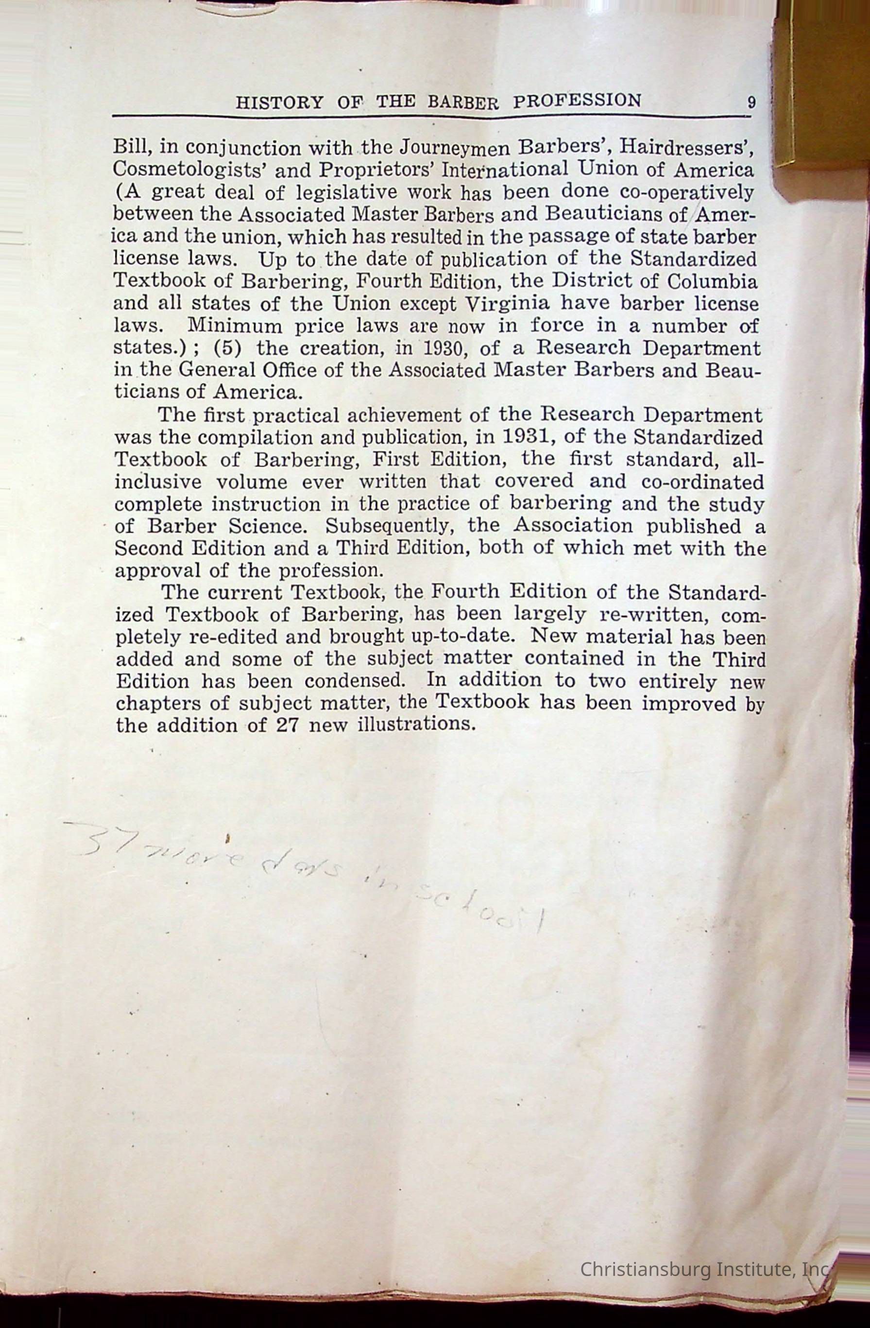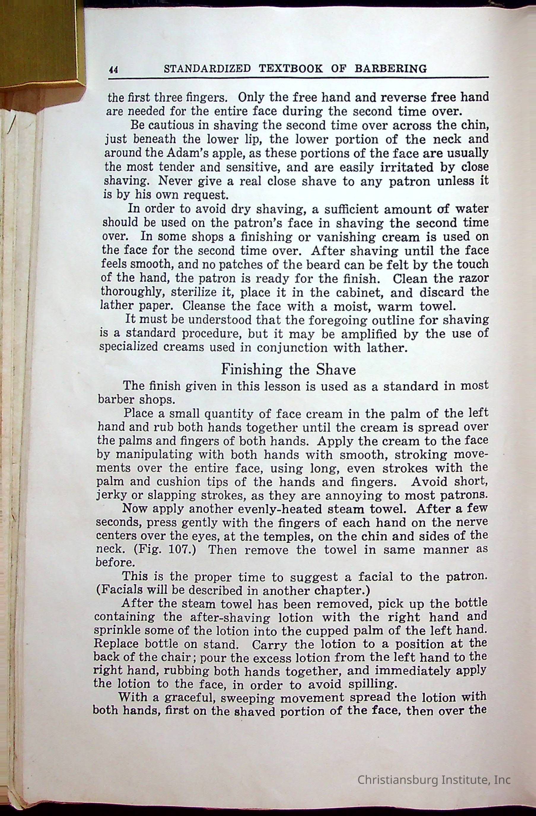 "Standardized Textbook of Barbering: in Two Parts" written and published by the Associated Master Barbers and Beauticians of America in the year 1950. This textbook was in the Christiansburg Institute library.