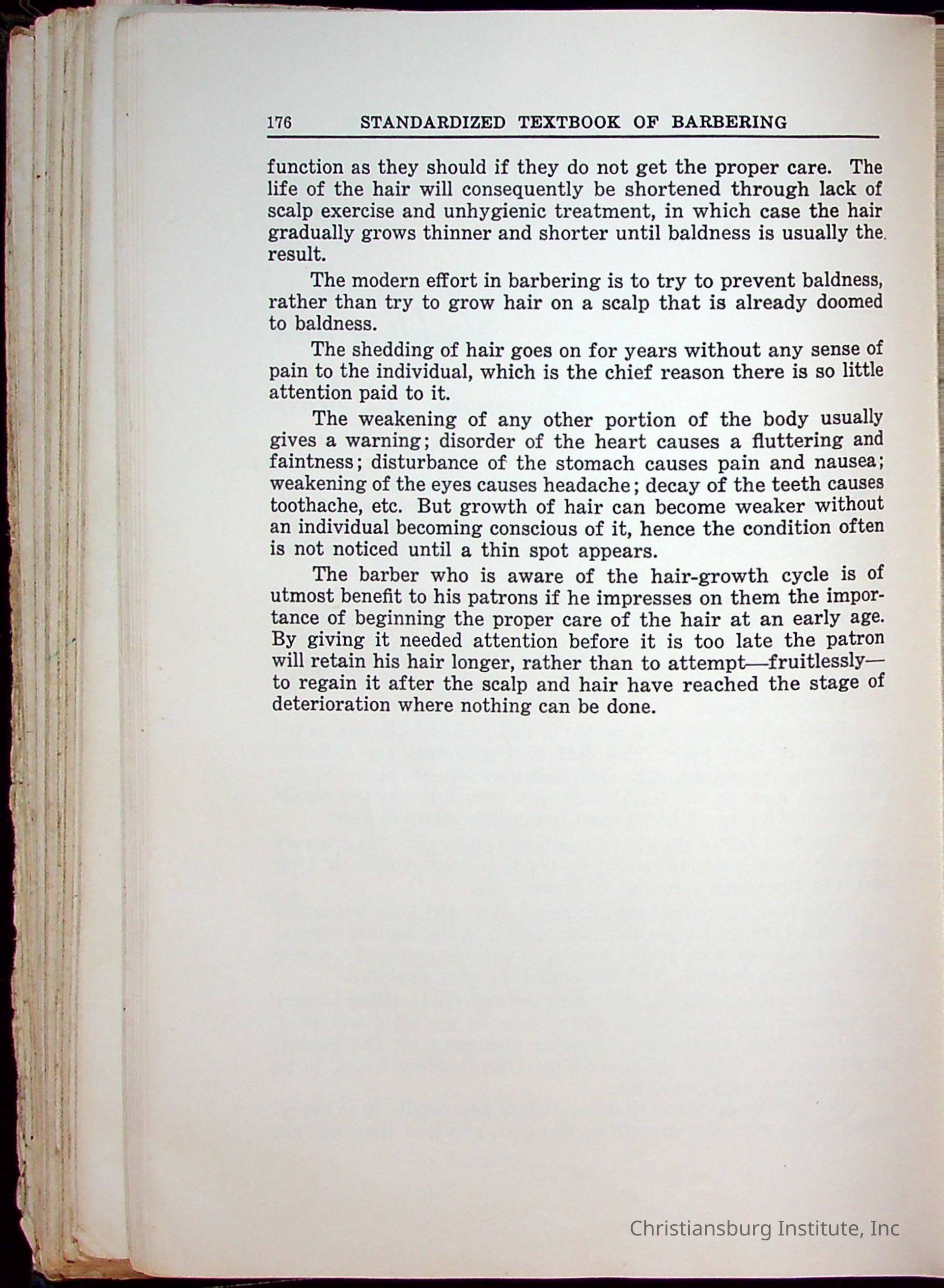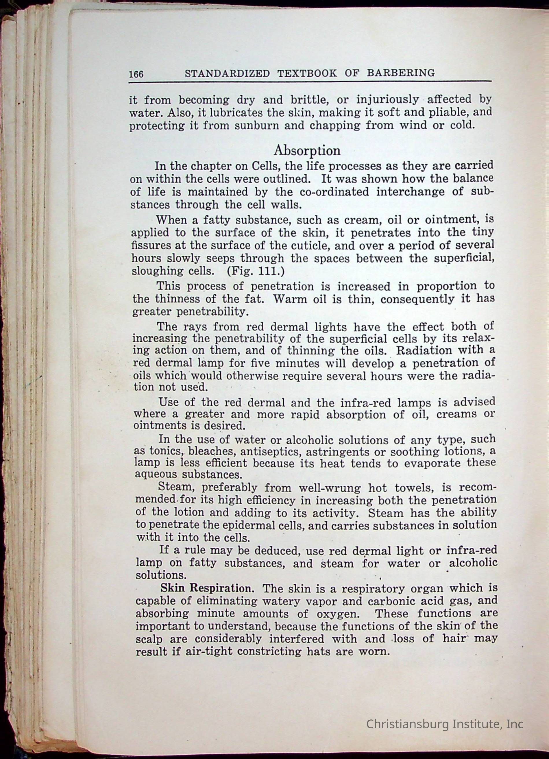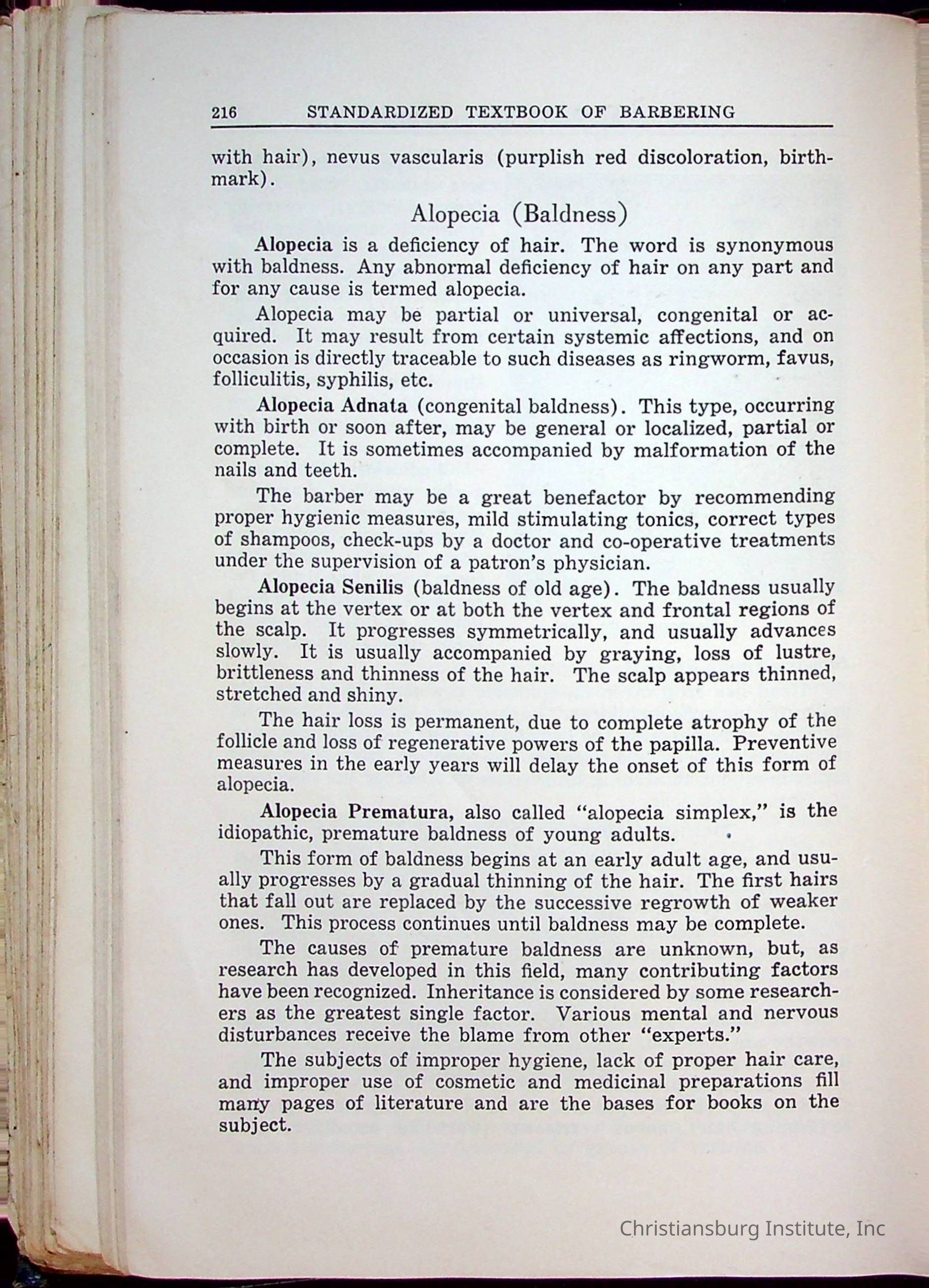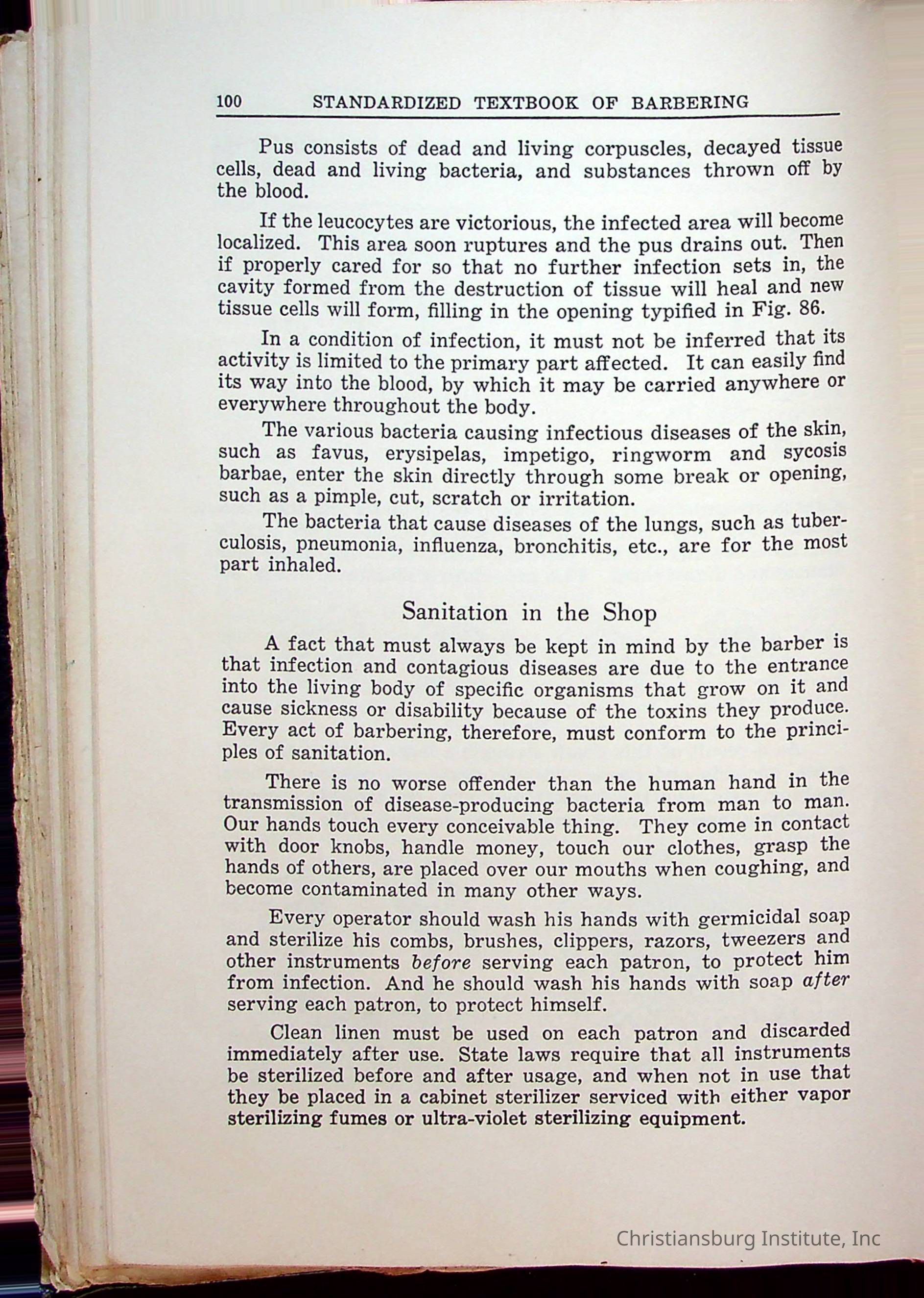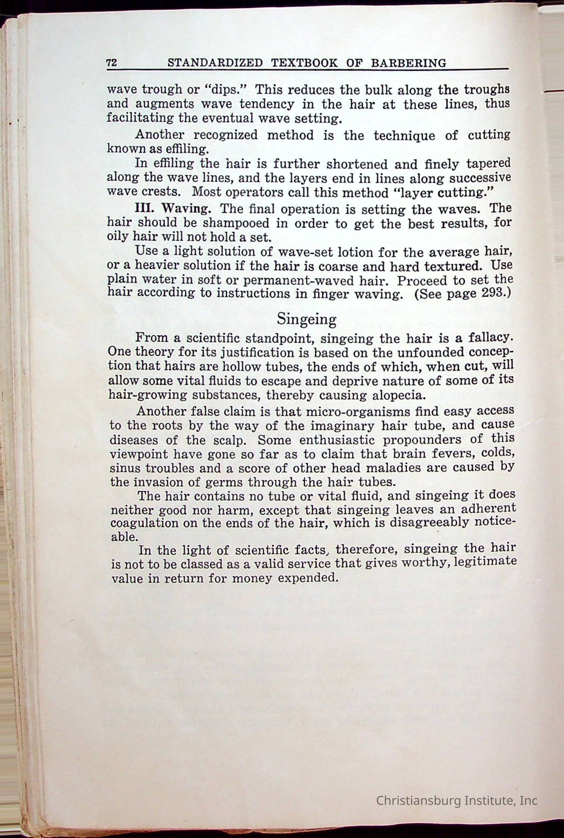 "Standardized Textbook of Barbering: in Two Parts" written and published by the Associated Master Barbers and Beauticians of America in the year 1950. This textbook was in the Christiansburg Institute library.