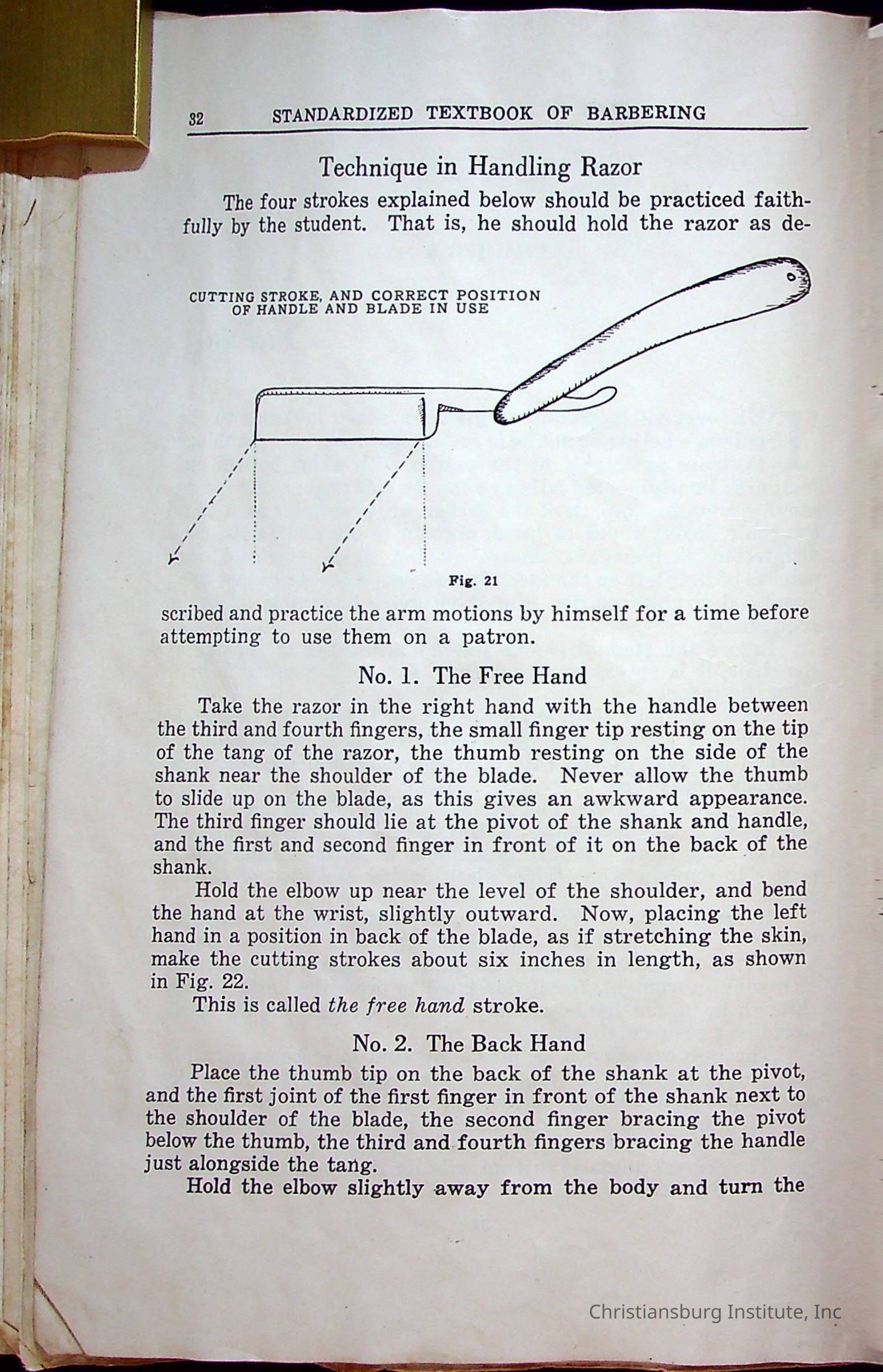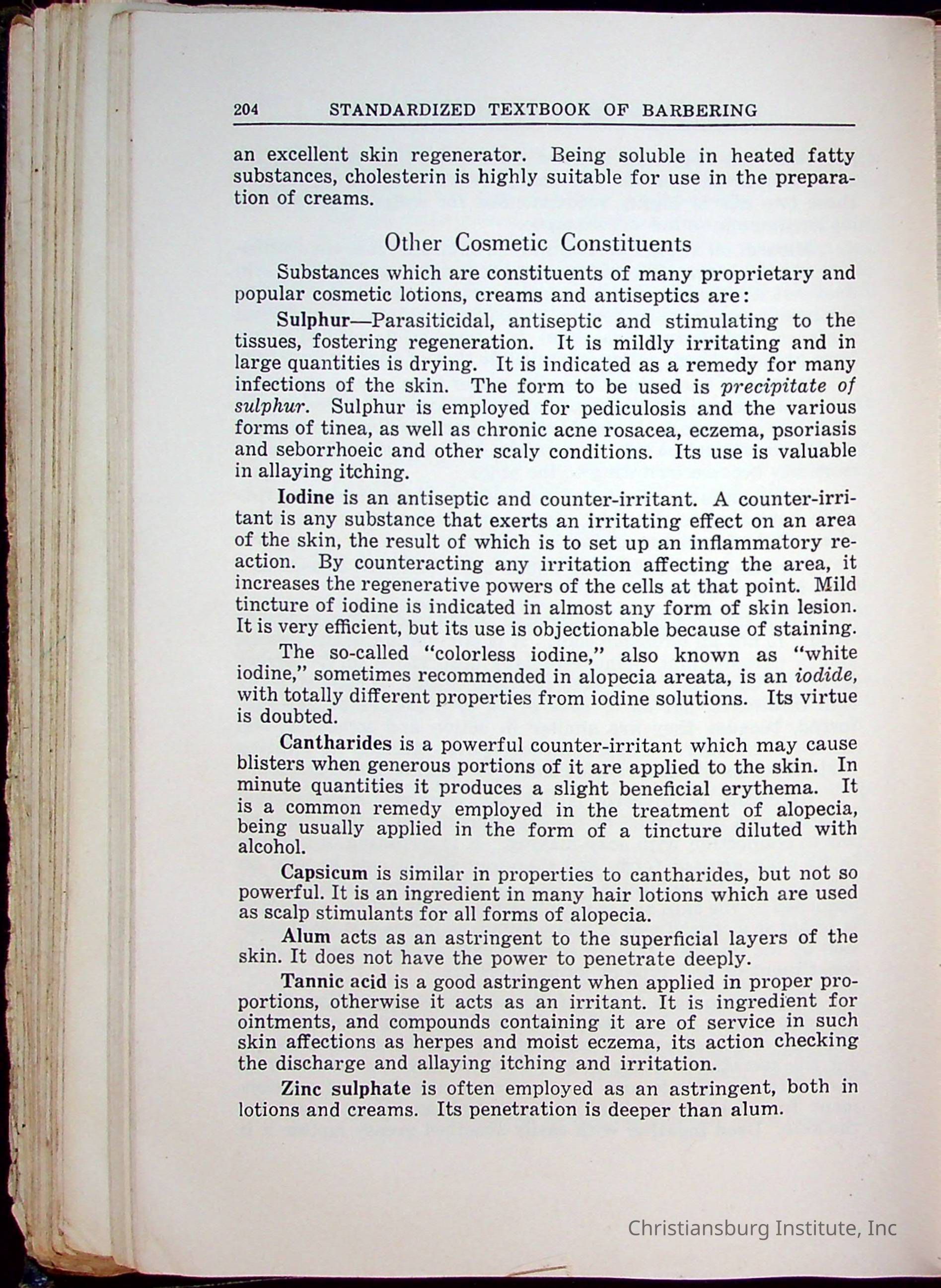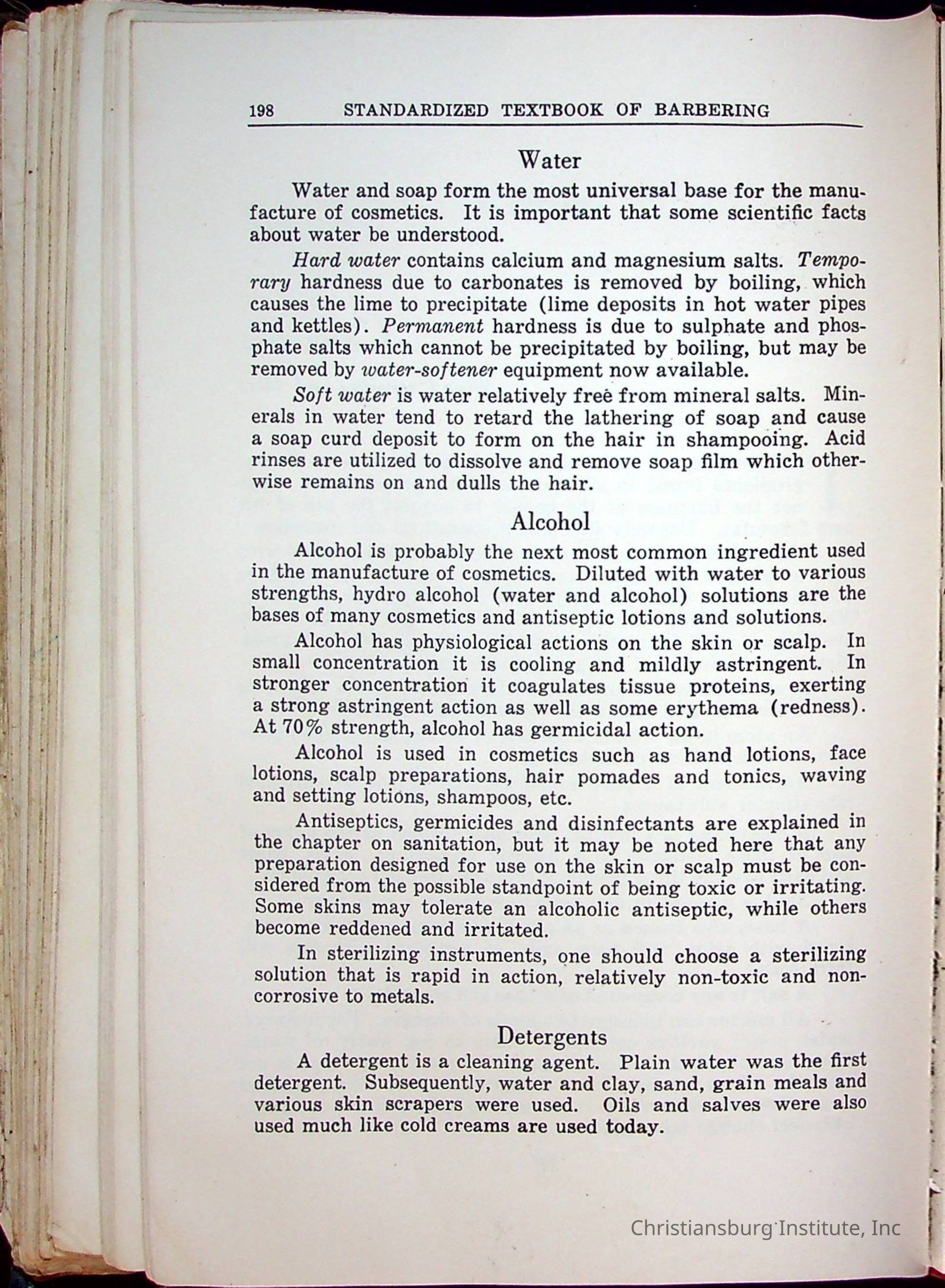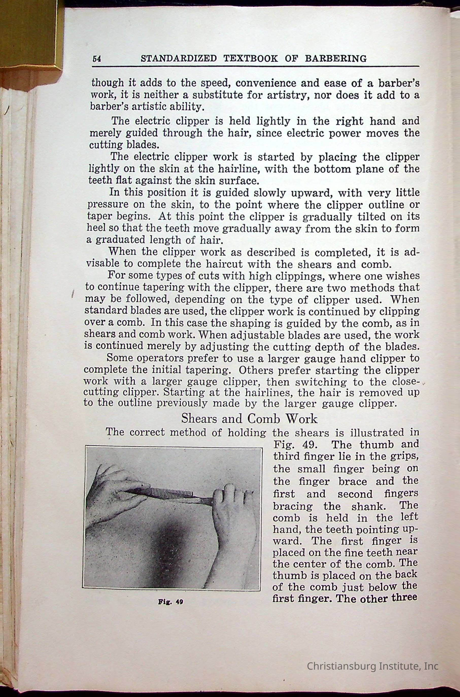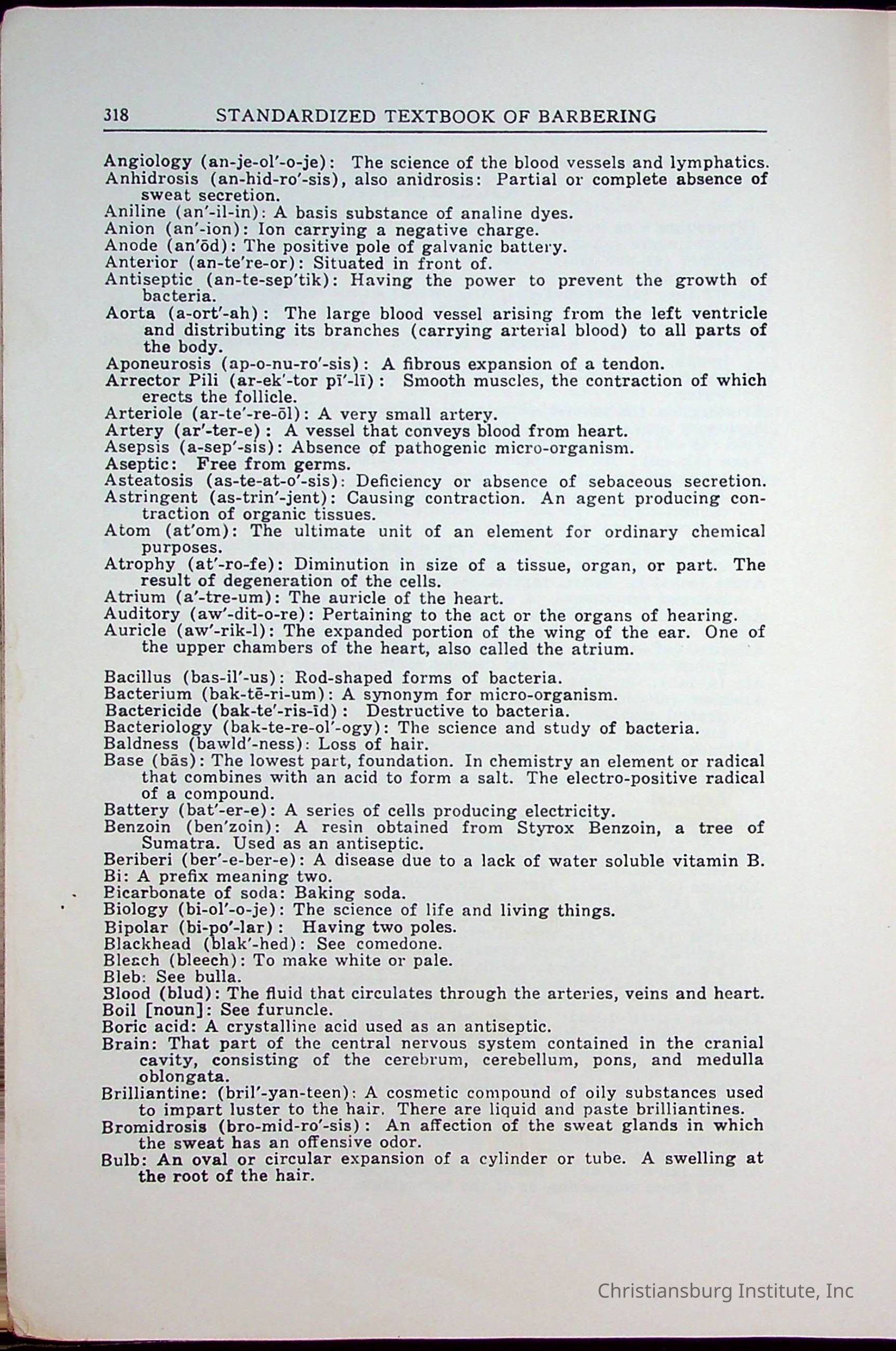 "Standardized Textbook of Barbering: in Two Parts" written and published by the Associated Master Barbers and Beauticians of America in the year 1950. This textbook was in the Christiansburg Institute library.