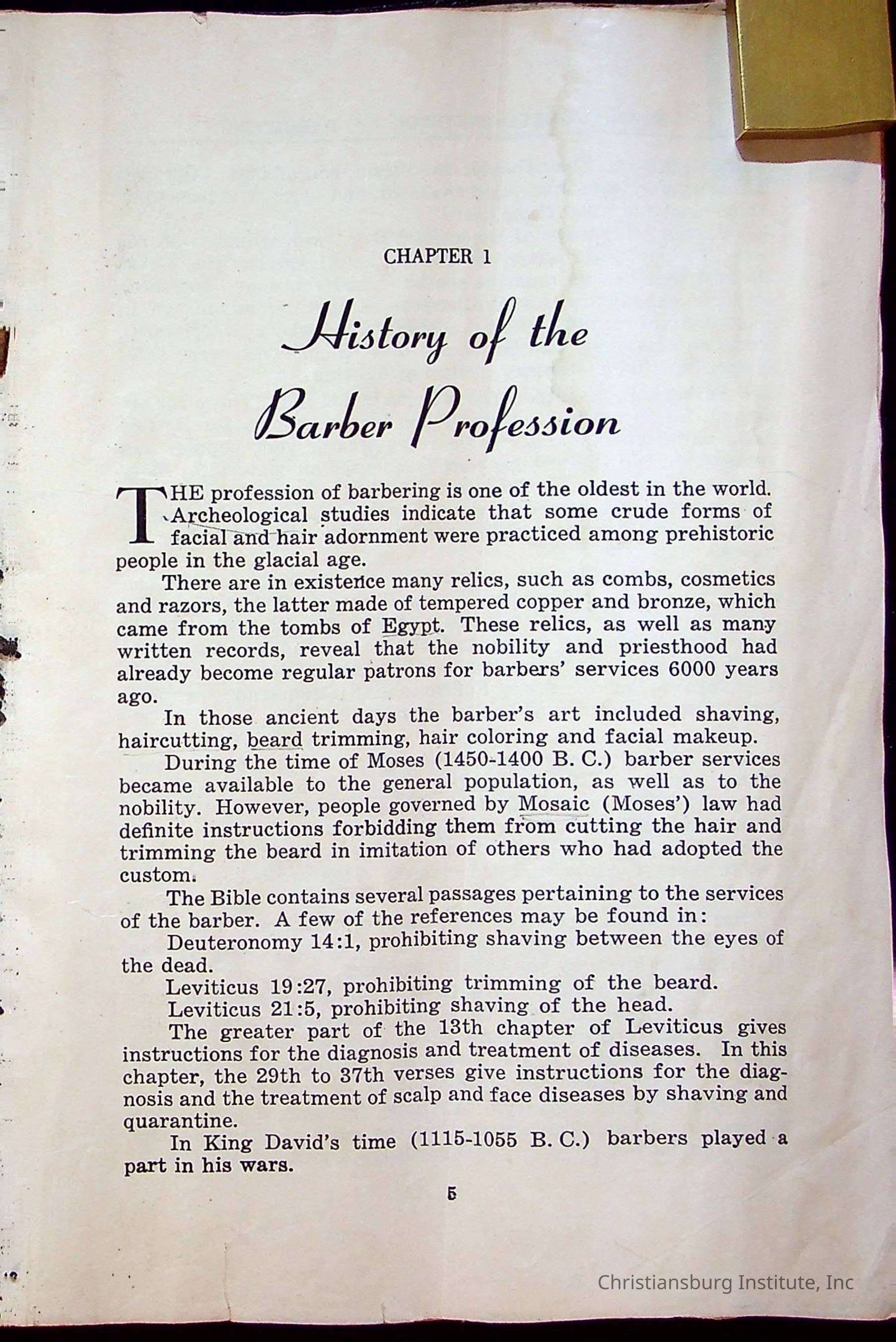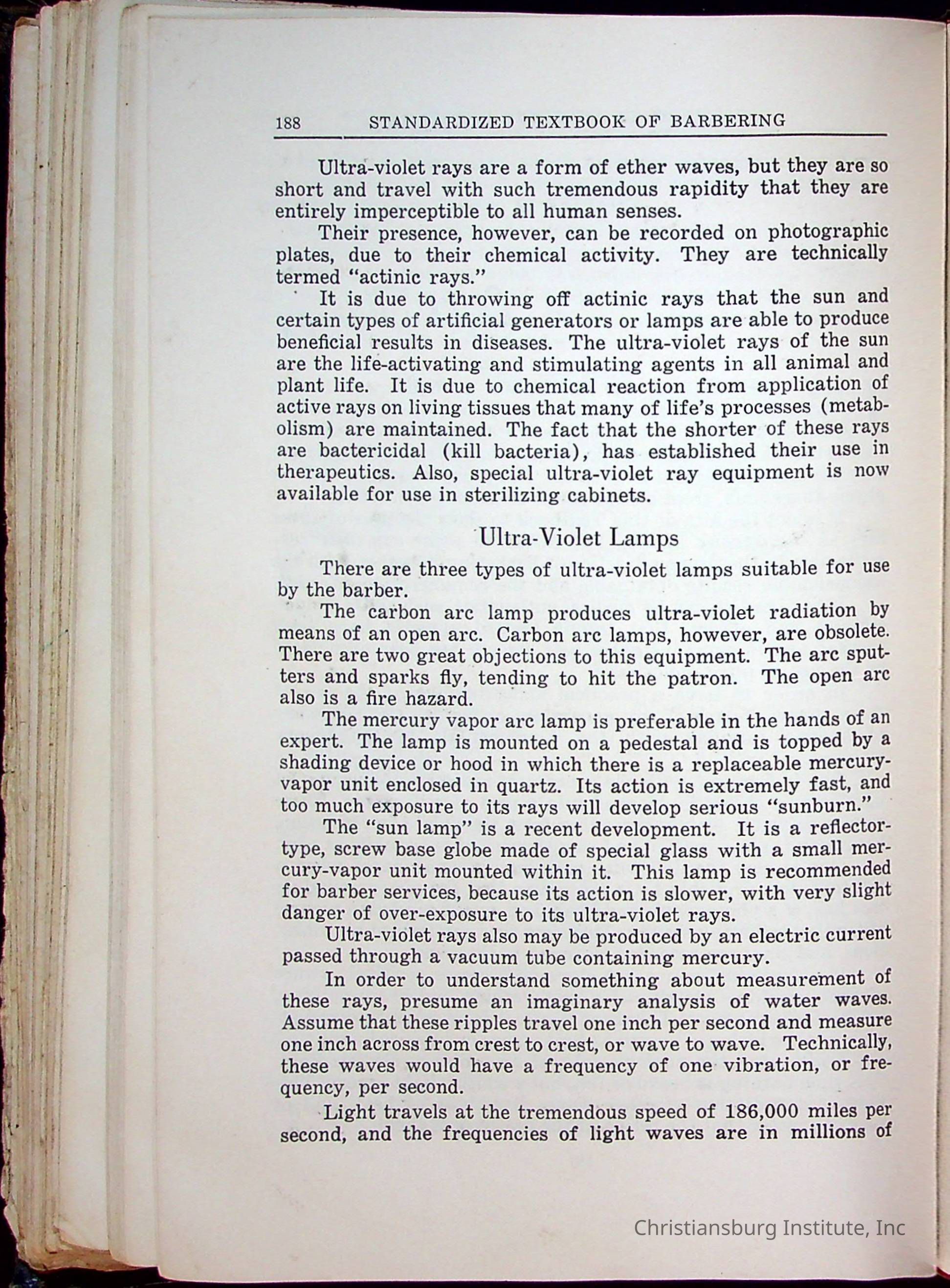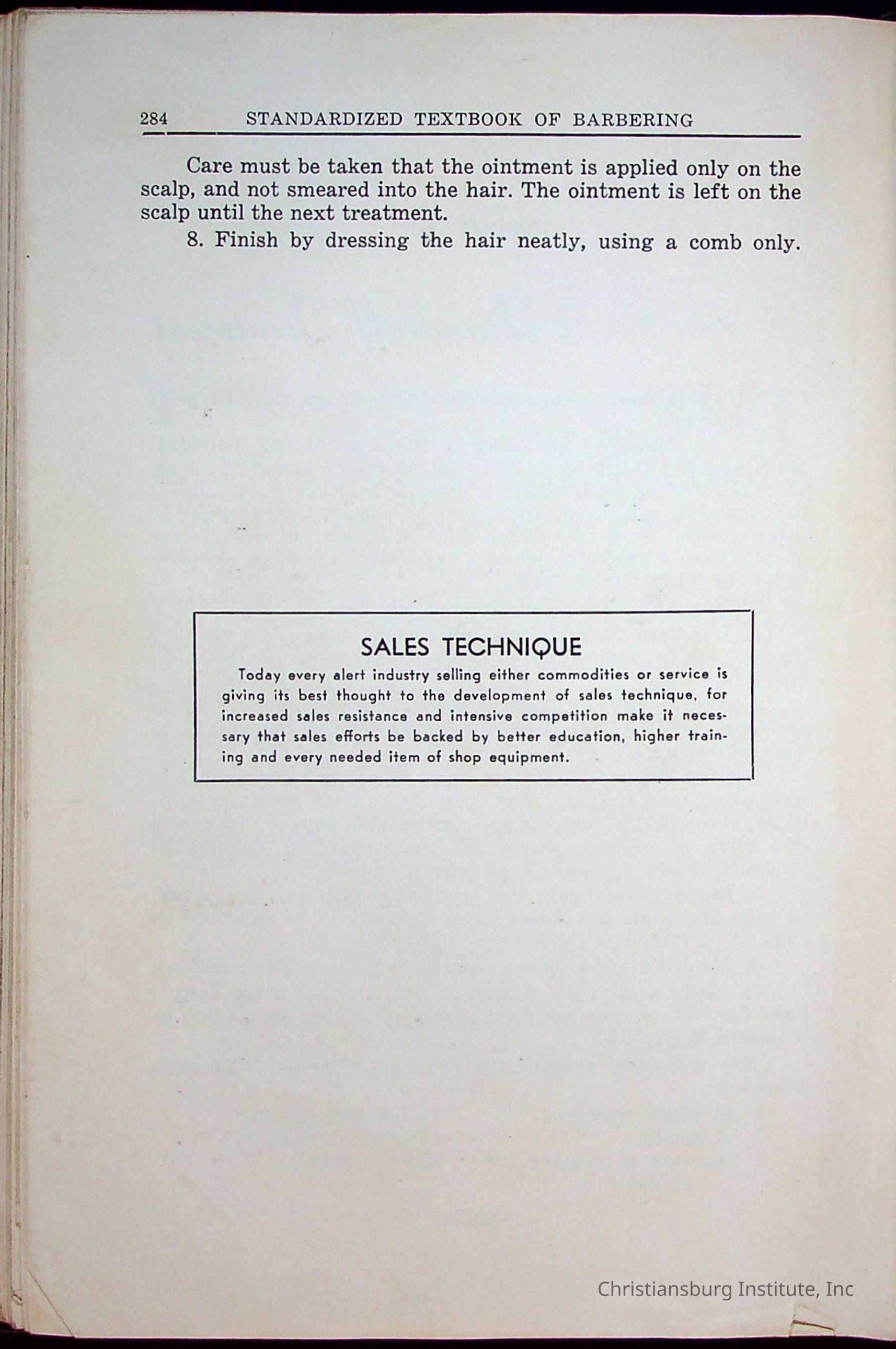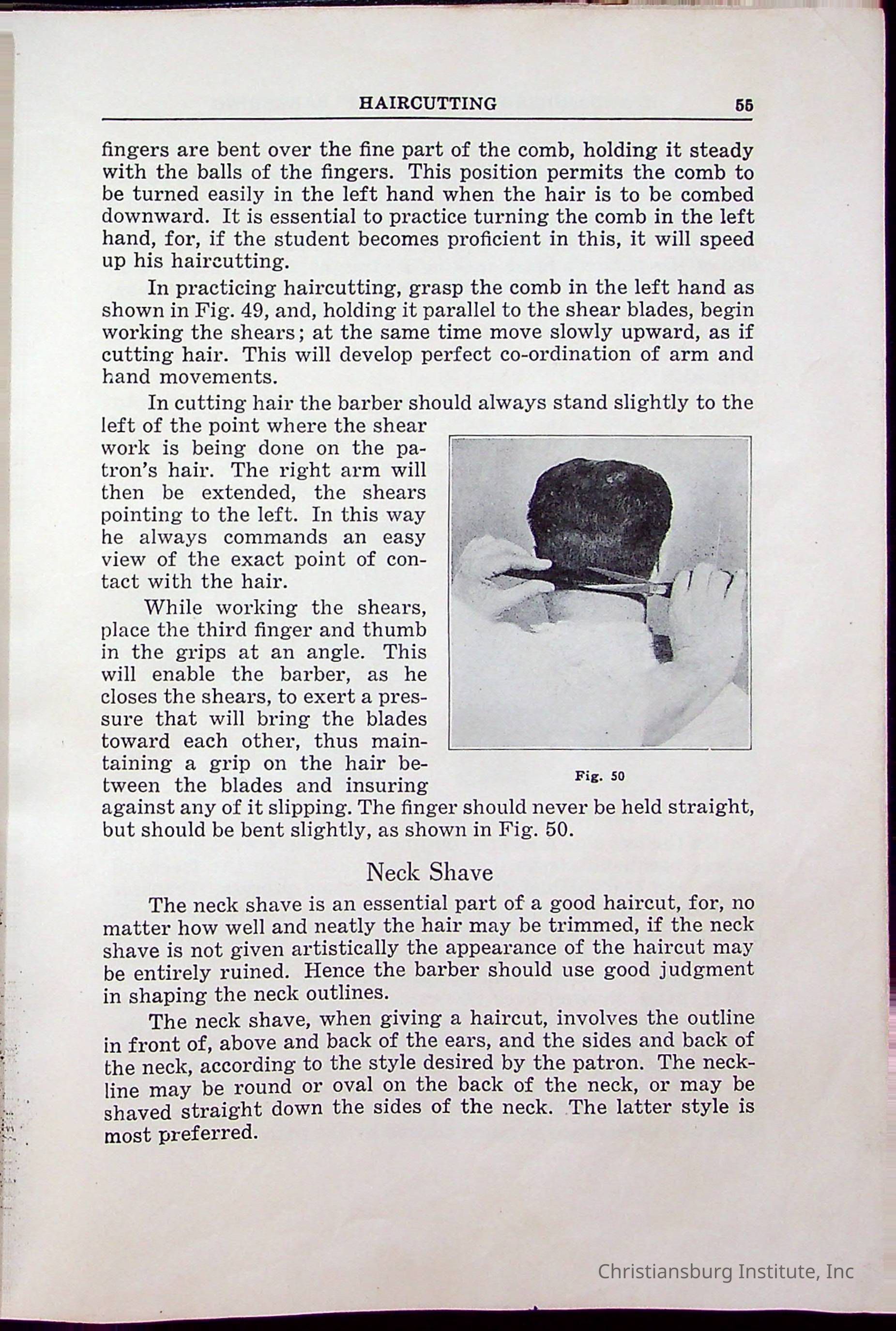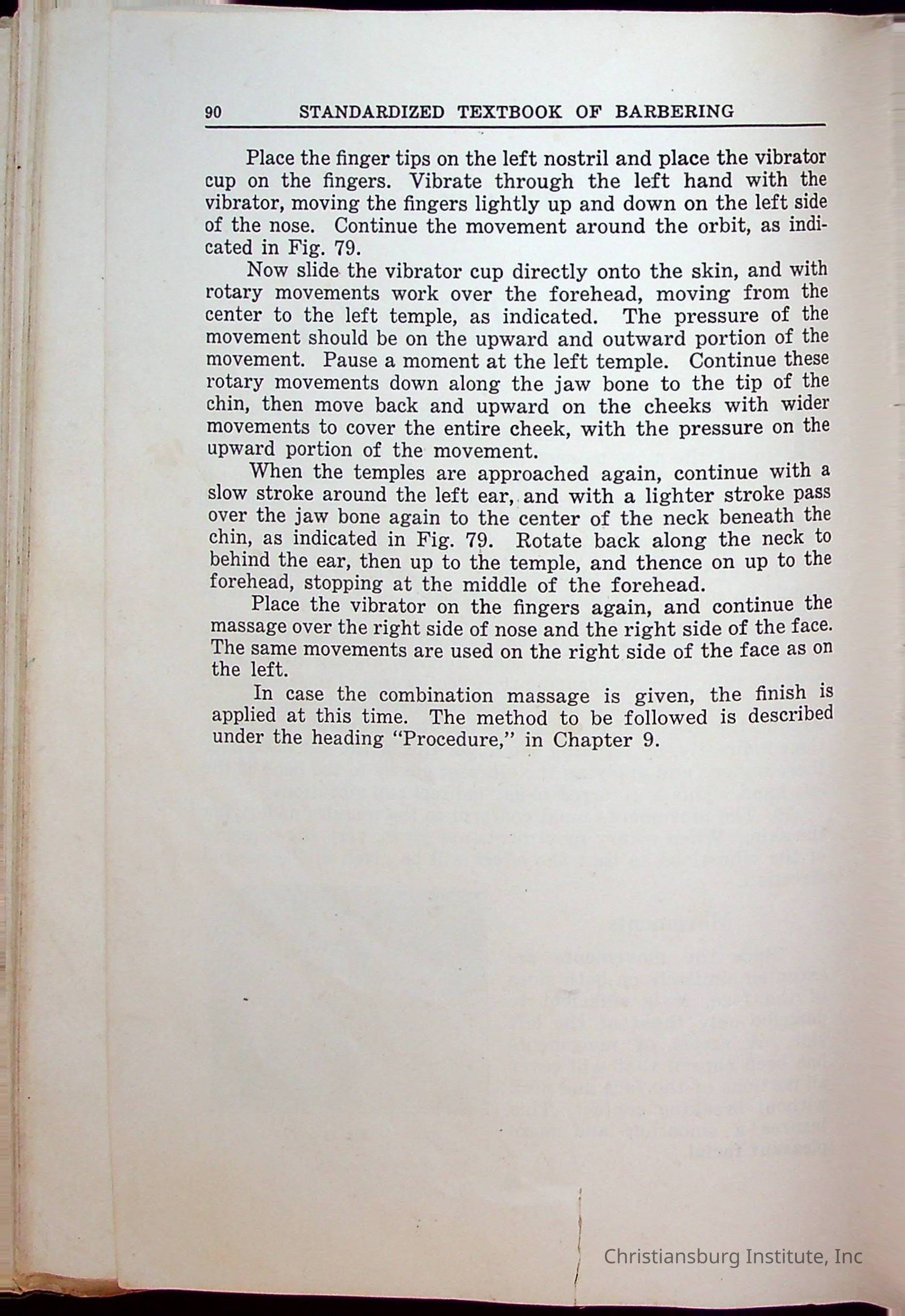 "Standardized Textbook of Barbering: in Two Parts" written and published by the Associated Master Barbers and Beauticians of America in the year 1950. This textbook was in the Christiansburg Institute library.