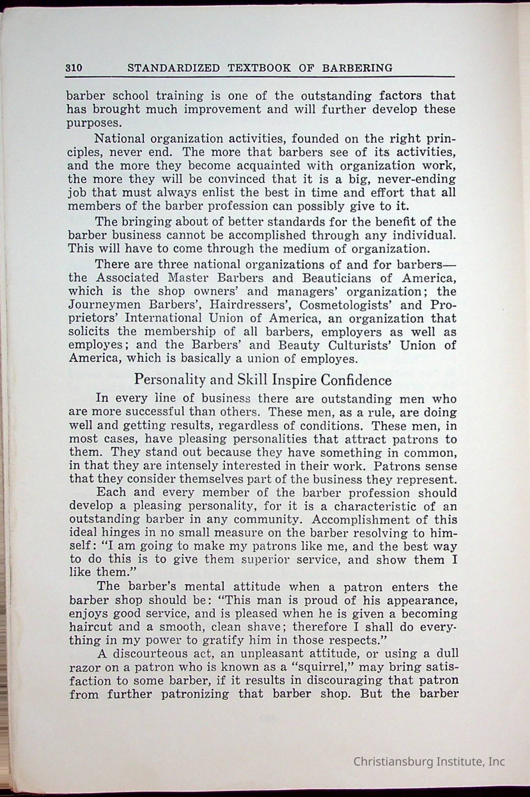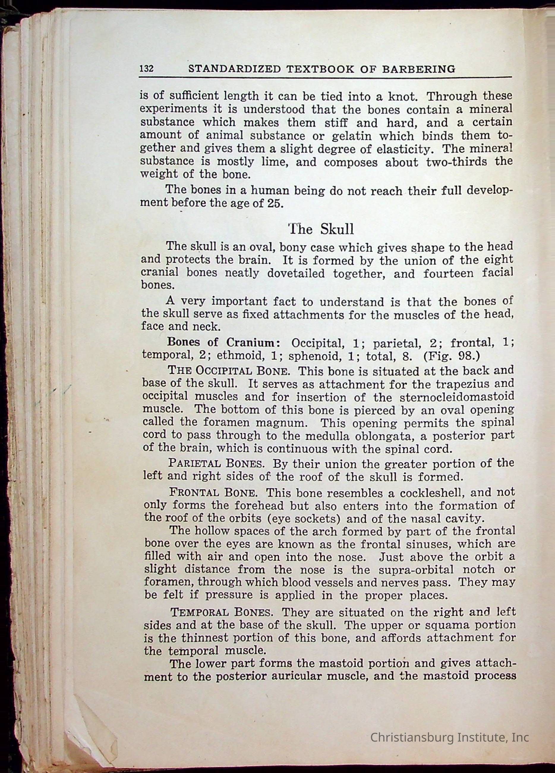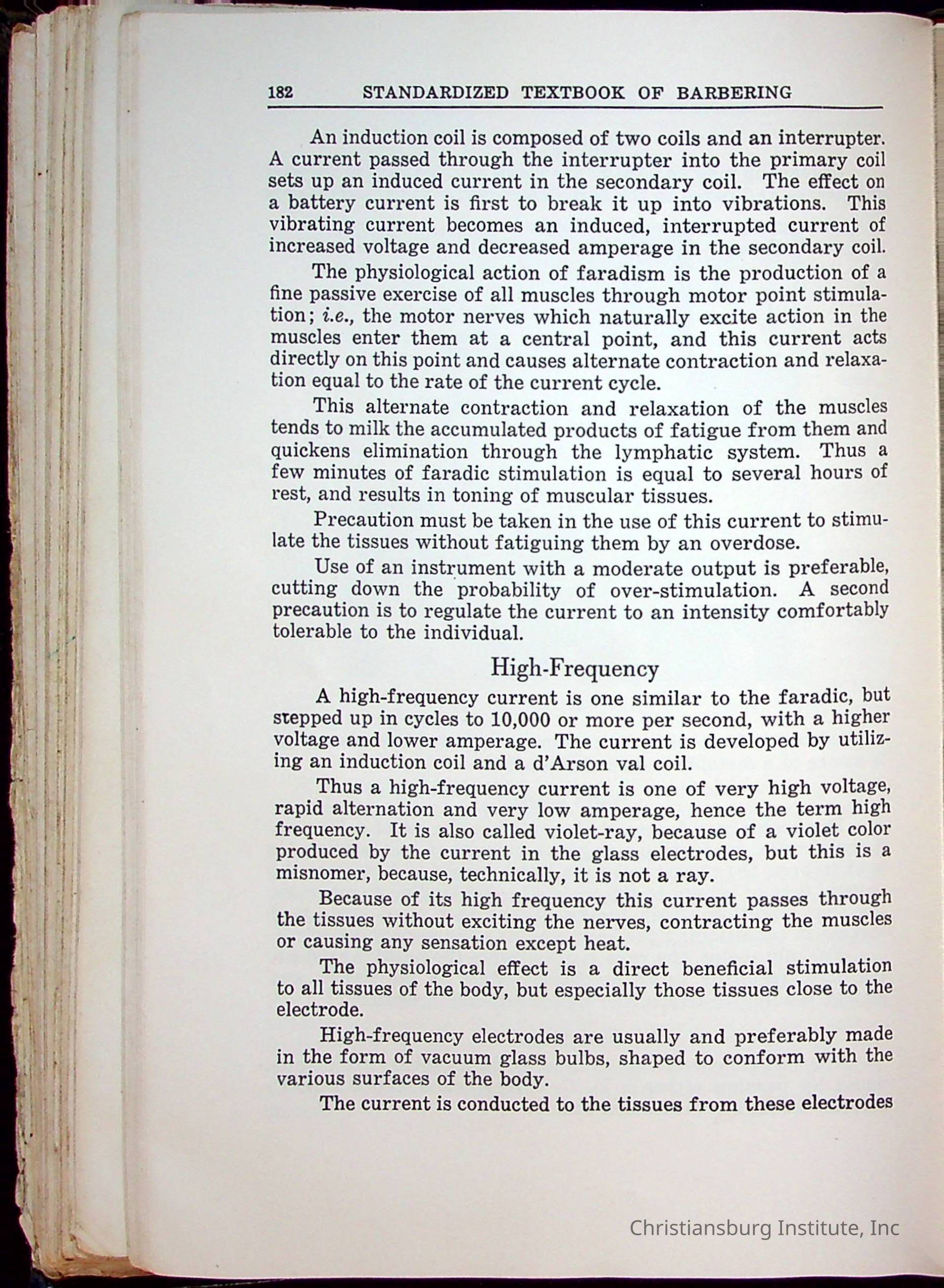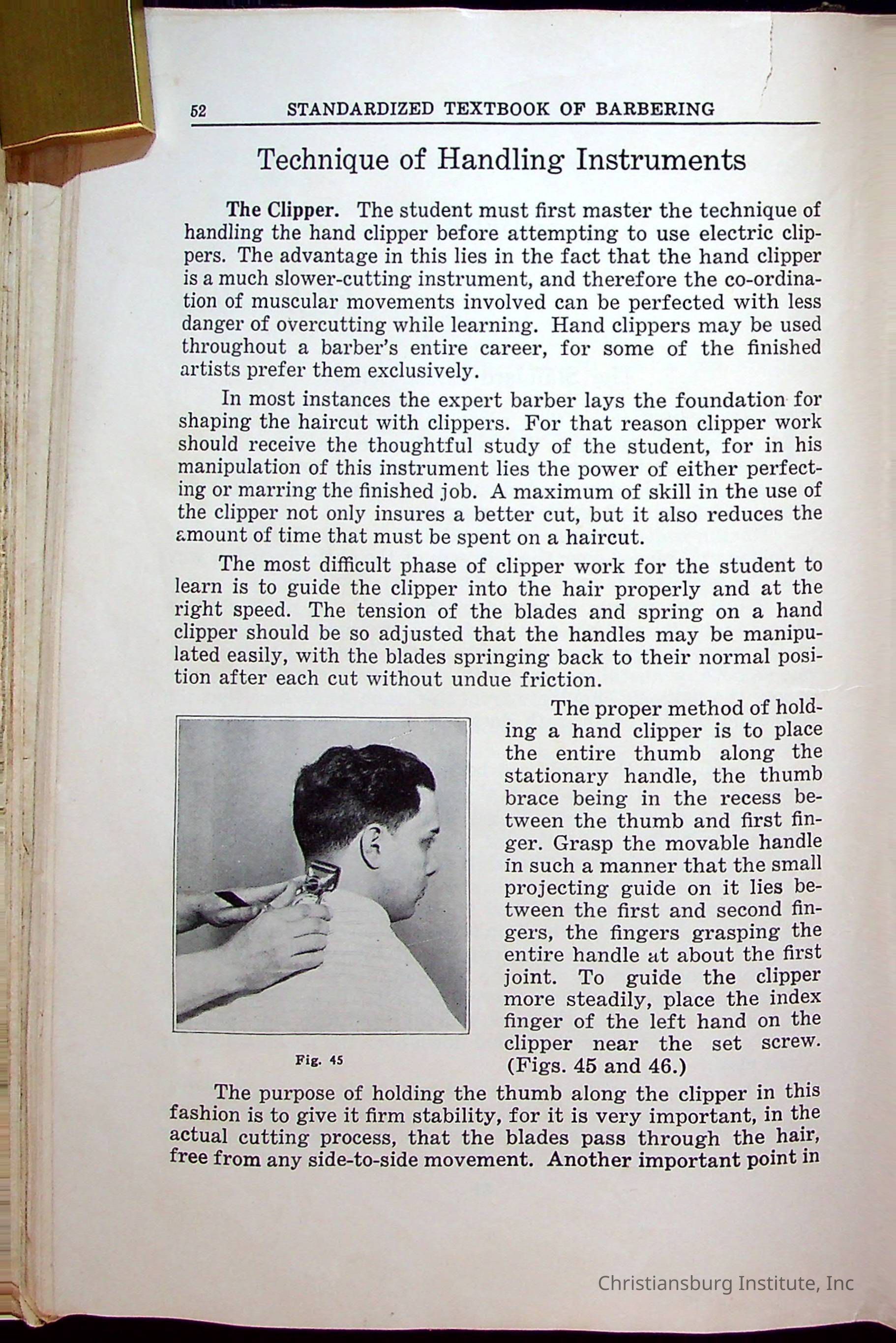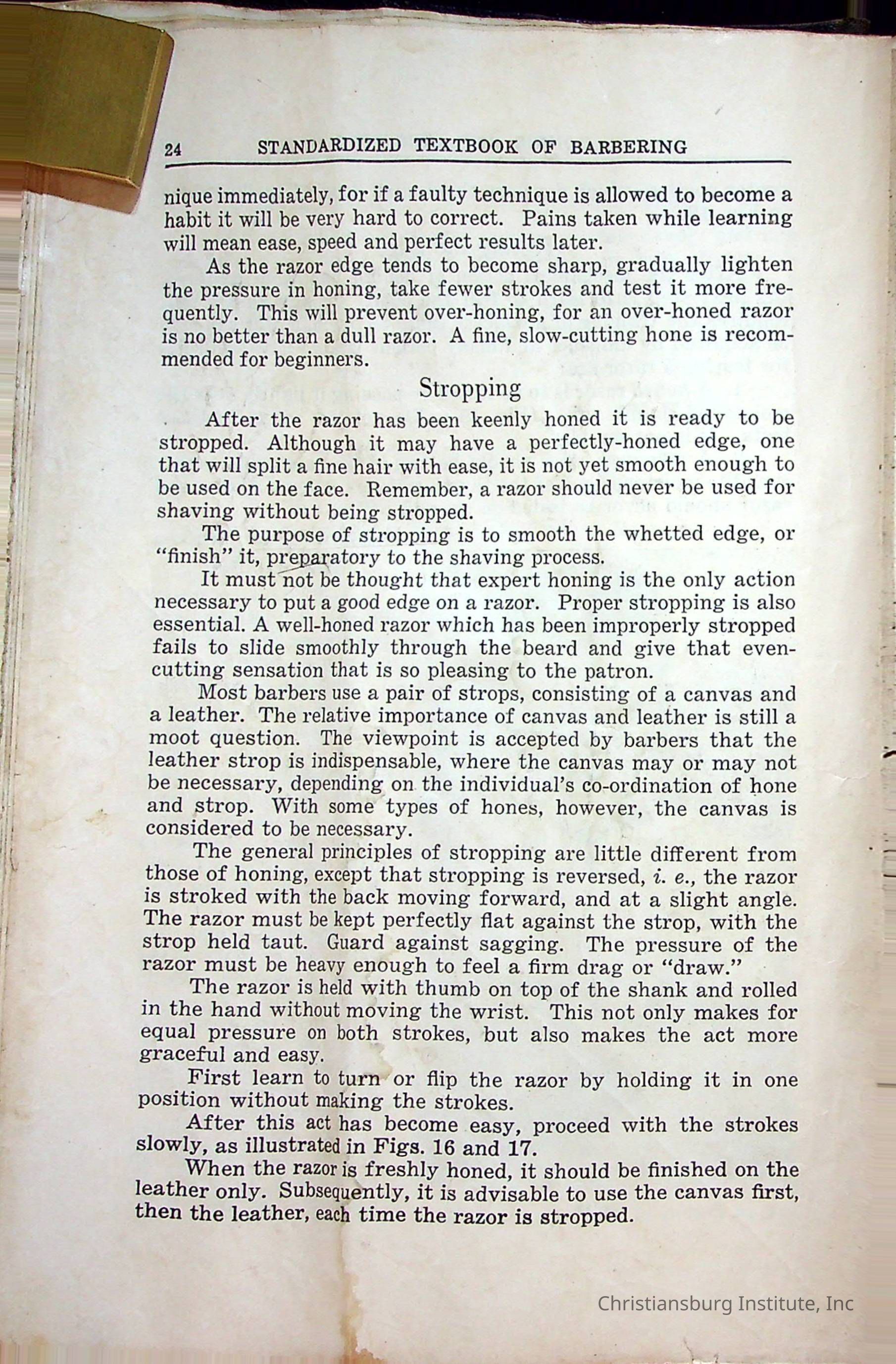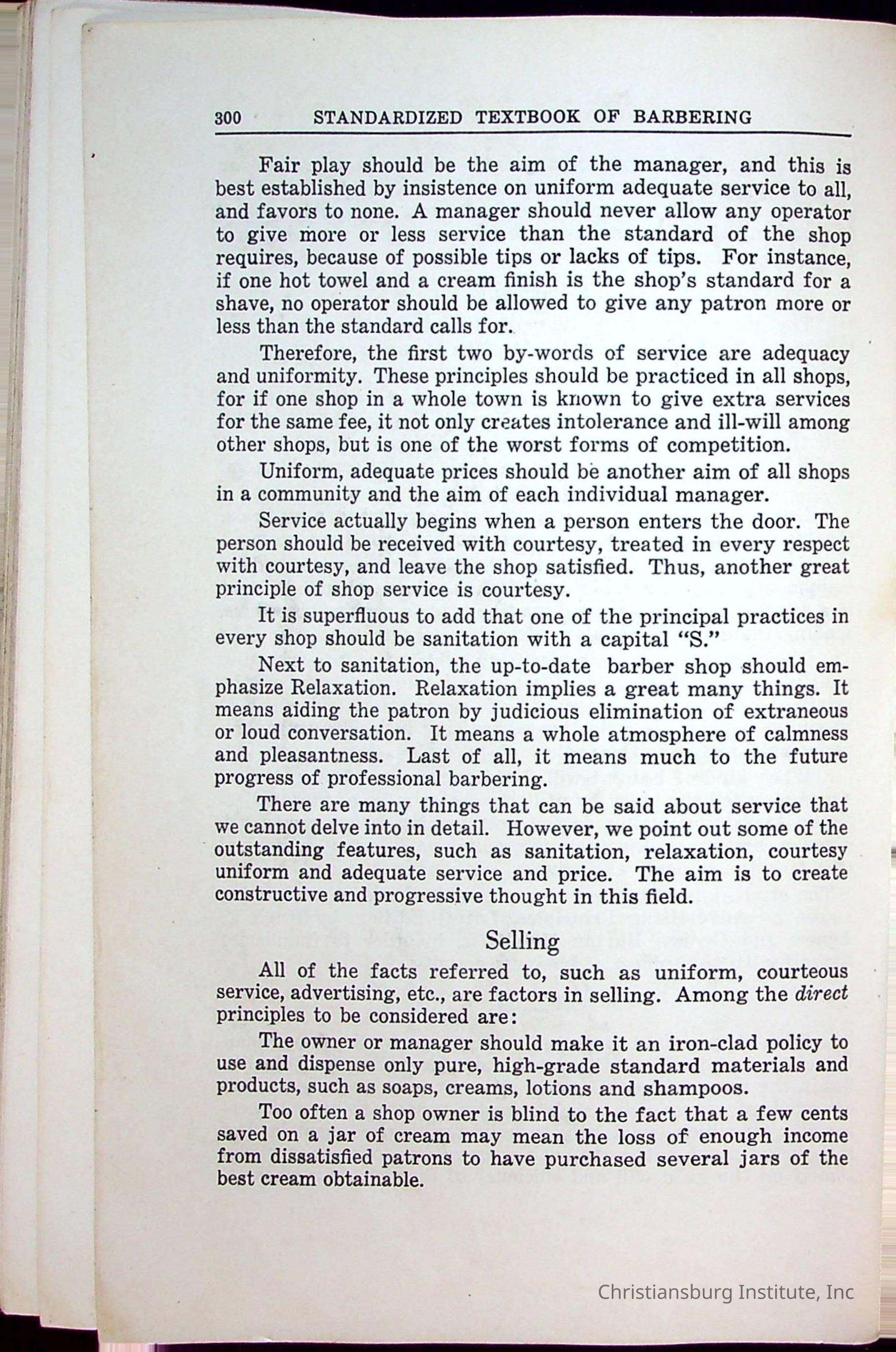 "Standardized Textbook of Barbering: in Two Parts" written and published by the Associated Master Barbers and Beauticians of America in the year 1950. This textbook was in the Christiansburg Institute library.