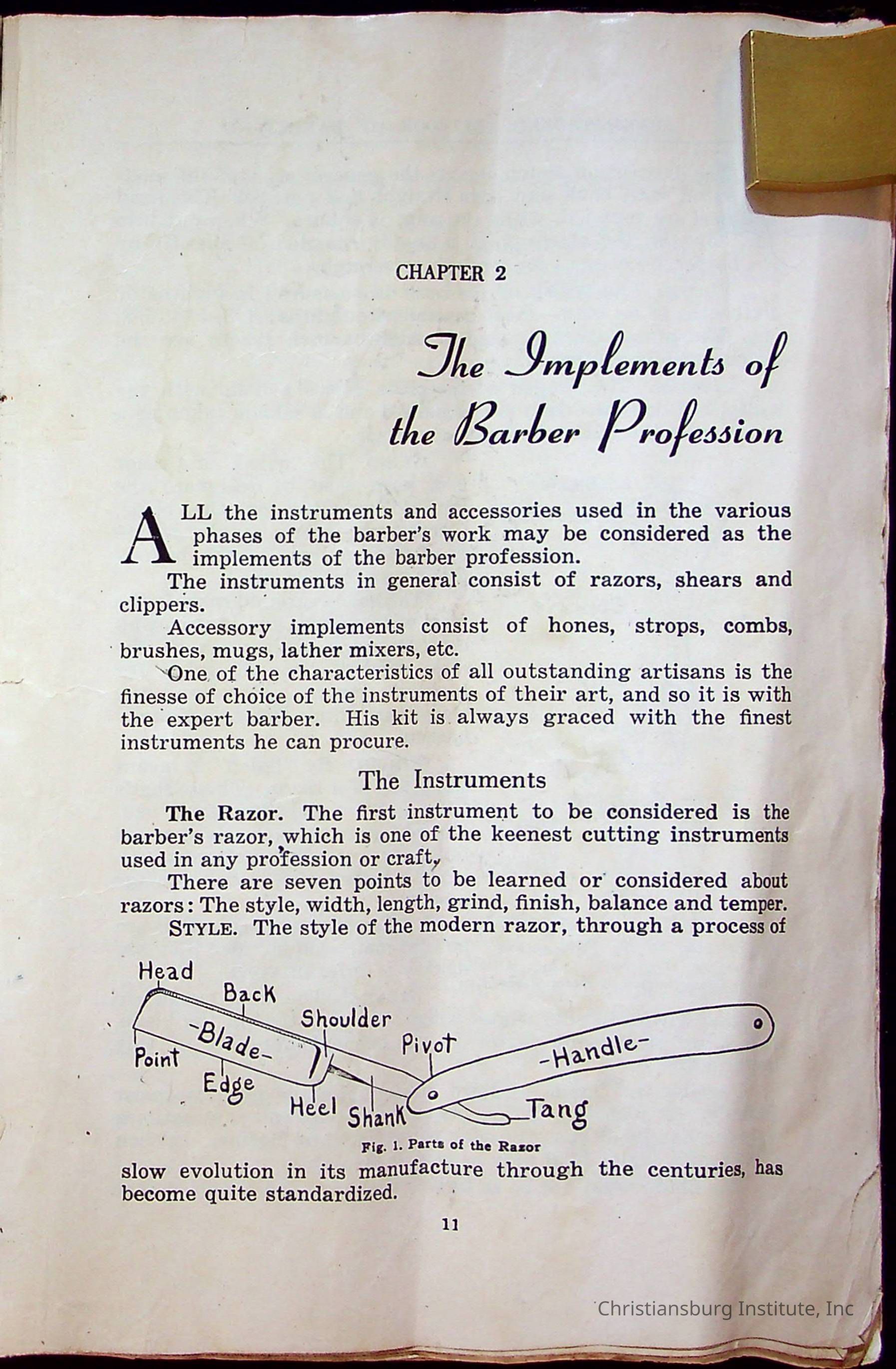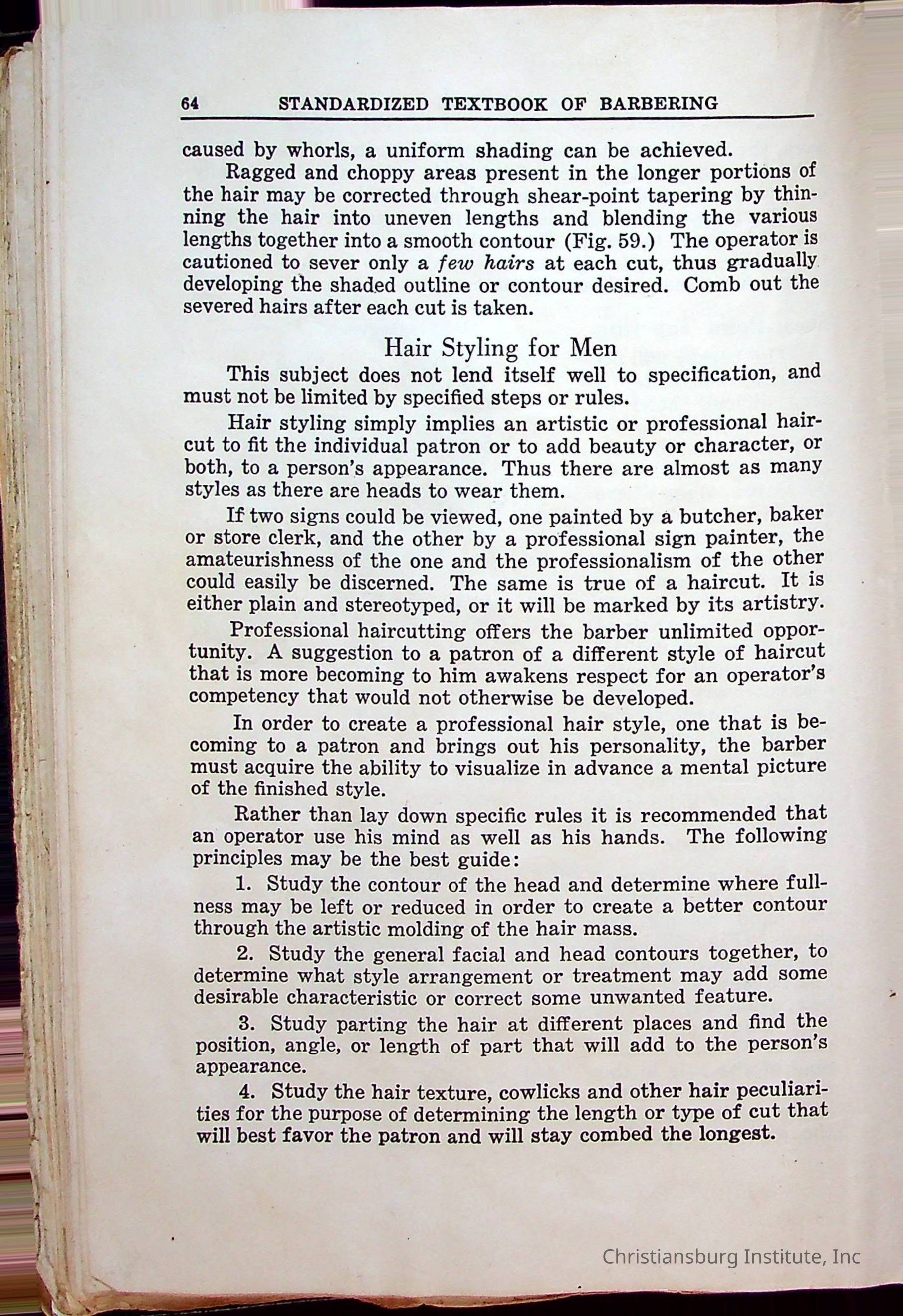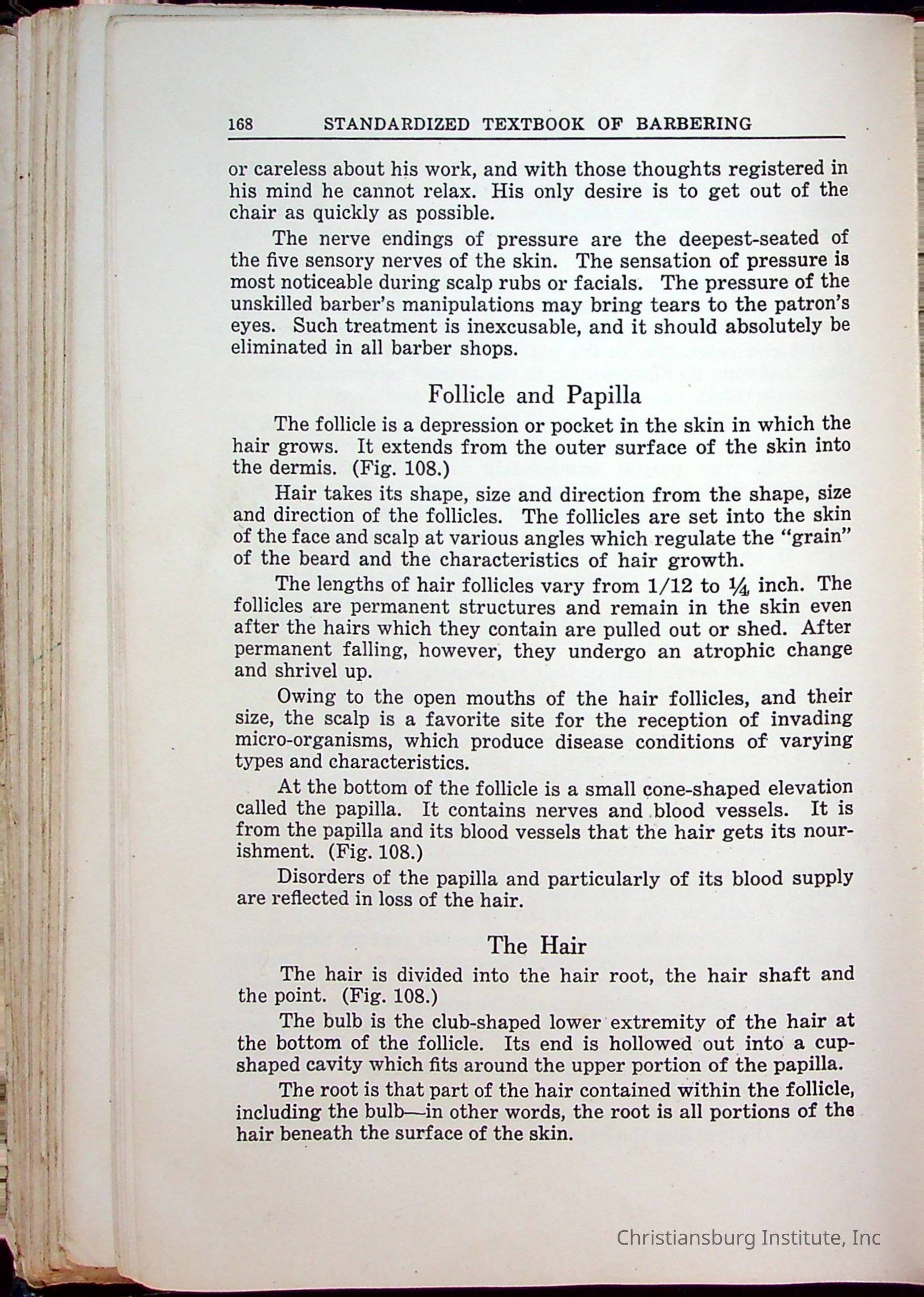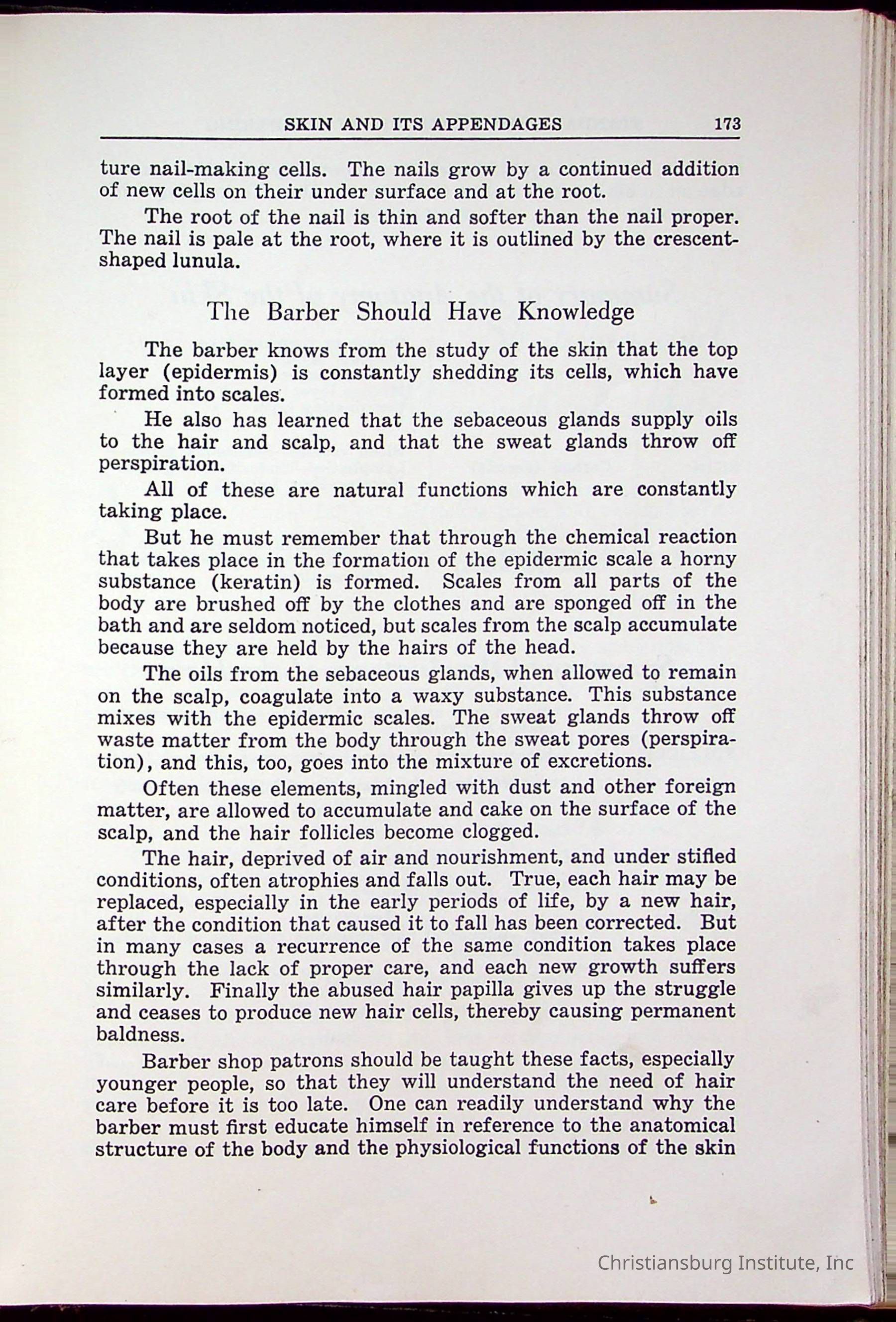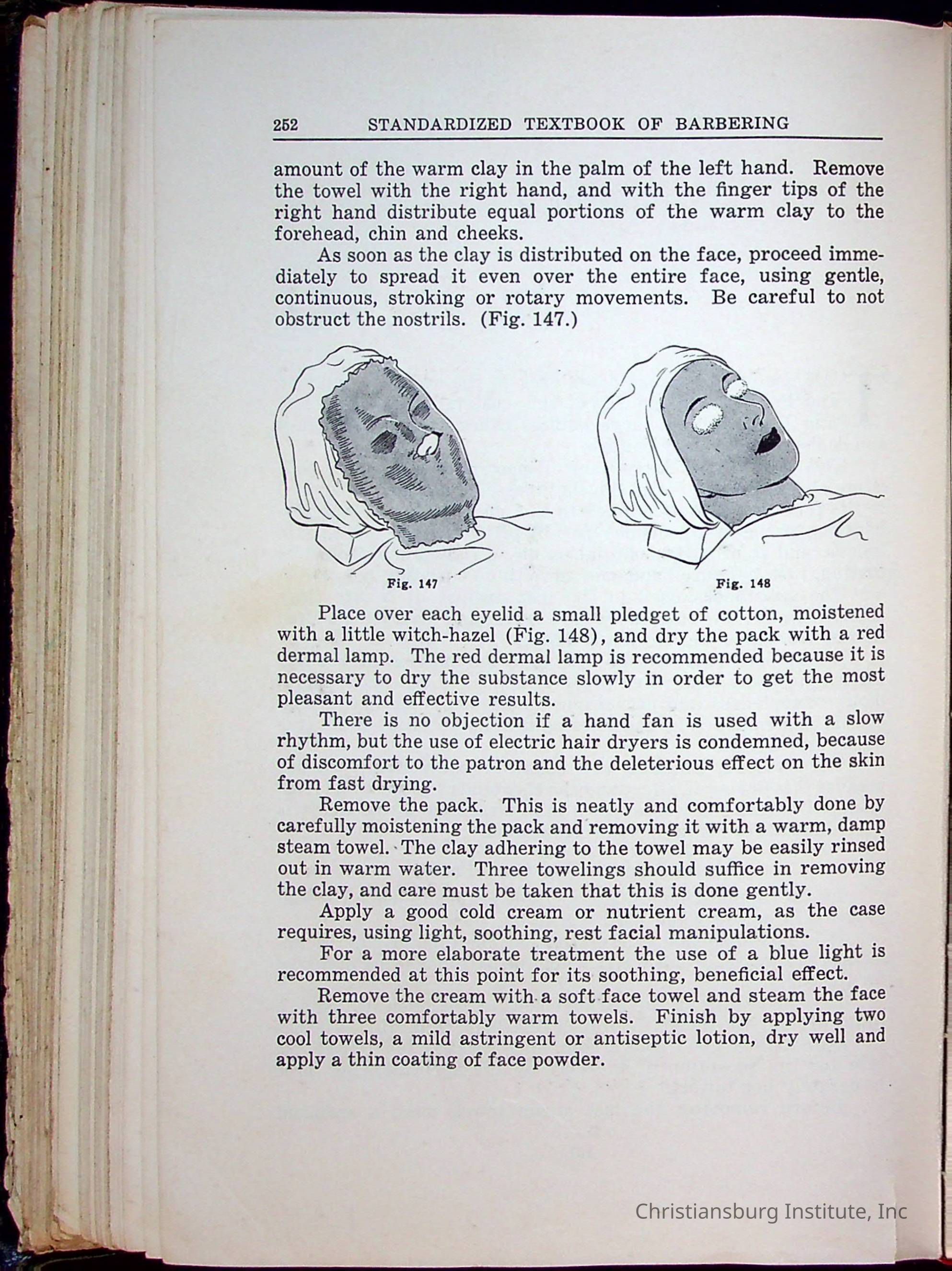 "Standardized Textbook of Barbering: in Two Parts" written and published by the Associated Master Barbers and Beauticians of America in the year 1950. This textbook was in the Christiansburg Institute library.
