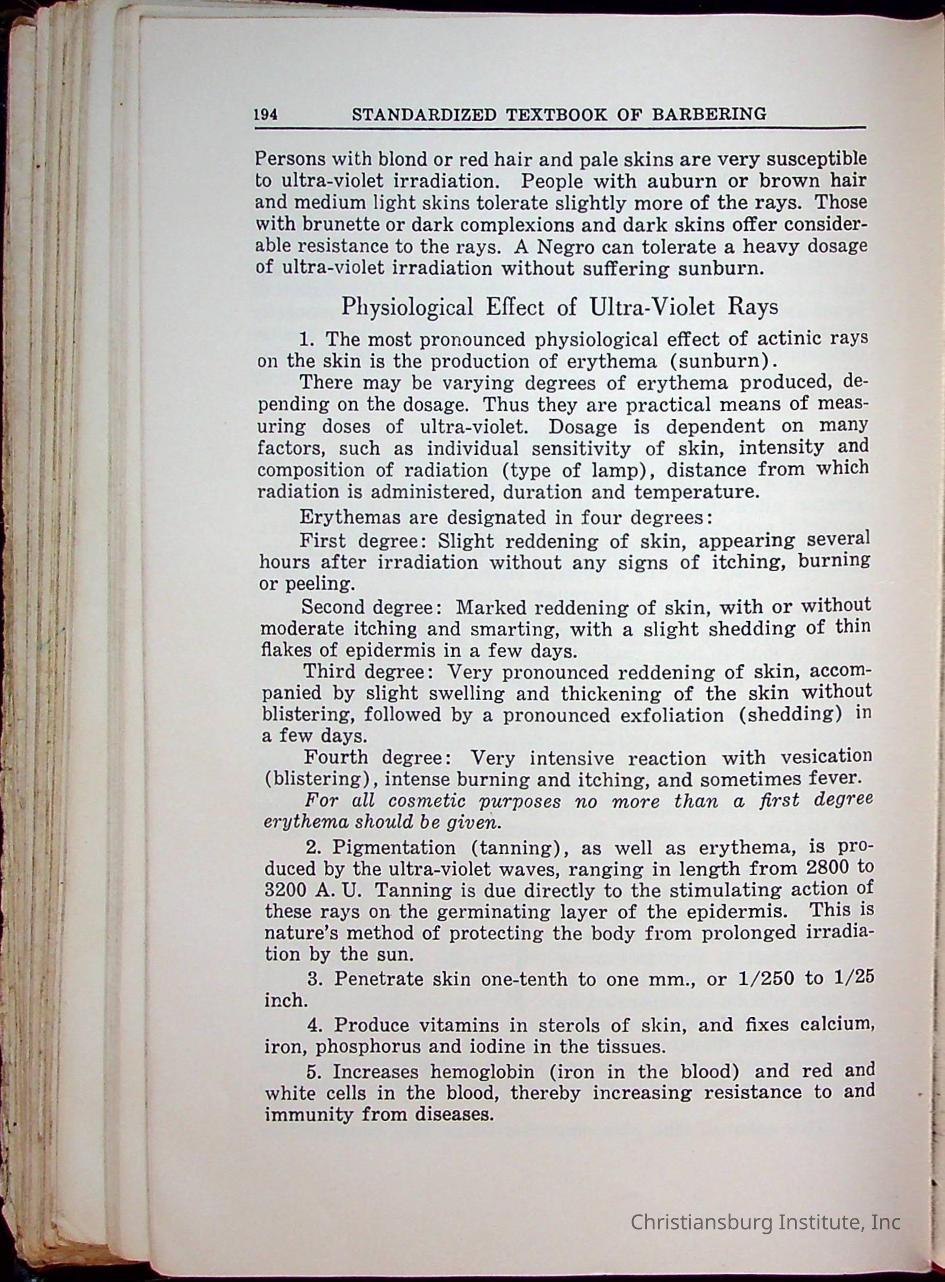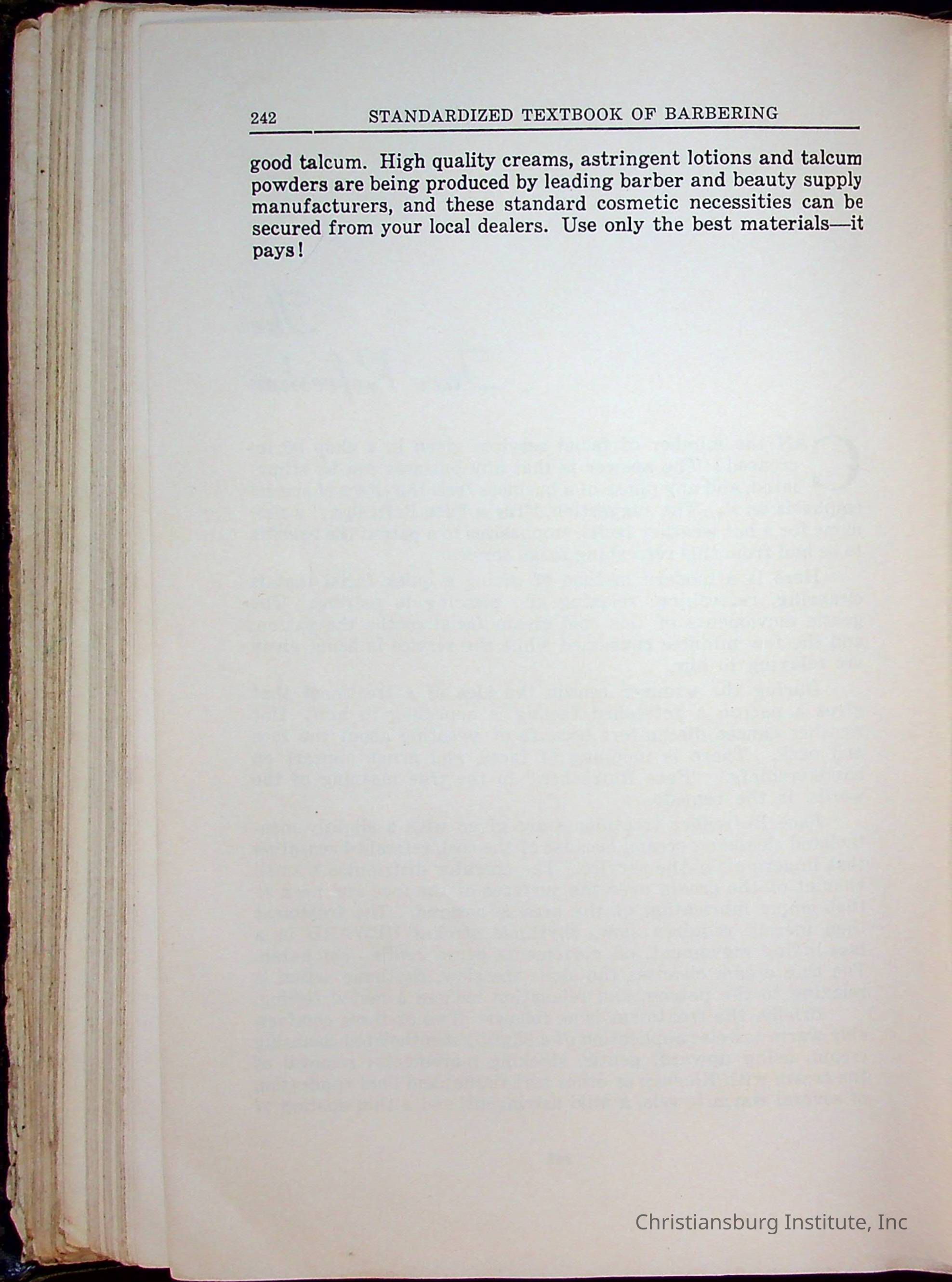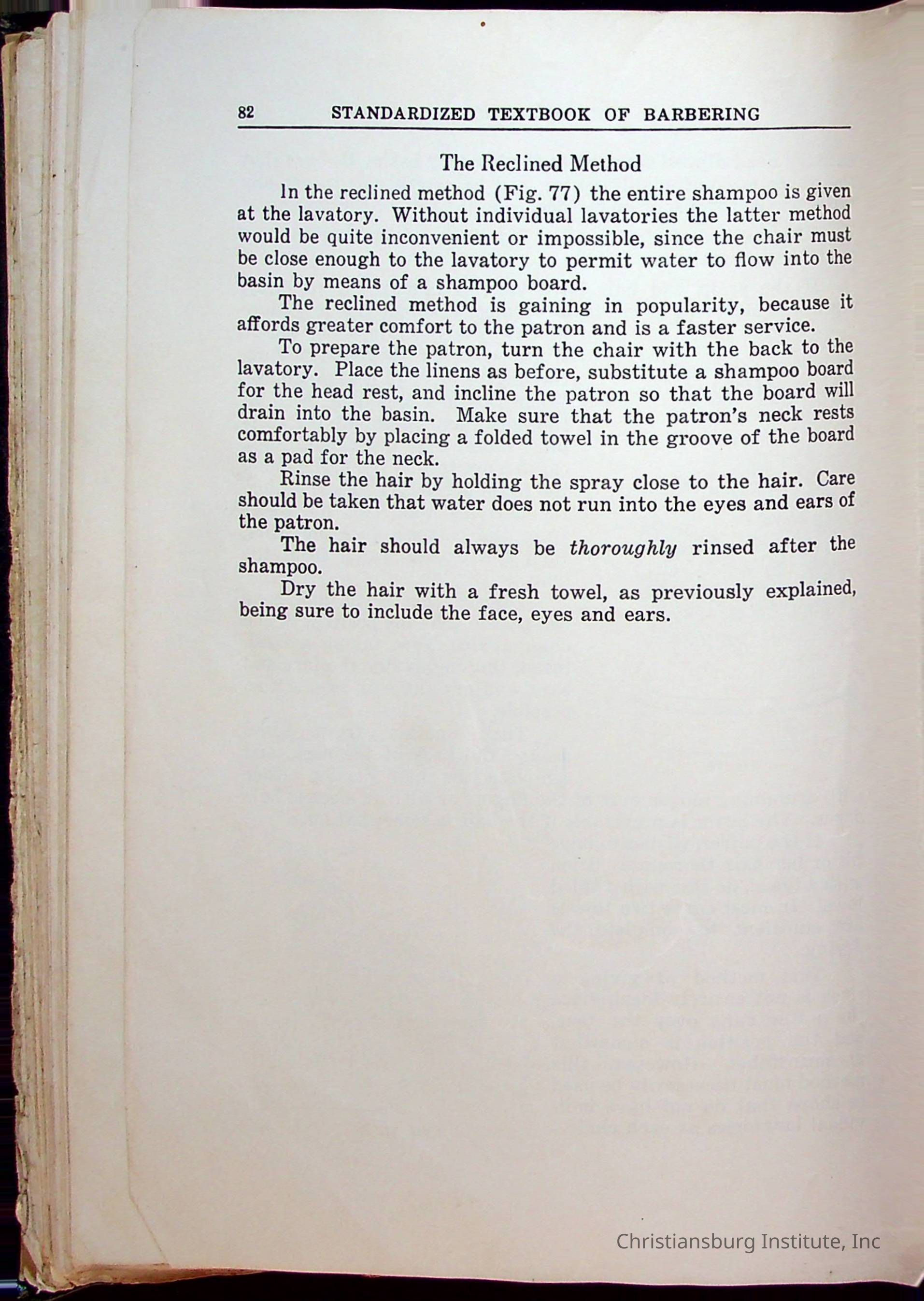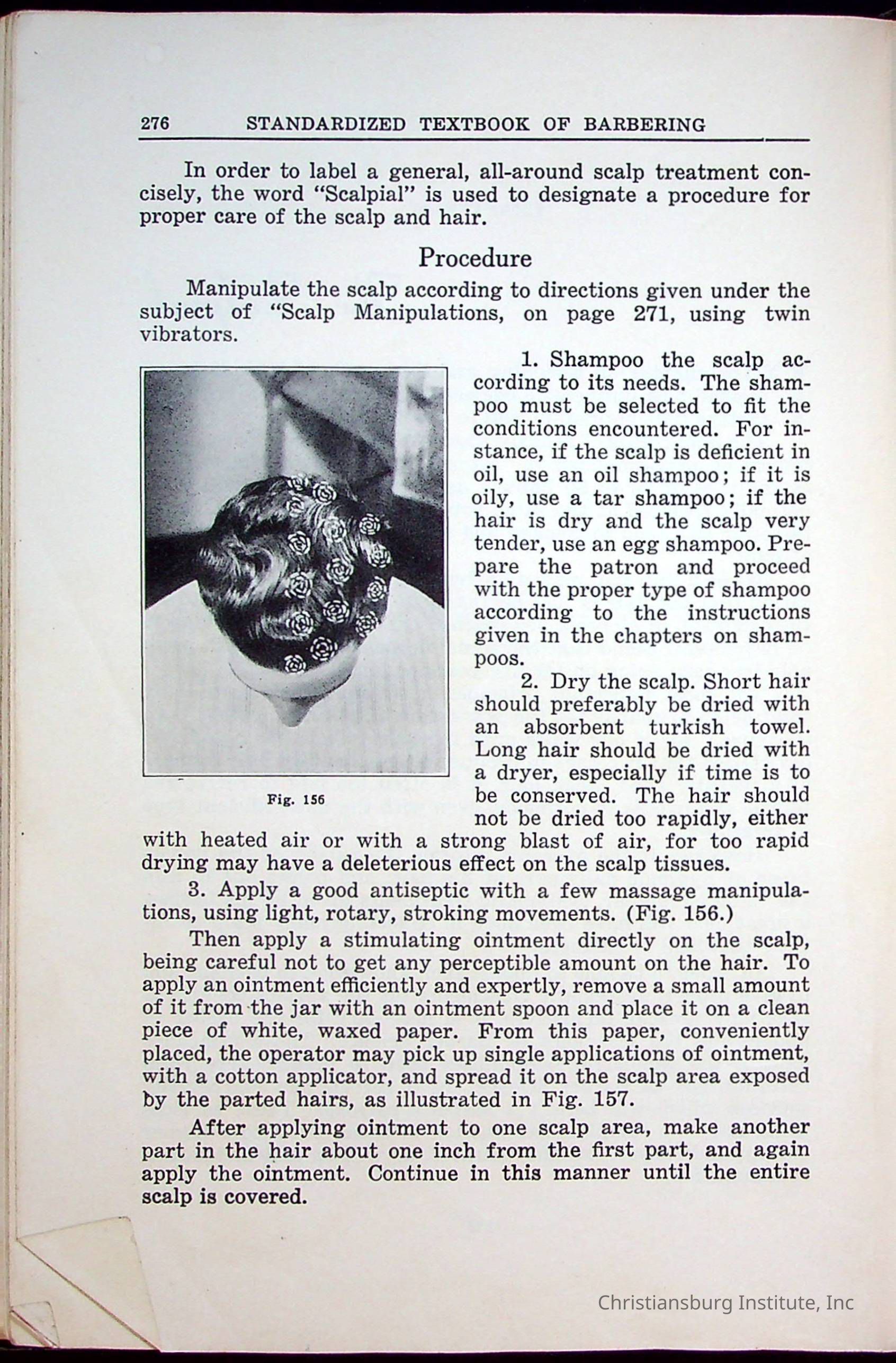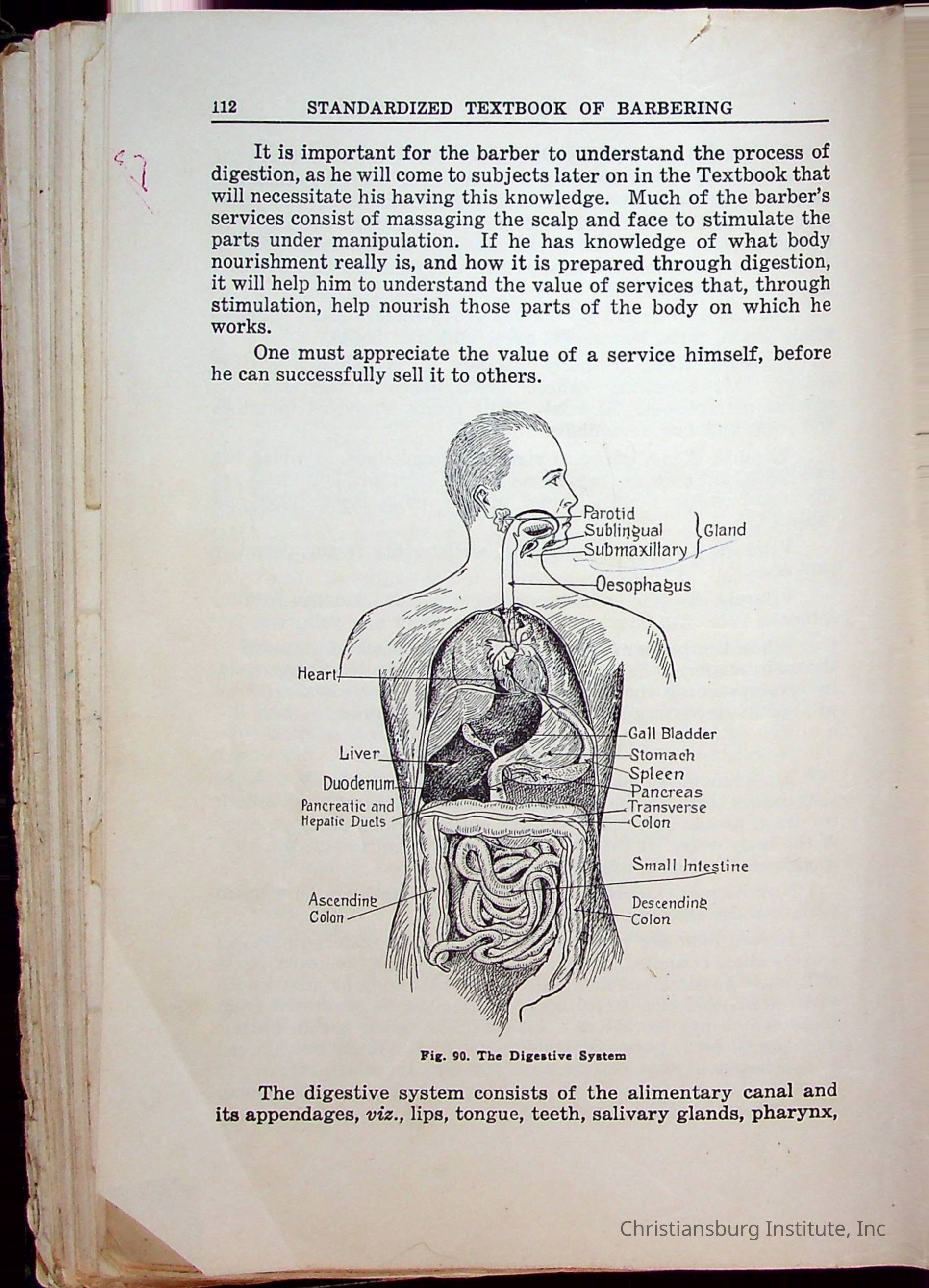 "Standardized Textbook of Barbering: in Two Parts" written and published by the Associated Master Barbers and Beauticians of America in the year 1950. This textbook was in the Christiansburg Institute library.