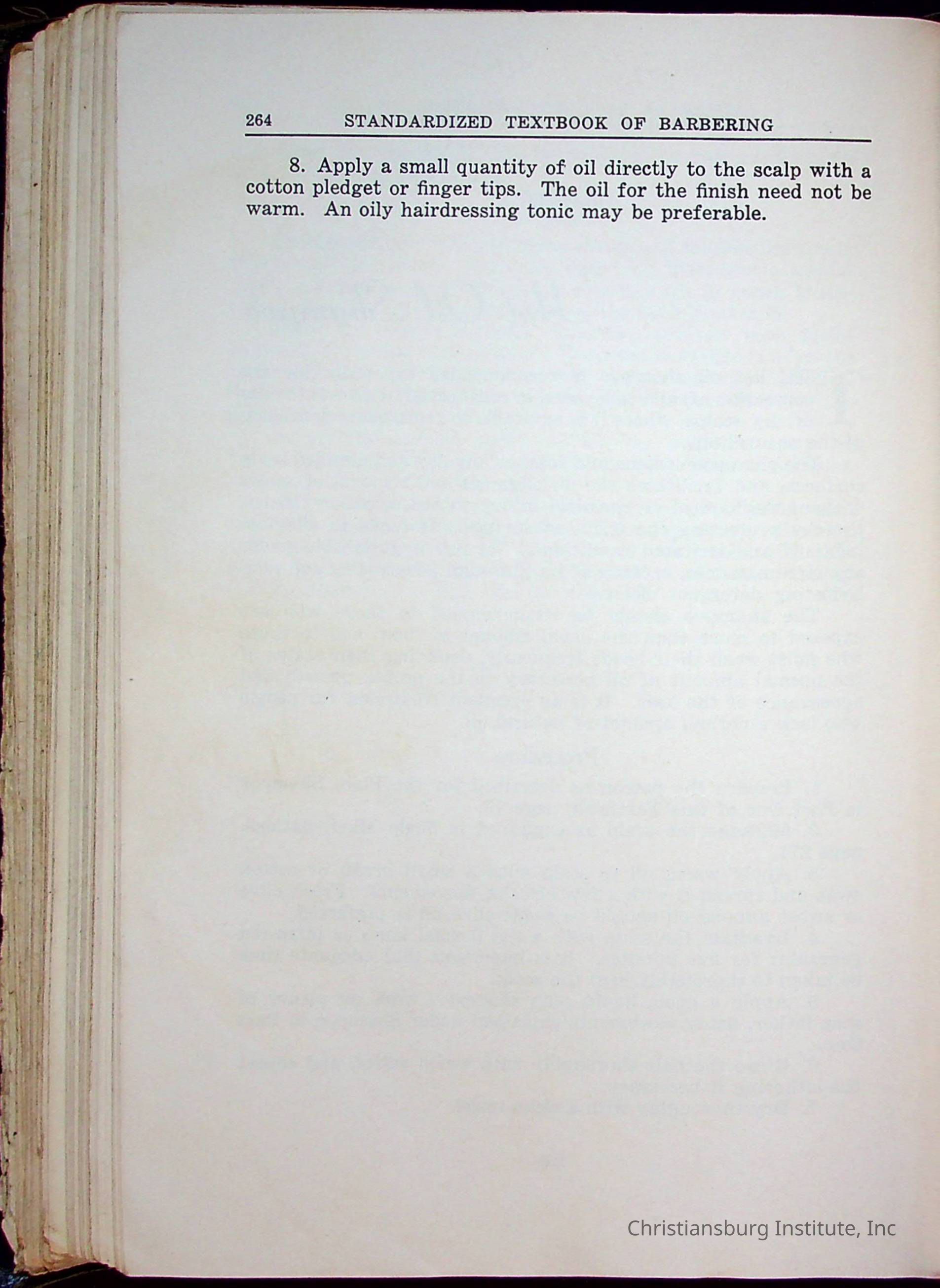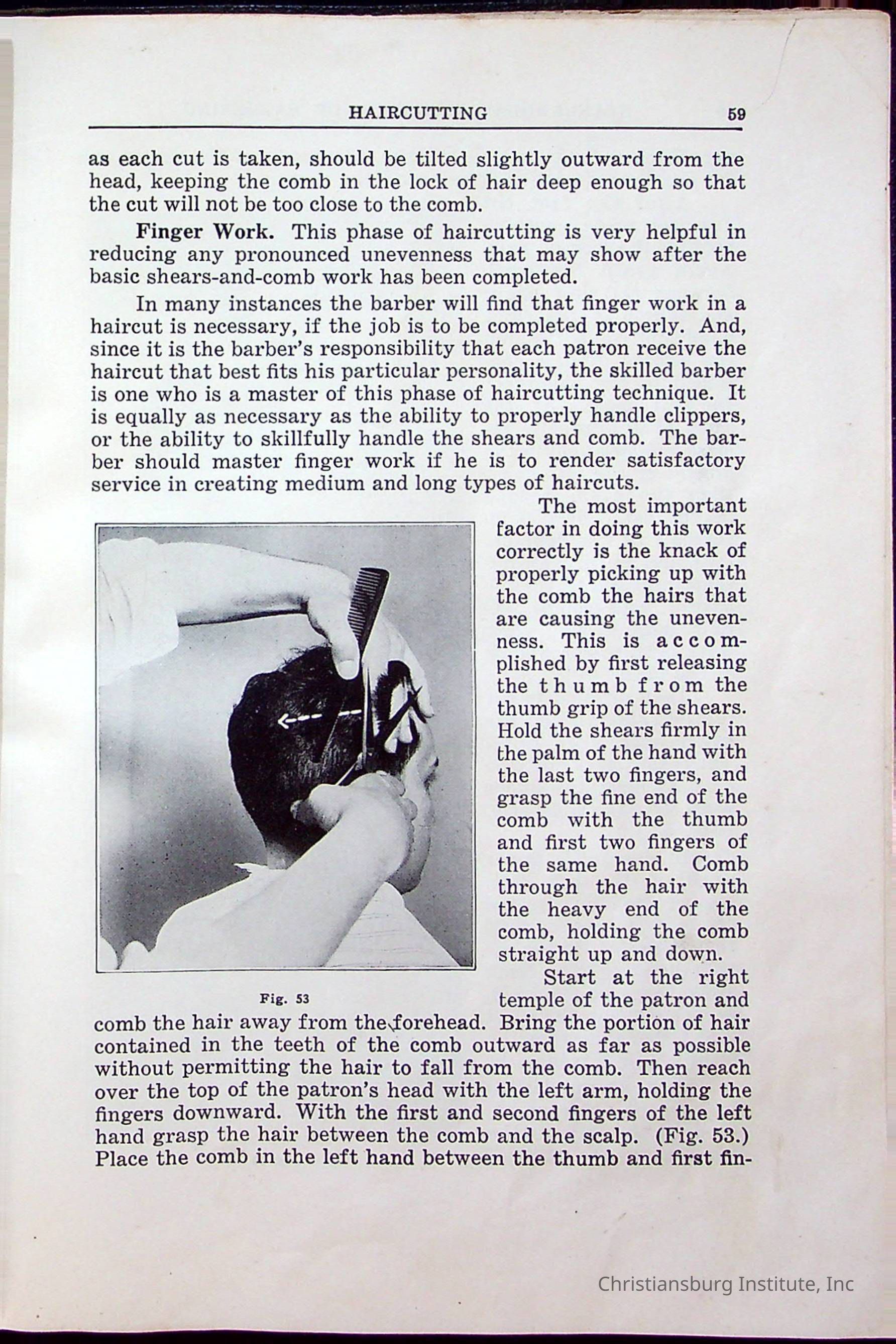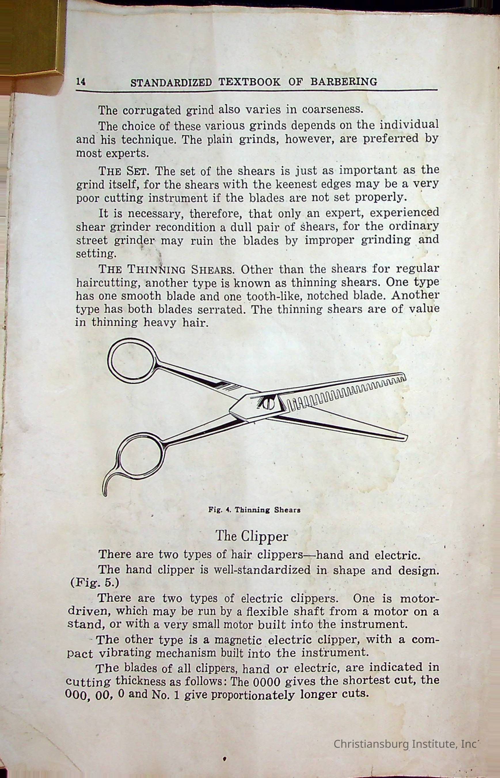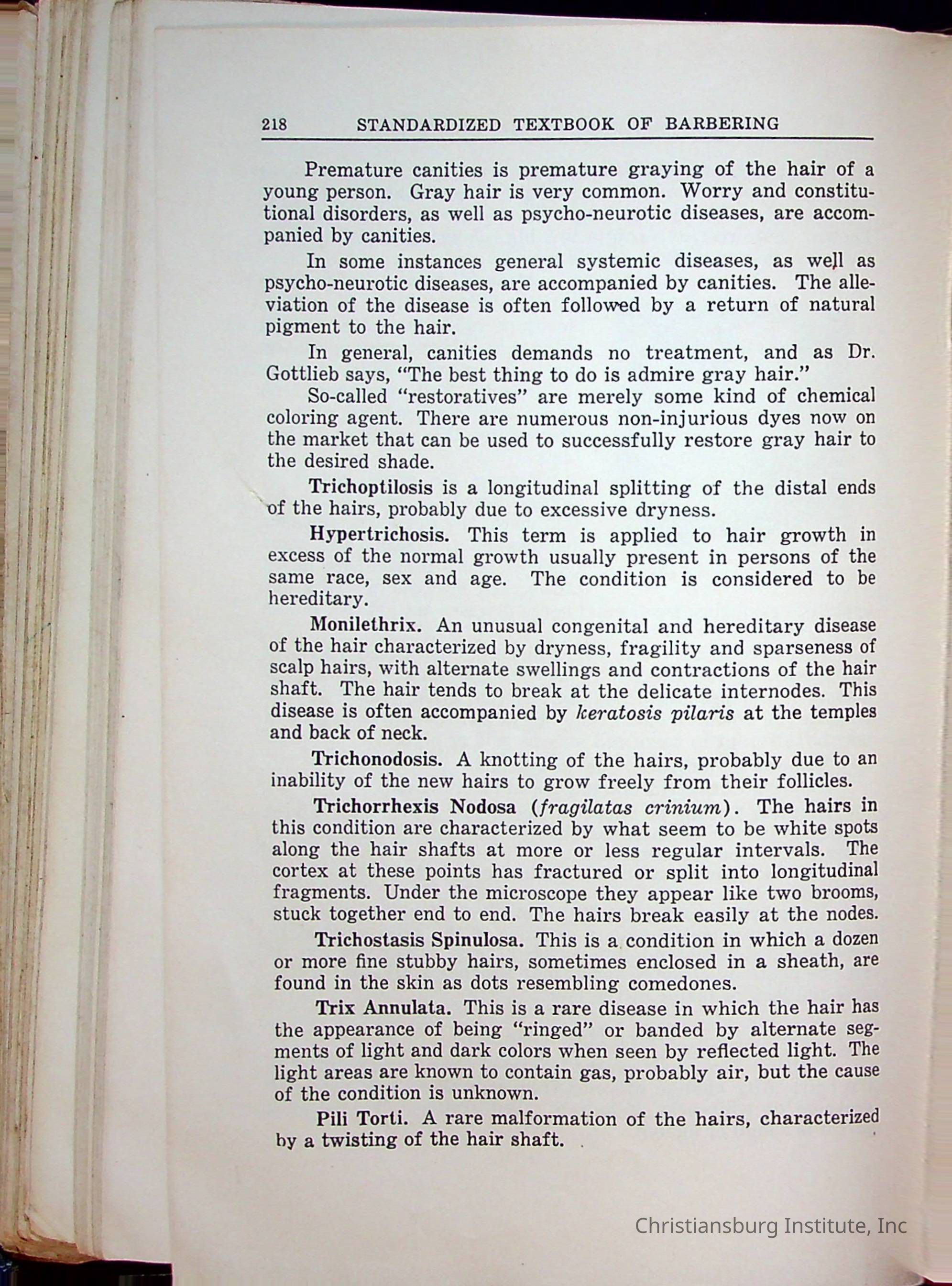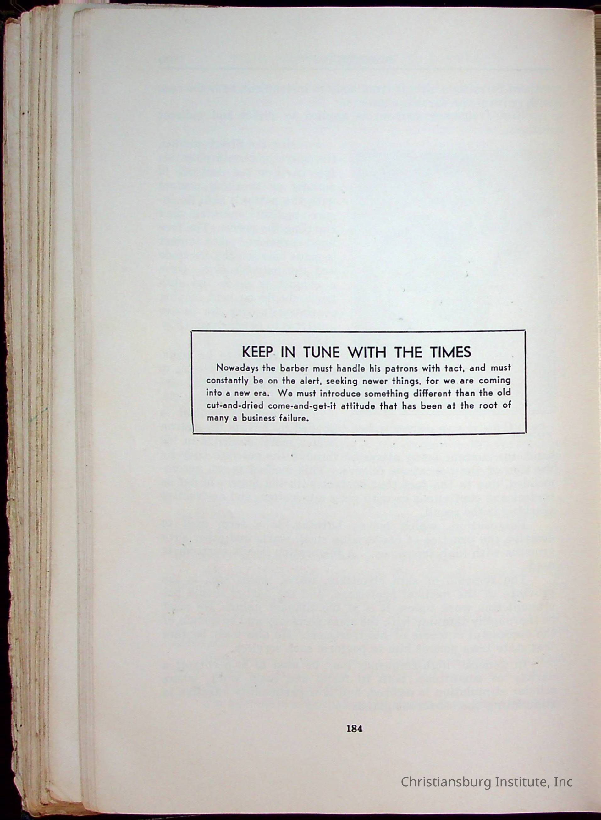 "Standardized Textbook of Barbering: in Two Parts" written and published by the Associated Master Barbers and Beauticians of America in the year 1950. This textbook was in the Christiansburg Institute library.
