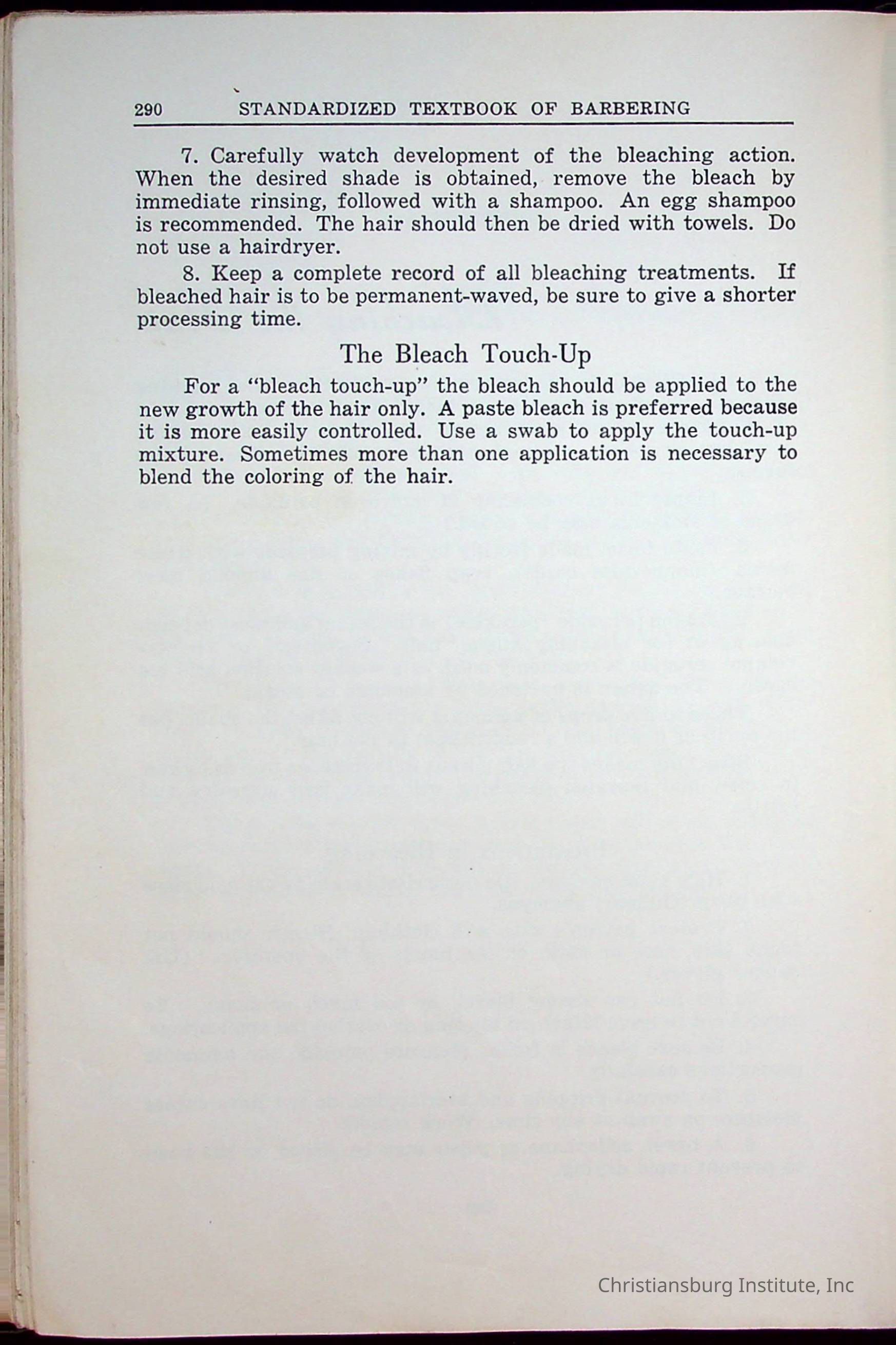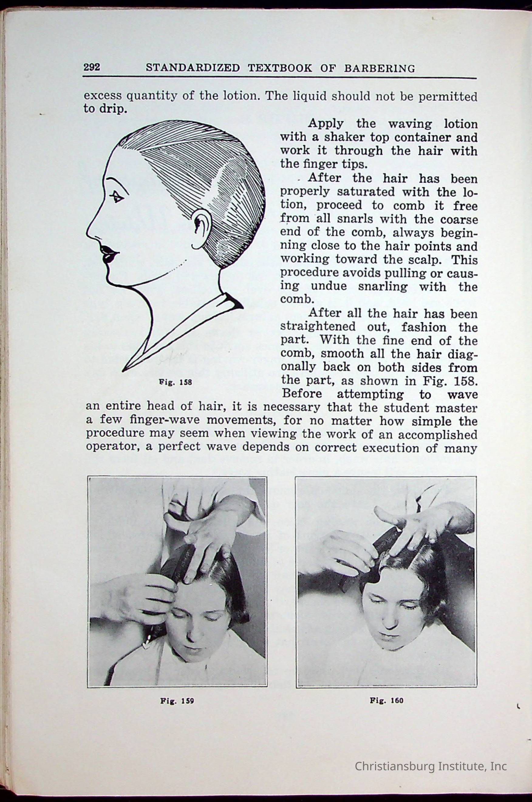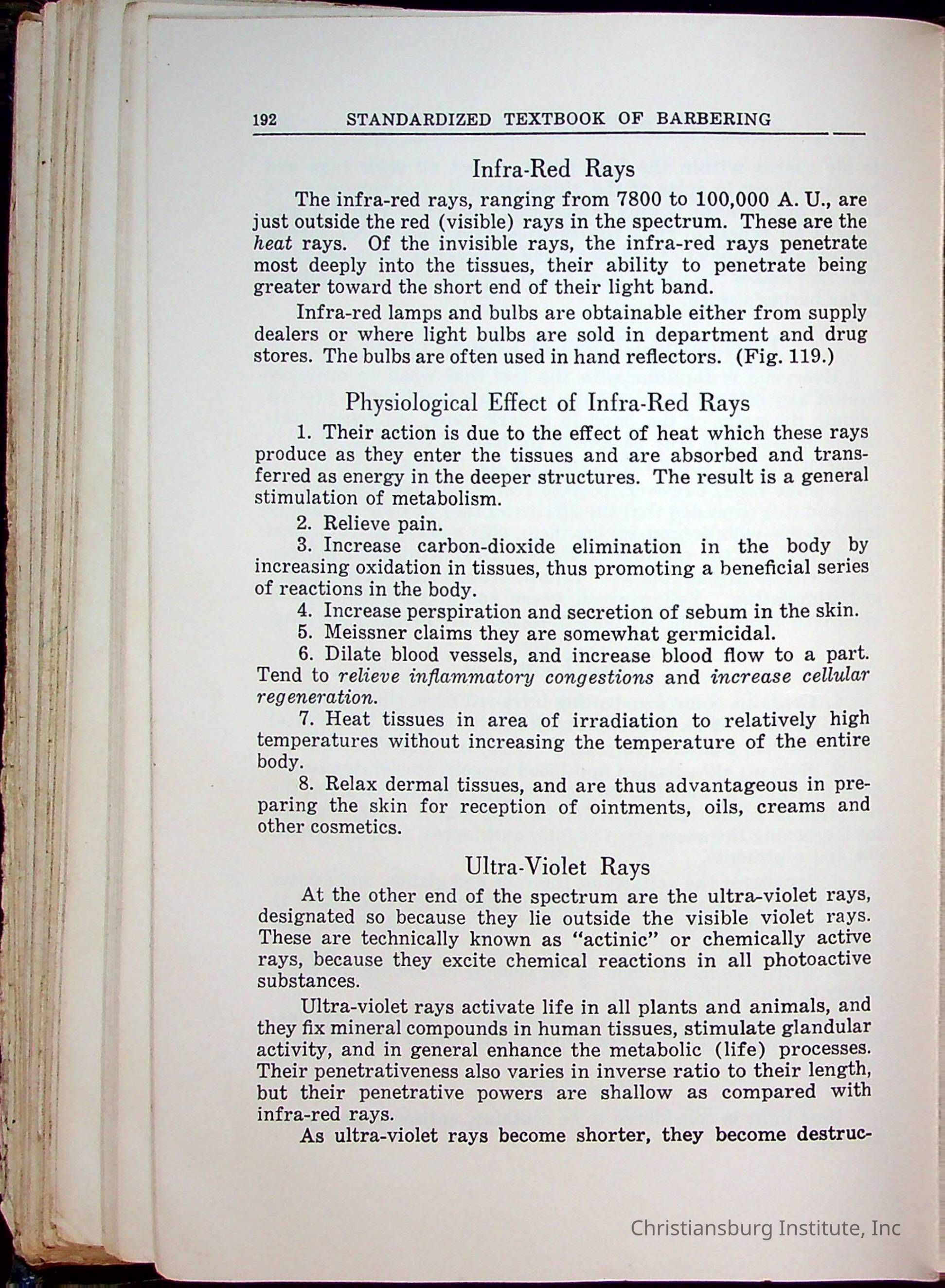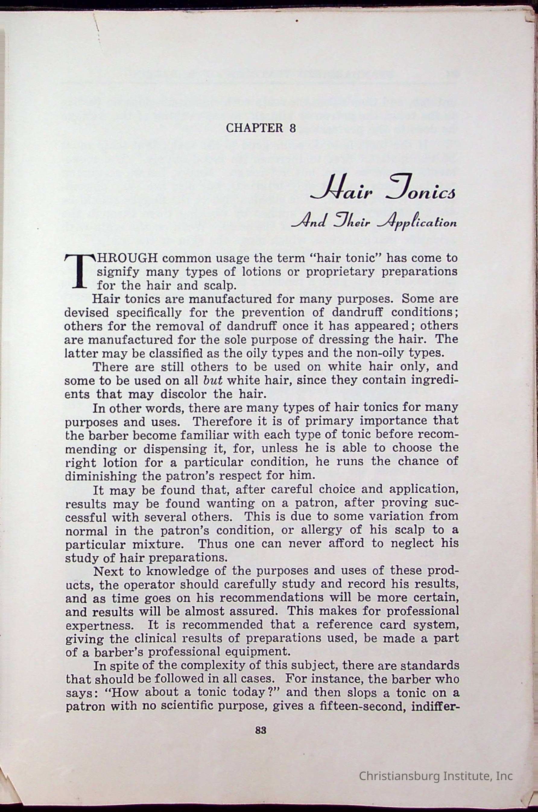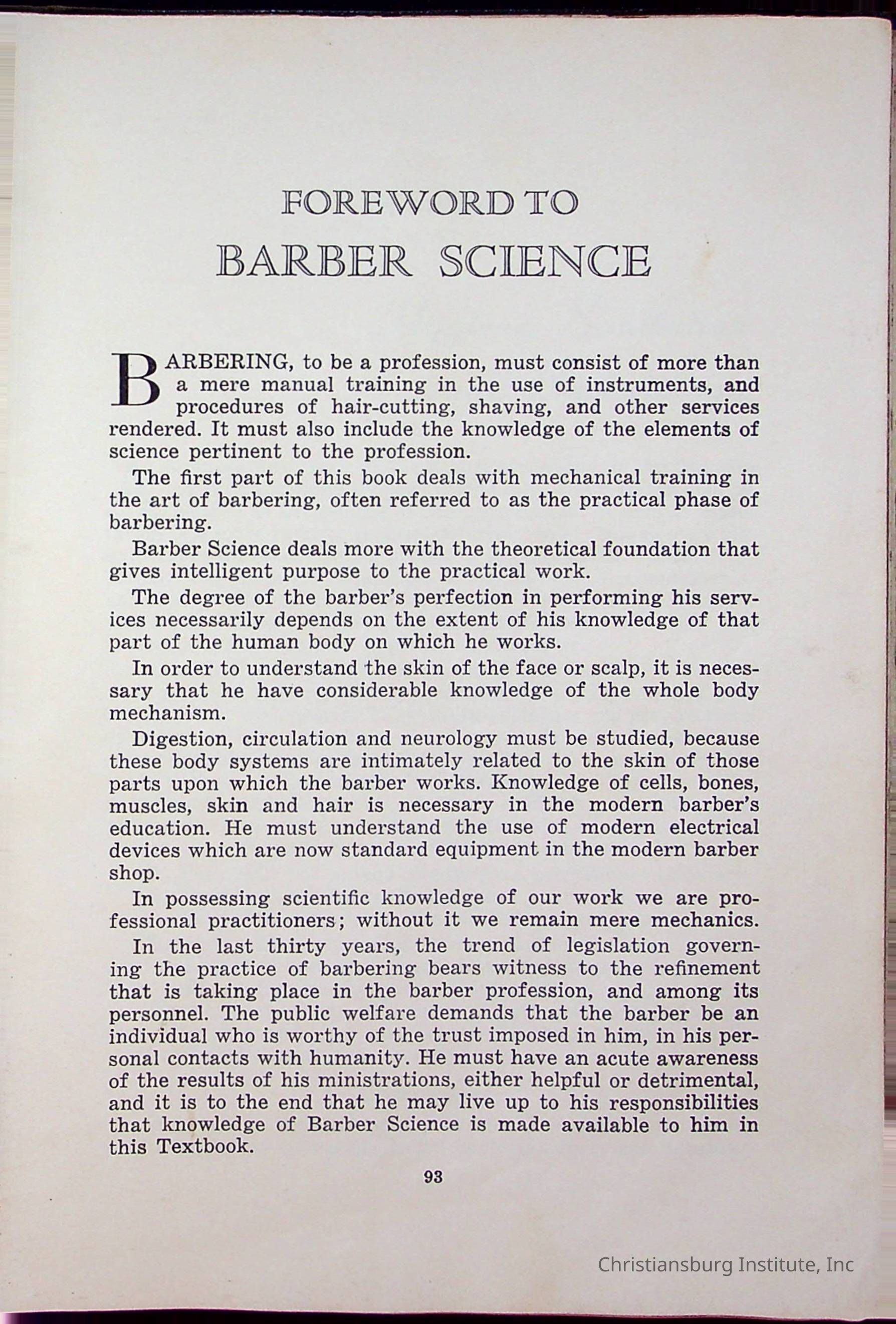 "Standardized Textbook of Barbering: in Two Parts" written and published by the Associated Master Barbers and Beauticians of America in the year 1950. This textbook was in the Christiansburg Institute library.