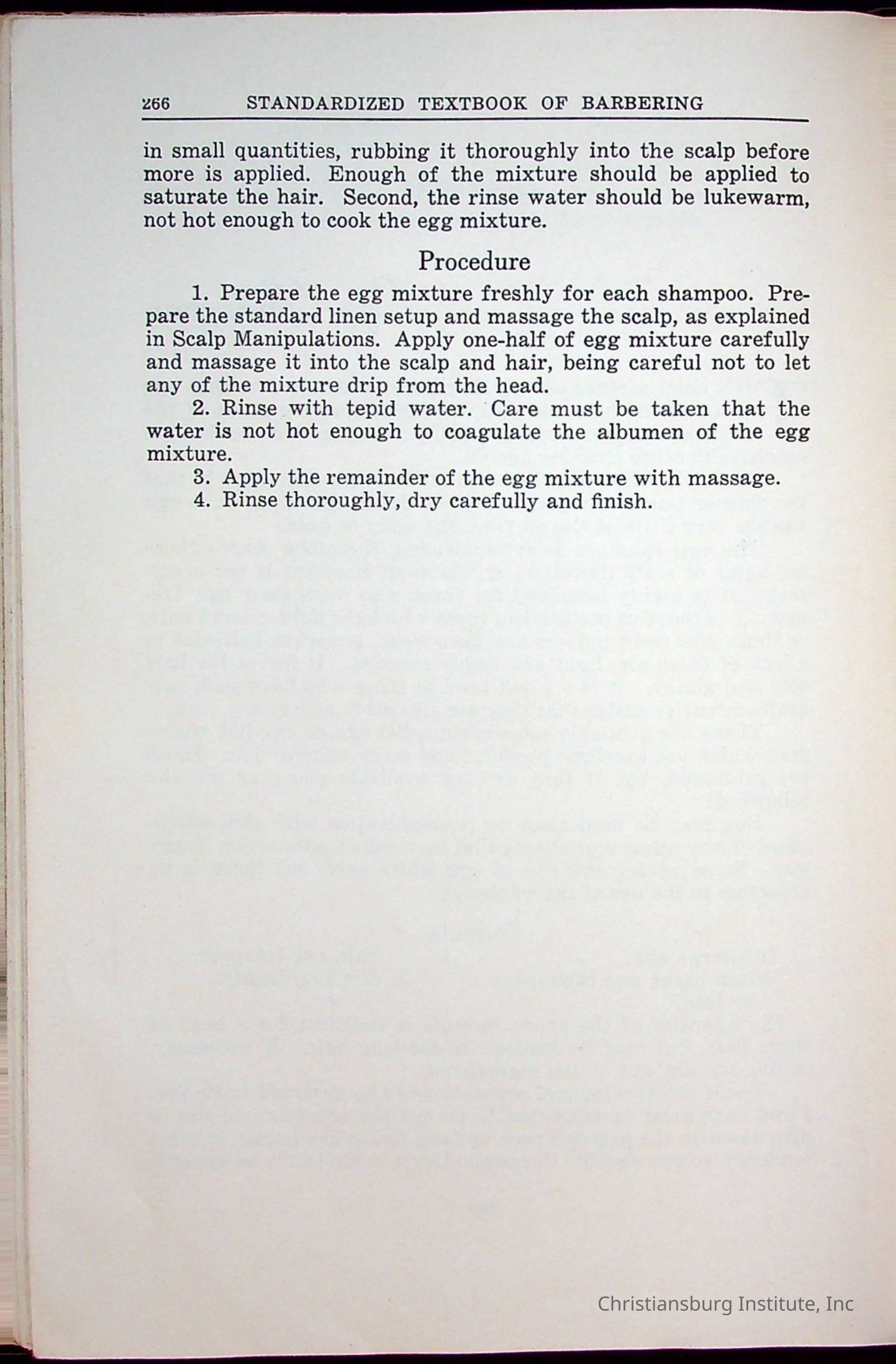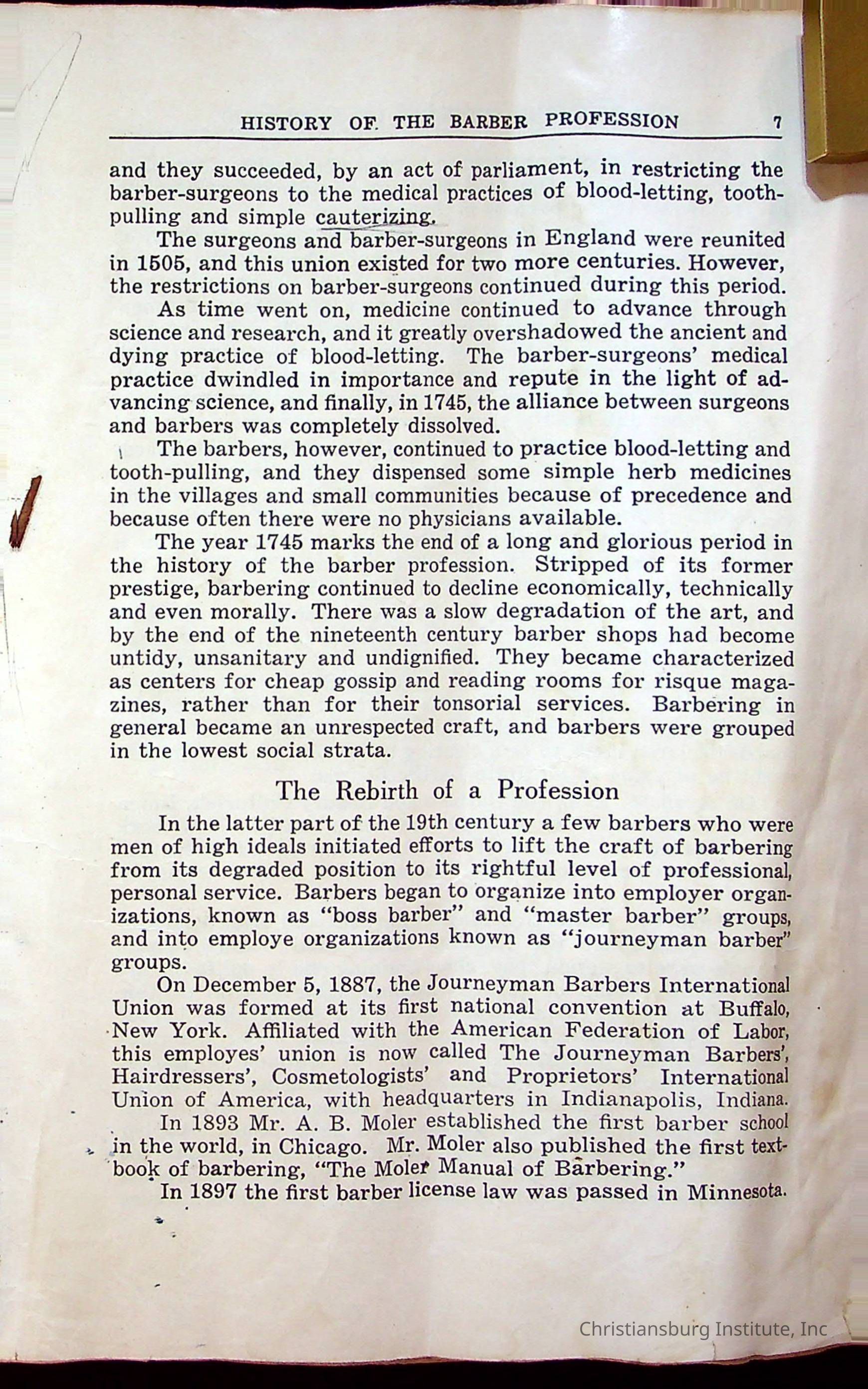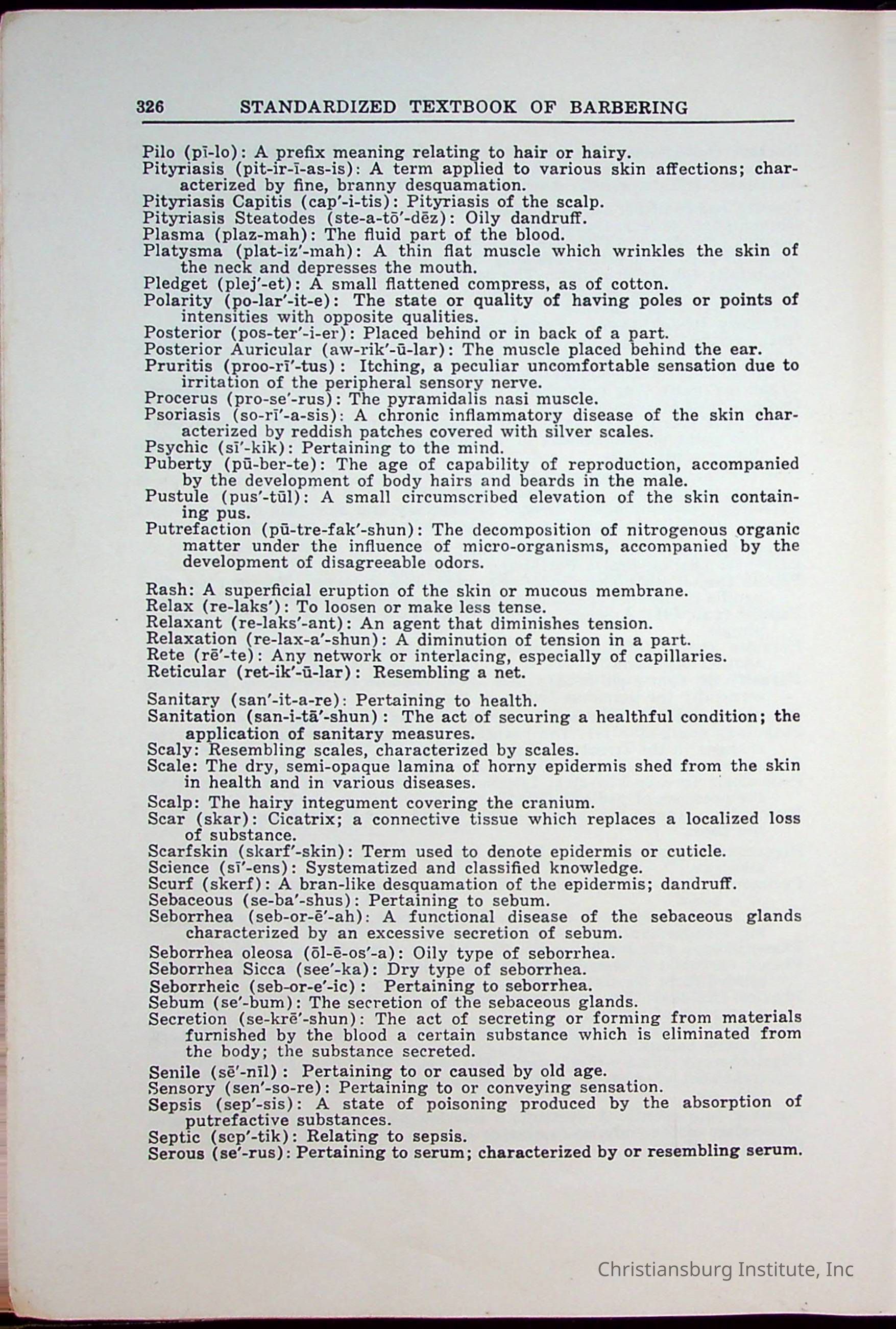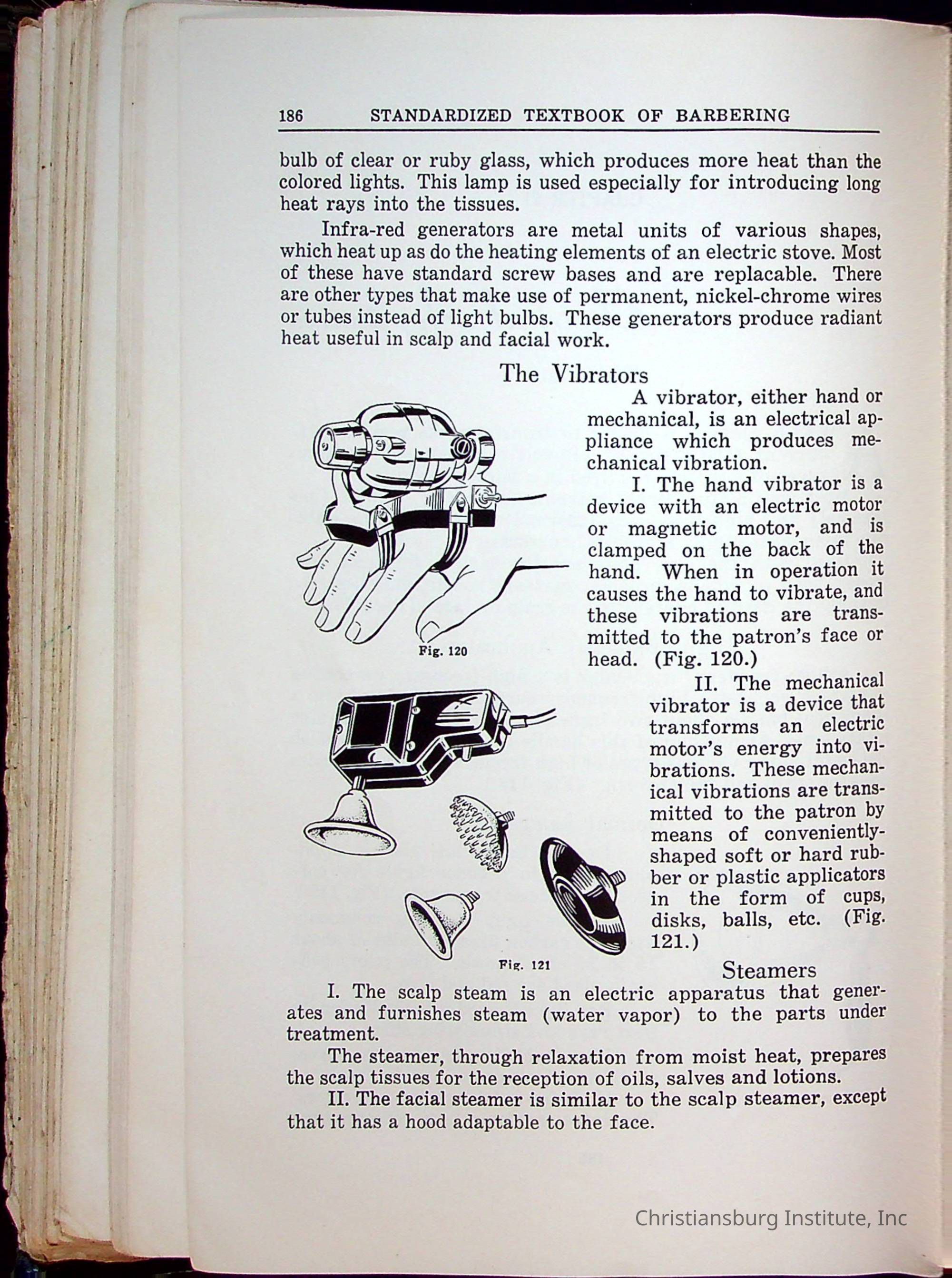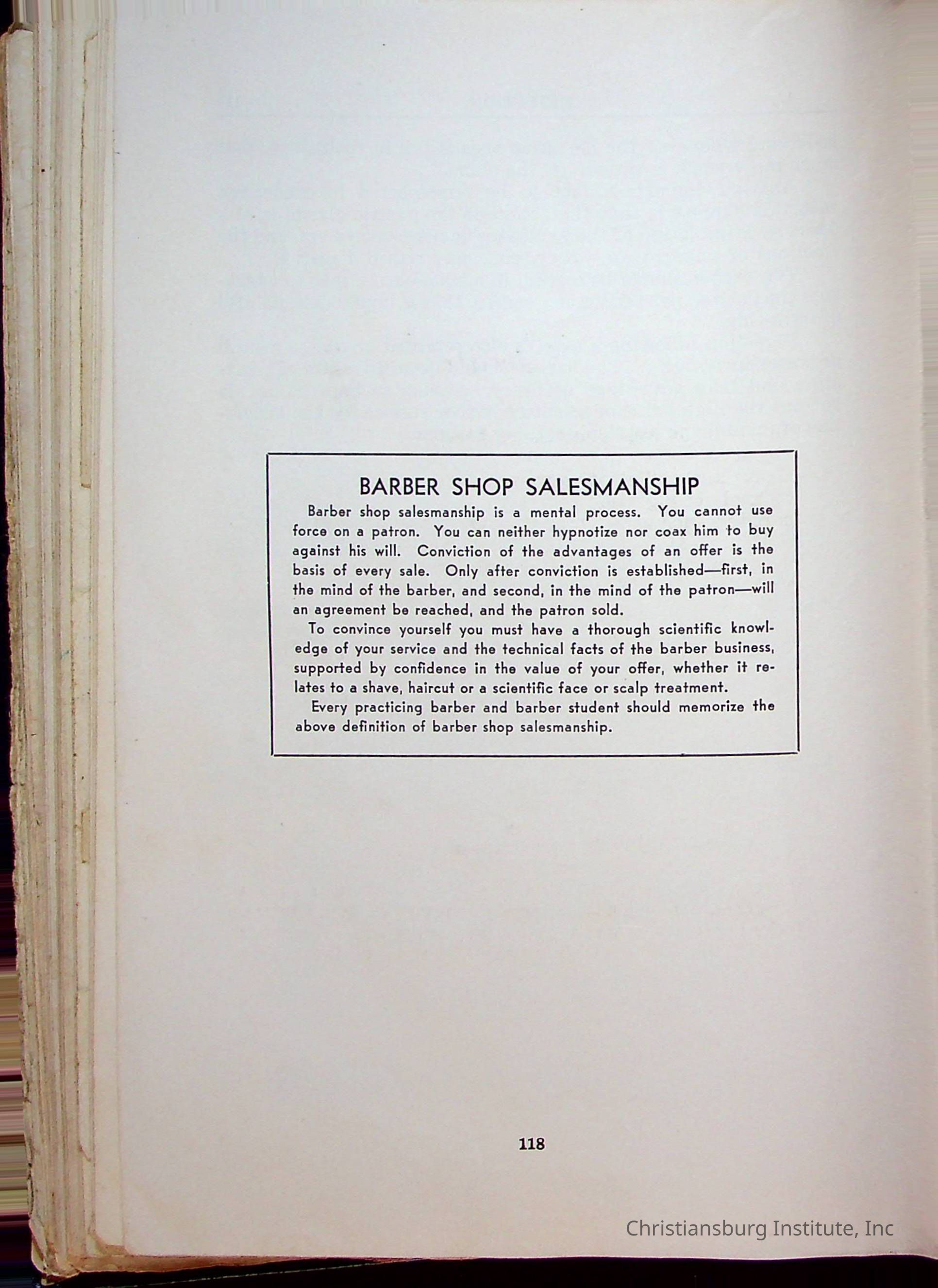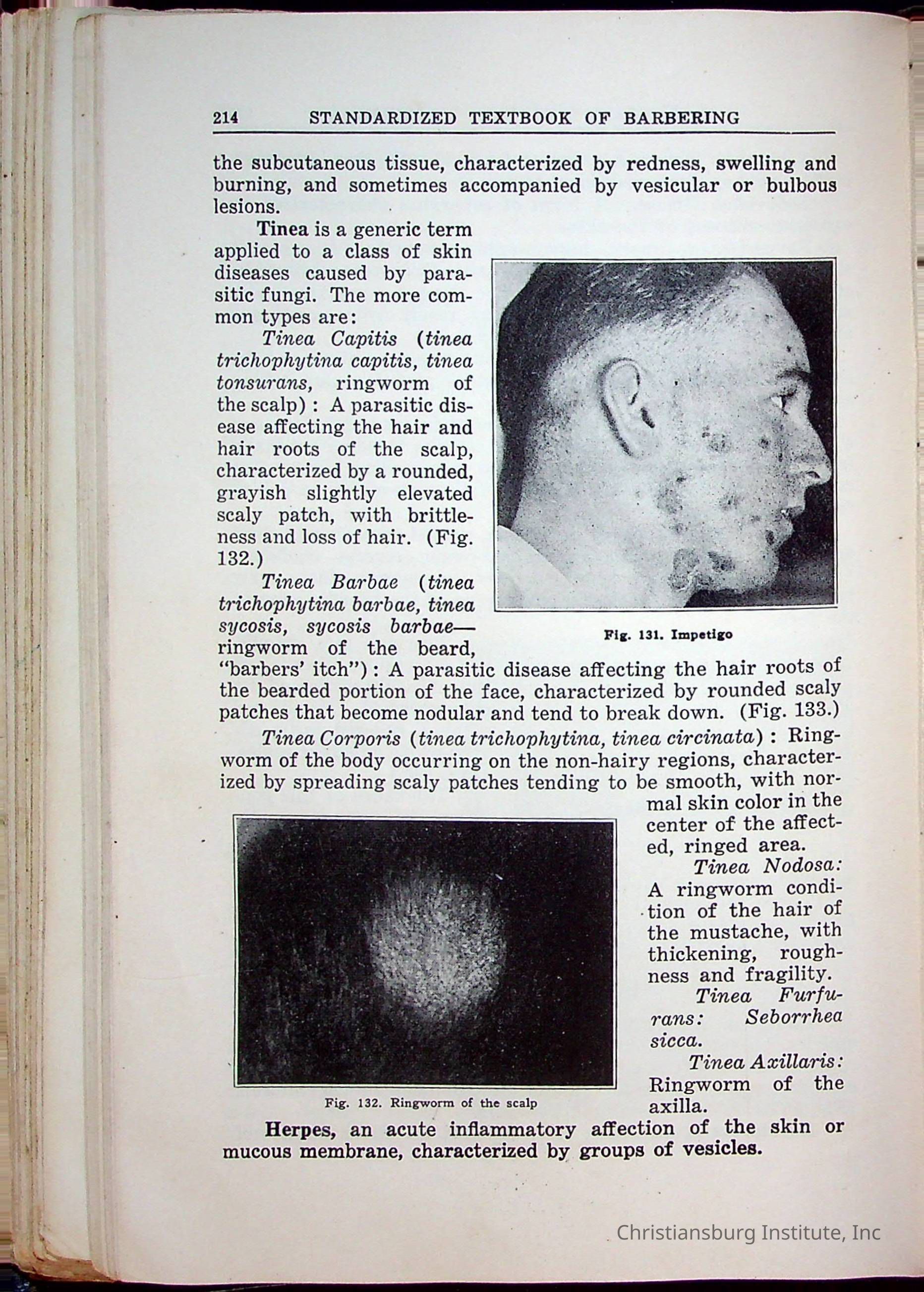 "Standardized Textbook of Barbering: in Two Parts" written and published by the Associated Master Barbers and Beauticians of America in the year 1950. This textbook was in the Christiansburg Institute library.